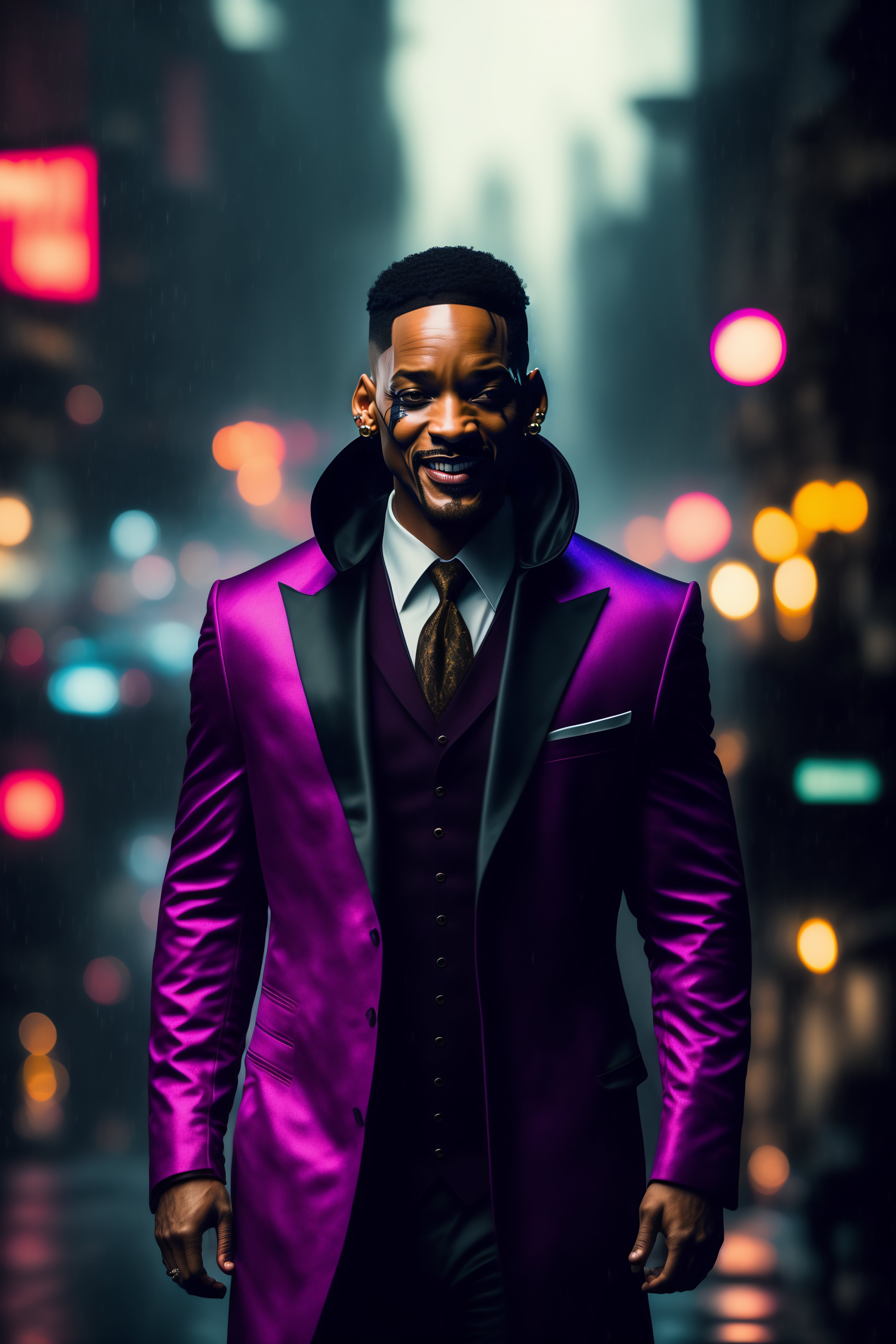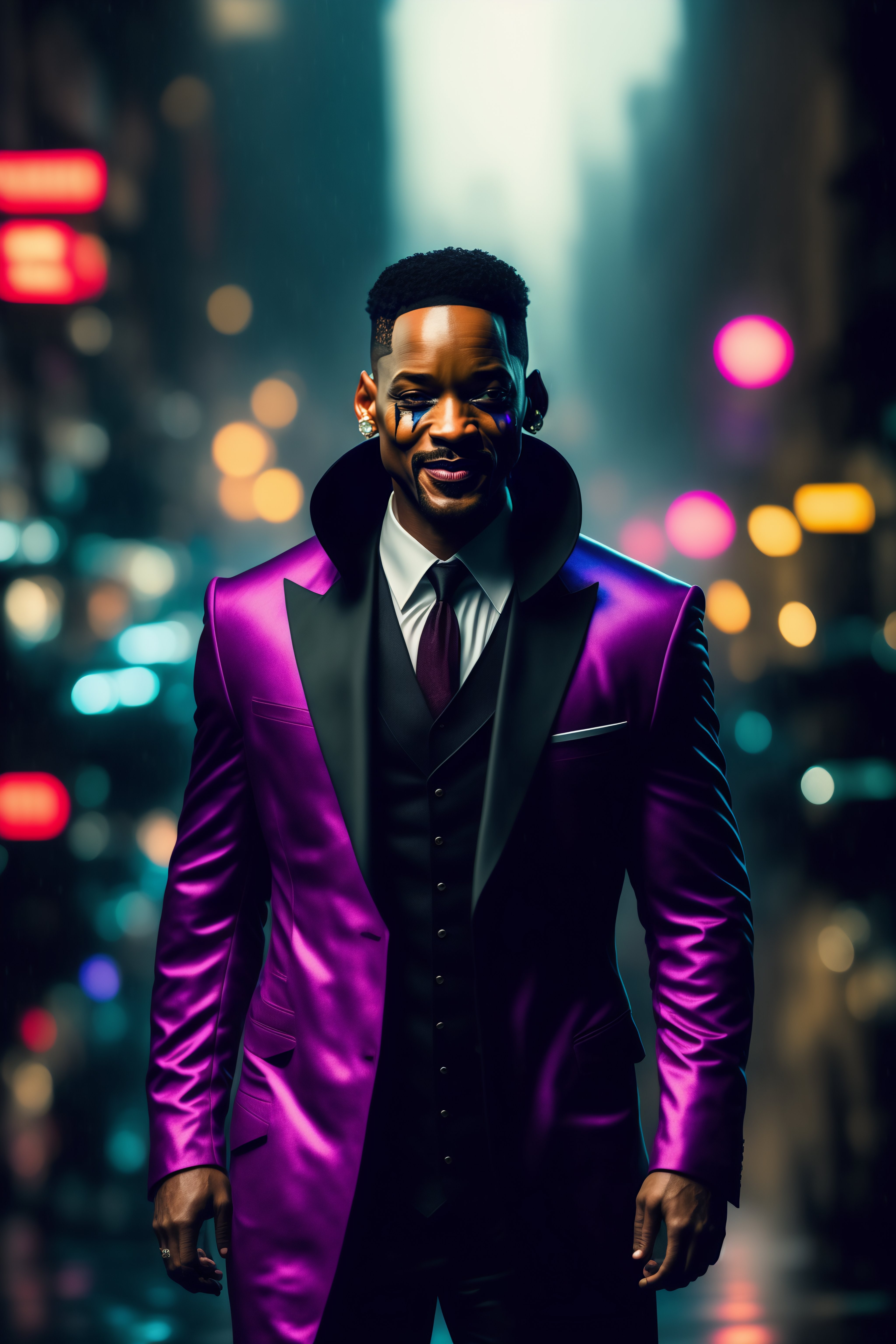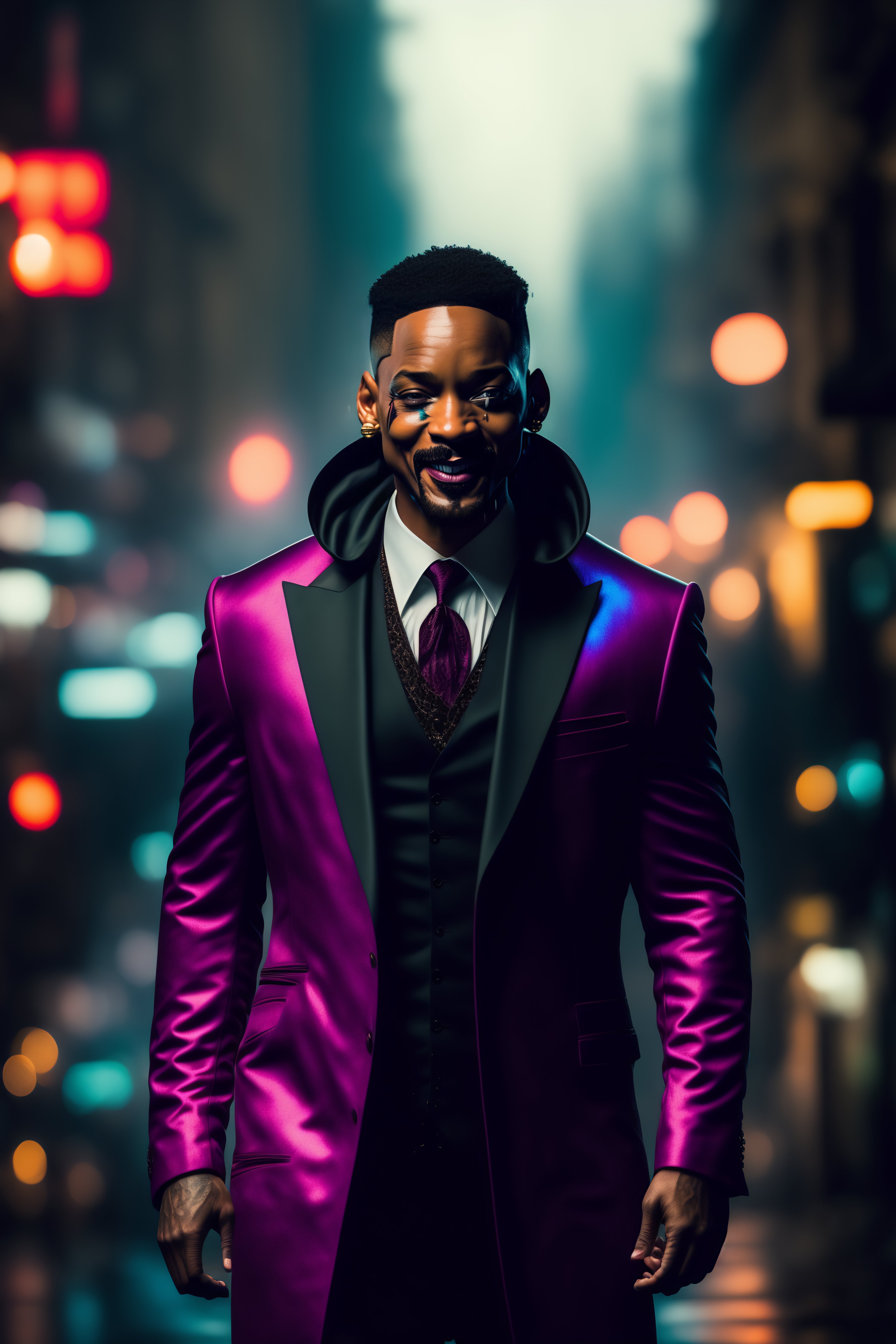 Will smith as the joker wearing in black joker hood styled suit, with bloody joker ruined make-up, full body shot, building exploding in the back, rainy night, dark street, cinematic, very detailed, hyper realistic, 8k