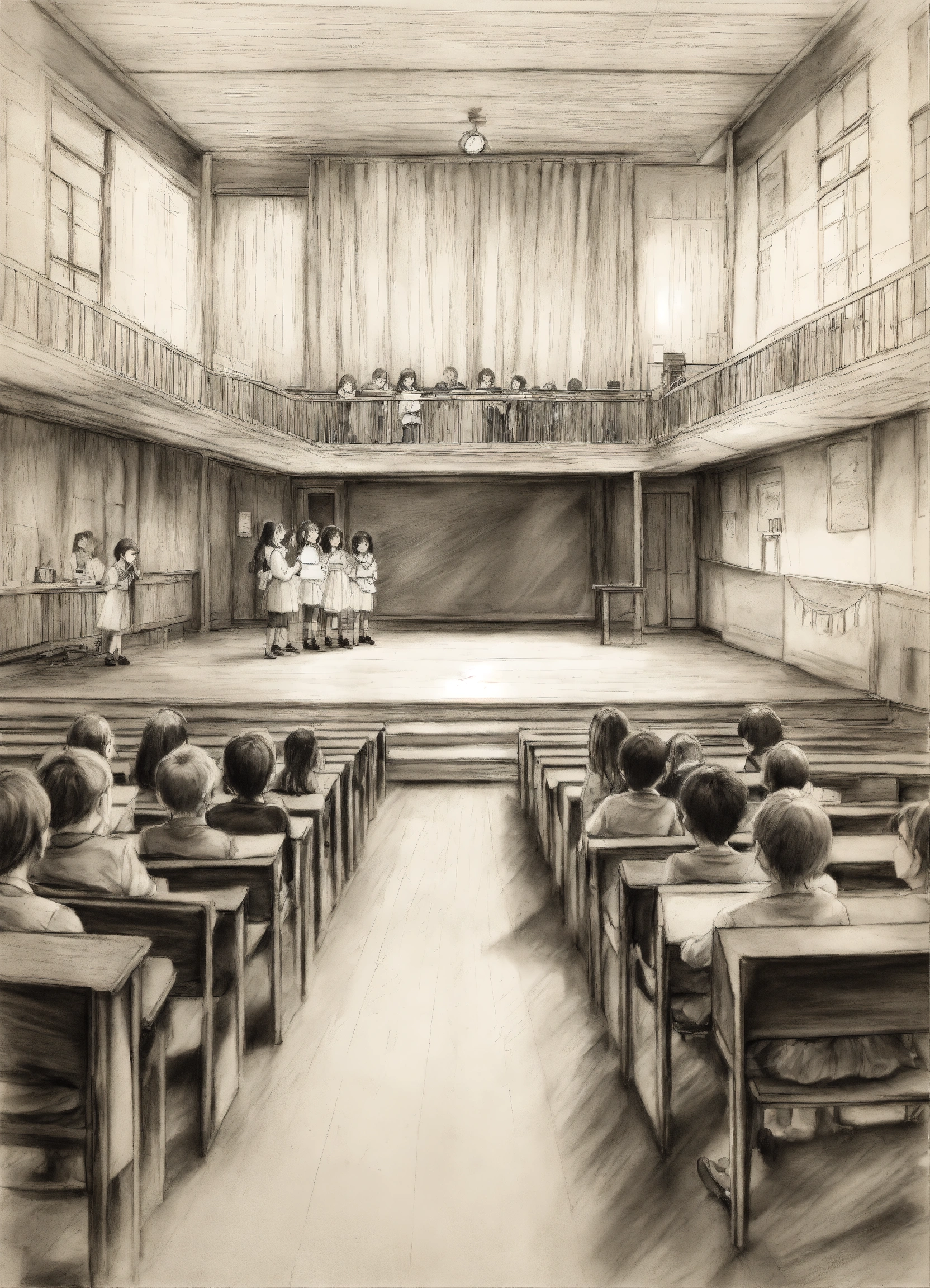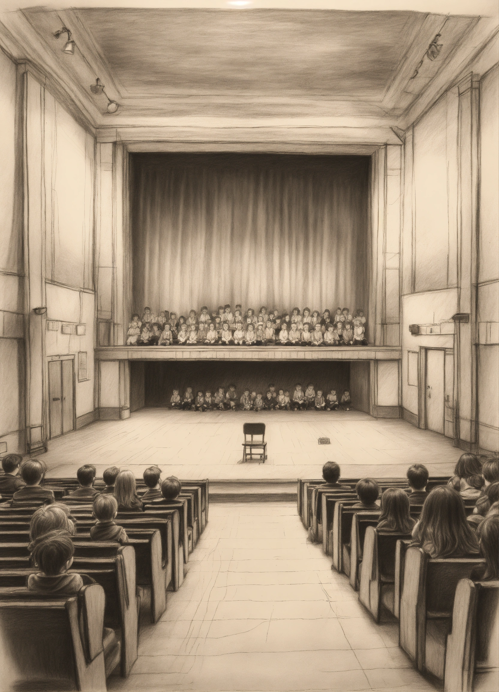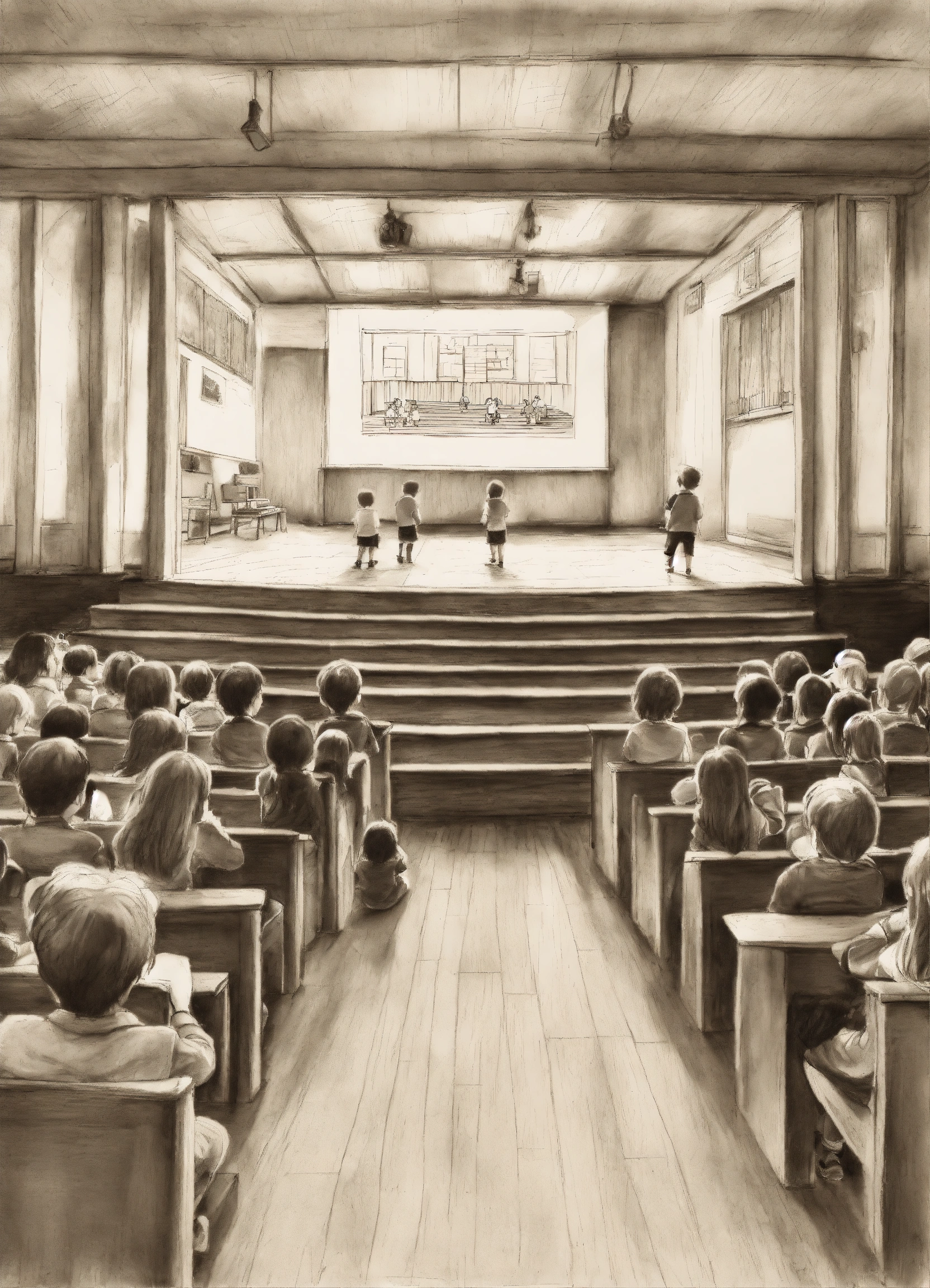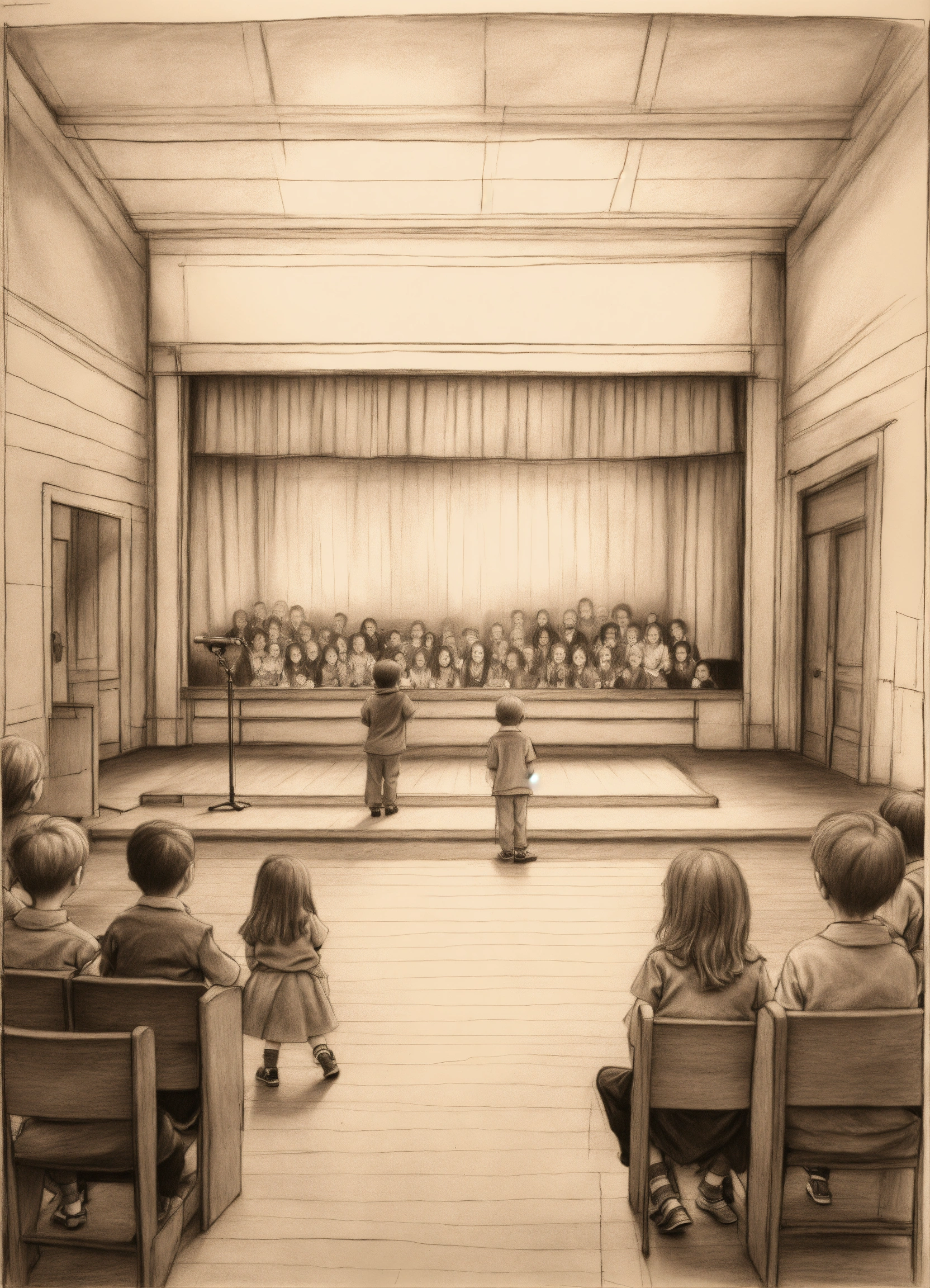 Pencil drawing of a shabby school stage with 4-years-old kids on stage
