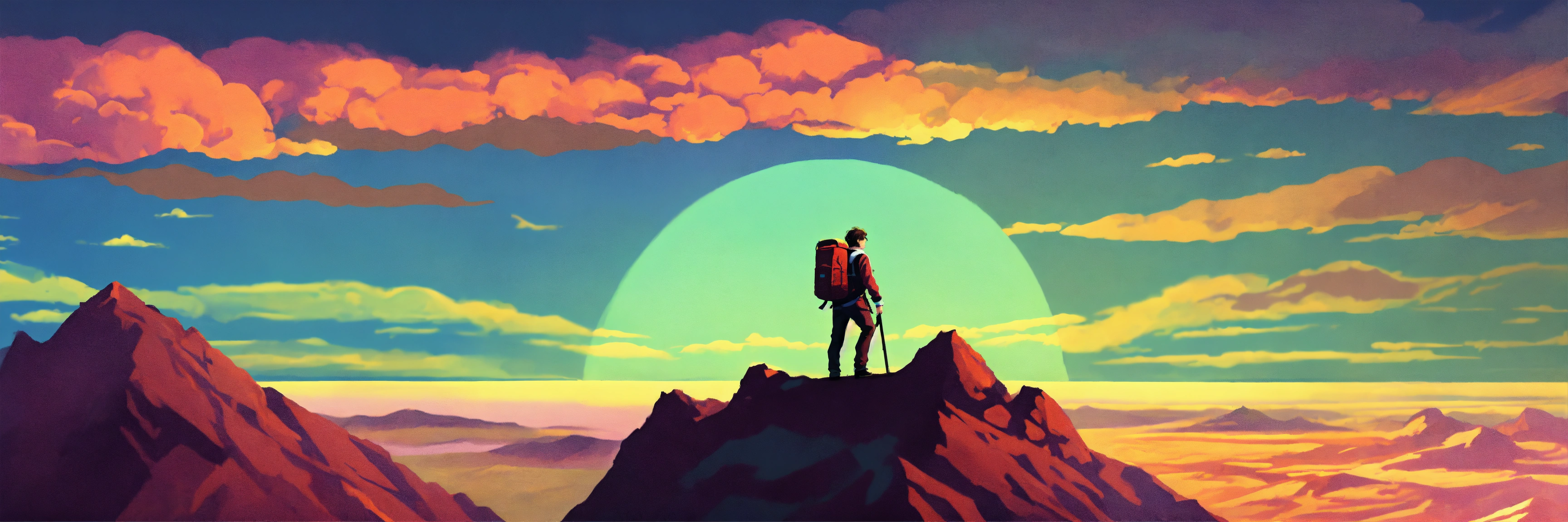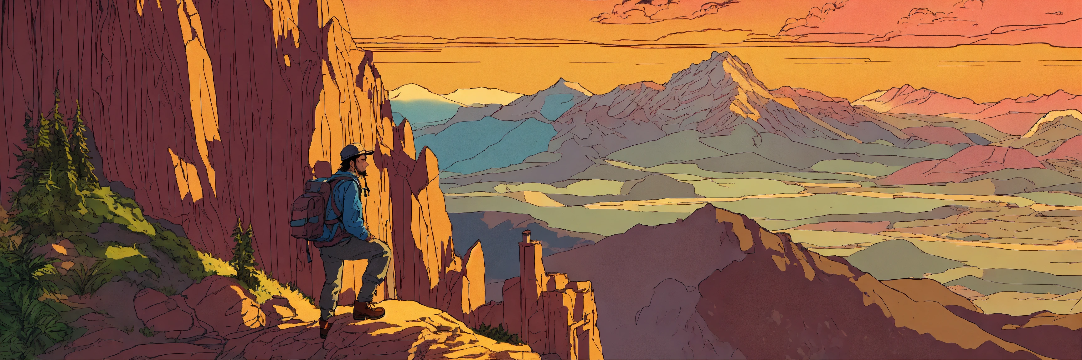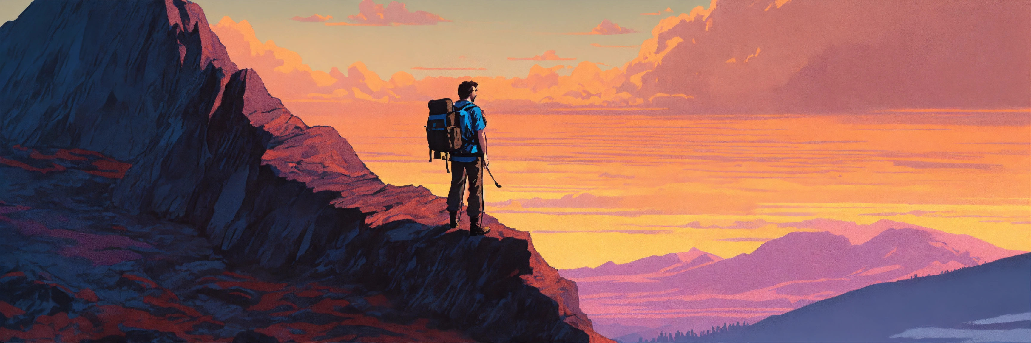 1970’s dark fantasy two tone color hue book cover paper art style drawing of guy with backpack on a mountain peak looking at view