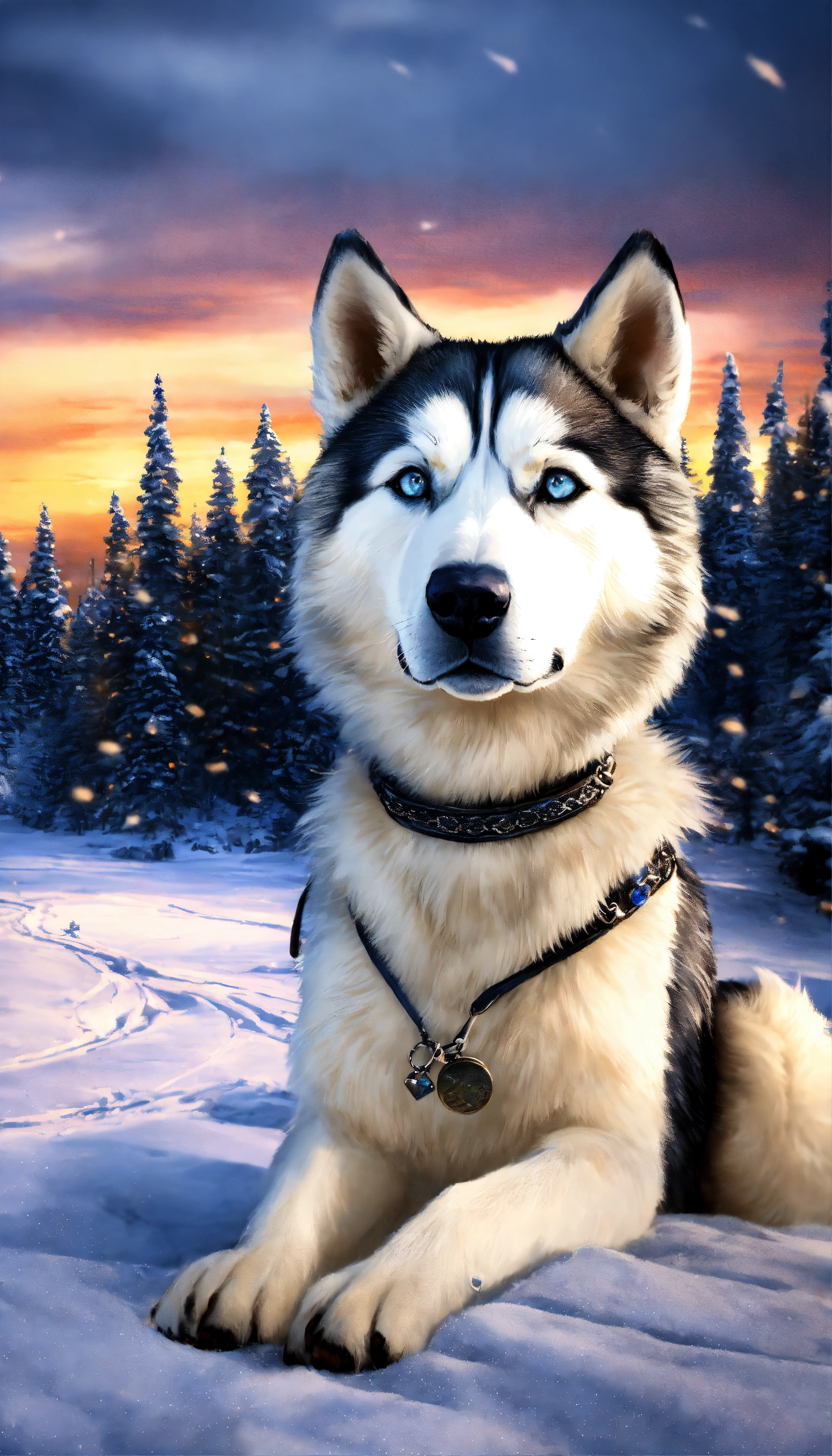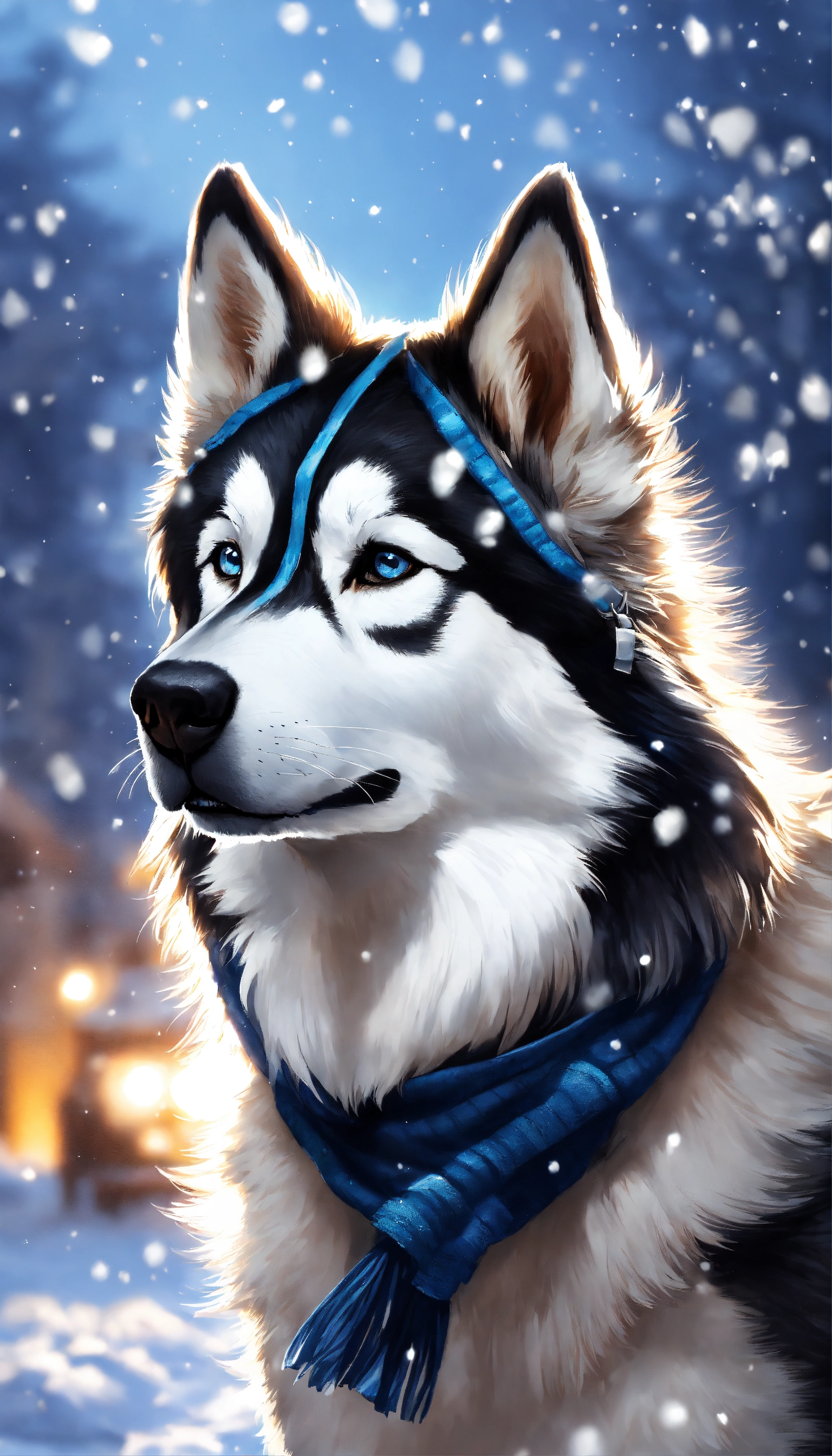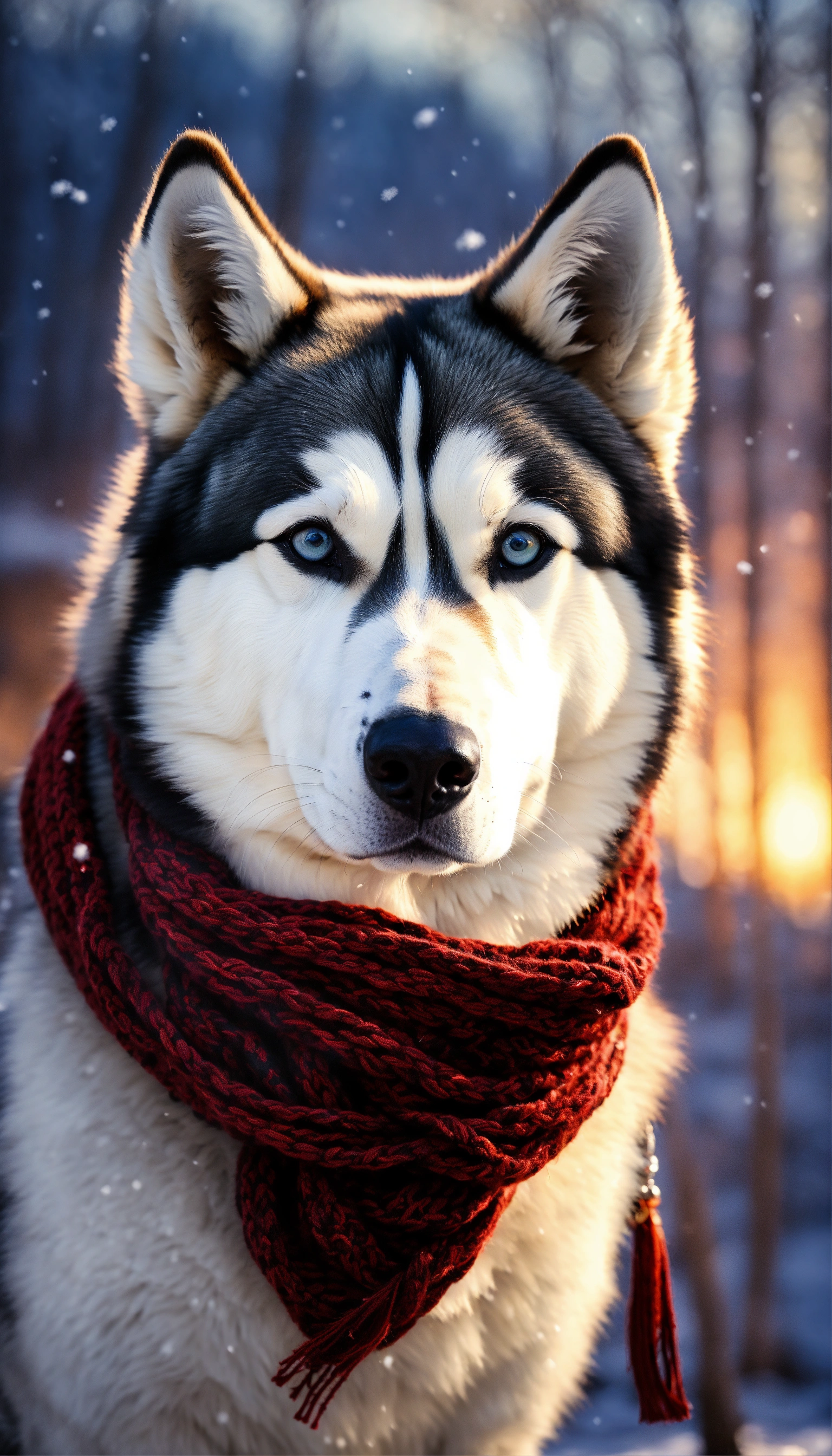 "craft an image capturing the majestic siberian husky, its wolf-like features in sharp focus against a wintry backdrop. adorn the husky in stylish winter clothing, perhaps a leather jacket with silver accents or a knitted scarf that contrasts its fur. the environment should highlight icy terrains, shimmering under a soft twilight, emphasizing the dog's natural habitat and enhancing its cool demeanor."