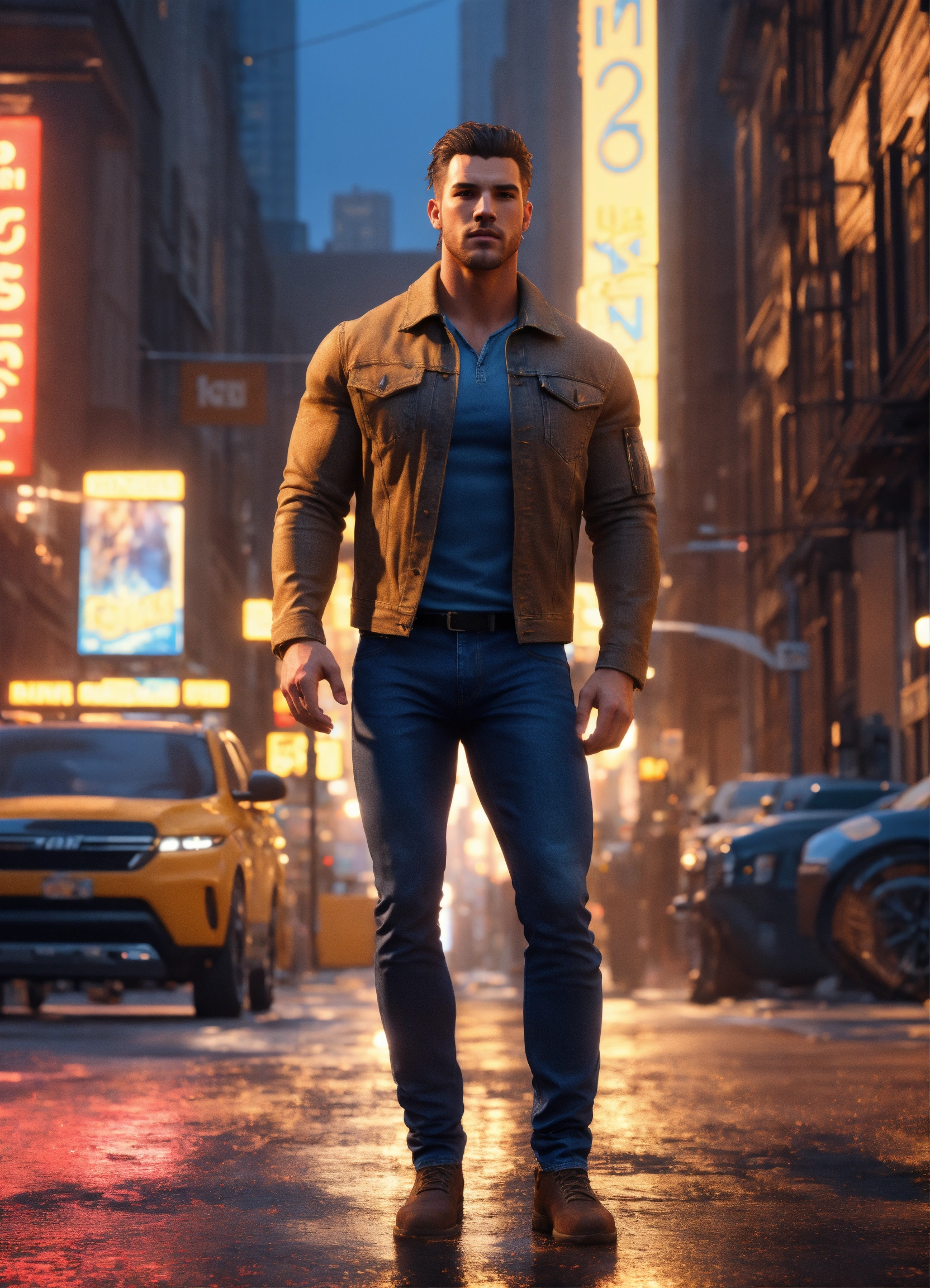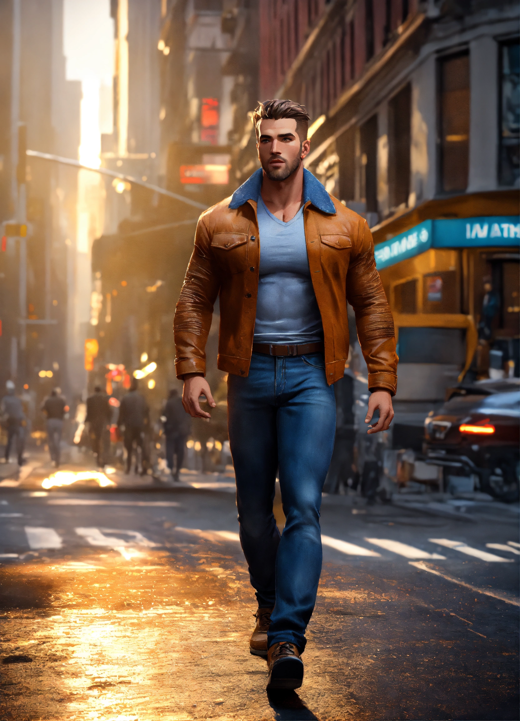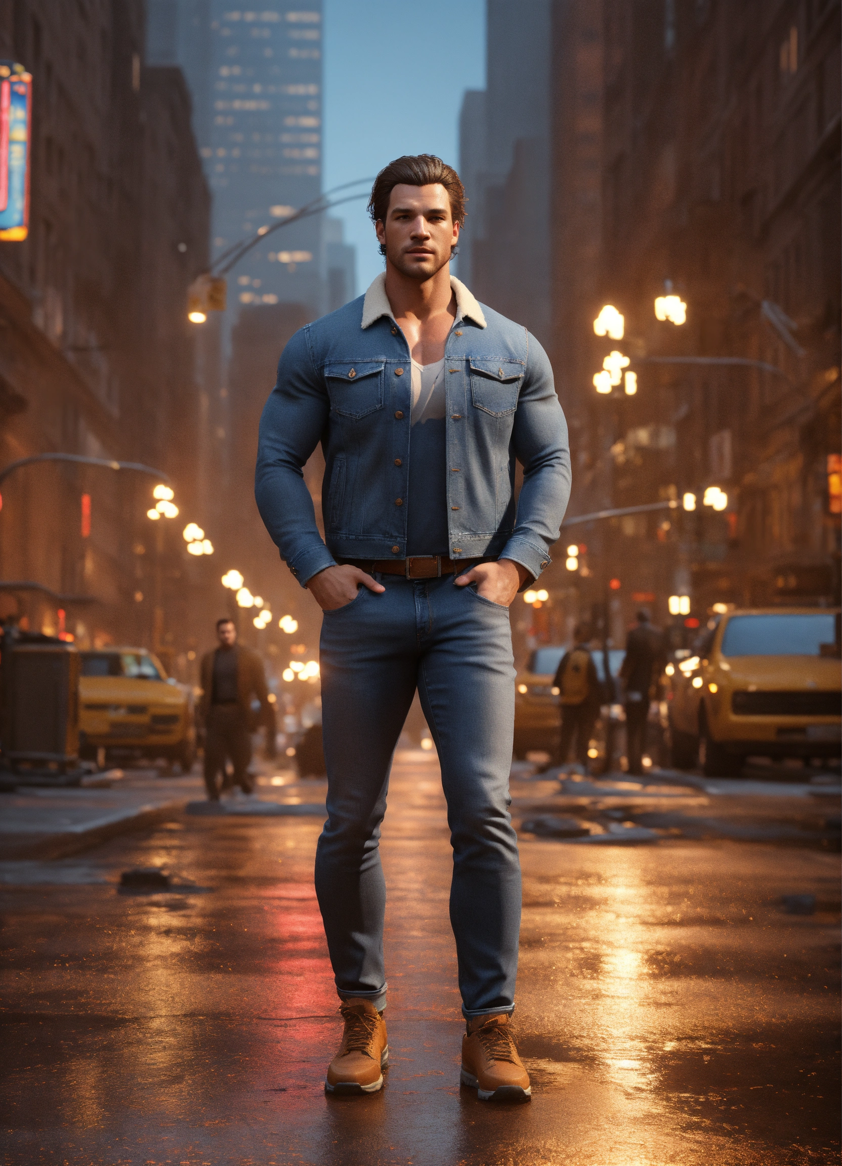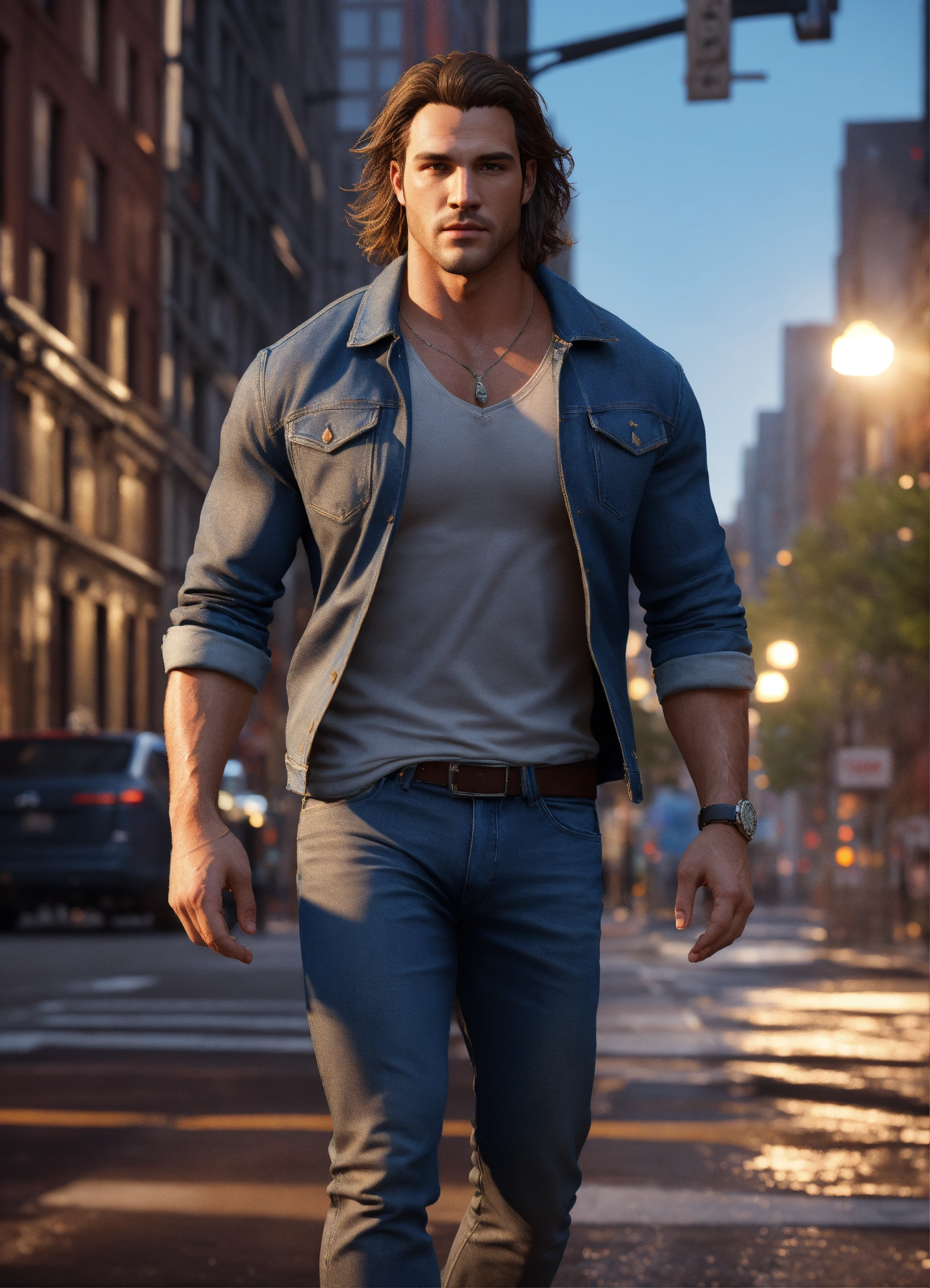 Full body of a handsome muscular white man with shoulder length hair, a huge muscular man, a modern hercules, strongest man alive, a very handsome athletic man, a stud wearing a denim jacket, t-shirt, and jeans, business suit, in new york city streets, full body, 8k resolution concept art portrait dynamic lighting hyperdetailed intricately detailed splash art trending on artstation unreal engine 5 volumetric lighting