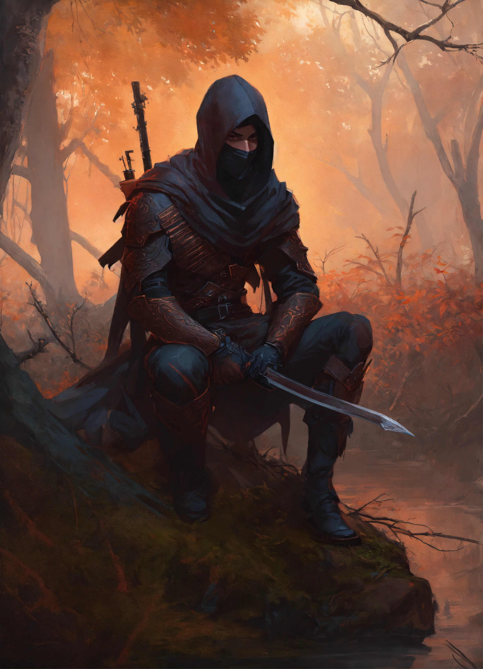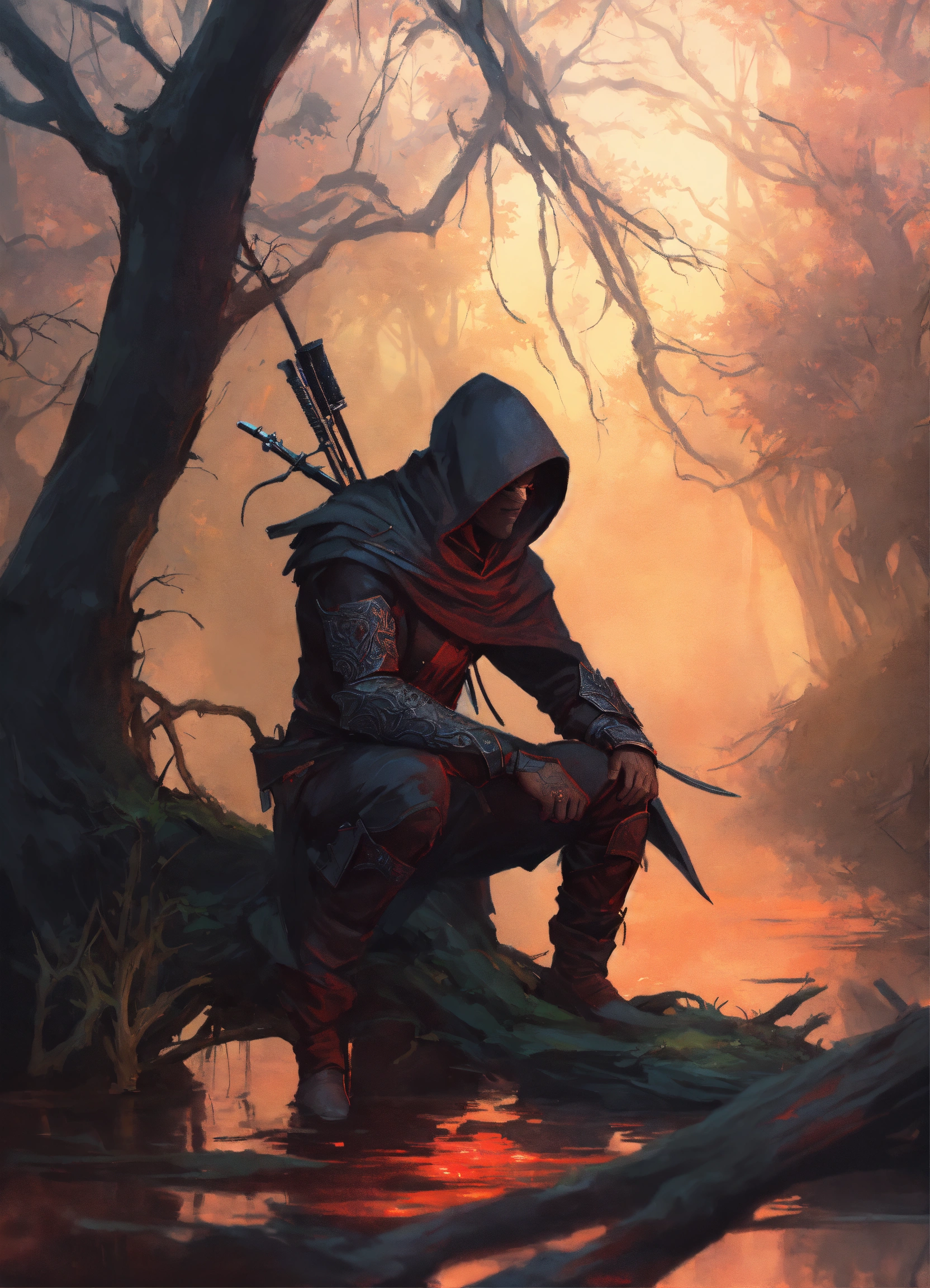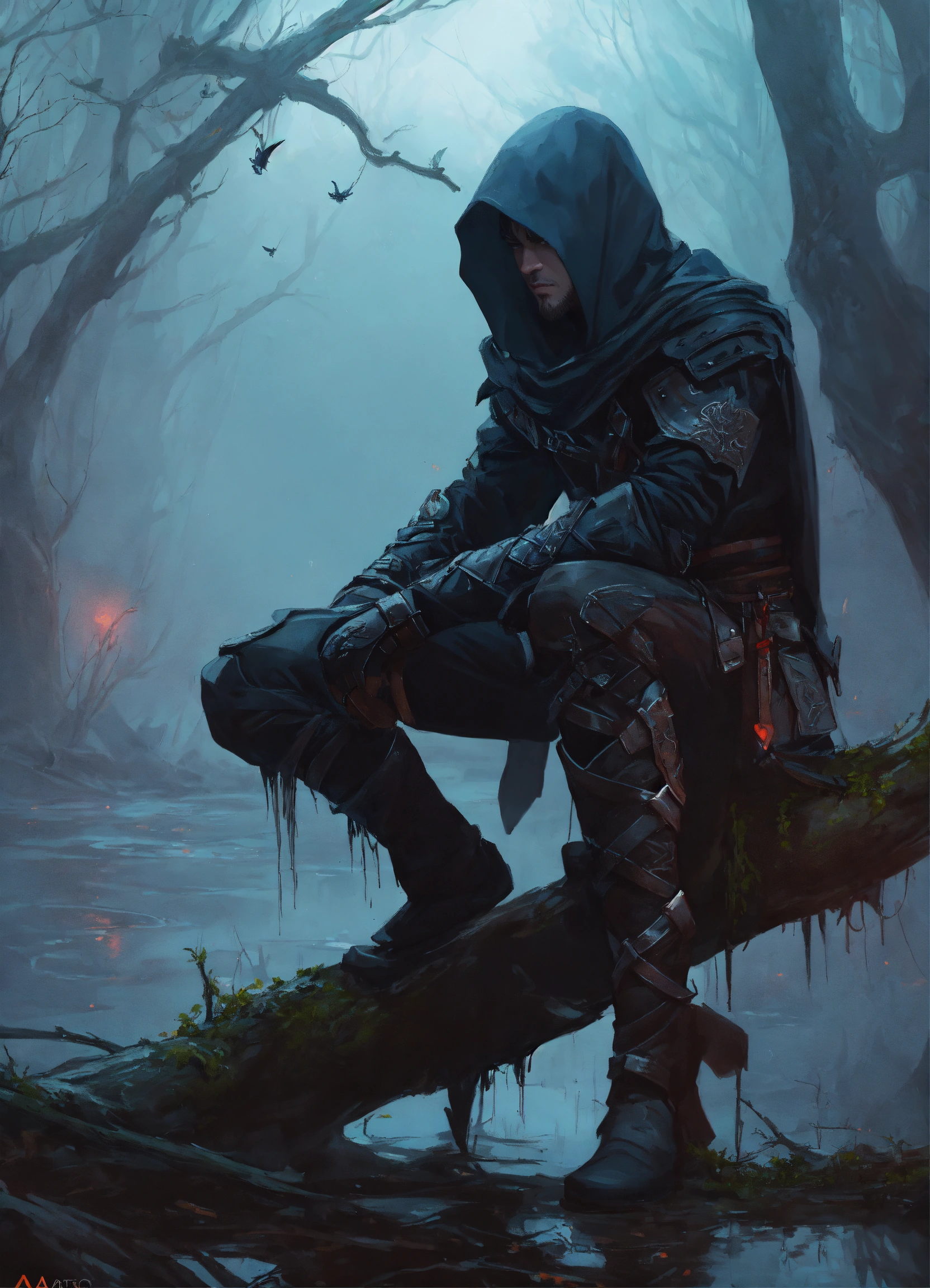 Vivid painting, sideview of an male assassin with black compat cowl, sitting lurking on a tree branch in a swamp covered by corpses. the surrounding is foggy and dead trees, by artgerm, intricate detail, trending on artstation, 8k, fluid motion, stunning shading, by wlop