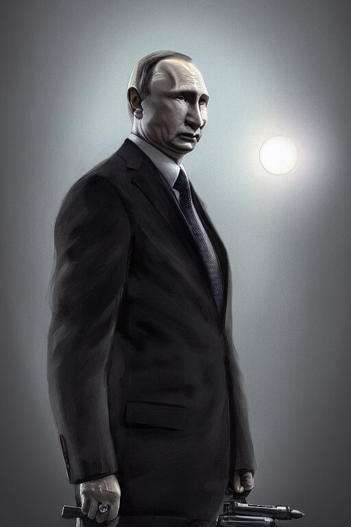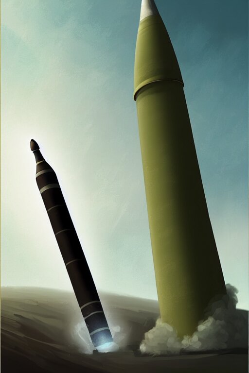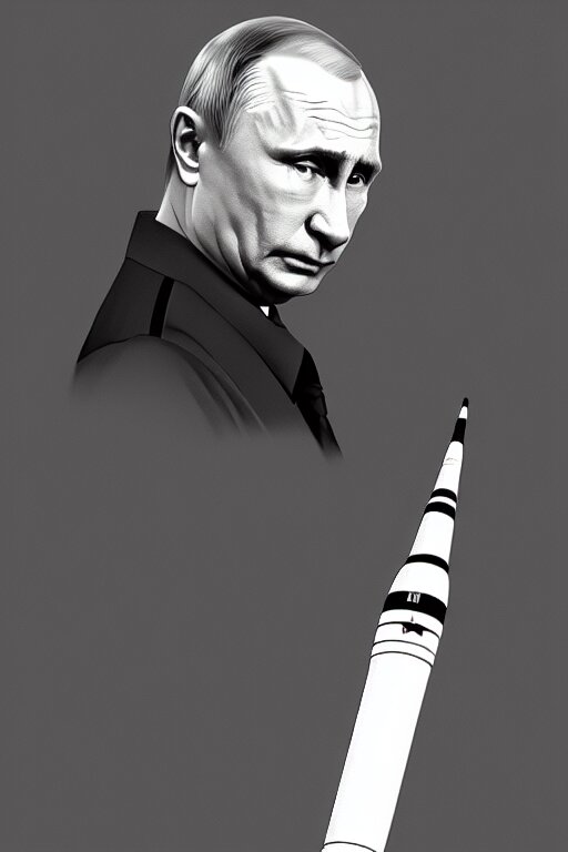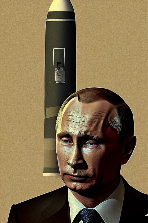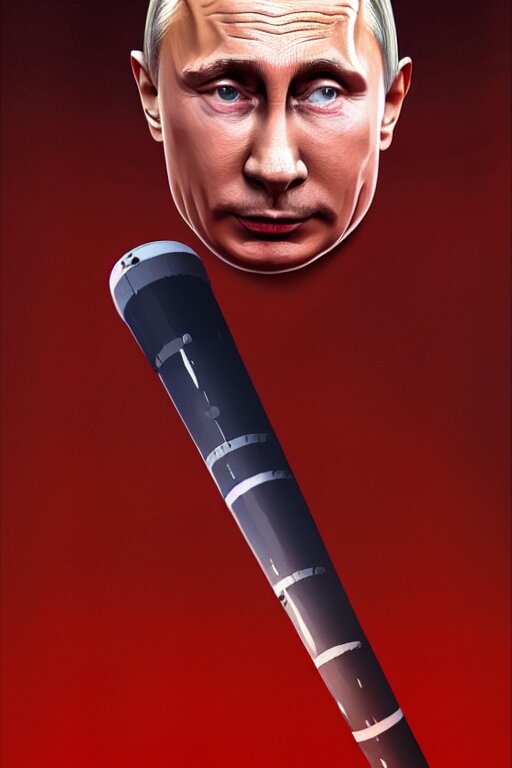 Vladimir putin with an icbm missile. realistic portrait, symmetrical, highly detailed, digital painting, artstation, concept art, smooth, sharp focus, illustration, cinematic lighting