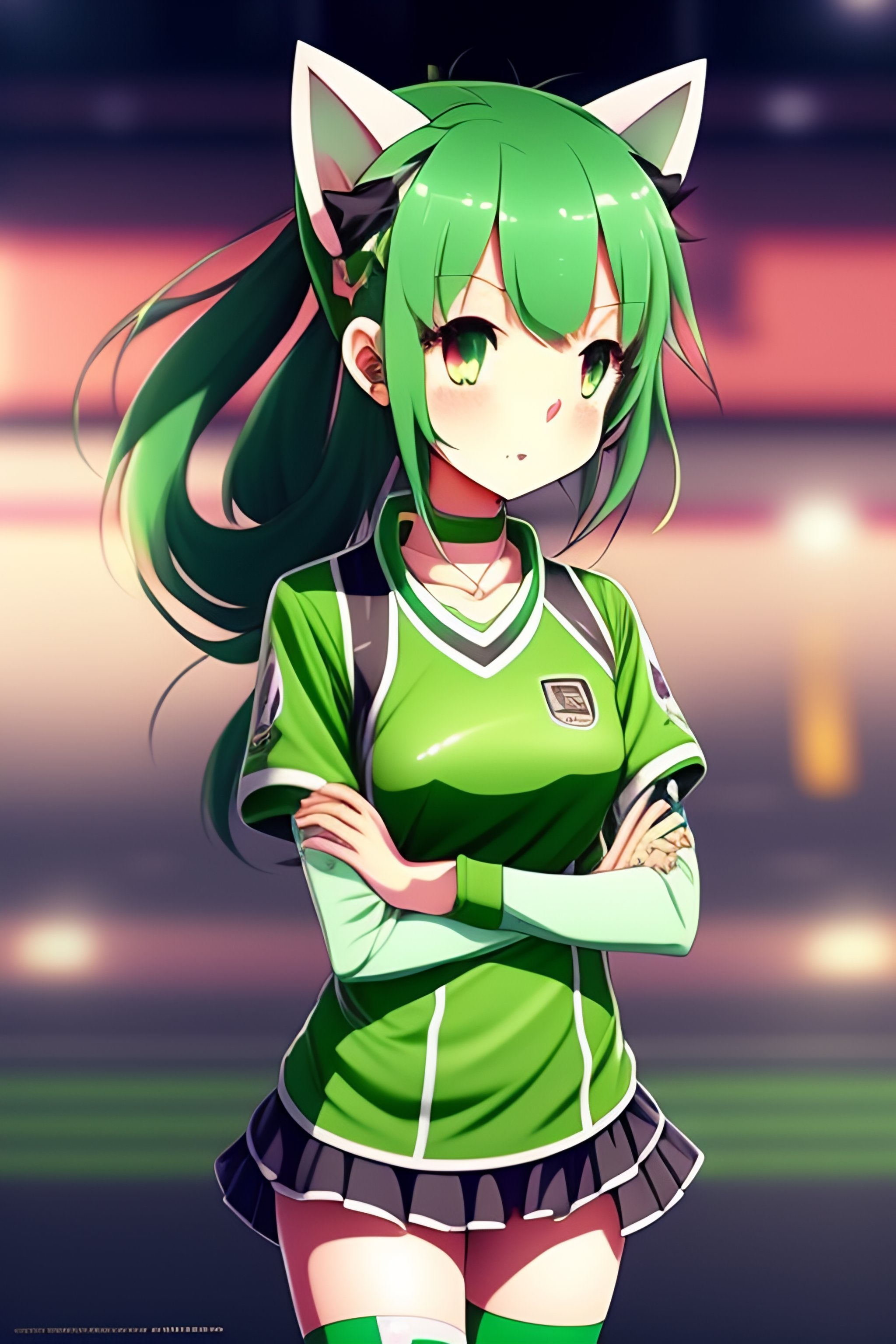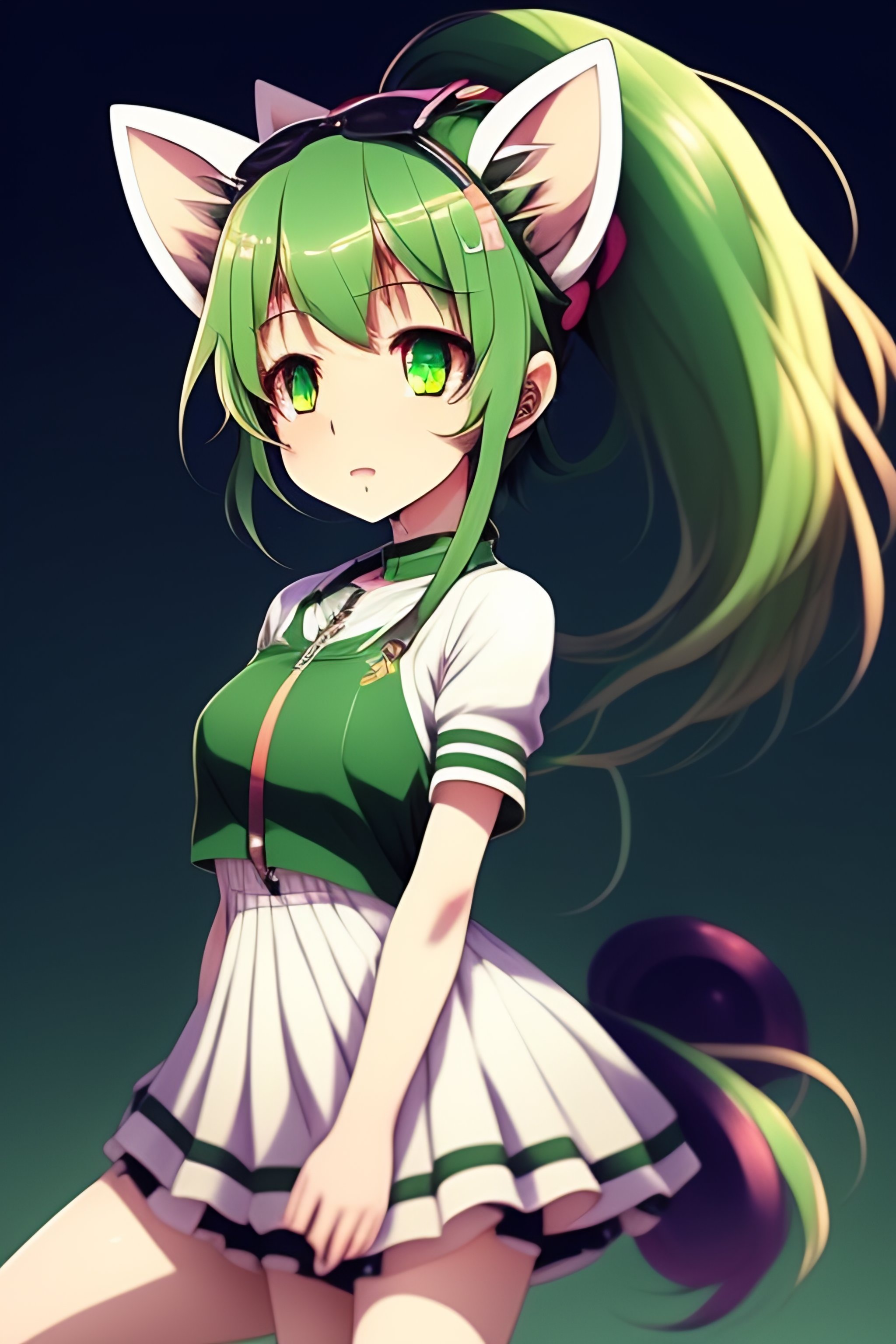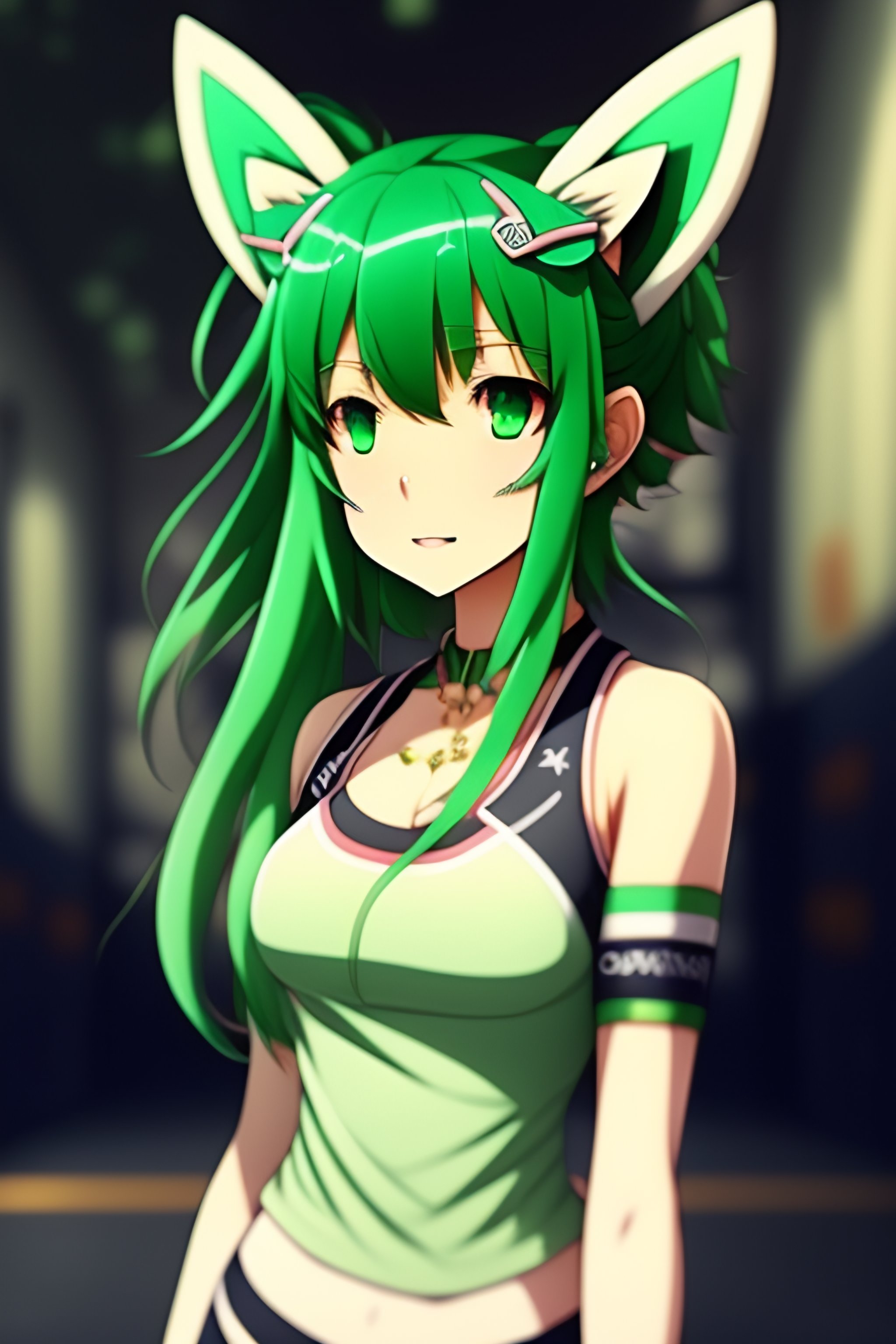 Cute anime girl, green hair, small cat ears no normal ears, pale skin, sport clothing, legs, very coherent