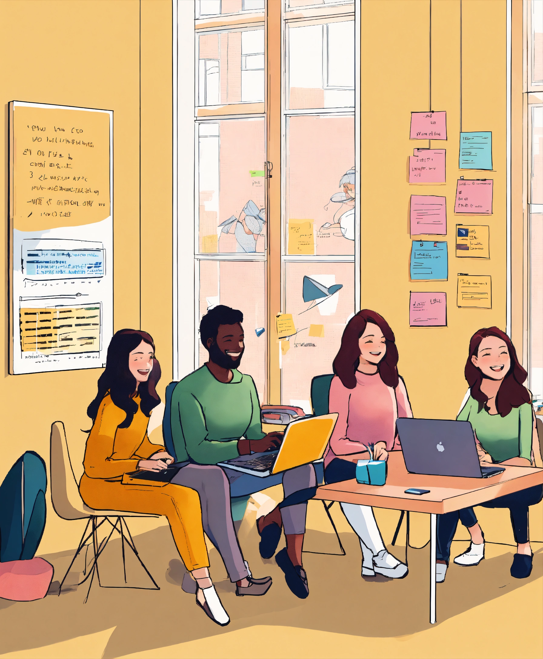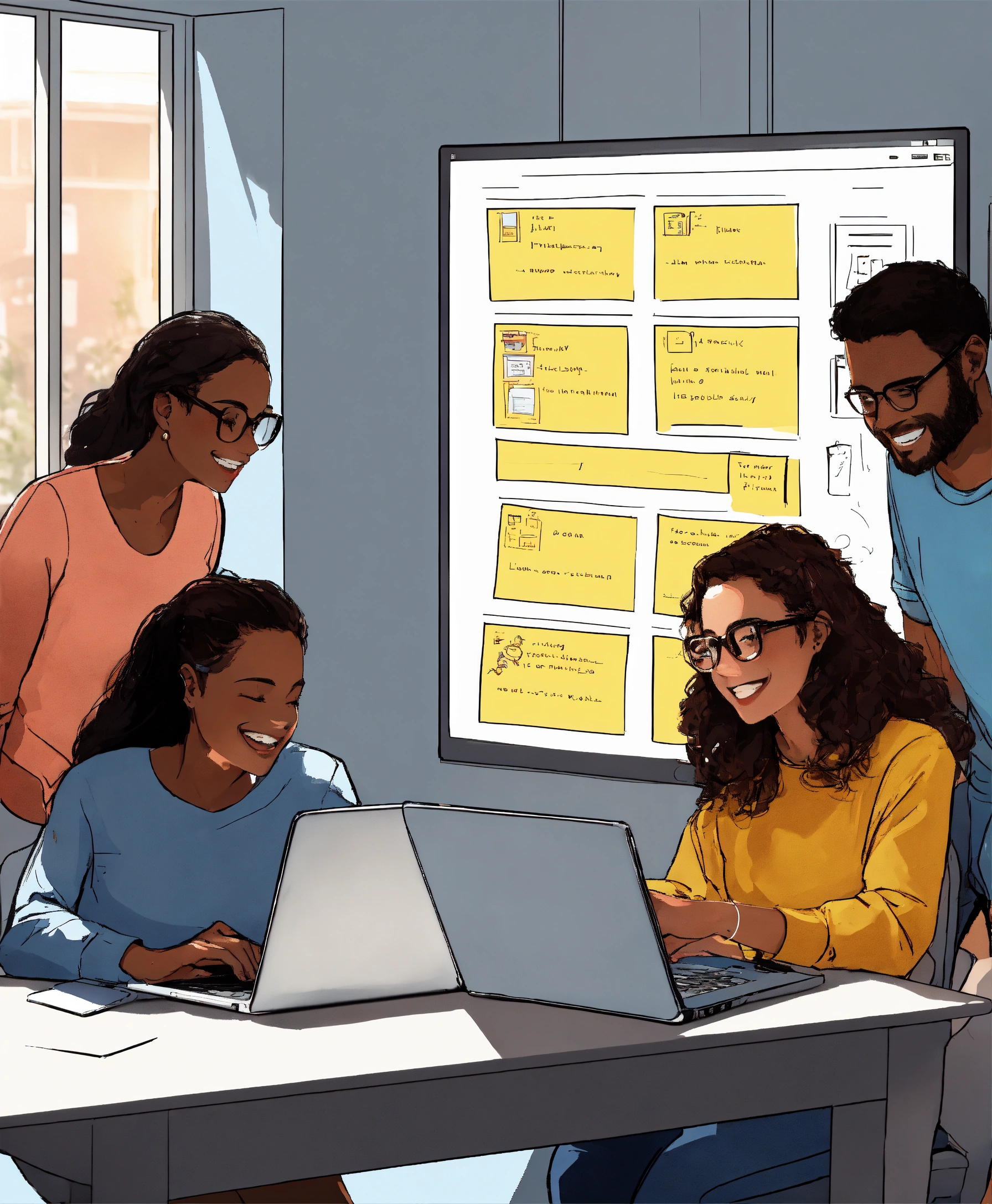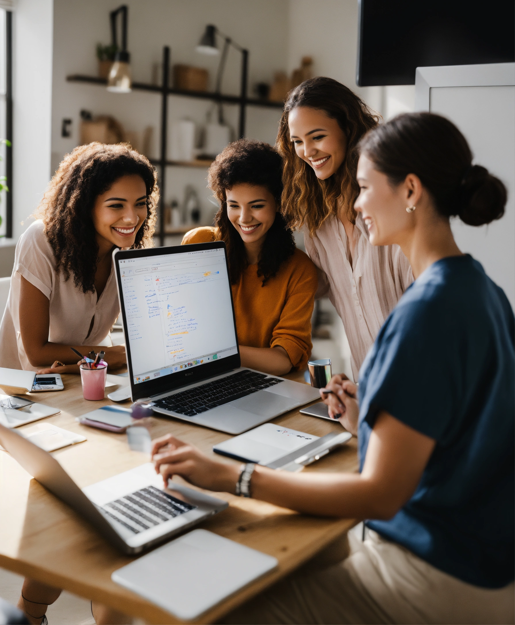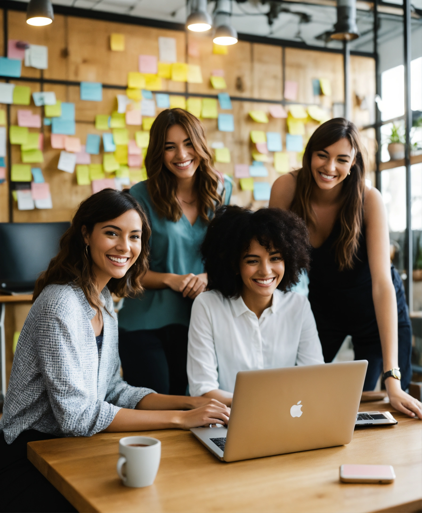 Photo of 3 women and 1 man happy launching a website, smiling with laptops in a minimalist light-filled room; laptop screen shows code; a whiteboard with sticky notes and sketches of mobile phones are behind them