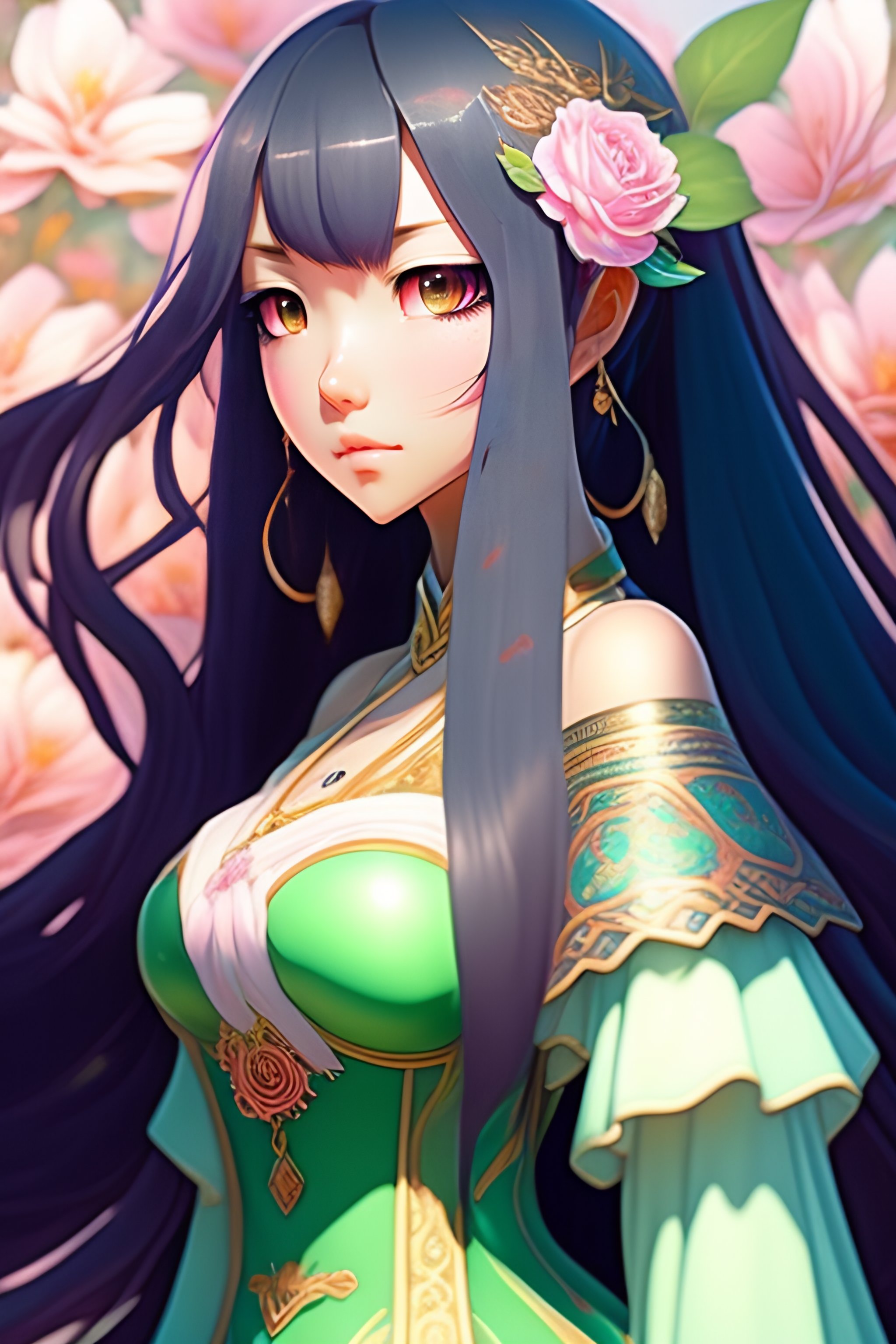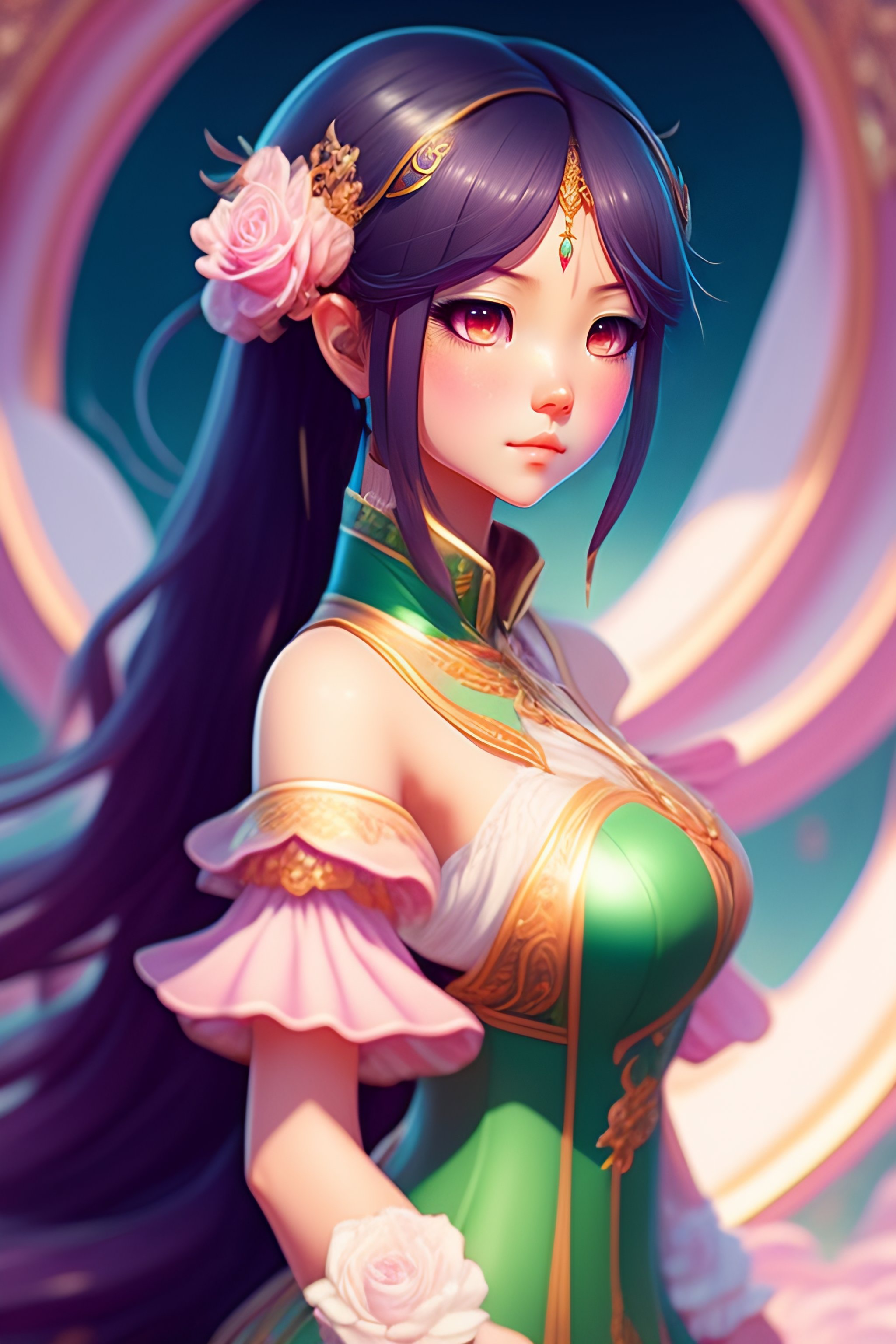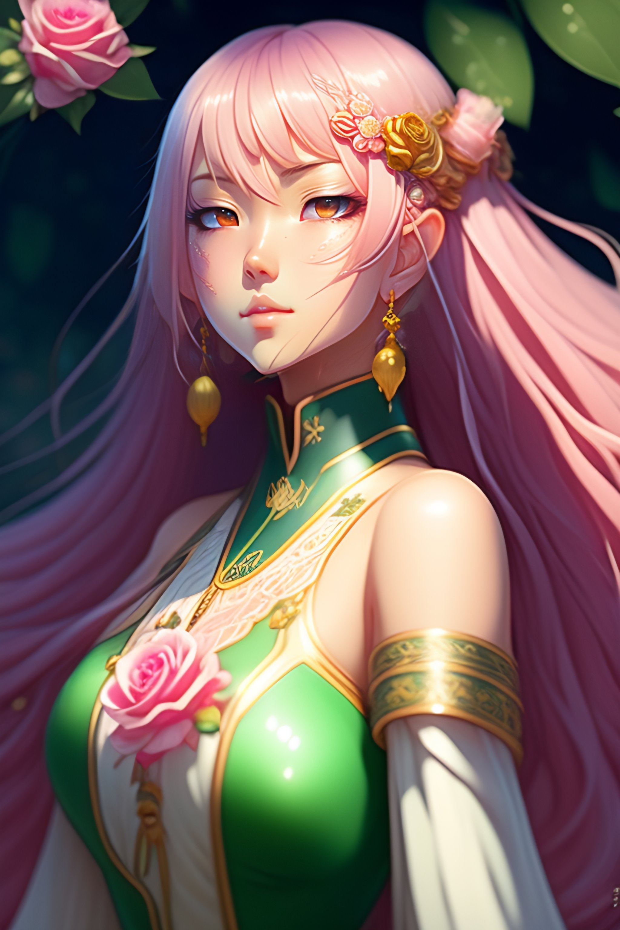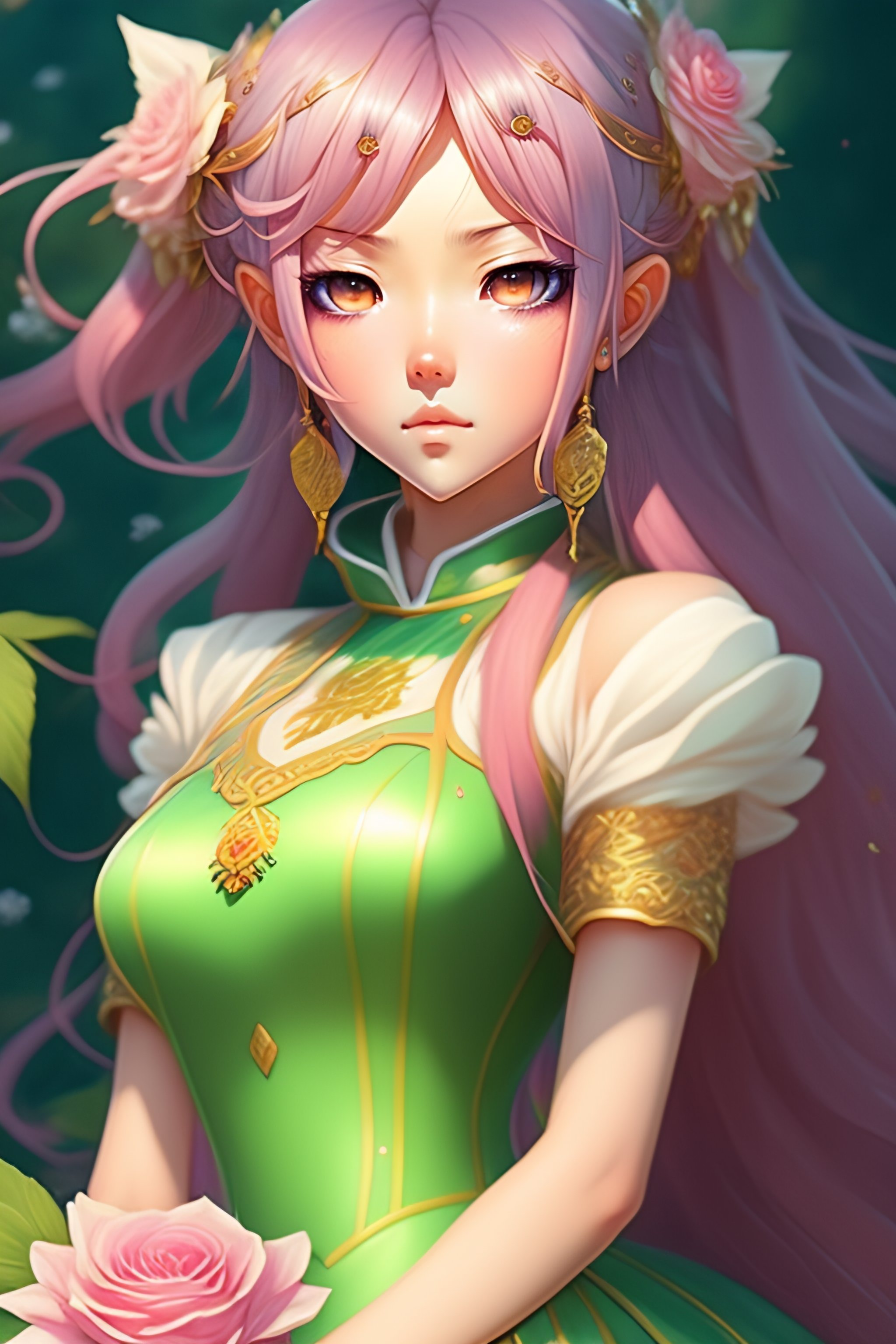 Adult girl with long rose pink hair, aqua glass eyes, a small pigtail on the left side, chinese dress, chinese style, anime style, hyper detailed, light green dress, illustration, digital painting, art by artgerm and greg rutkowski and alphonse mucha, high delicate defined details, anime stylized, highly detailed, realistic, sharp focus, styled by rhads