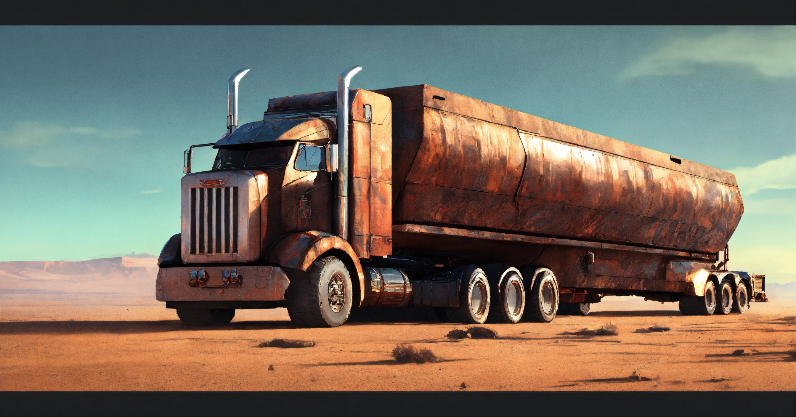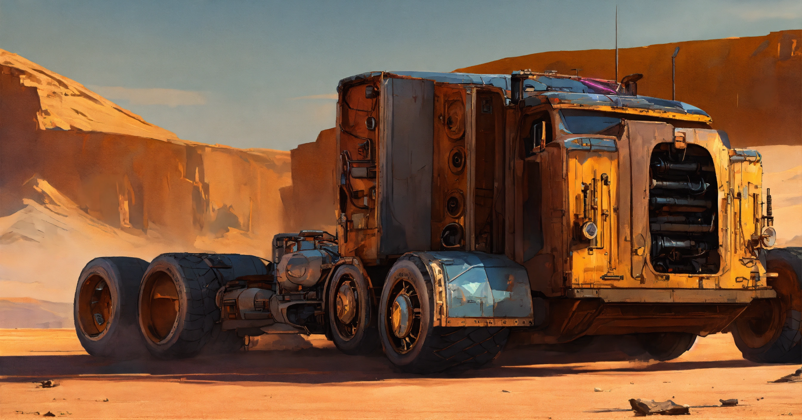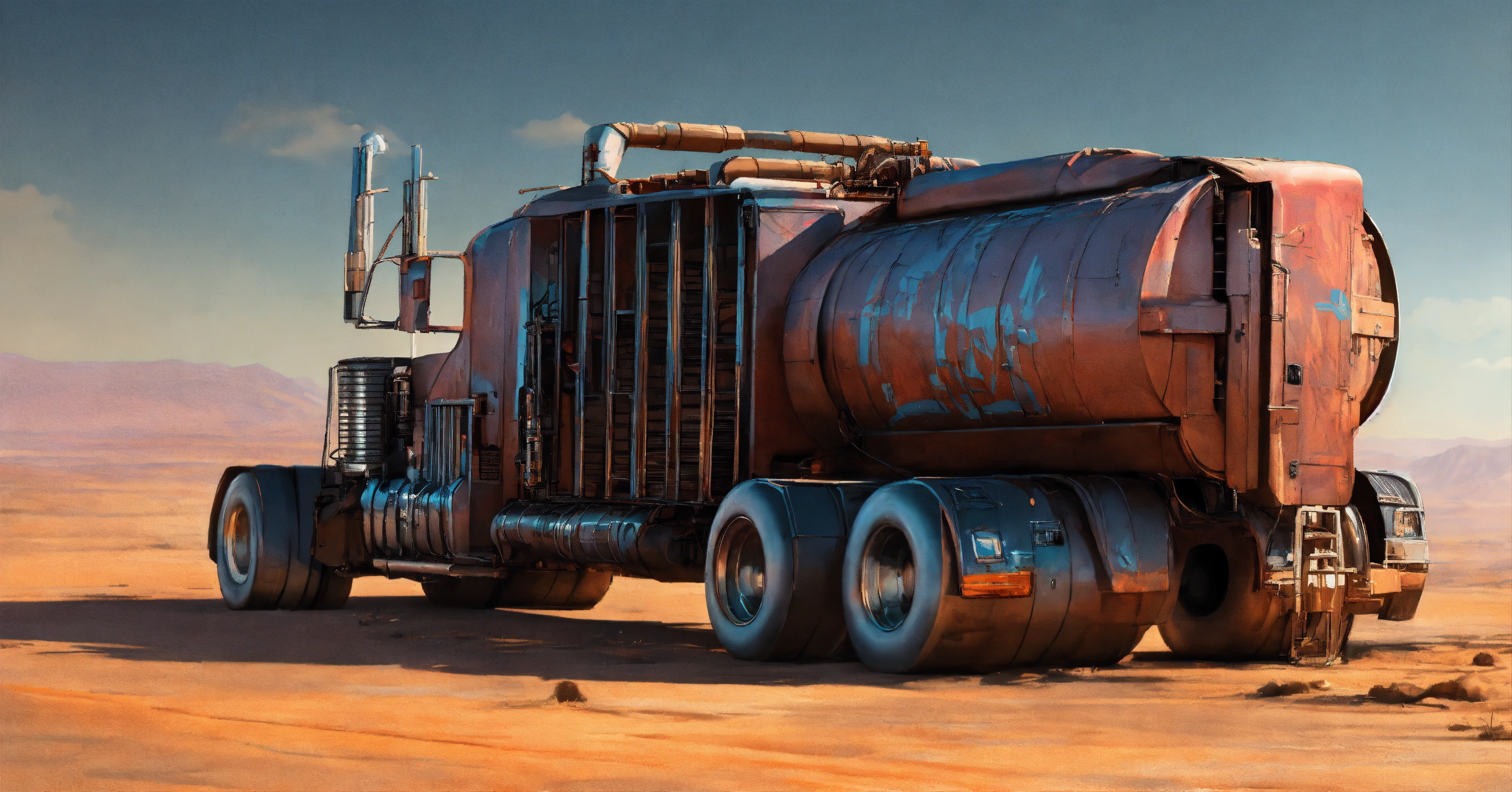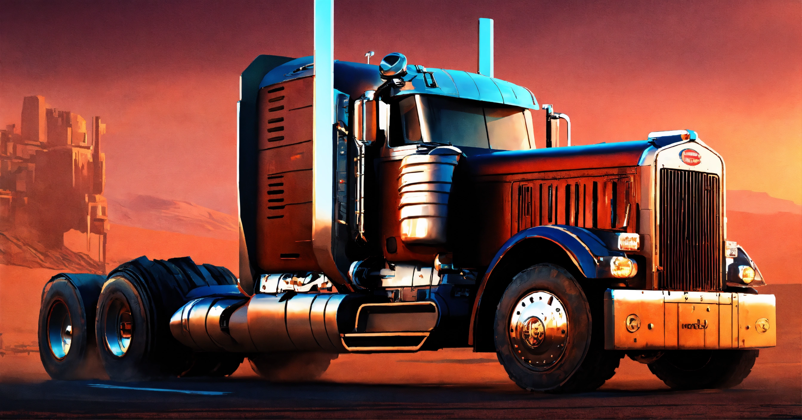 Semi truck cyberpunk post-apocalyptic peterbilt with a streamlined body