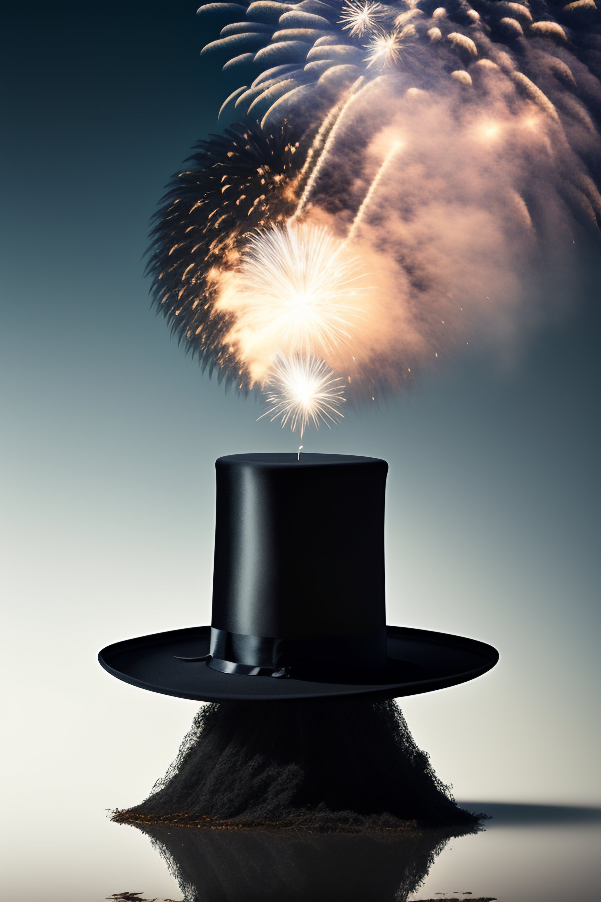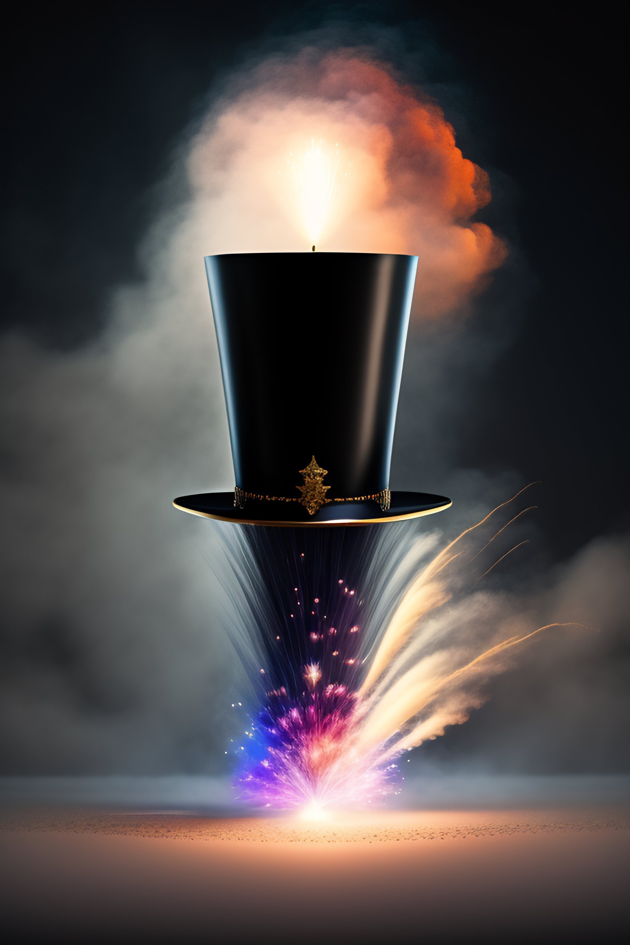 A black magician's top hat cylinder standing bottom up with opening to sky, fireworks exploding from its inside, small white raffle tickets, magic