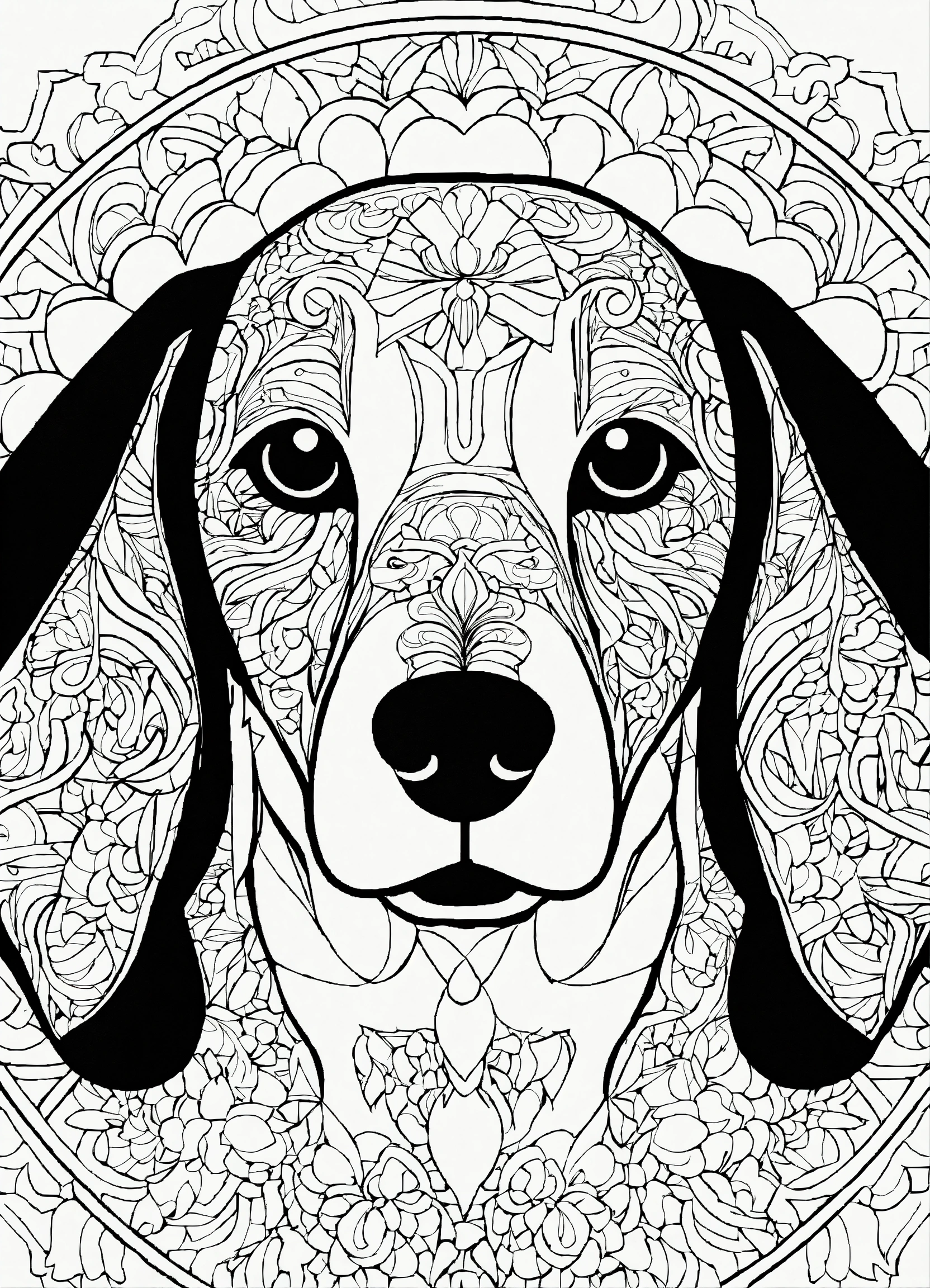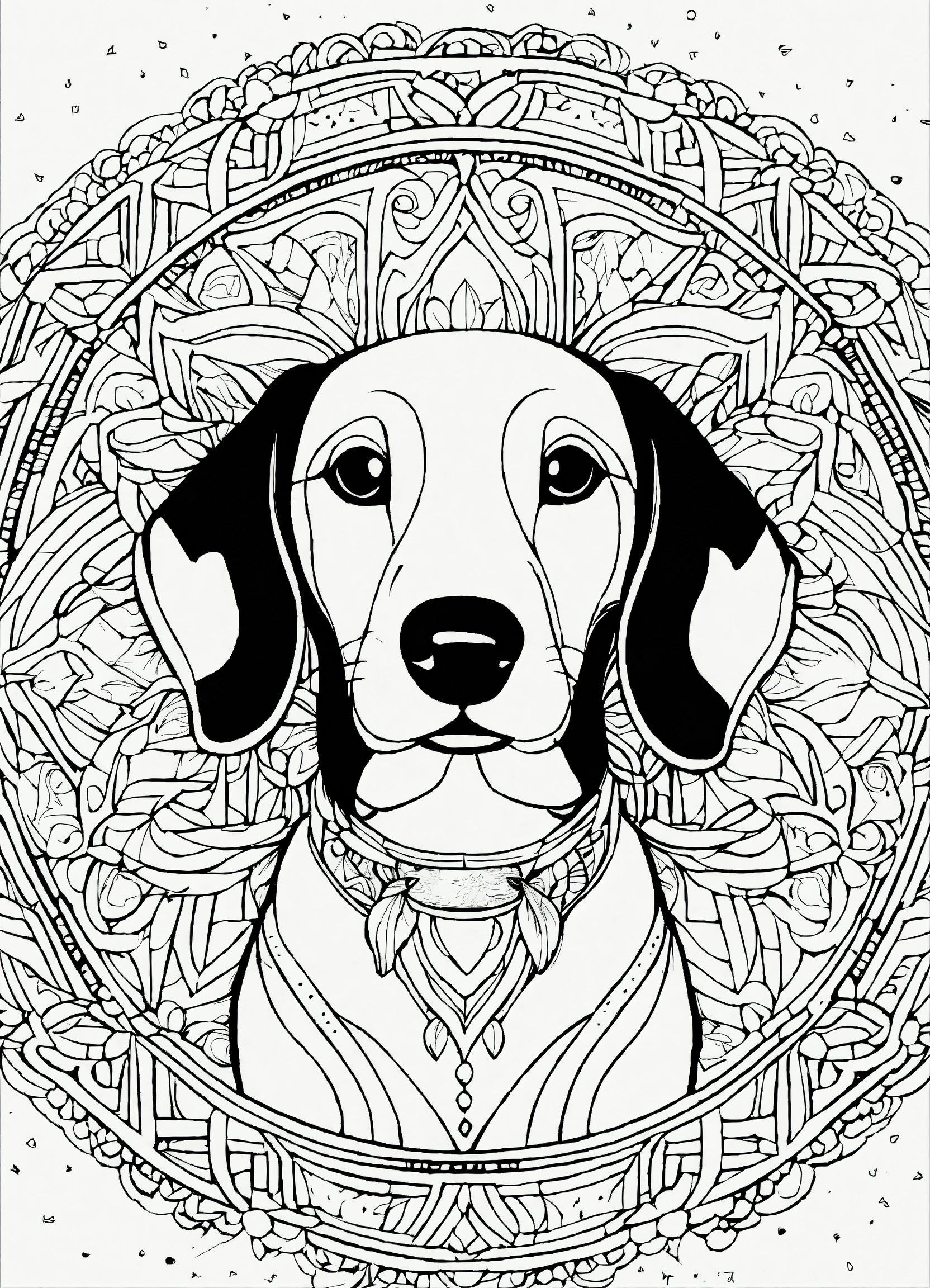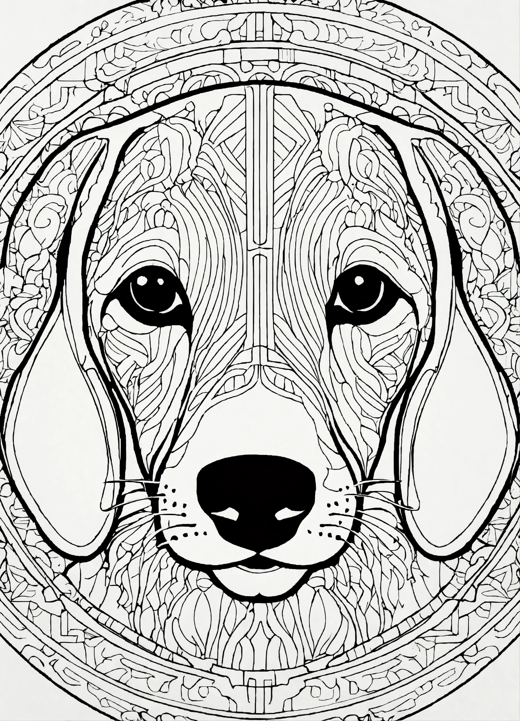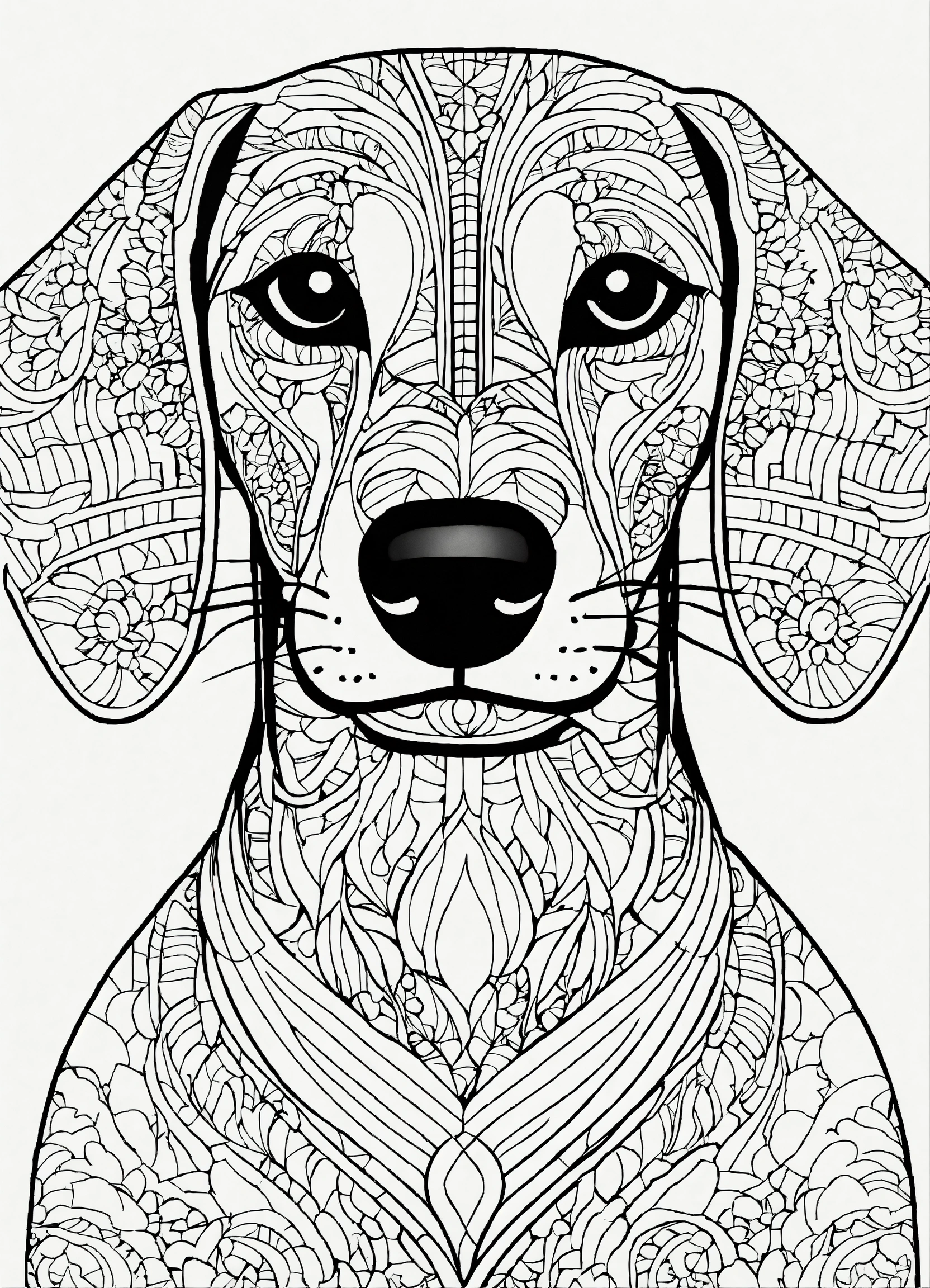 Coloring page for adults, bold lines, dark lines, mandala puppy, mandala dog dachshund (teckel) face, mandala face, symmetrical, white background, clean line art, fine line art