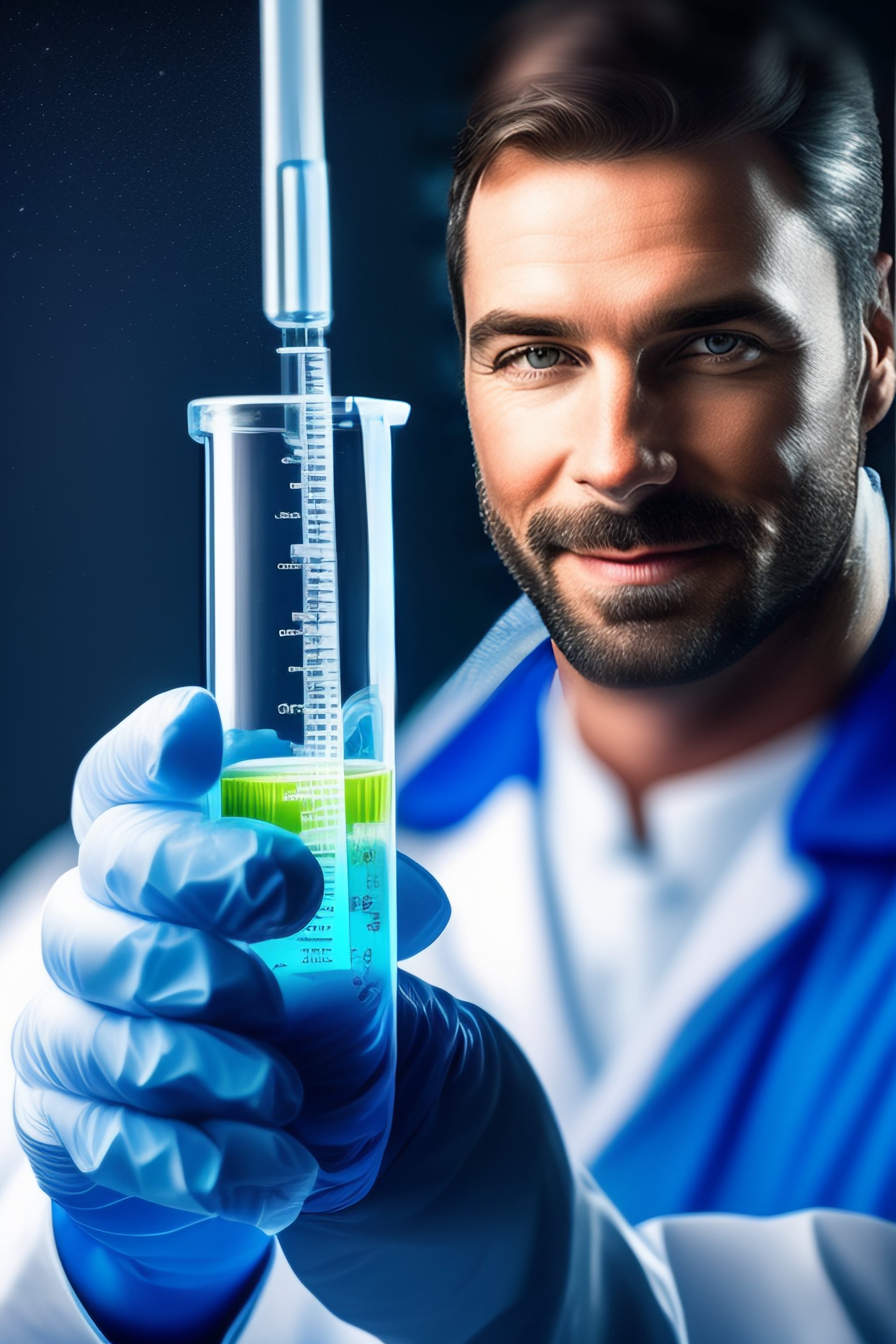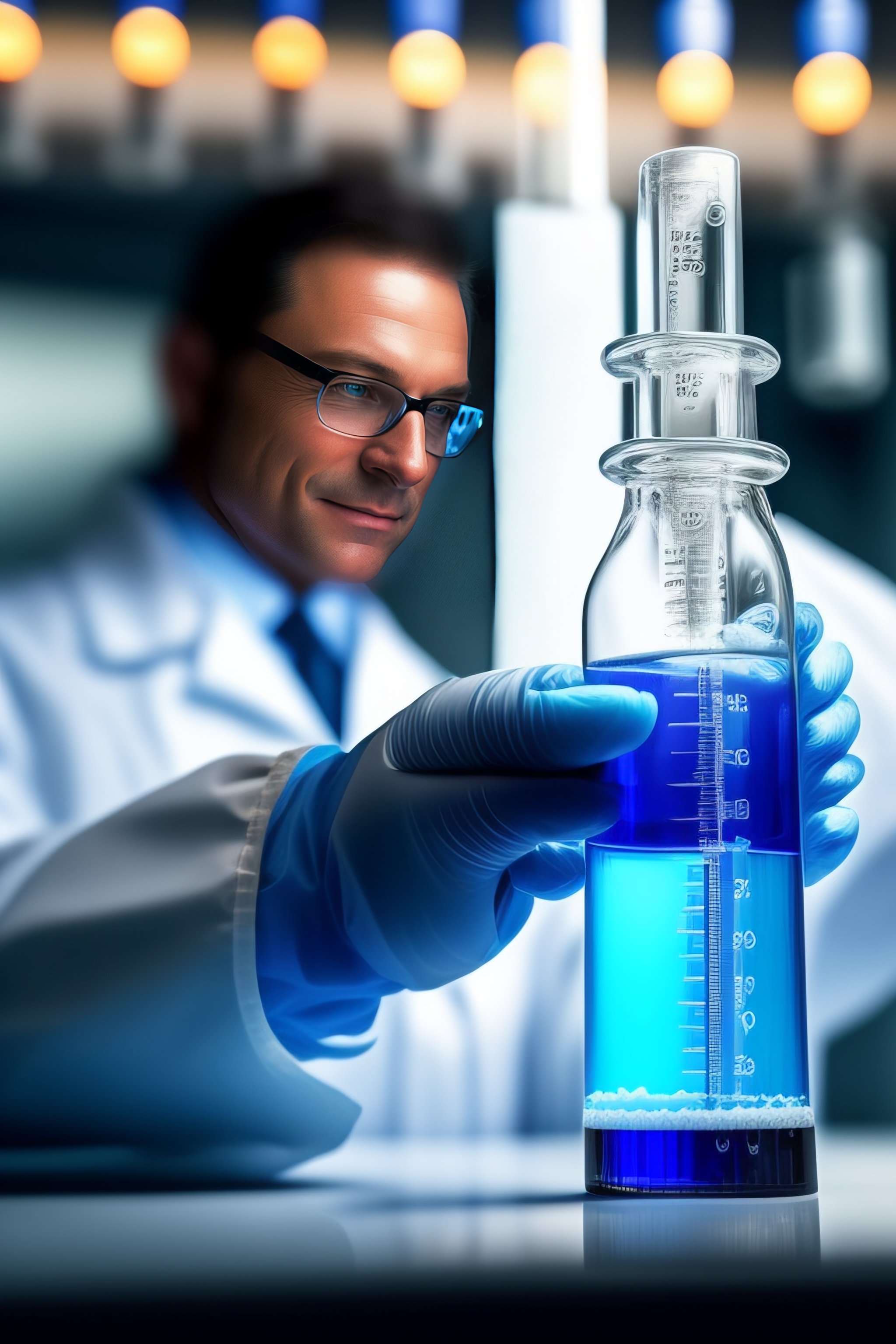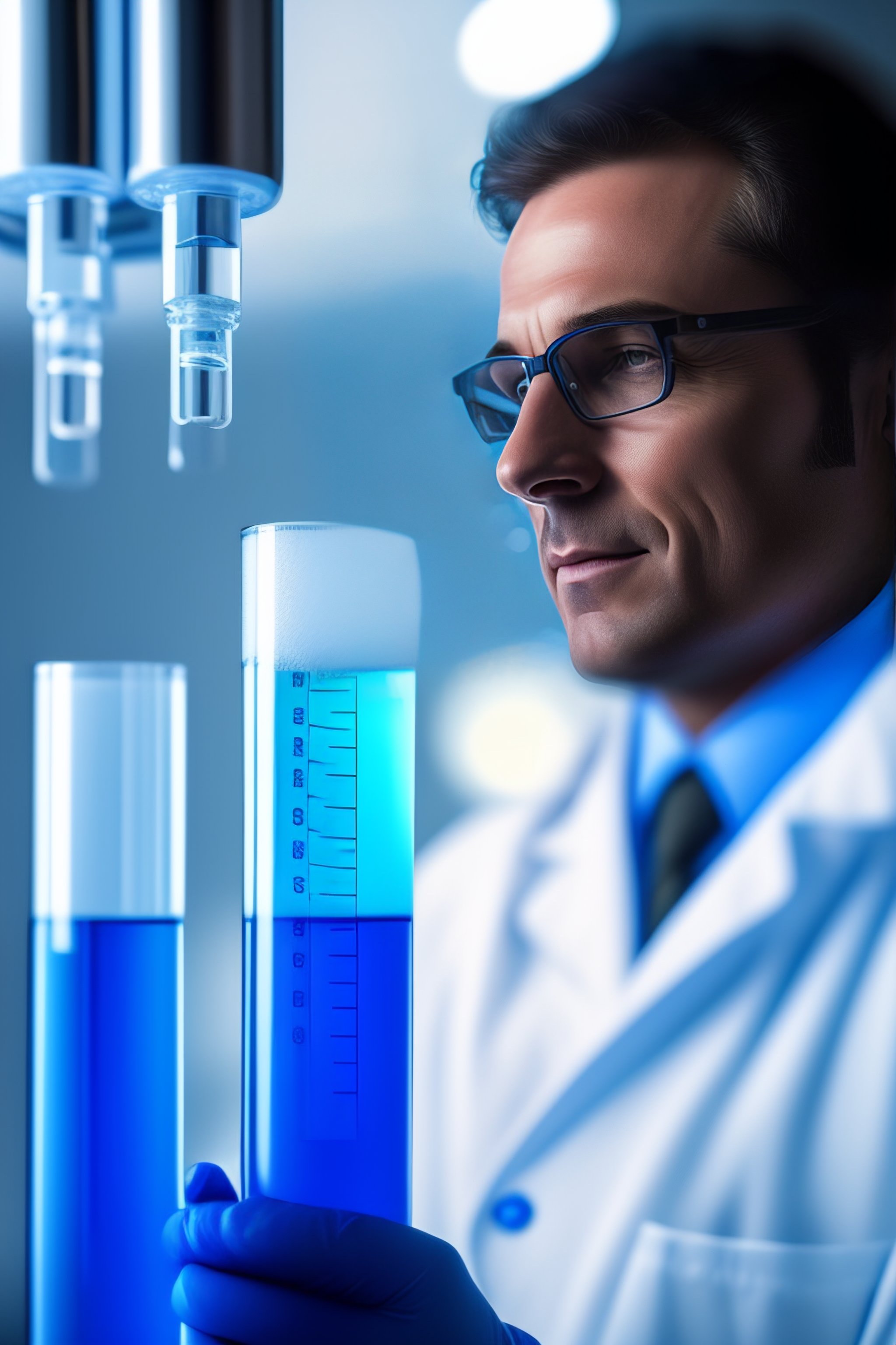 A picture of a white 40 year old scientist in a dark blue lab coat pipetting a clear liquid into a test tube