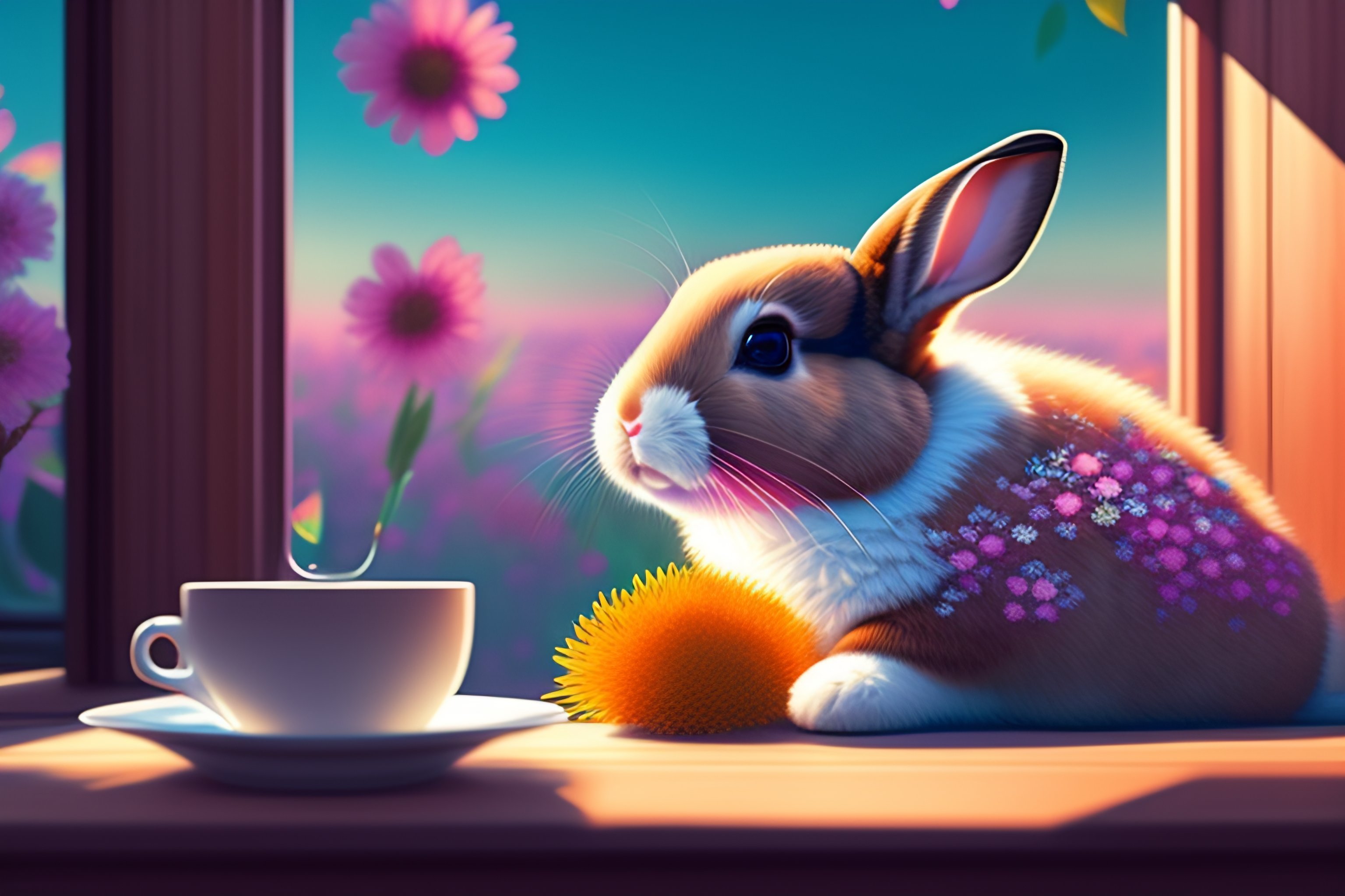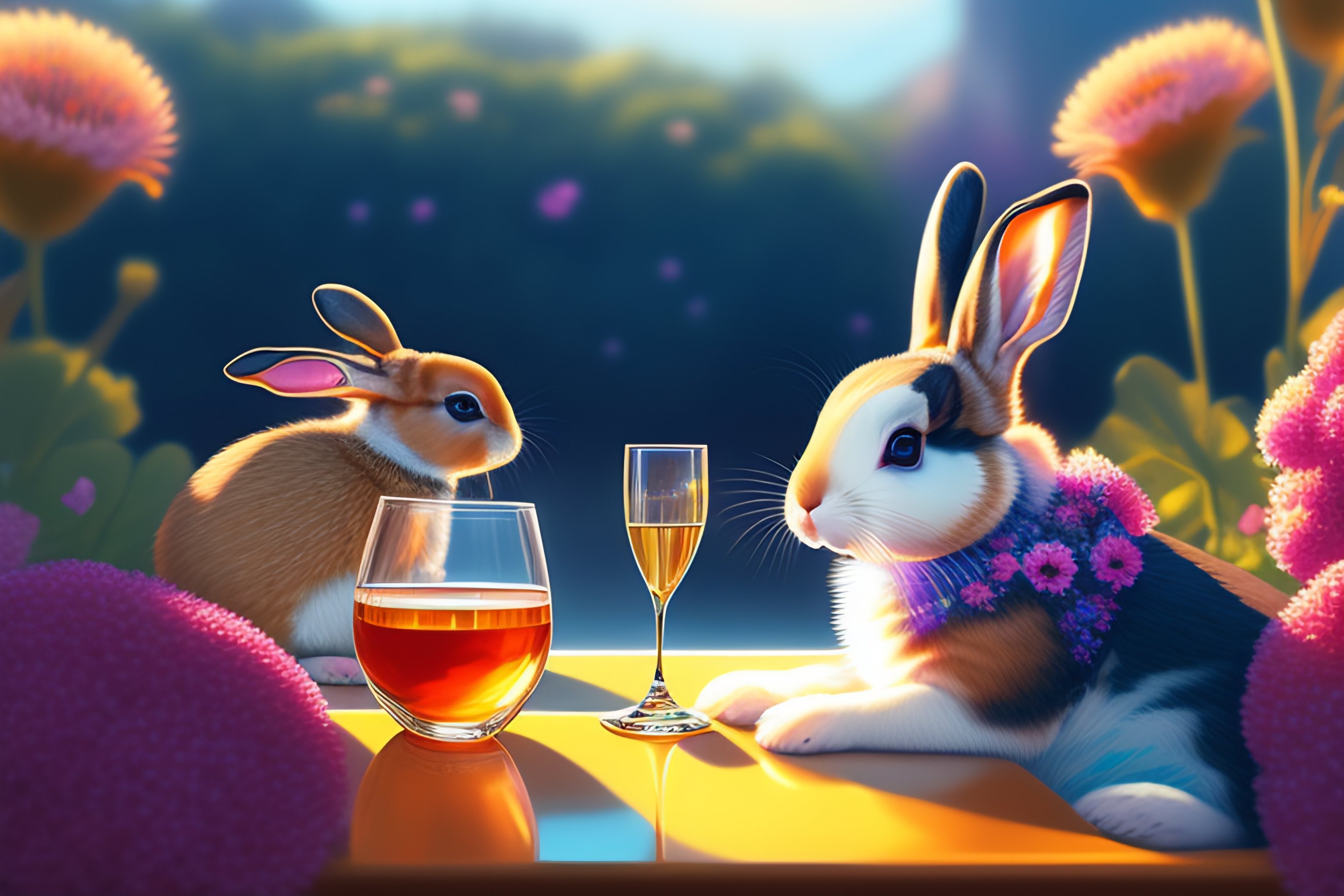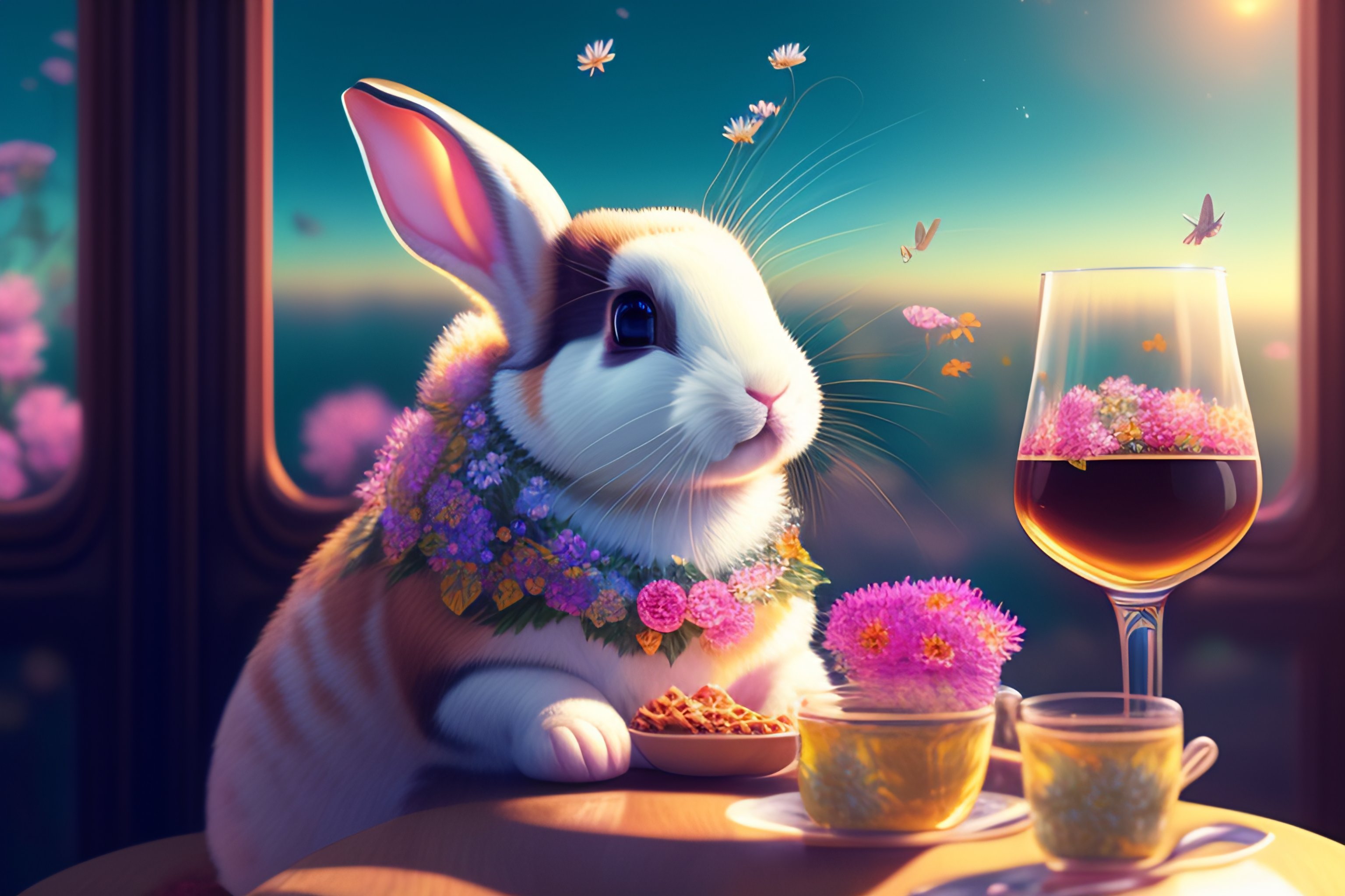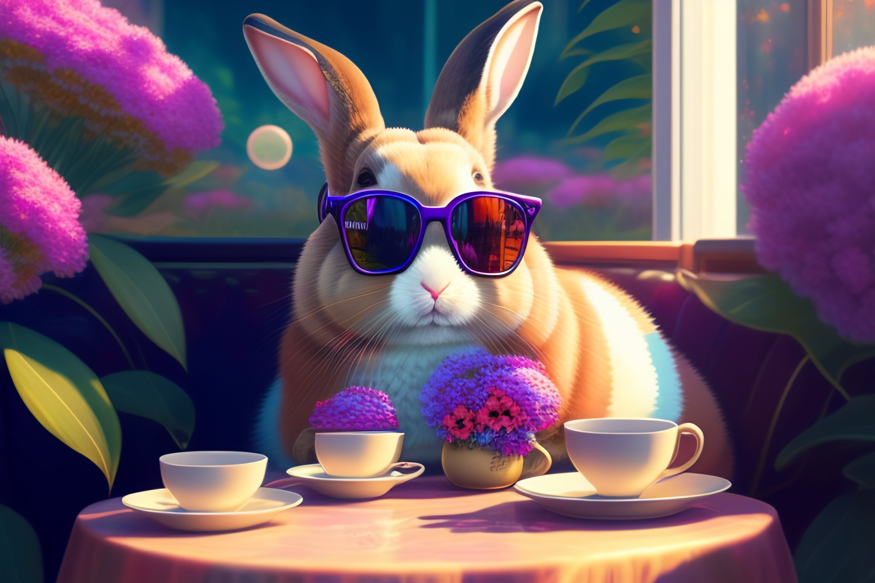 Cute bunny covered in flowers wayfarer glasses sitting psychedelic patterns inside cafe drinking wine with background by greg rutkowski makoto shinkai kyoto animation key art feminine mid shot