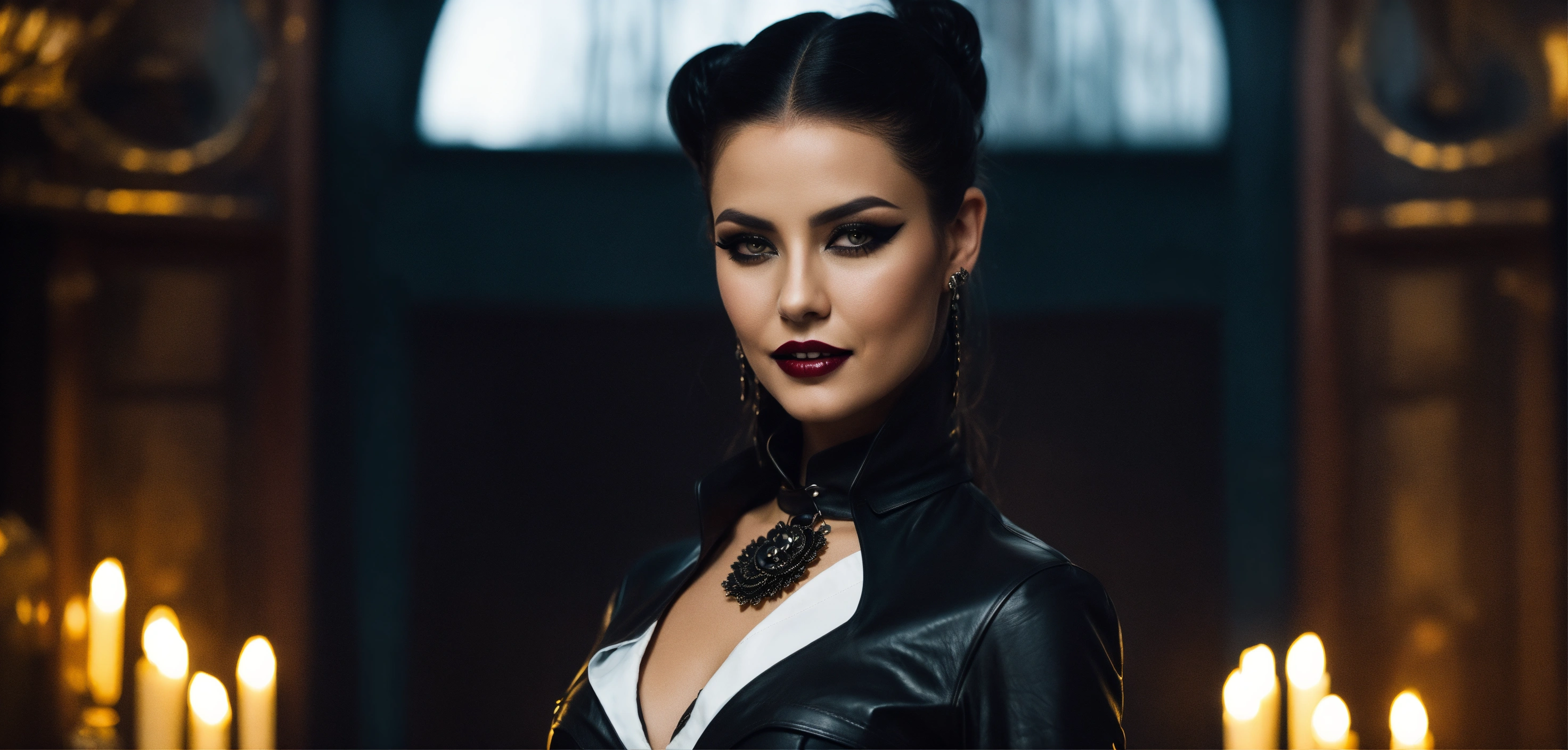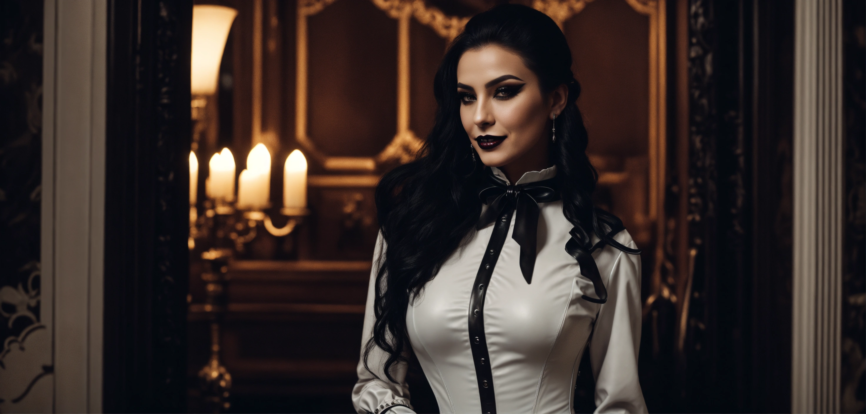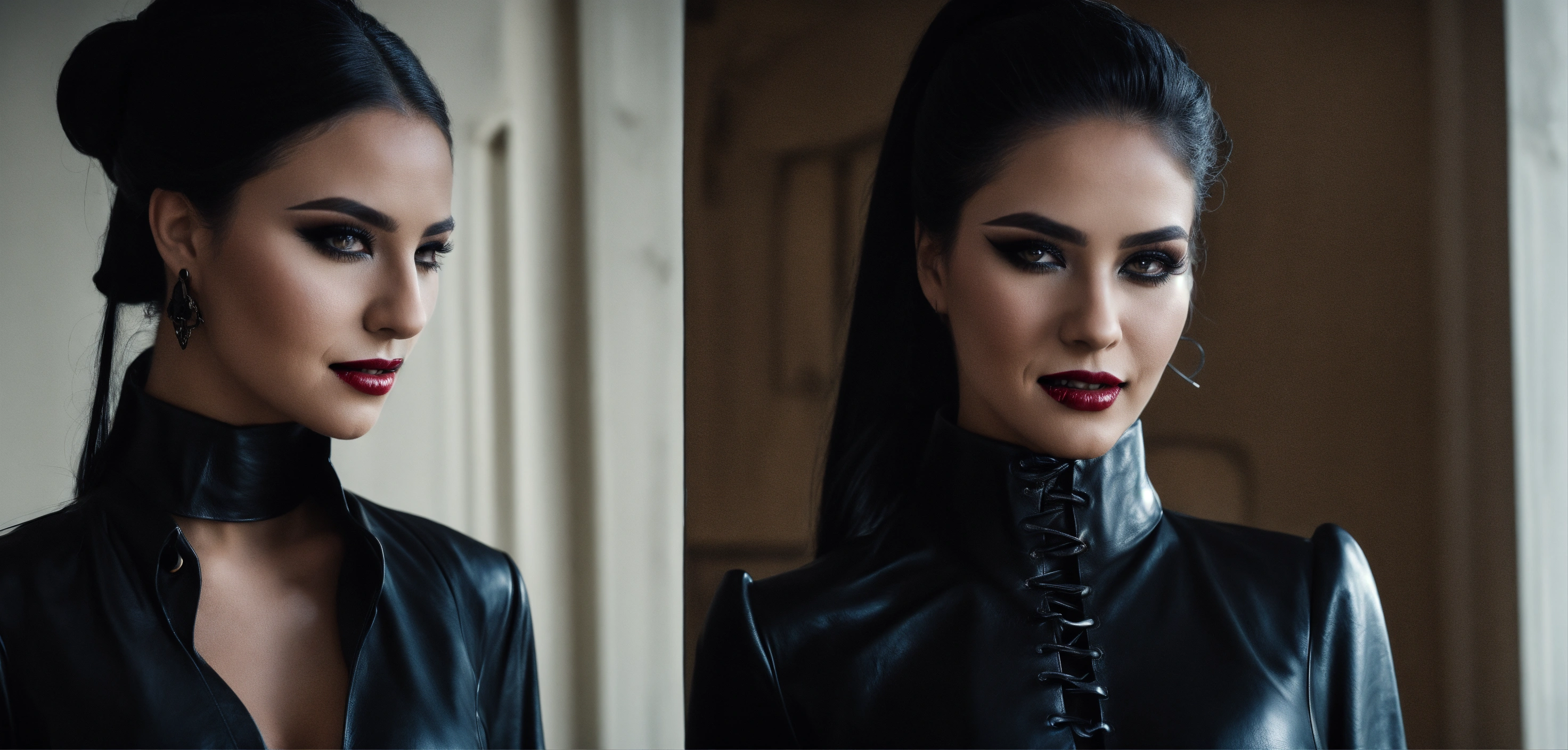 Cinematic look, two stunning arab seductress women fashion model, arrogant evil smile from above showing vampire teeth, black straight hair very high ponytail, black leather corset, long strict victorian governess wide black long leather shirt dress with long big puff sleeves and big buttons, white office shirt collar, leather gloves, eyeliner makeup, black leather boots, underworld vampire movie style, ultra-realistic; solid white background; no background