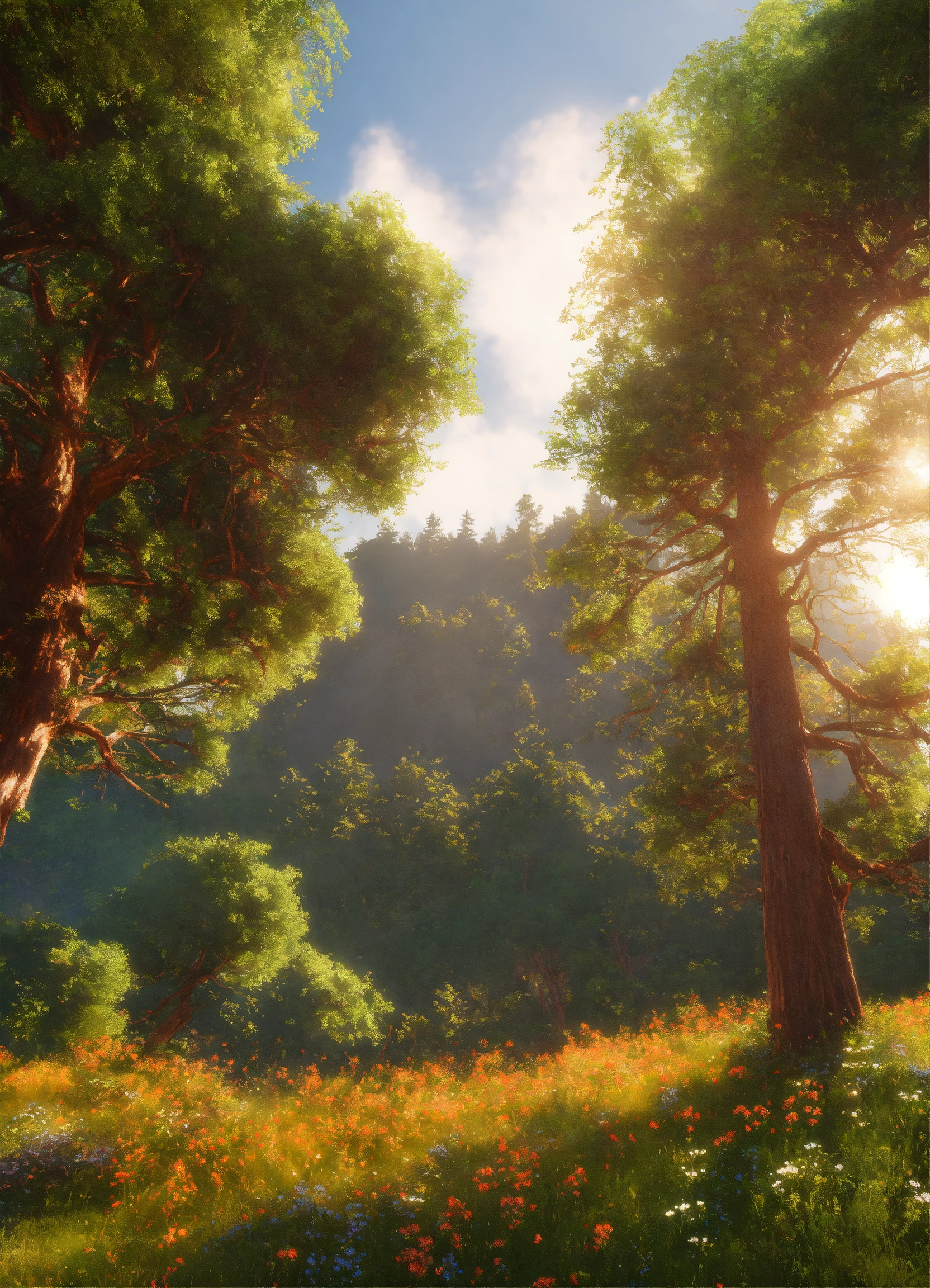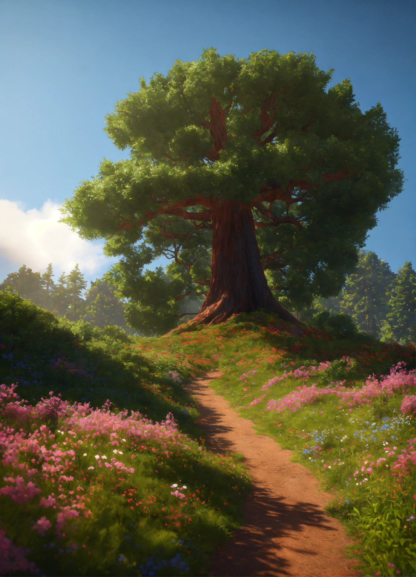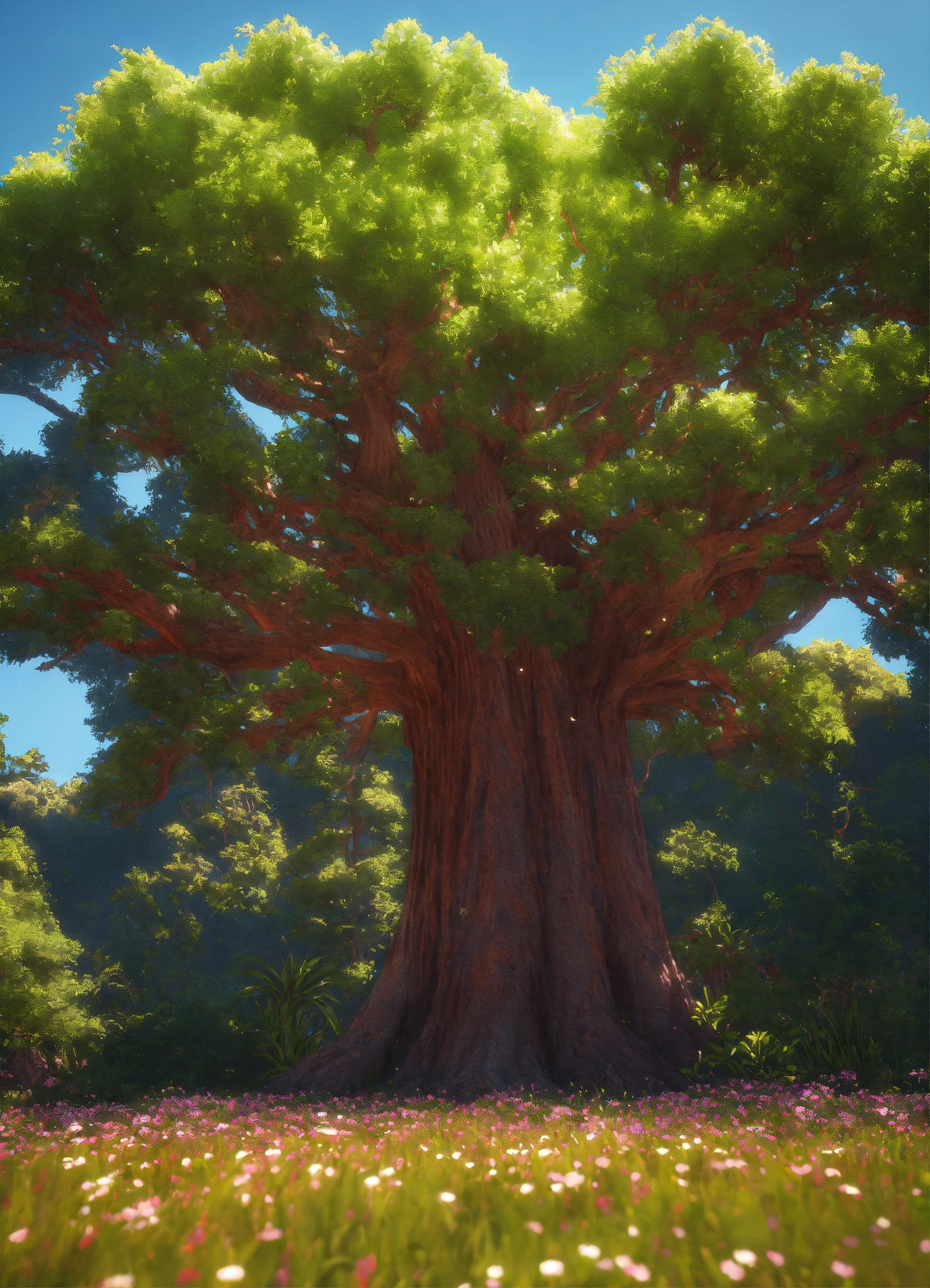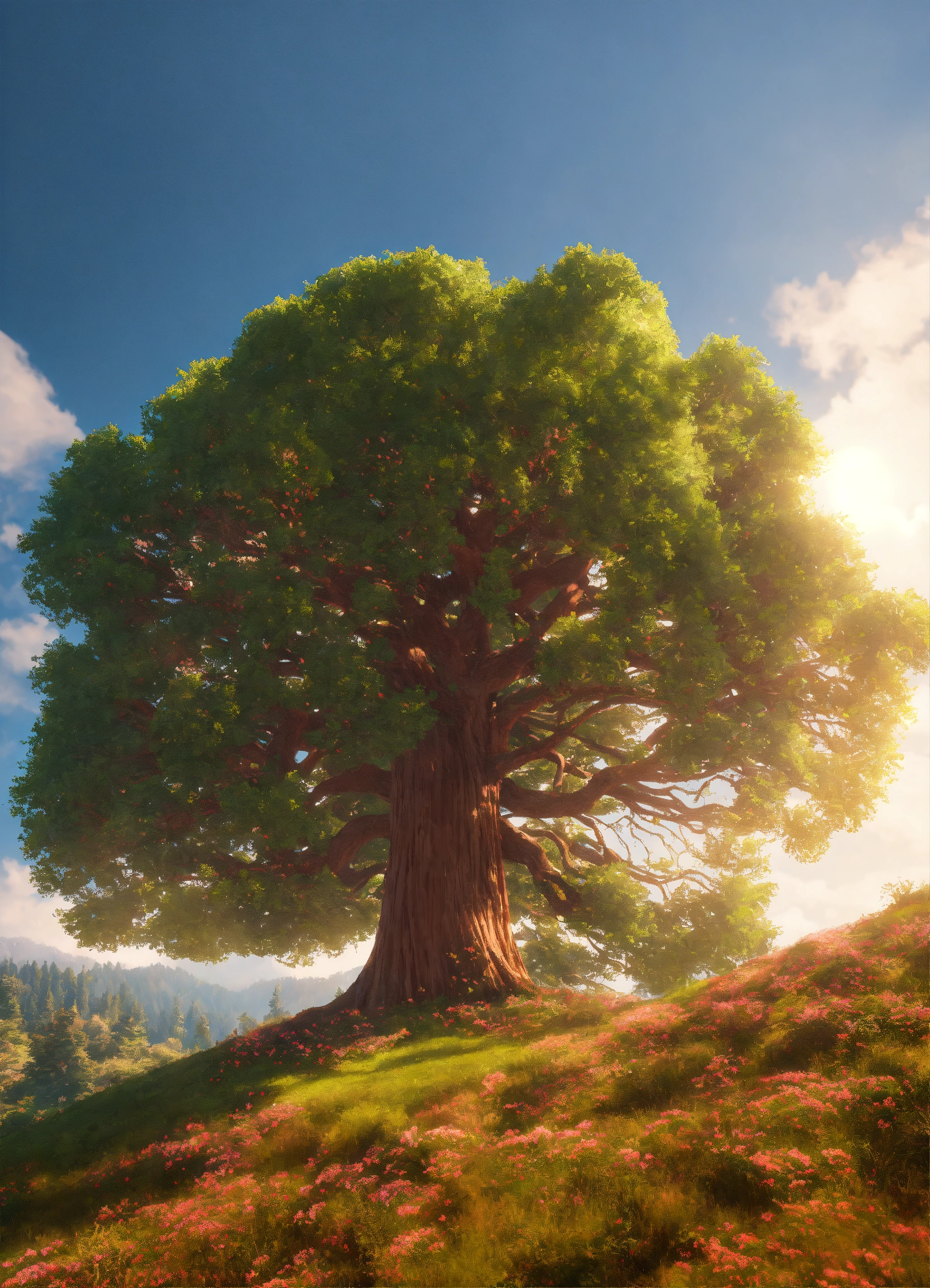 Large open field, colossal individual redwood tree of essence, graceful sweeping branches, sunny tropical paradise, tiny wildflowers, on hill, realistic, highly detailed, unreal engine, 8k