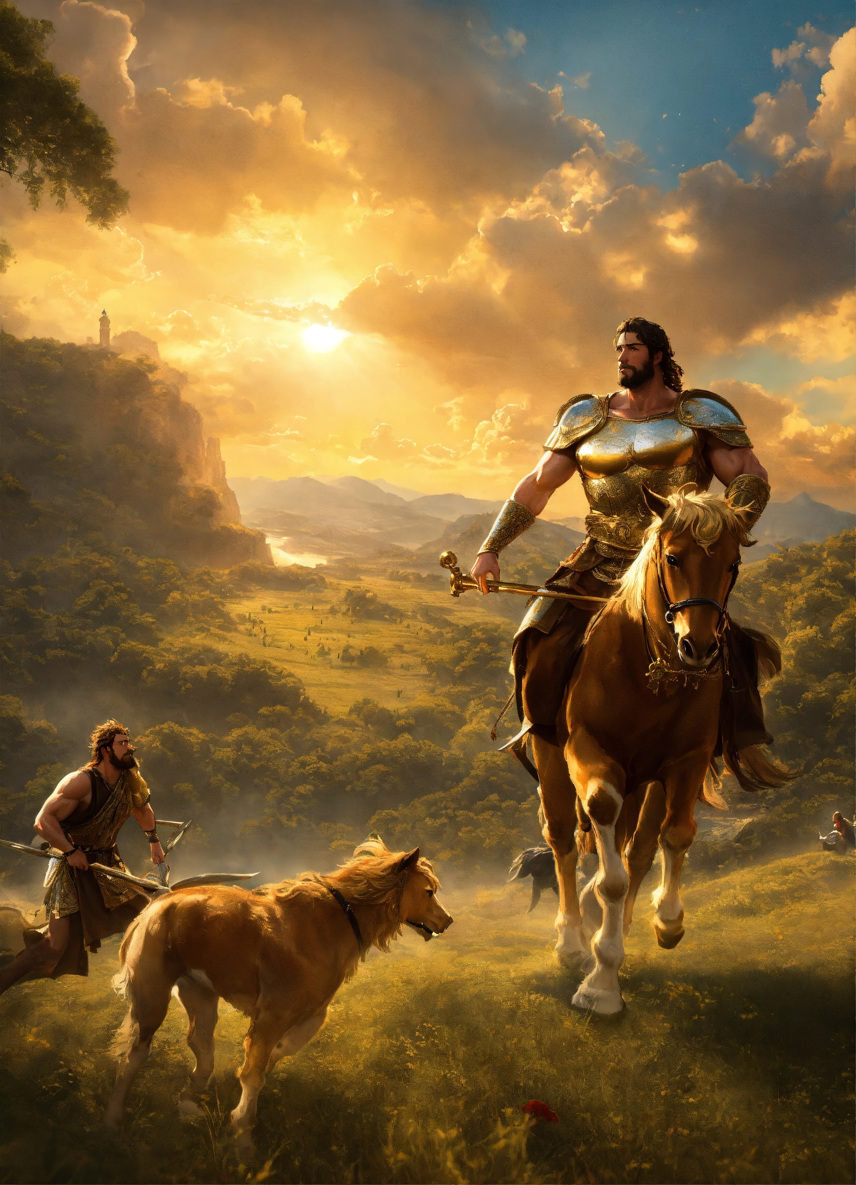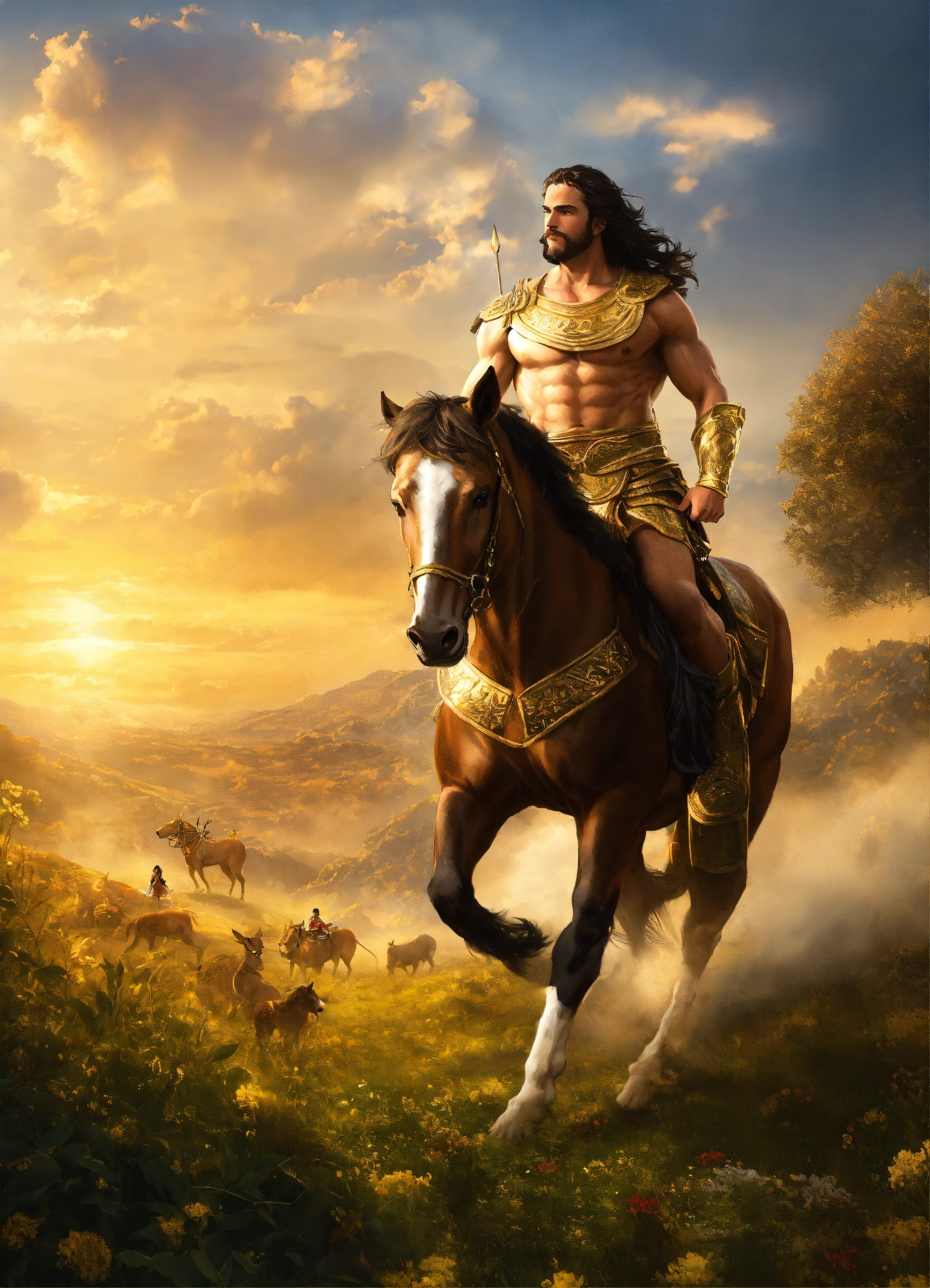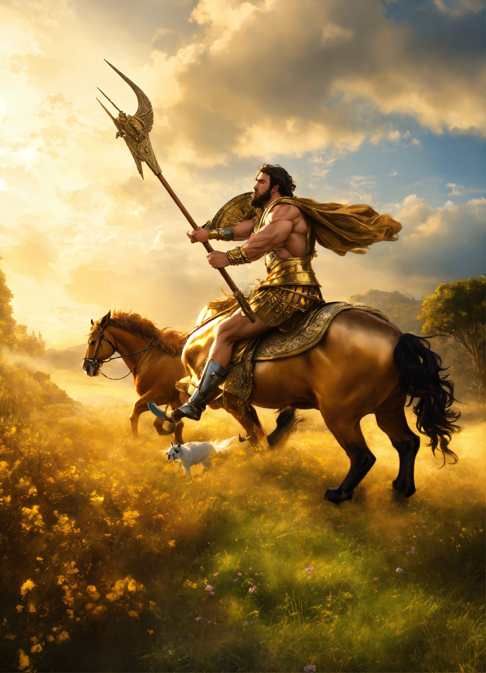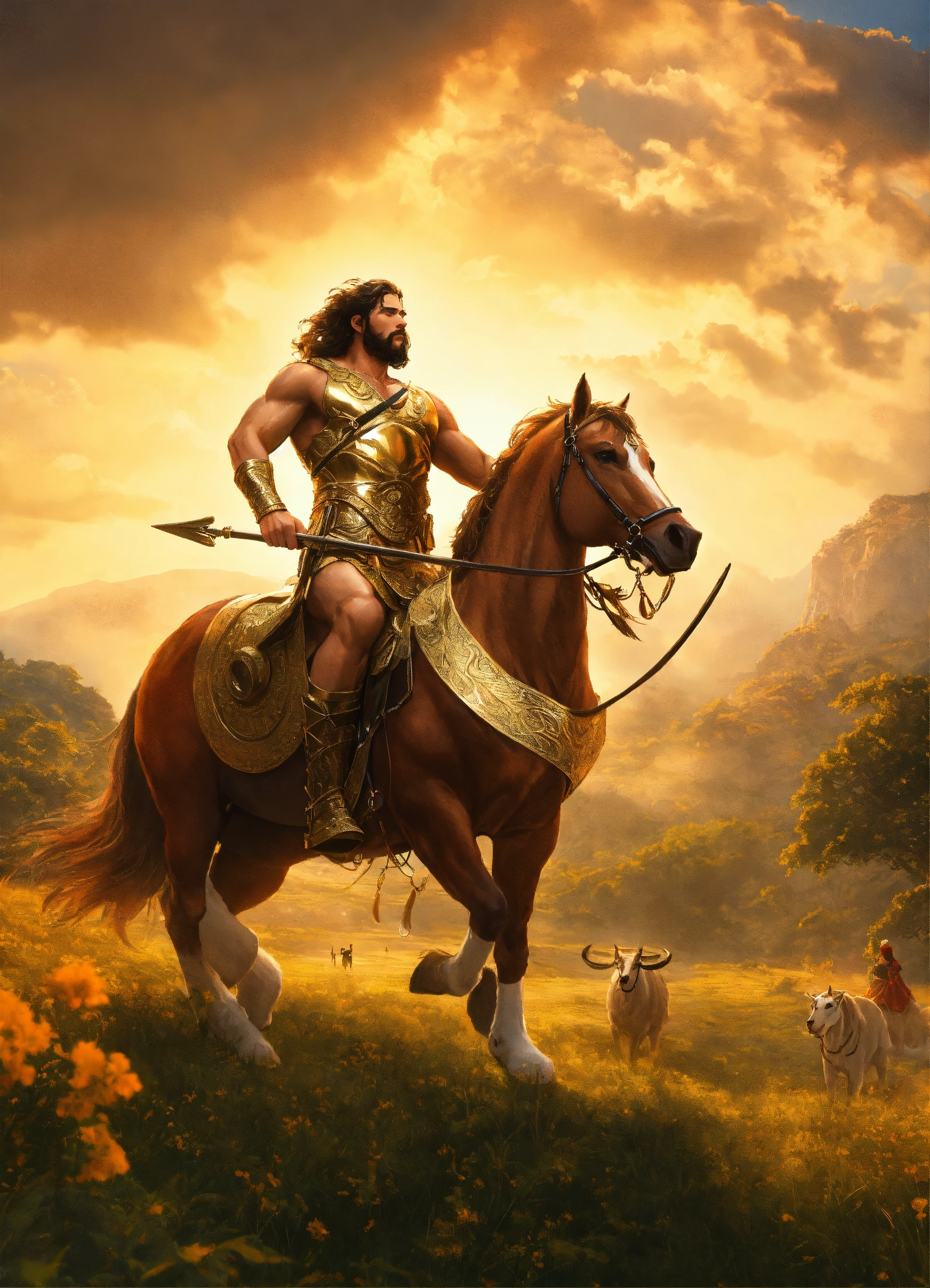 Hercules and the golden hind, ancient greece, in a chase sequence, dressed in greek warrior attire, across a beautiful, ethereal meadow, attempting to capture the elusive creature, with awe-struck gods and goddesses watching from the clouds above, sunrise casting a golden glow on the scene, wide-angle shot, hyper-realistic, photo realism, cinematography --ar 916.