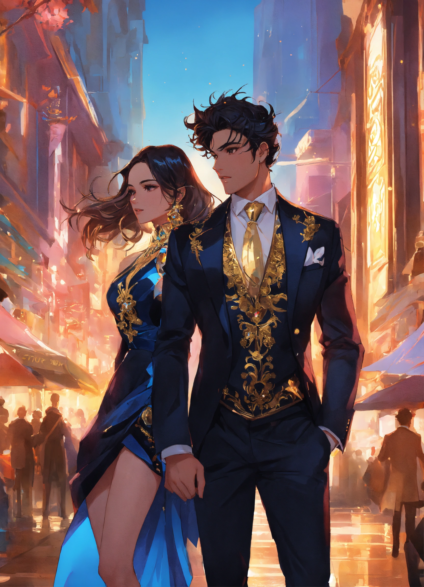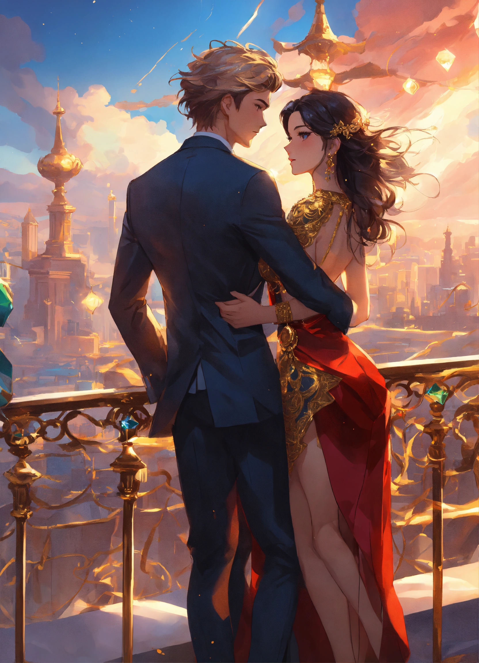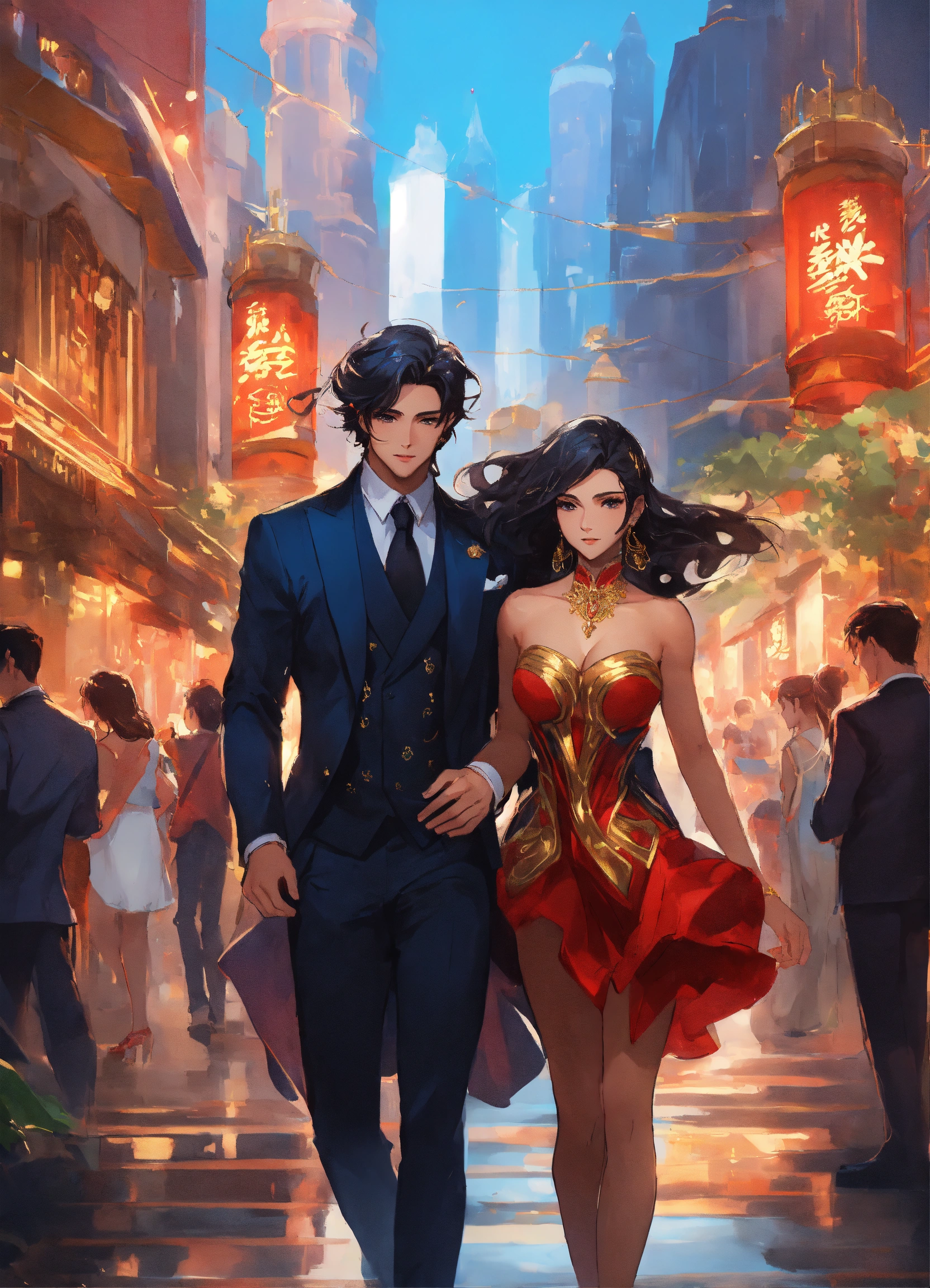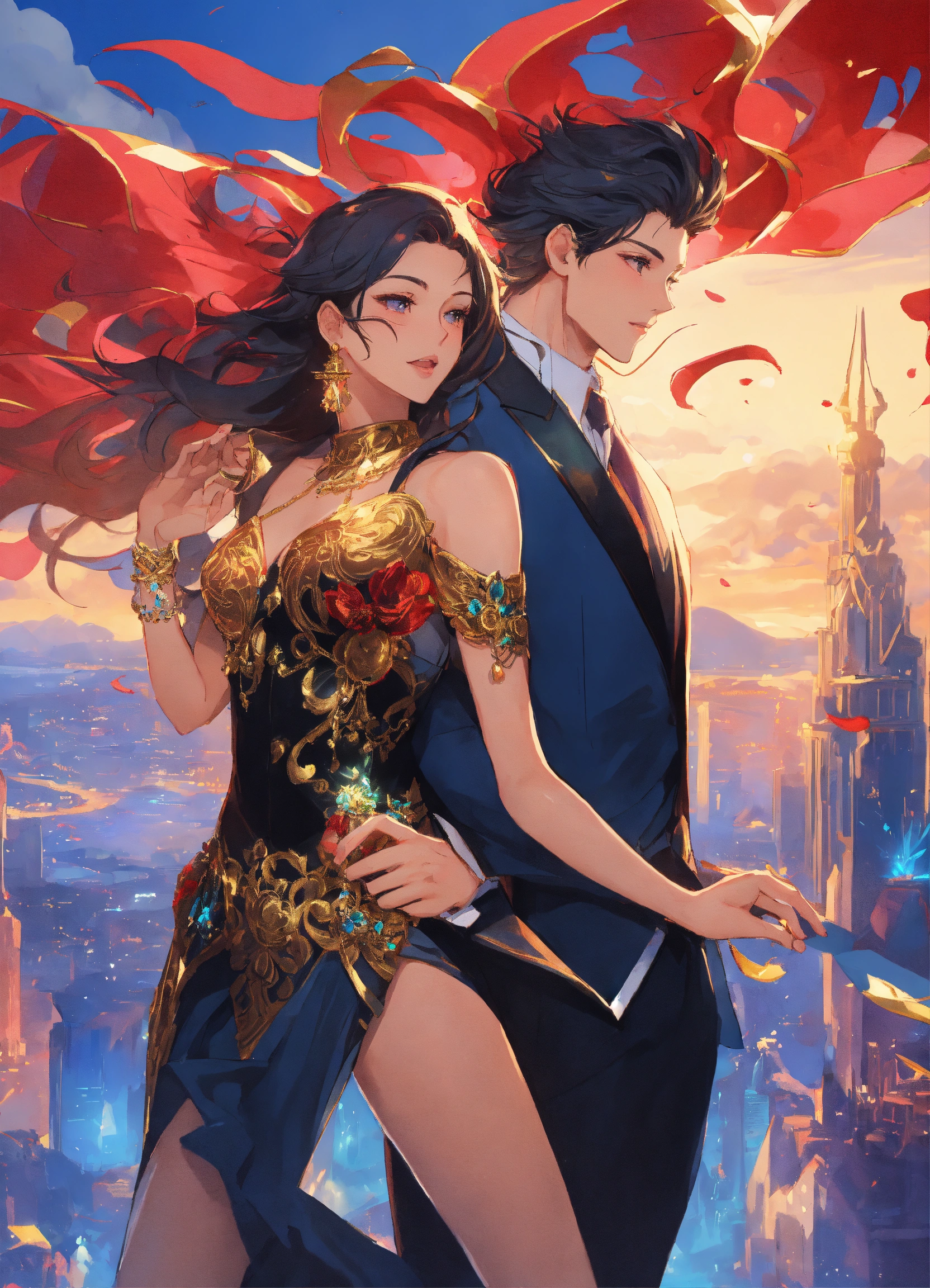 Illustration of beautiful city with crystal towers, vibrant colors, blue aky, fair skin, the young man wears a intricate black suit with gold ornaments, has wavy black tousled hair, the woman wears a red dress with gold adornments that shows legs, she has muscles, maximalist, 8k photo, animestyle, by artgerm, trending on artstation, windy, dynamic, landscape