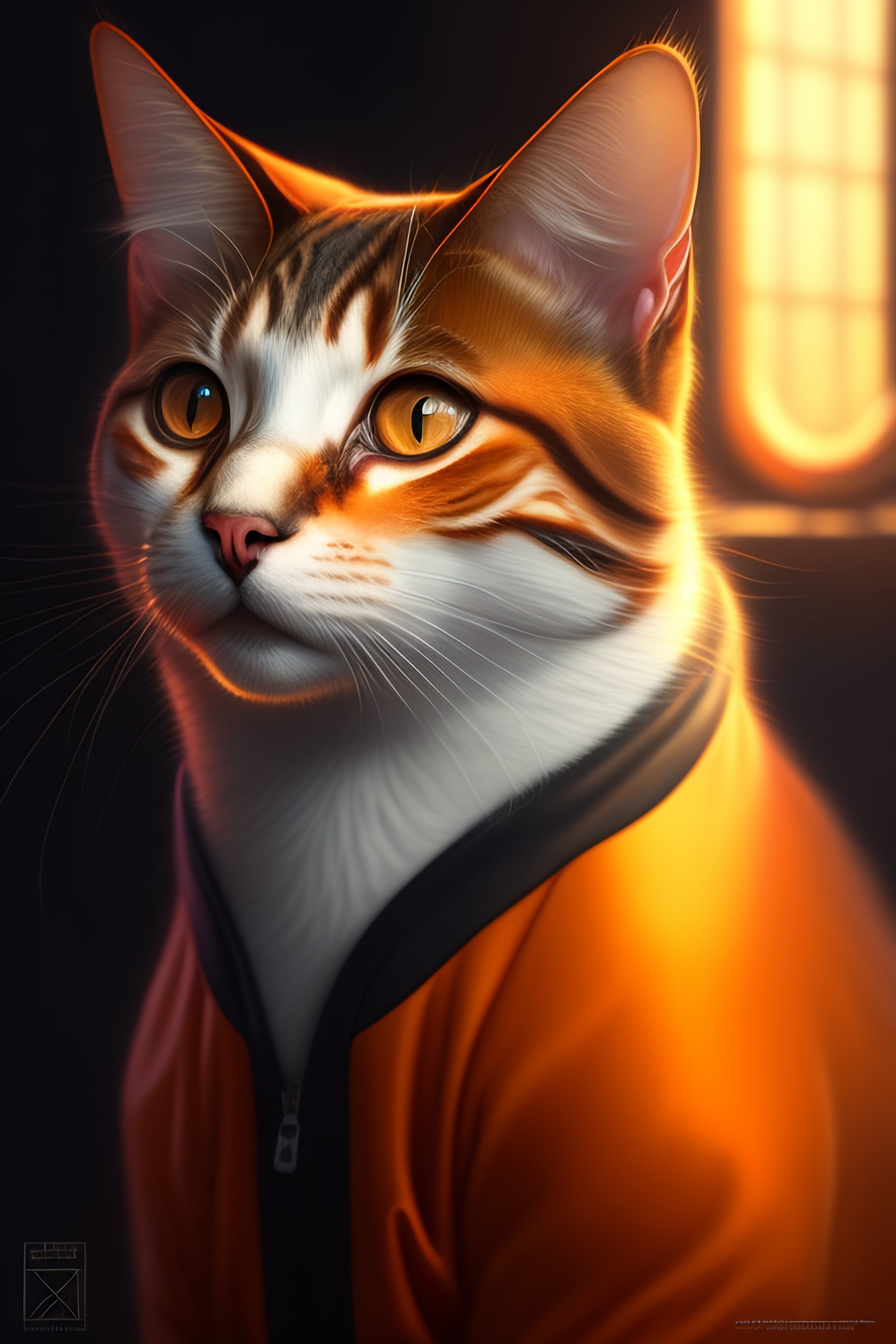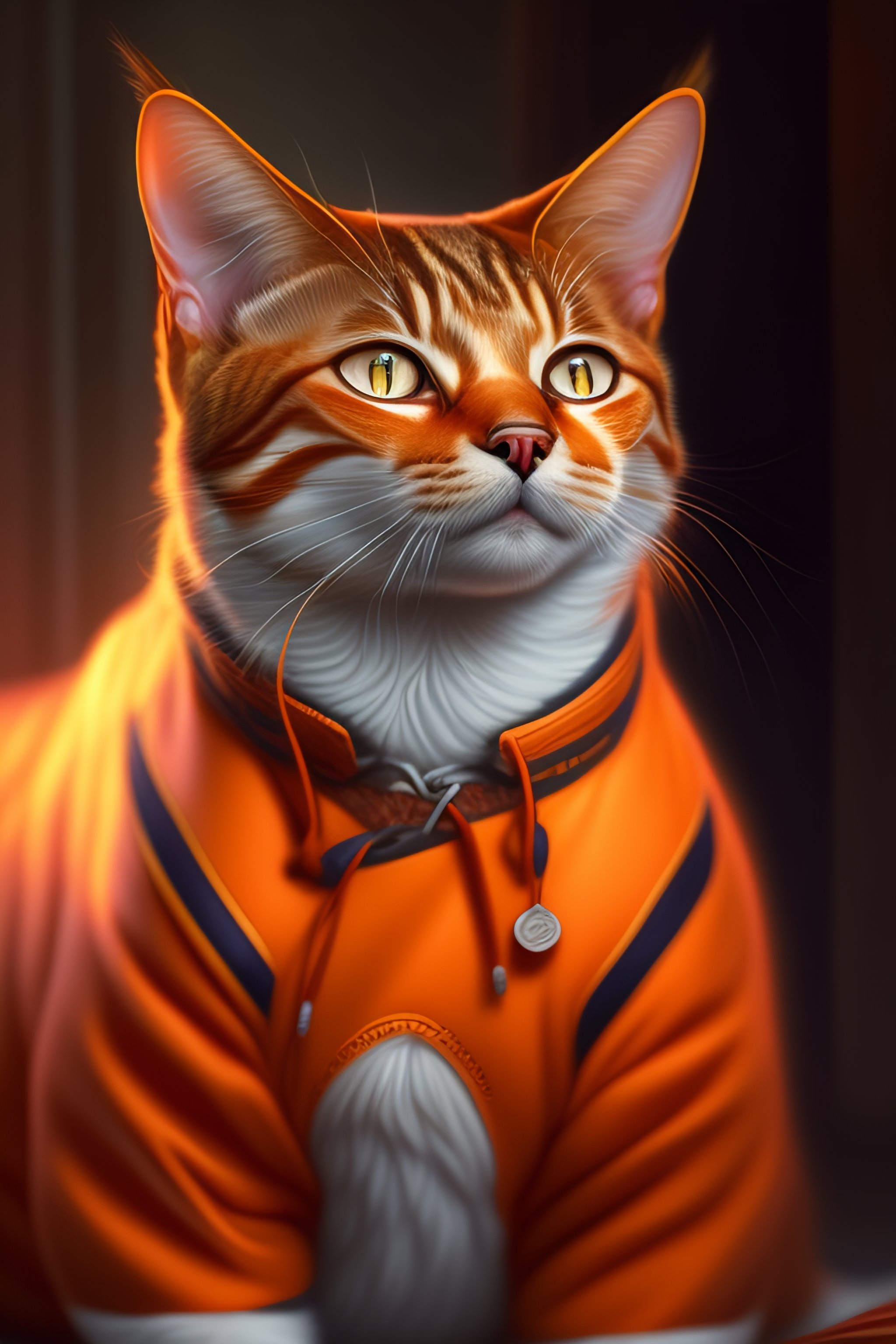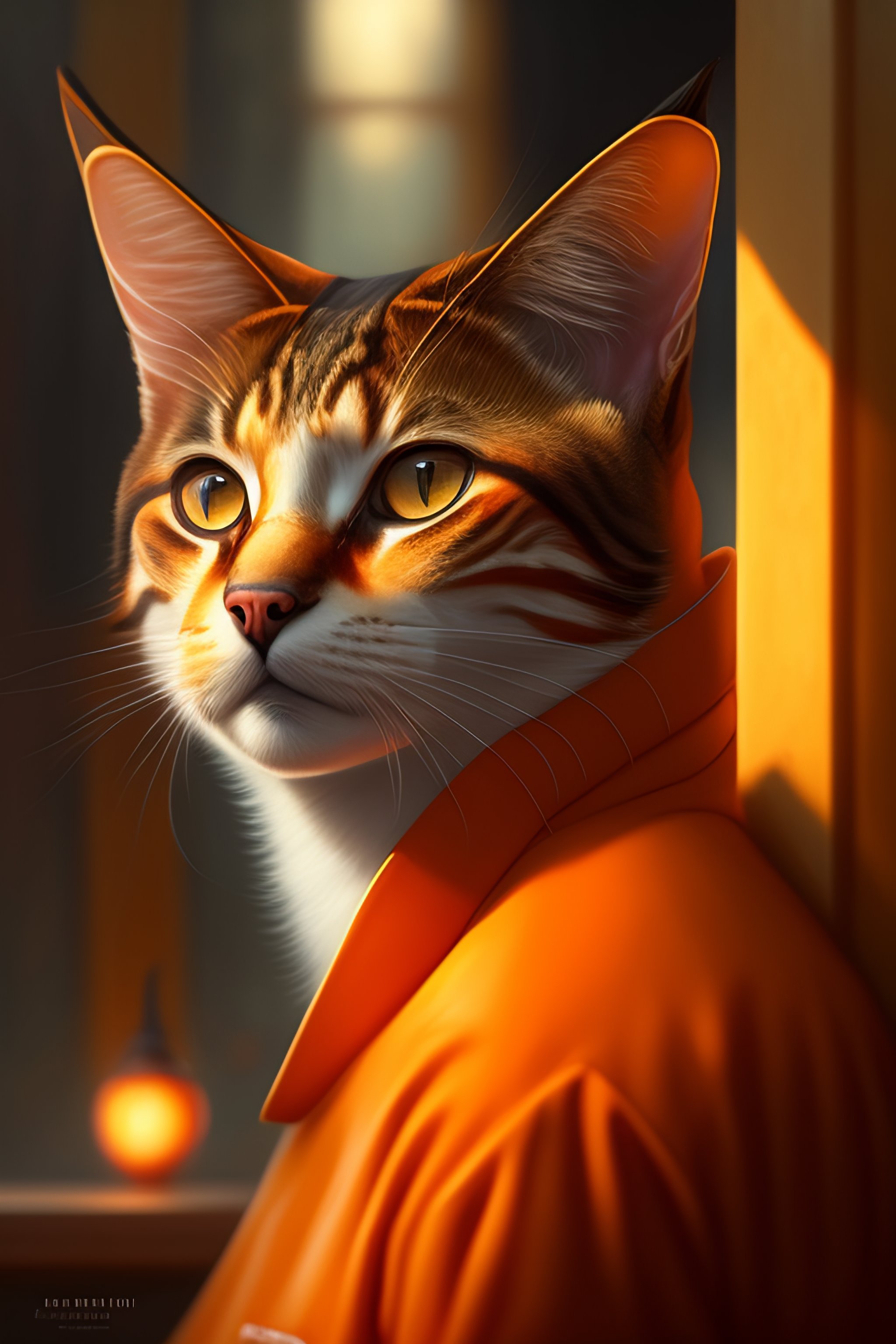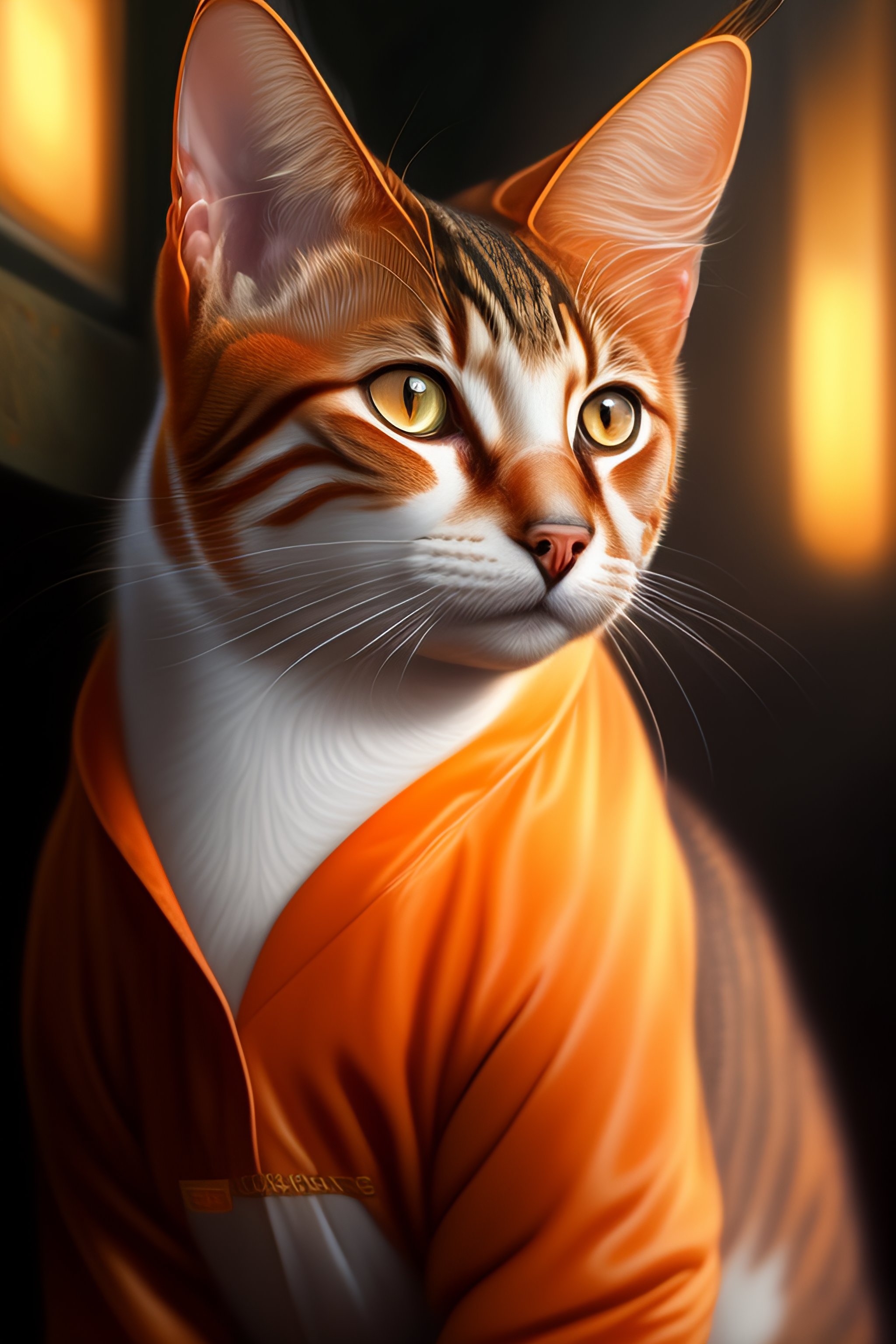 A tabby cat wearing orange prison pajamas locked up in an asylum prison, intricate, headshot, highly detailed, digital painting, artstation, concept art, sharp focus, cinematic lighting, digital painting, art by artgerm and greg rutkowski, alphonse mucha, cgsociety, realism