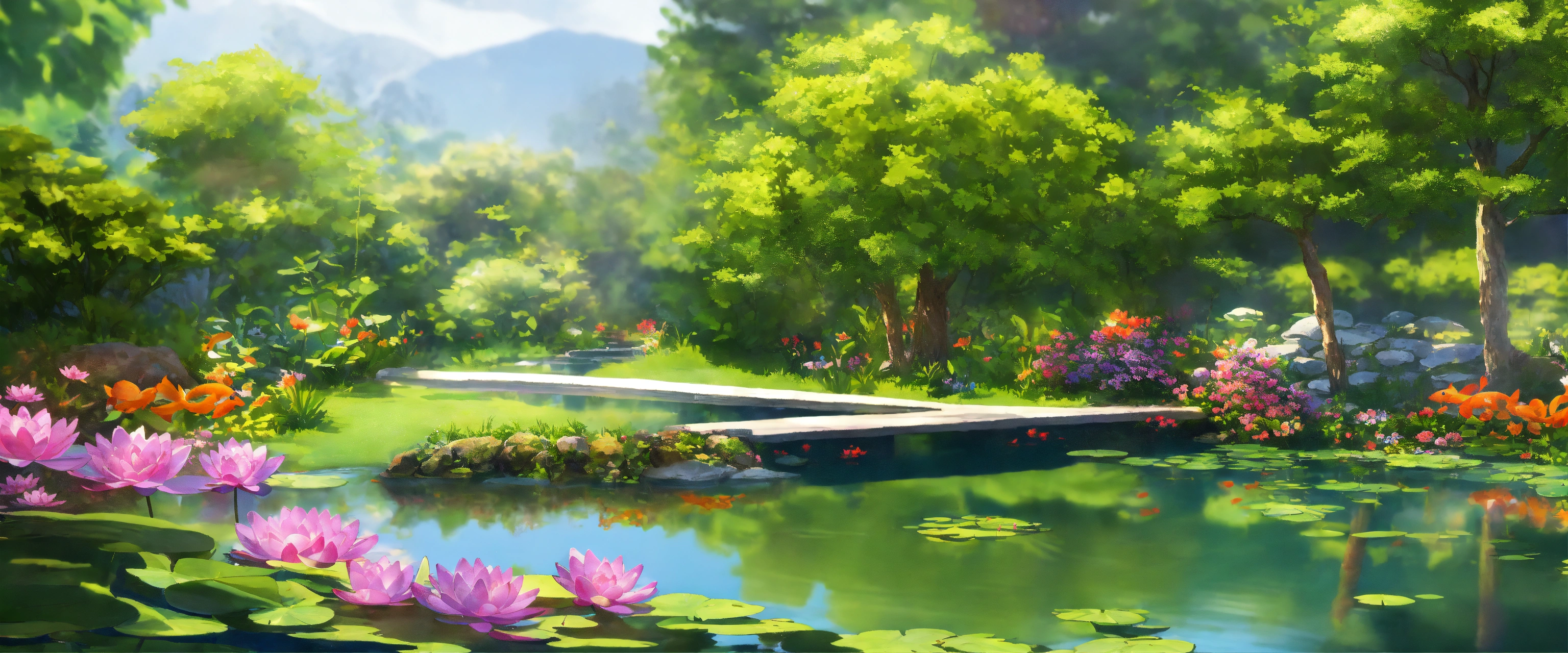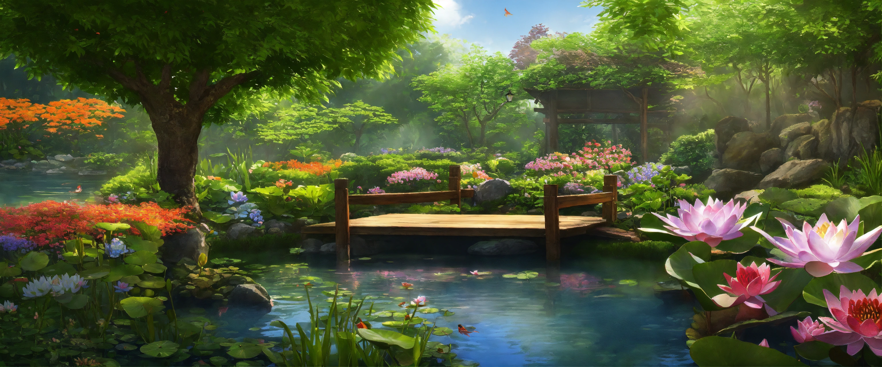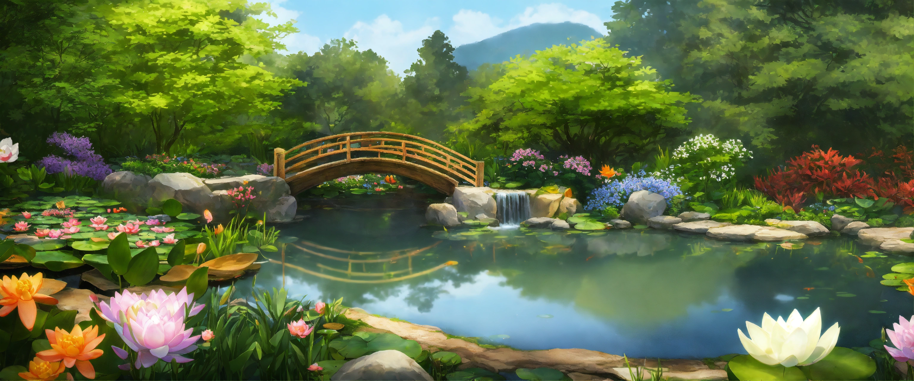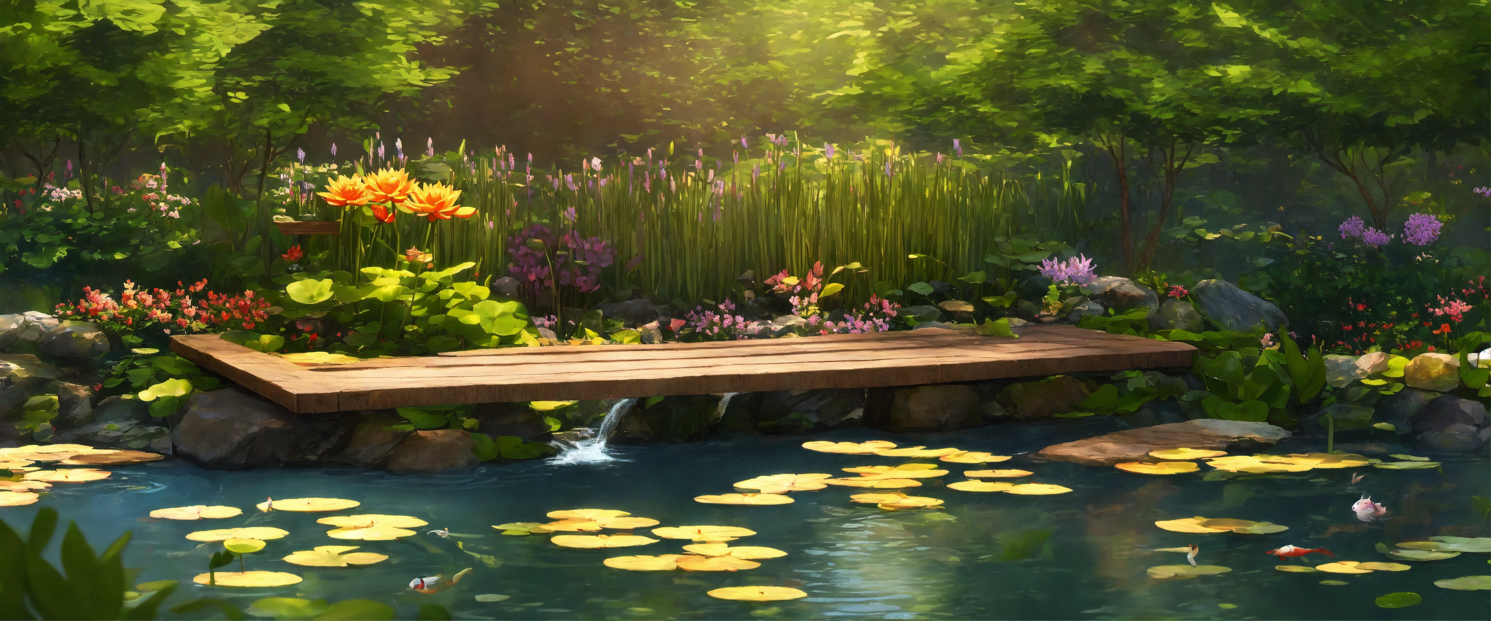 Create an image of a realistic garden pond setting during the daytime. the pond is nestled in a lush, vibrant garden, teeming with a variety of flowering plants and greenery. there are water lilies floating on the surface of the clear, still water, and a few colorful koi fish can be seen beneath the surface. a small, rustic wooden bridge arches over the narrowest part of the pond. in the background, a gentle waterfall trickles down a rock feature, adding a soothing sound of water to the scene. sunlight filters through the leaves of the surrounding trees, casting dappled light and creating a serene atmosphere.