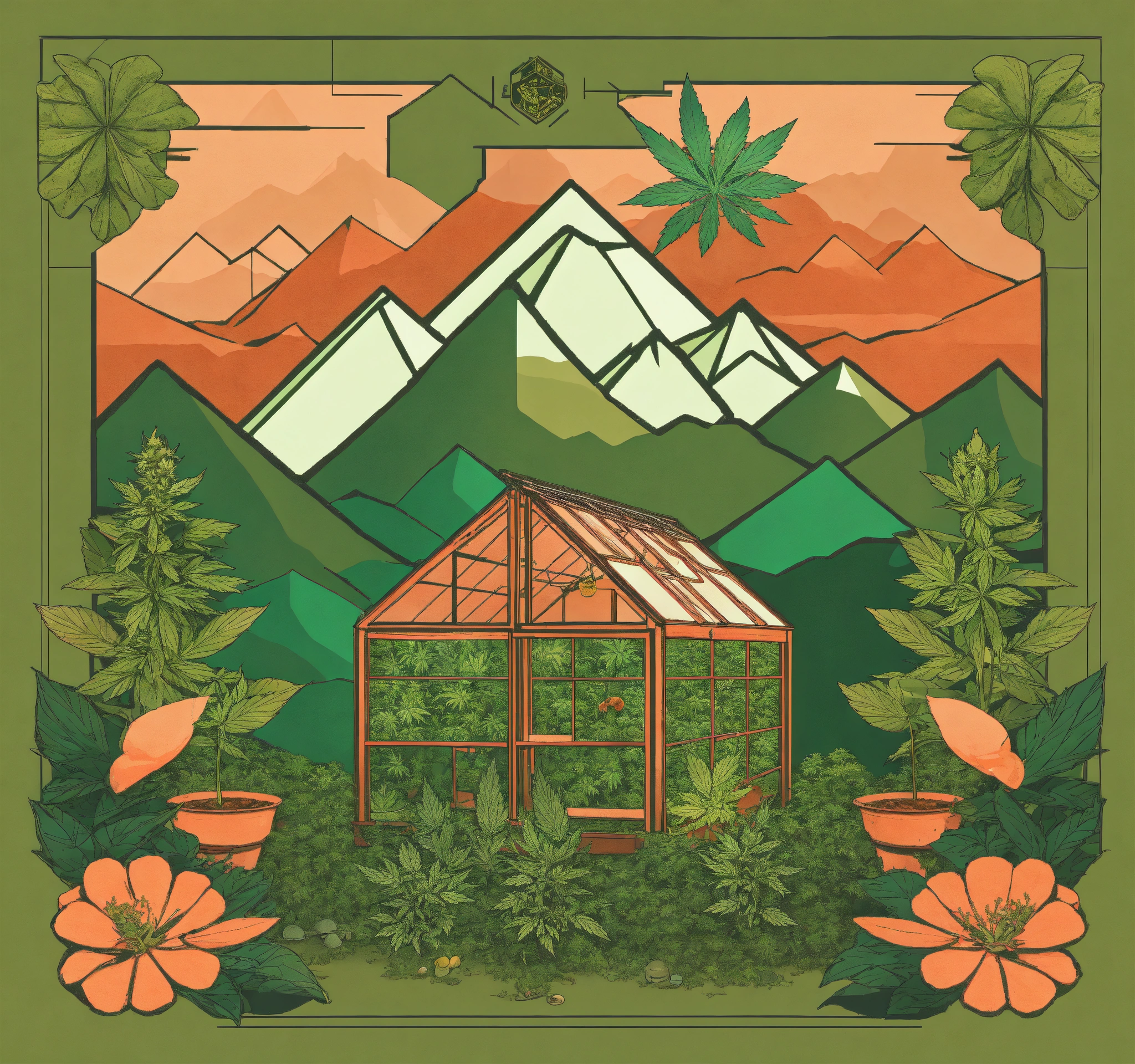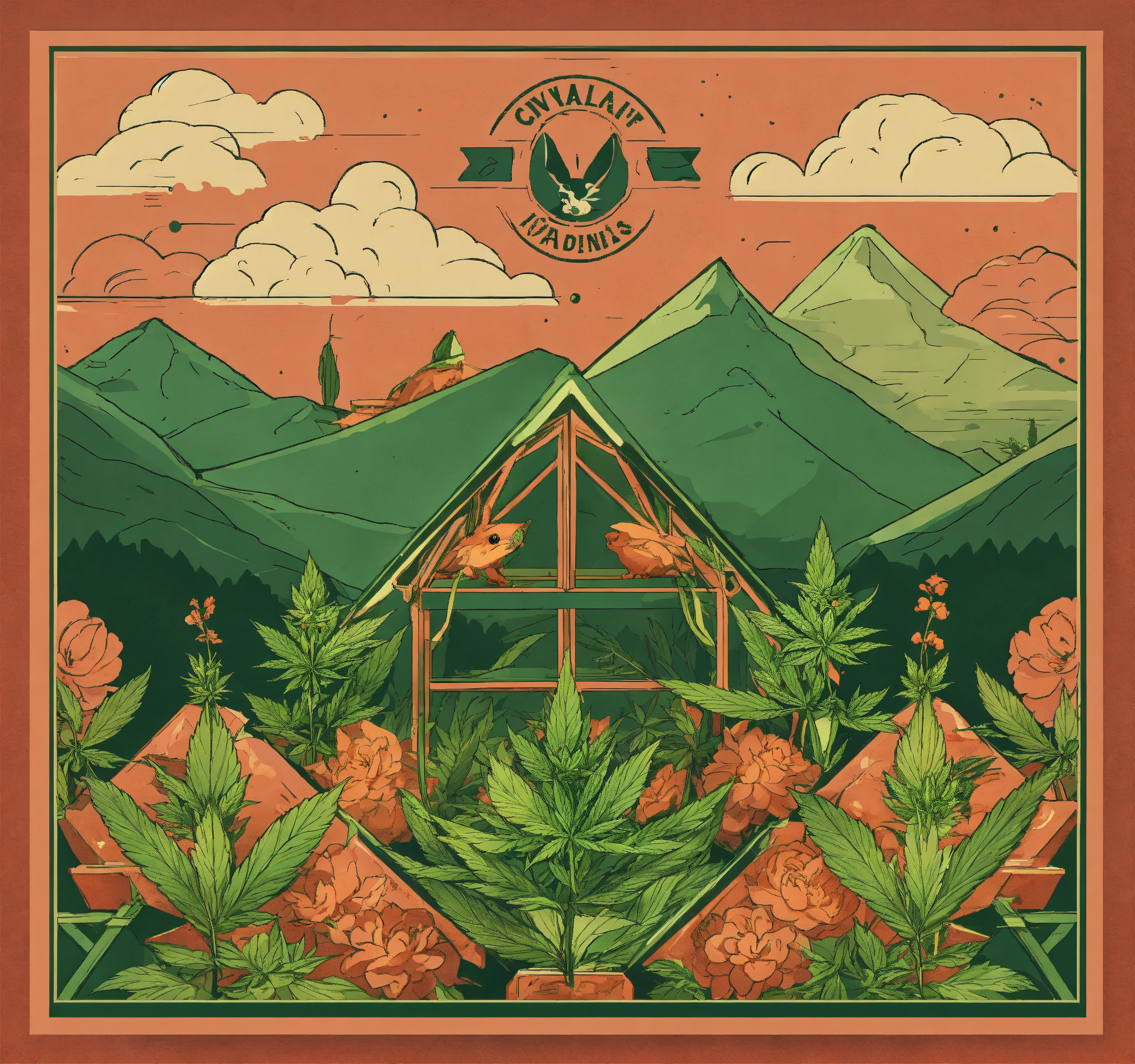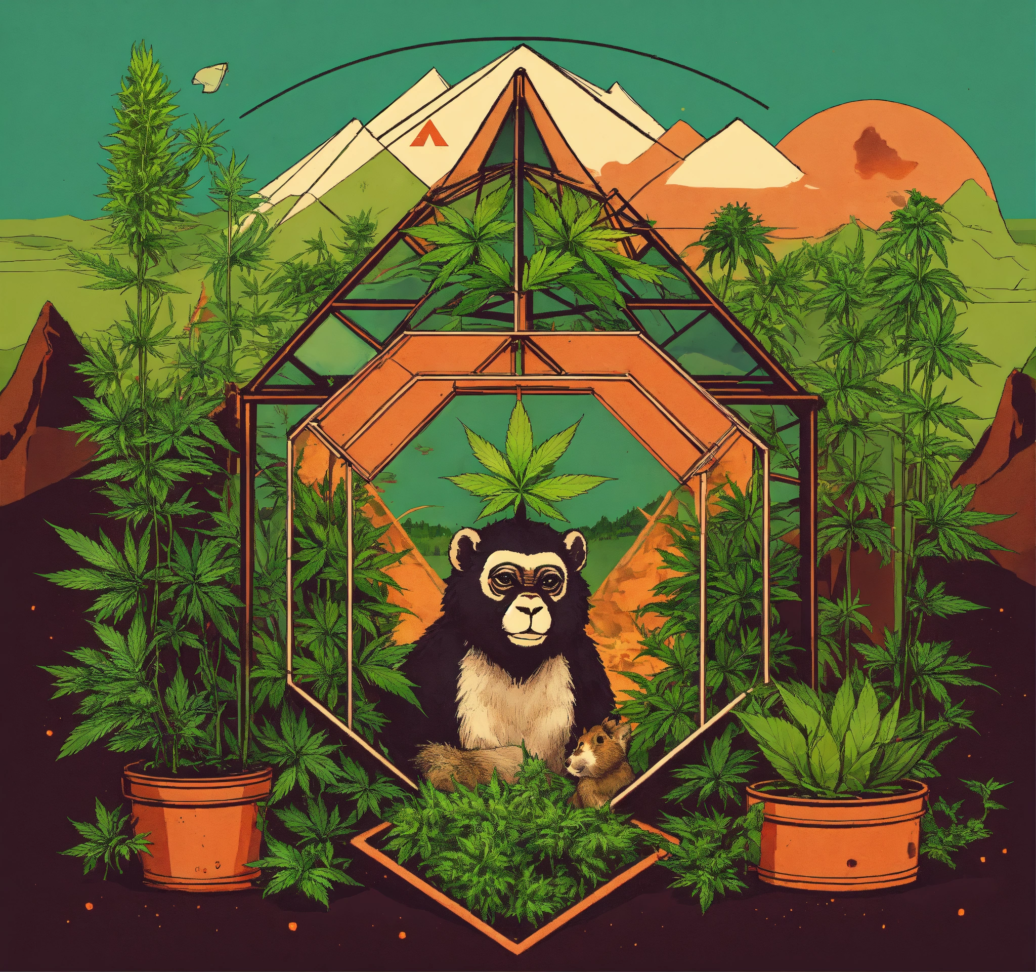 Corporate identity, geometry, plant, cannabis leaf, steam, buds flowers, monkey, rabbit greenhouse, indoor cannabis growing, mountains, hills, redneck
