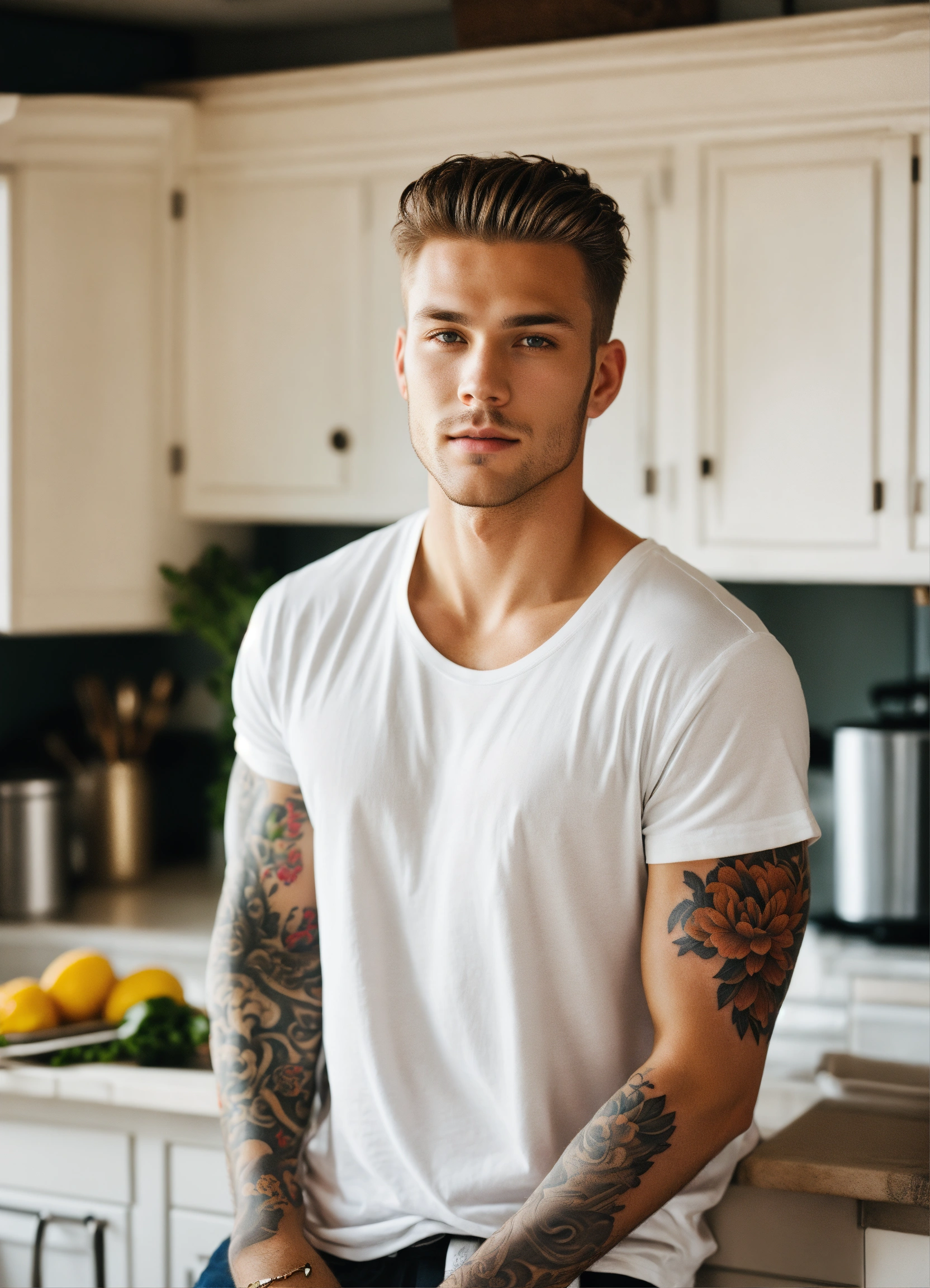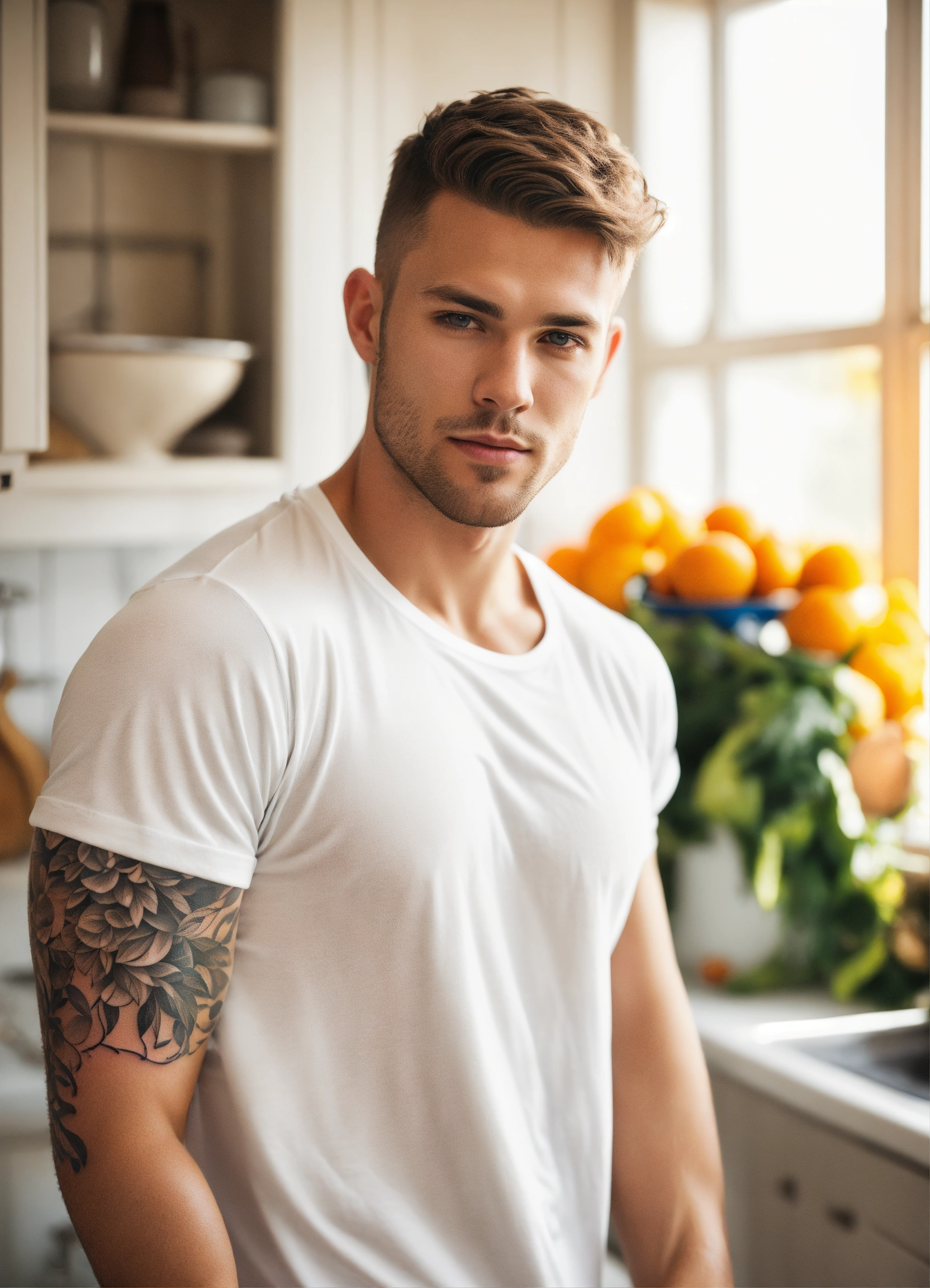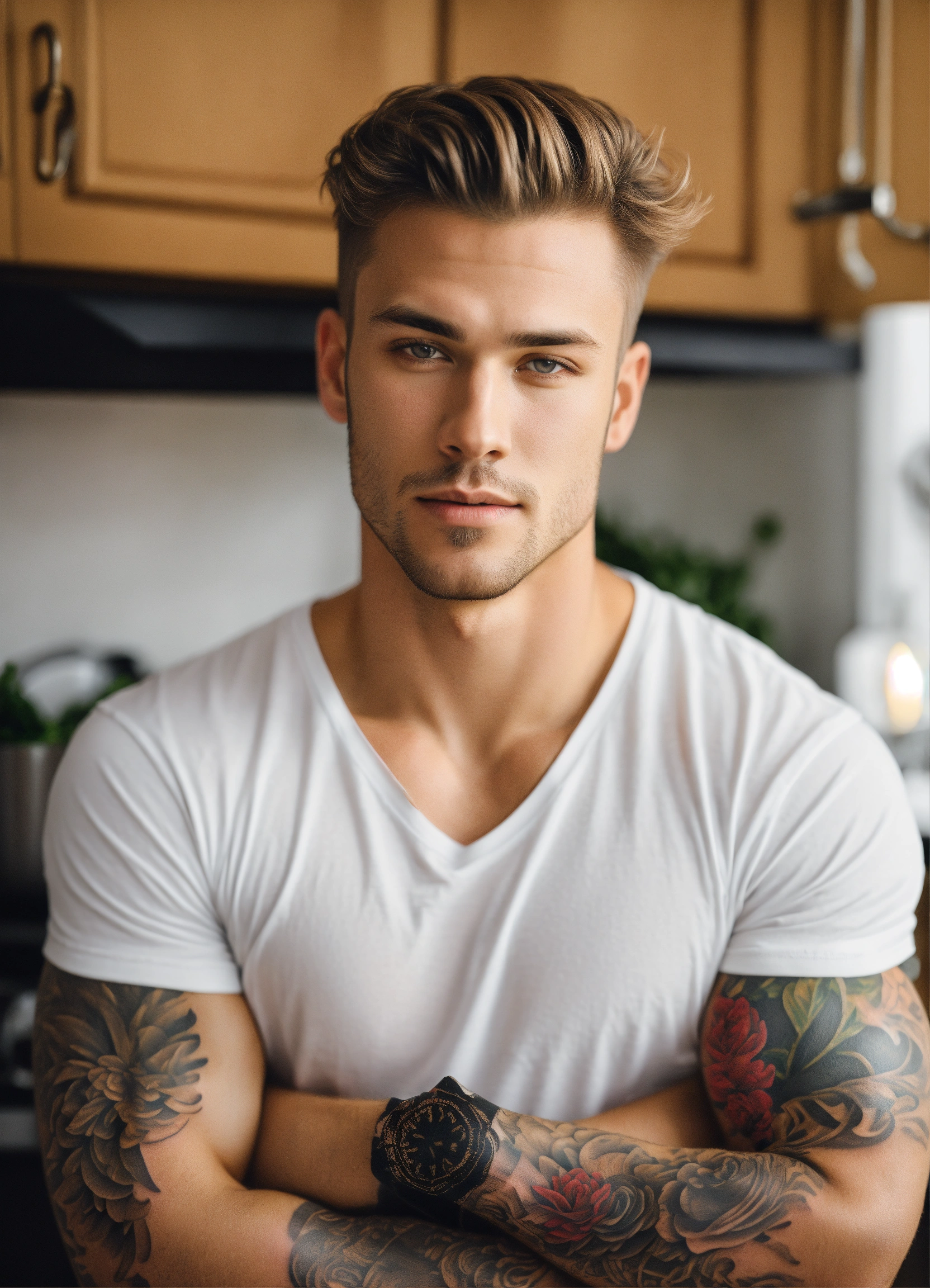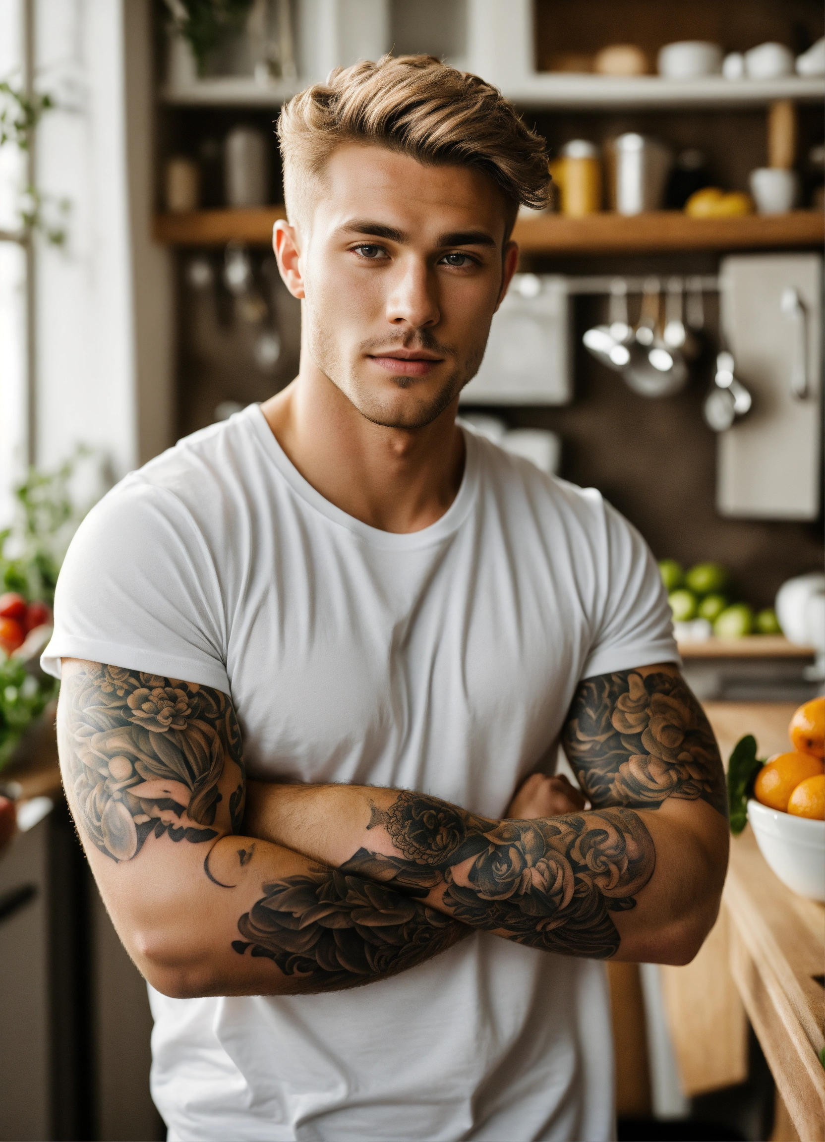 Handsome man with dark blond hair and grey eyes light skin in a white t-shirt, a bright full-arm tattoo in the kitchen