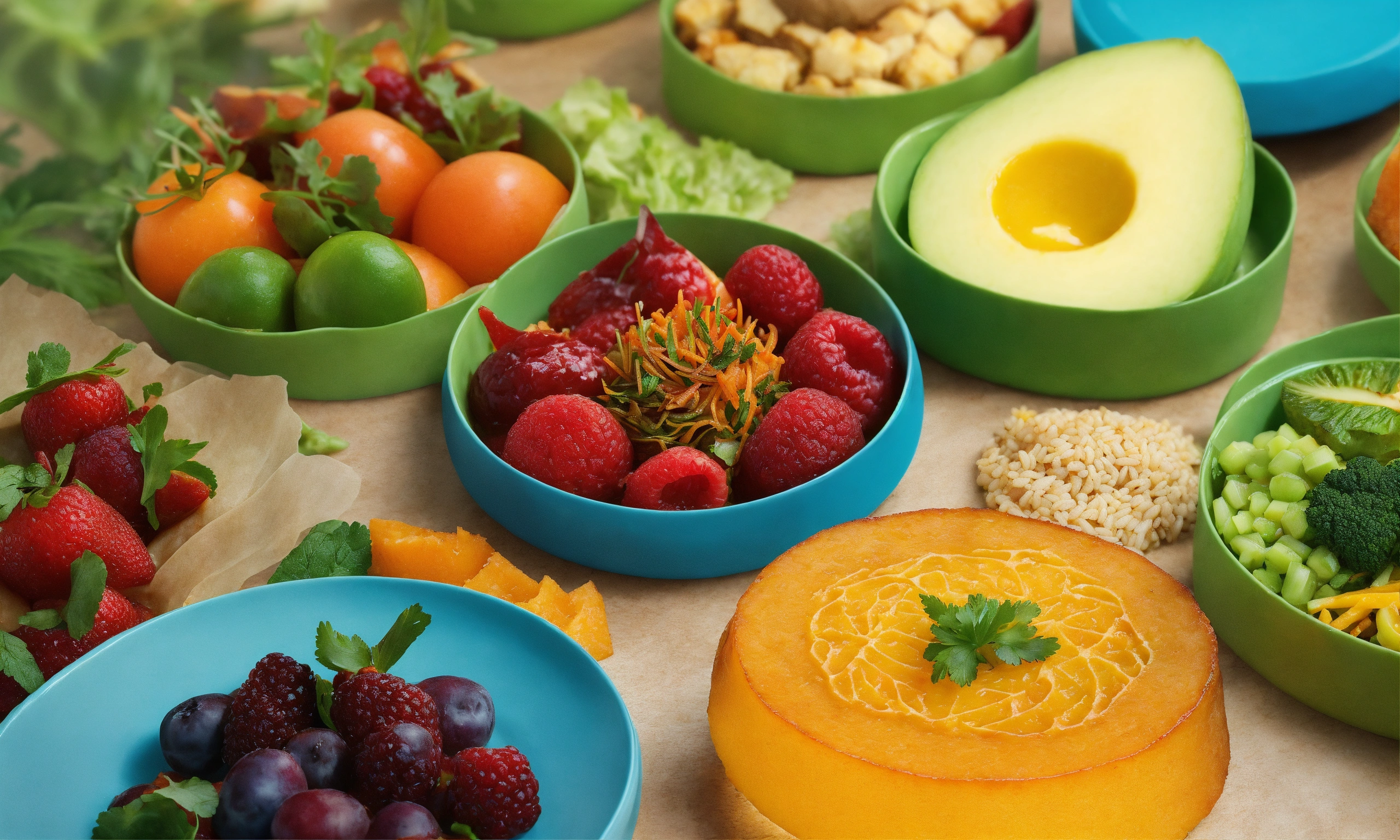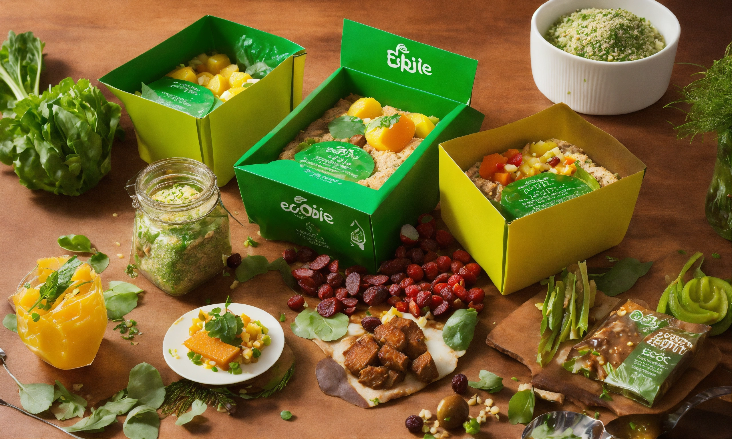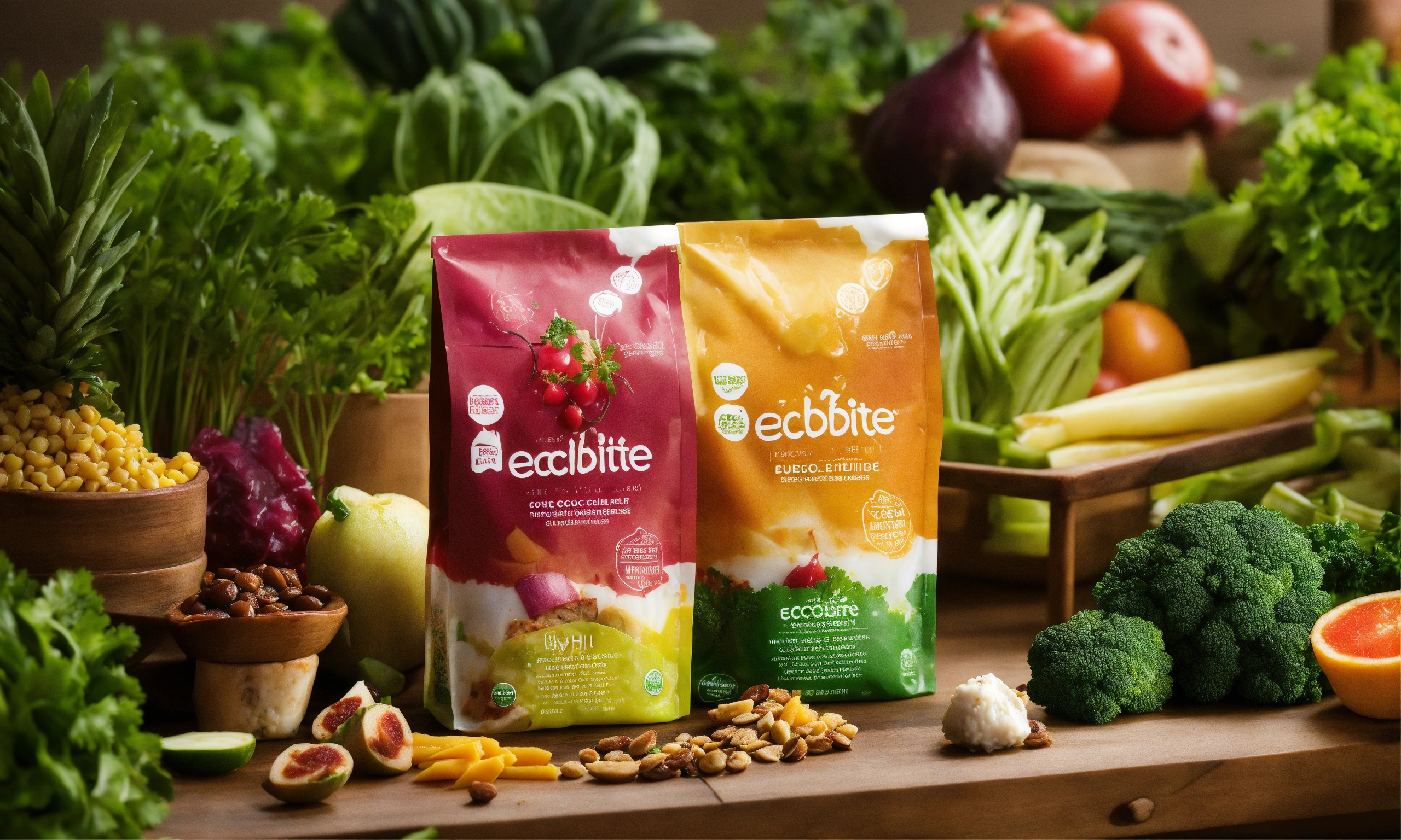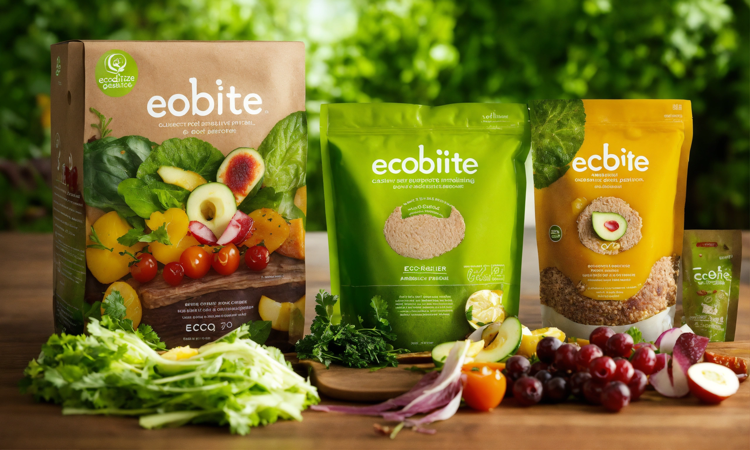 Produce a high-resolution image that highlights ecobite, our innovative edible packaging. the image should focus on detailed presentation of ecobite packaging, showcasing its intricate designs and eco-friendly symbols. an assortment of diverse food items adjacent to ecobite, underlining its versatility across various culinary contexts. a backdrop featuring lush, eco-friendly elements, evoking a sustainable ambiance. utilize vibrant colors and a realistic style to convey an inviting atmosphere. the image should effectively communicate the appealing culinary experience offered by ecobite, while emphasizing its sustainability.