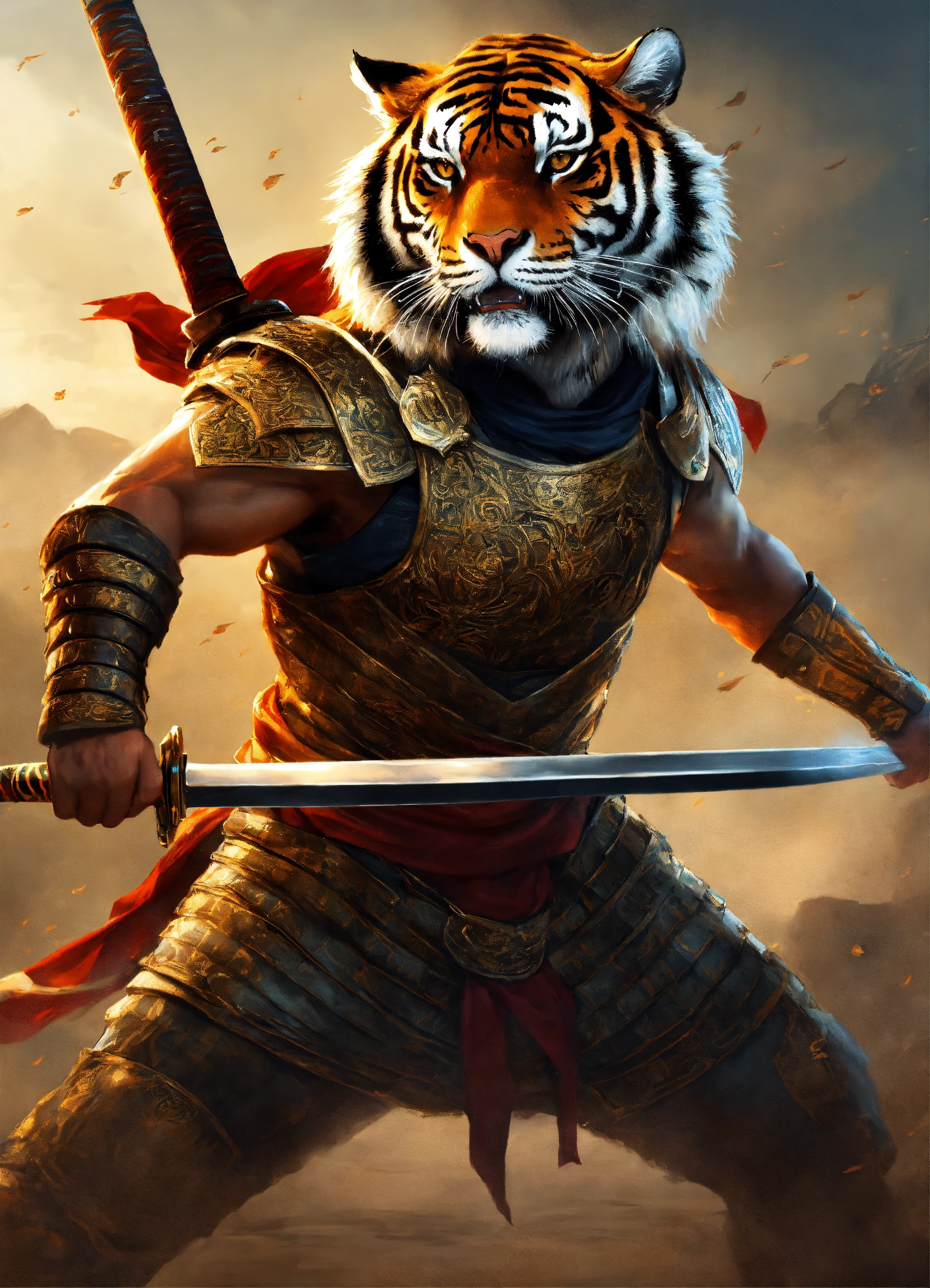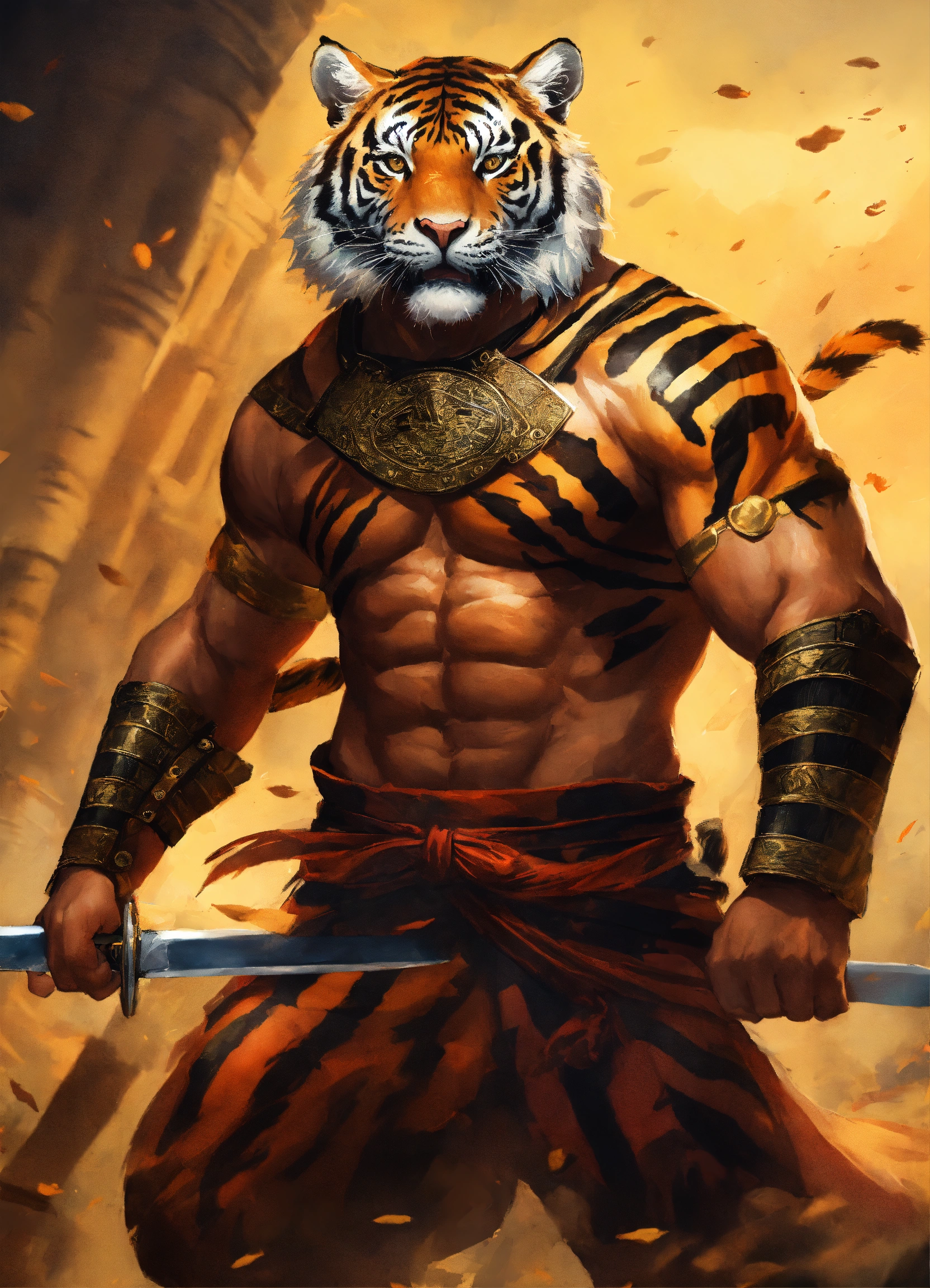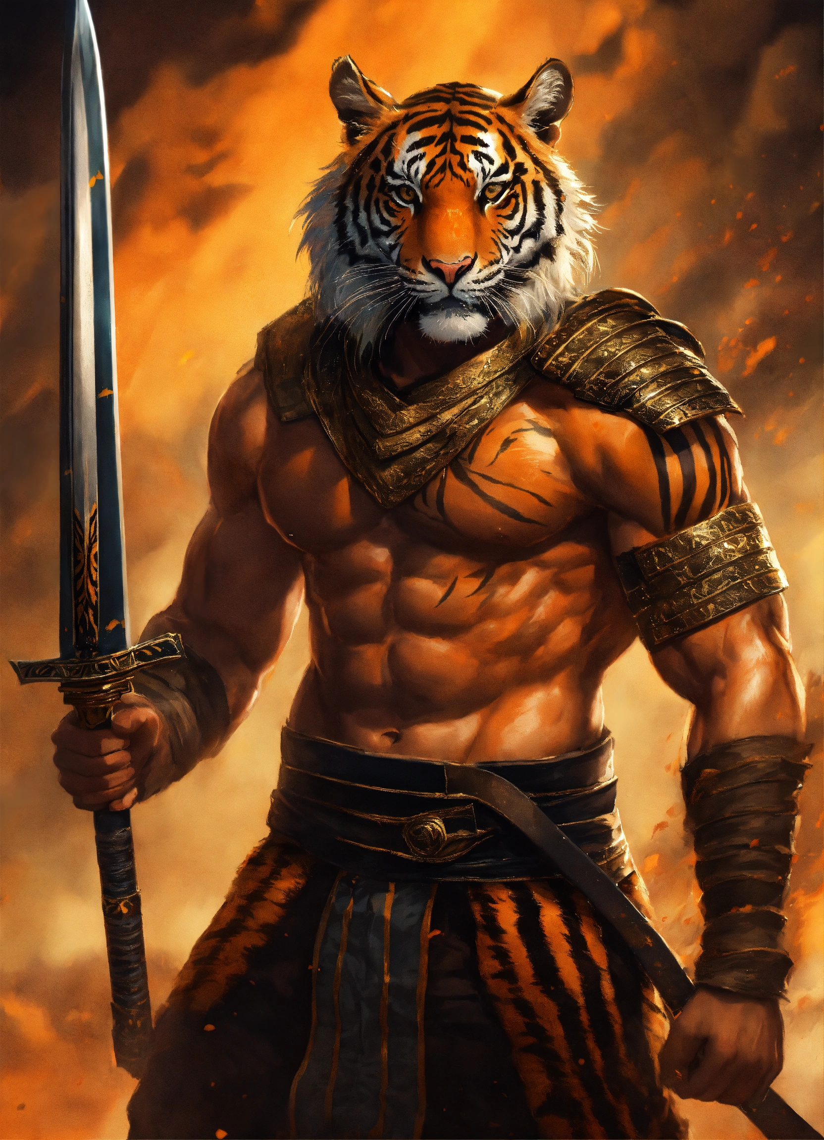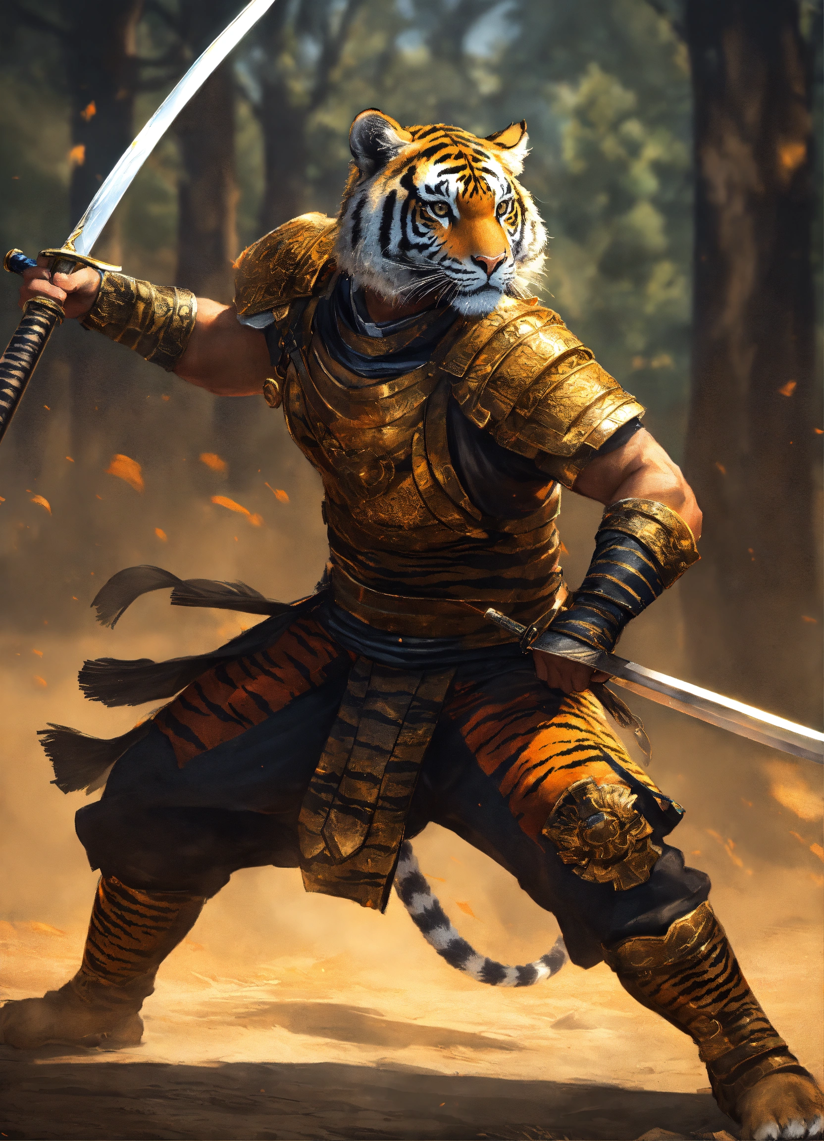 A highly realistic warrior with the characteristics of a tiger, broad black stripes on his face and arms, engaged in a sword fight
