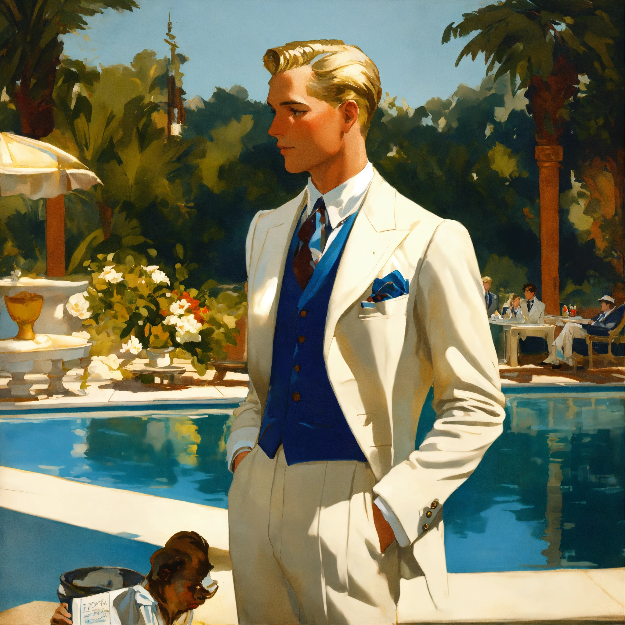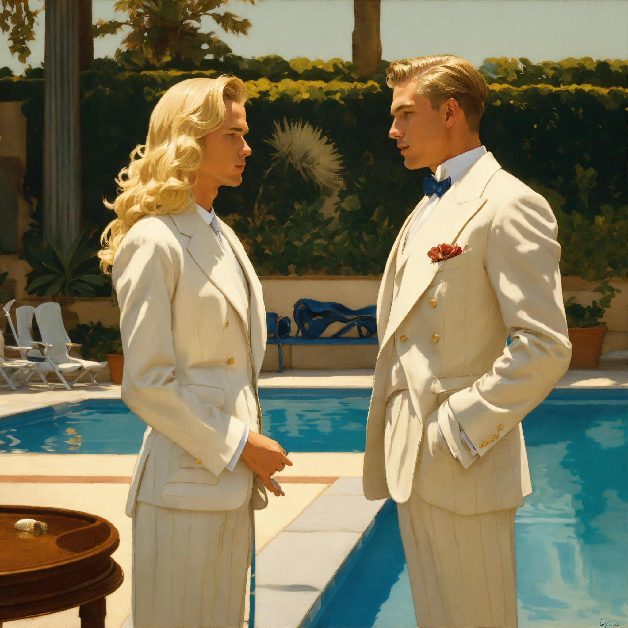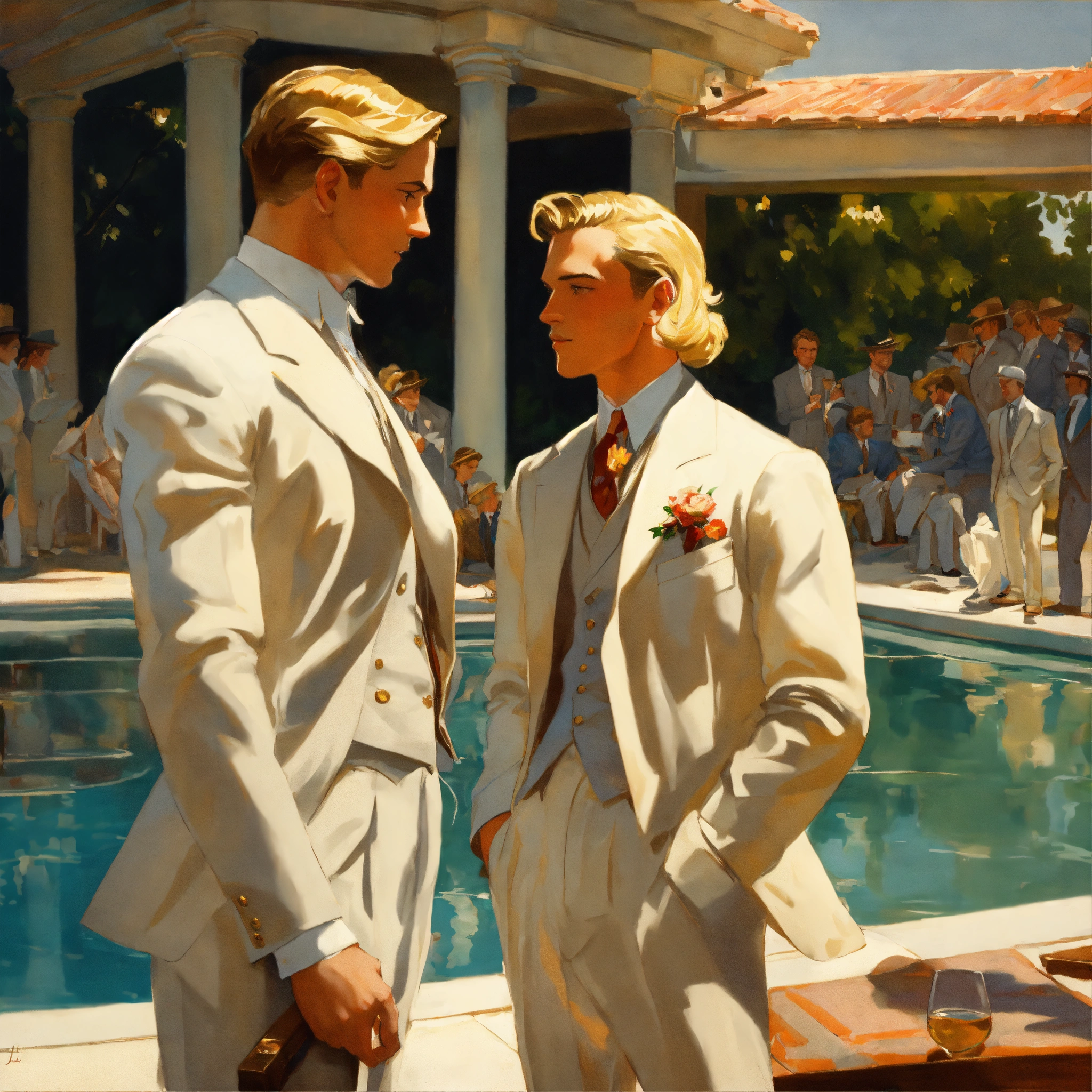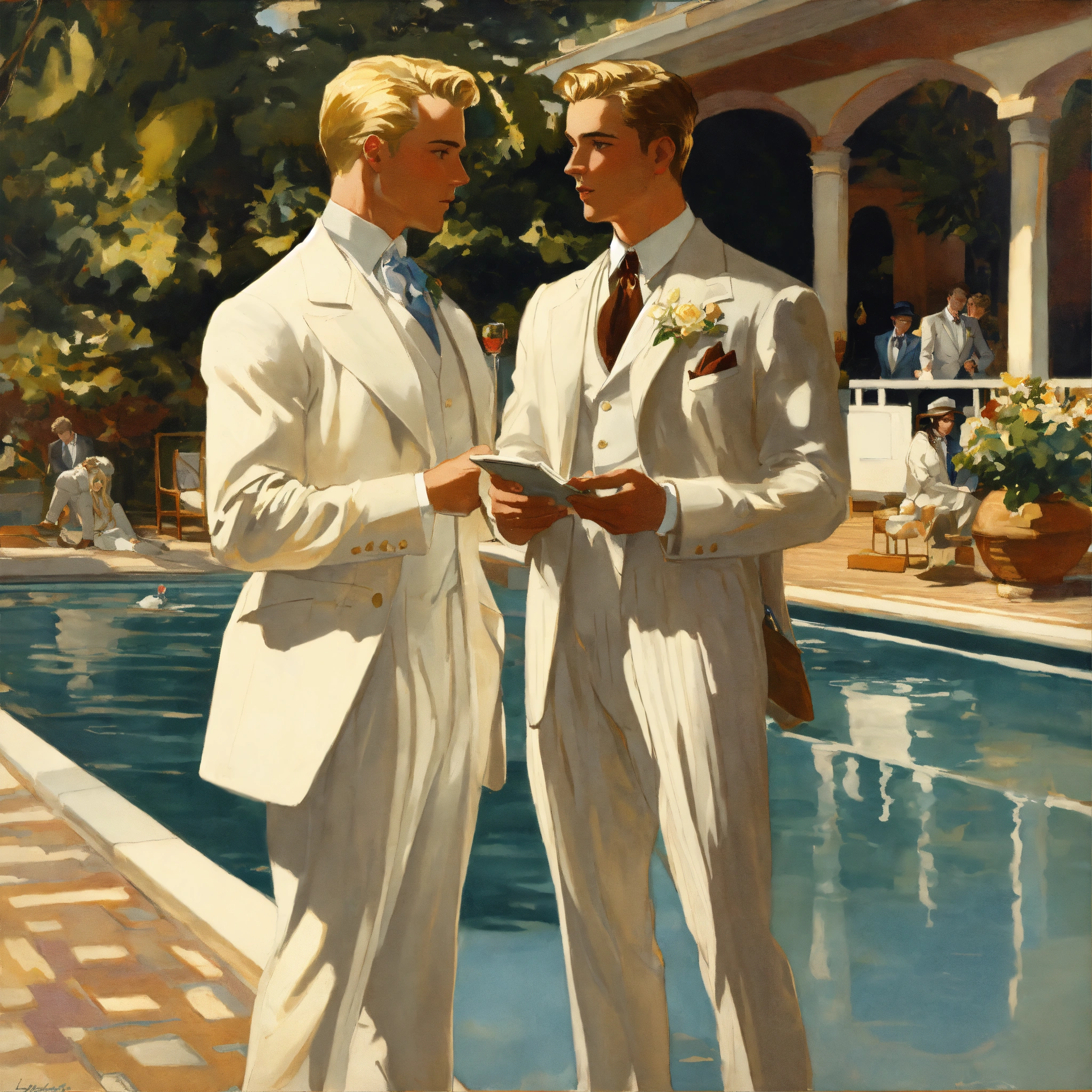 A blonde sportsman in white suit, long hair, speaking with a gentleman in light grey vested suit by a pool, leyendecker style