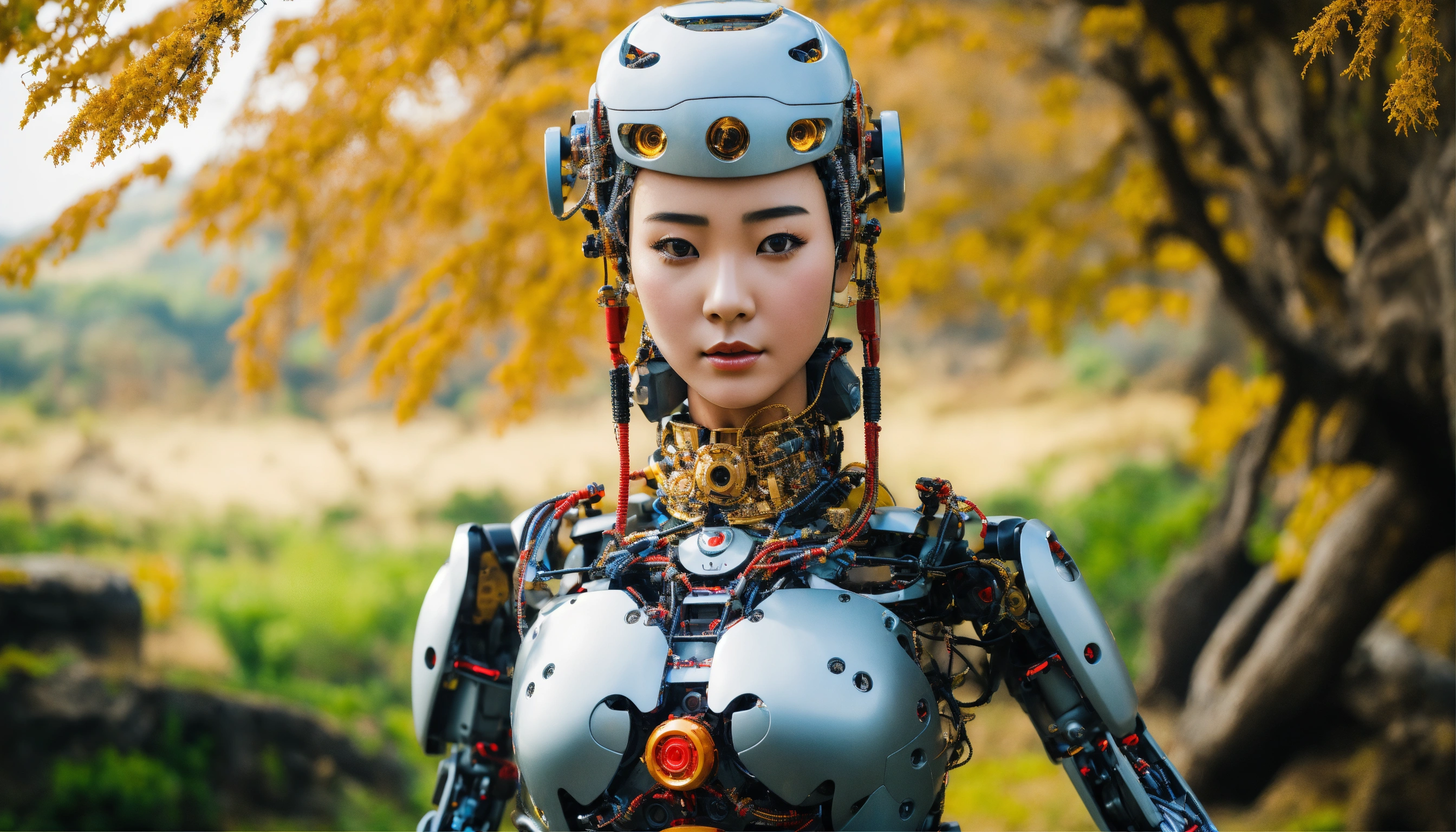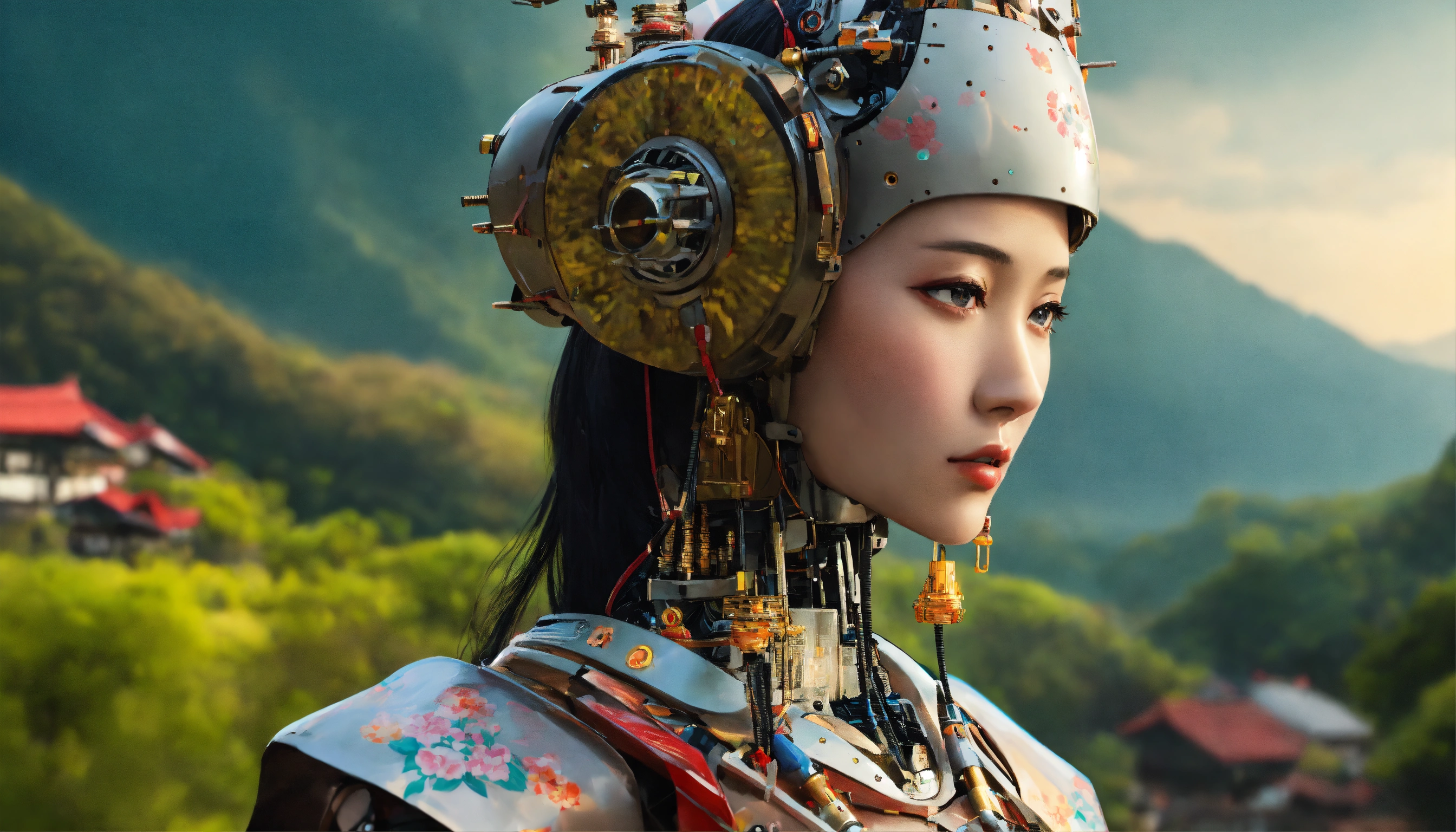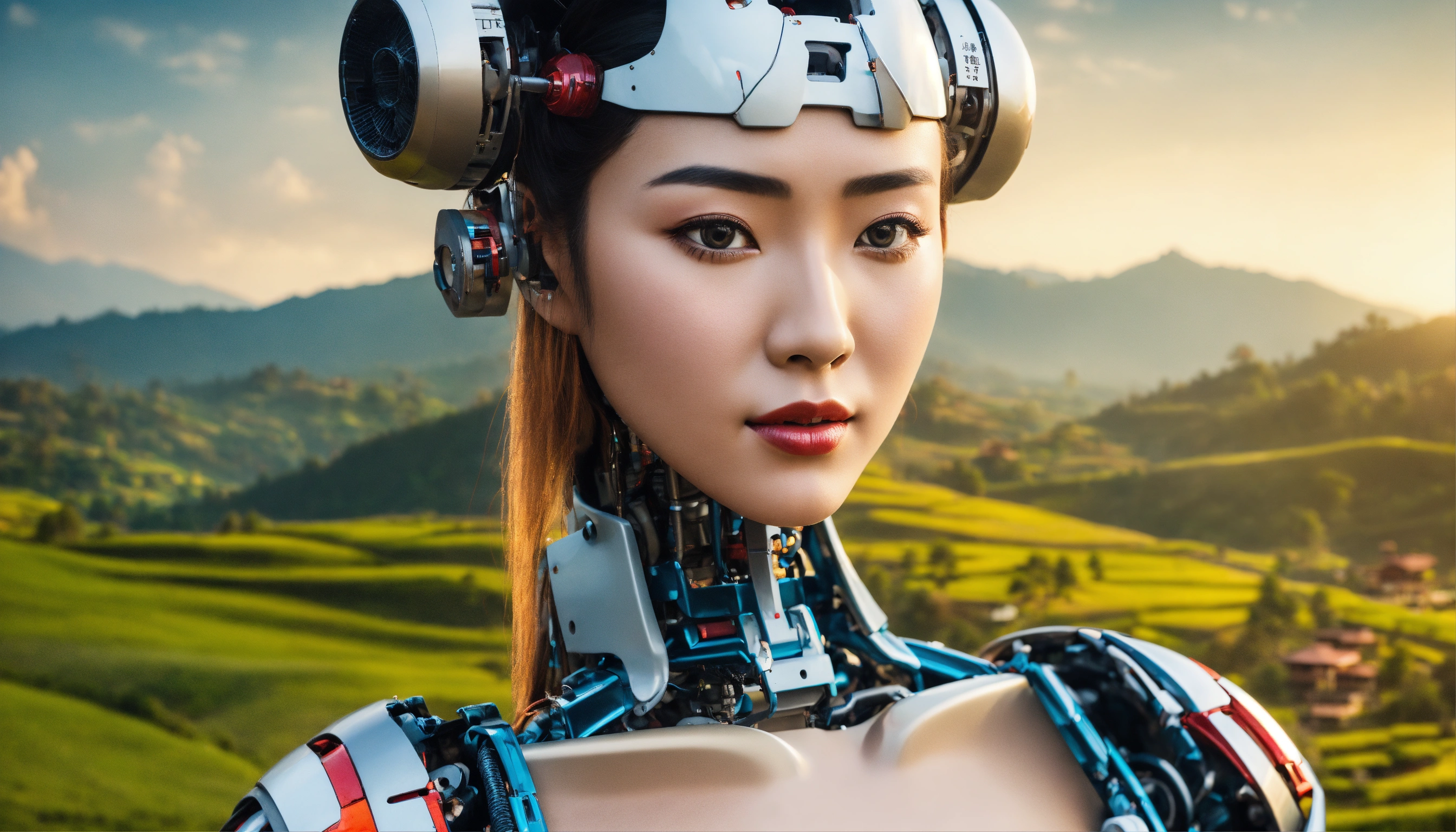 Beautiful woman in japanese style, humanoid robot, the back part of the head is robotic with a horizontal big hole, the face is human, 38d cup, in nepal landscape