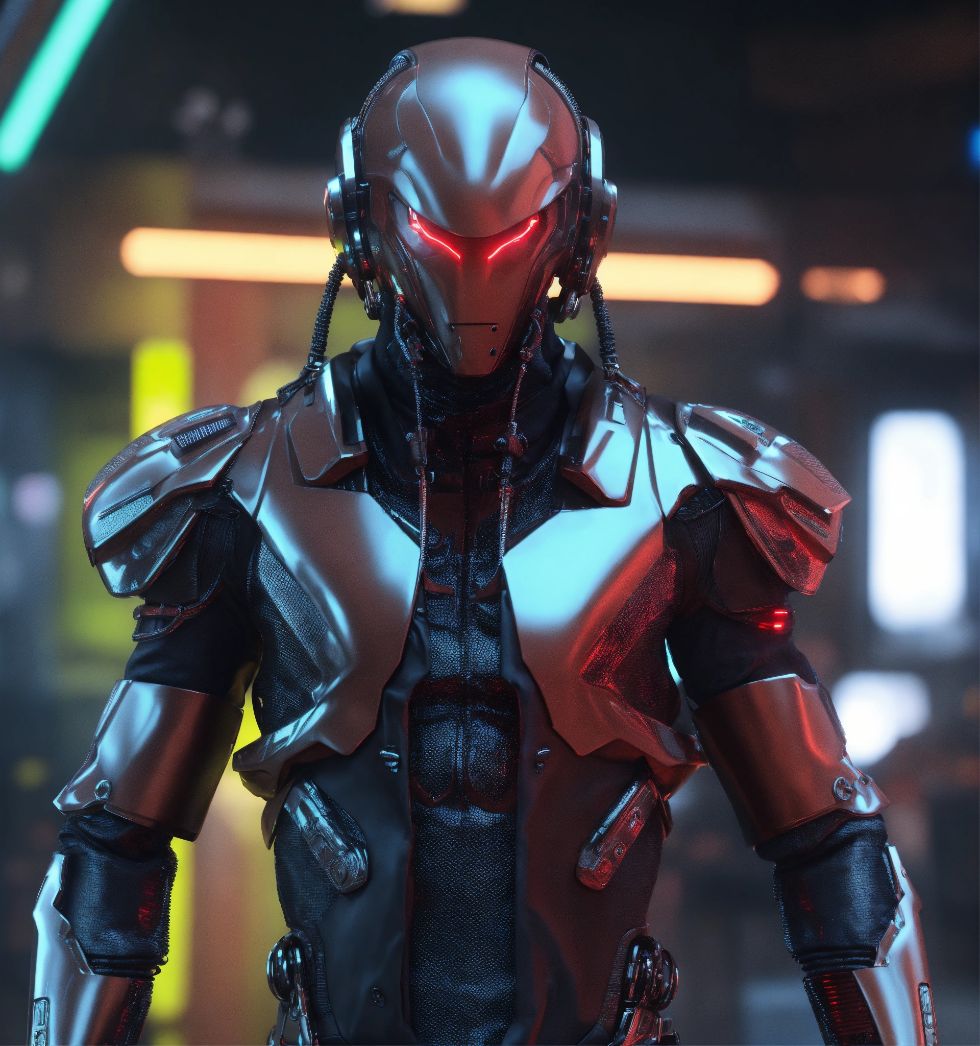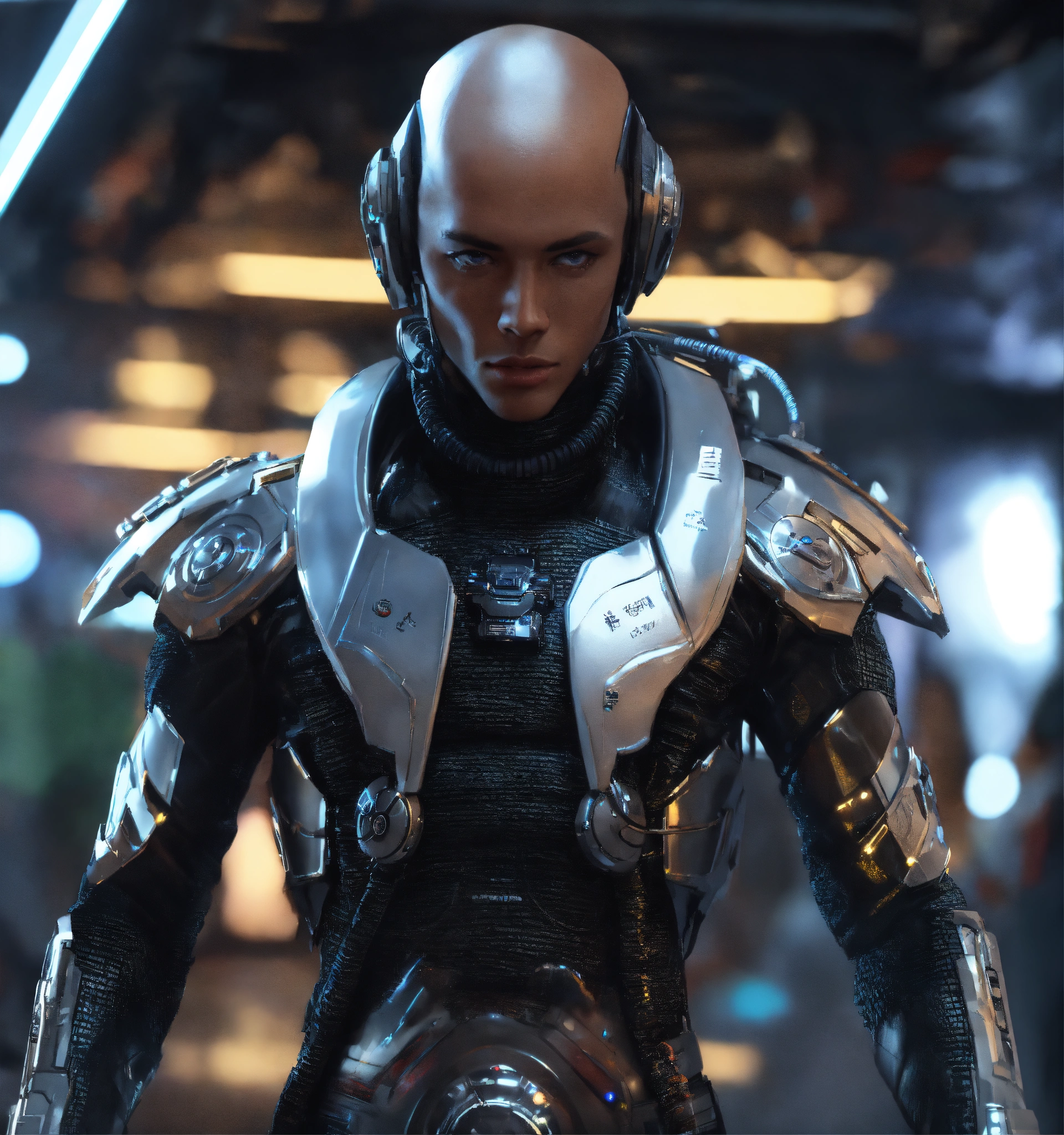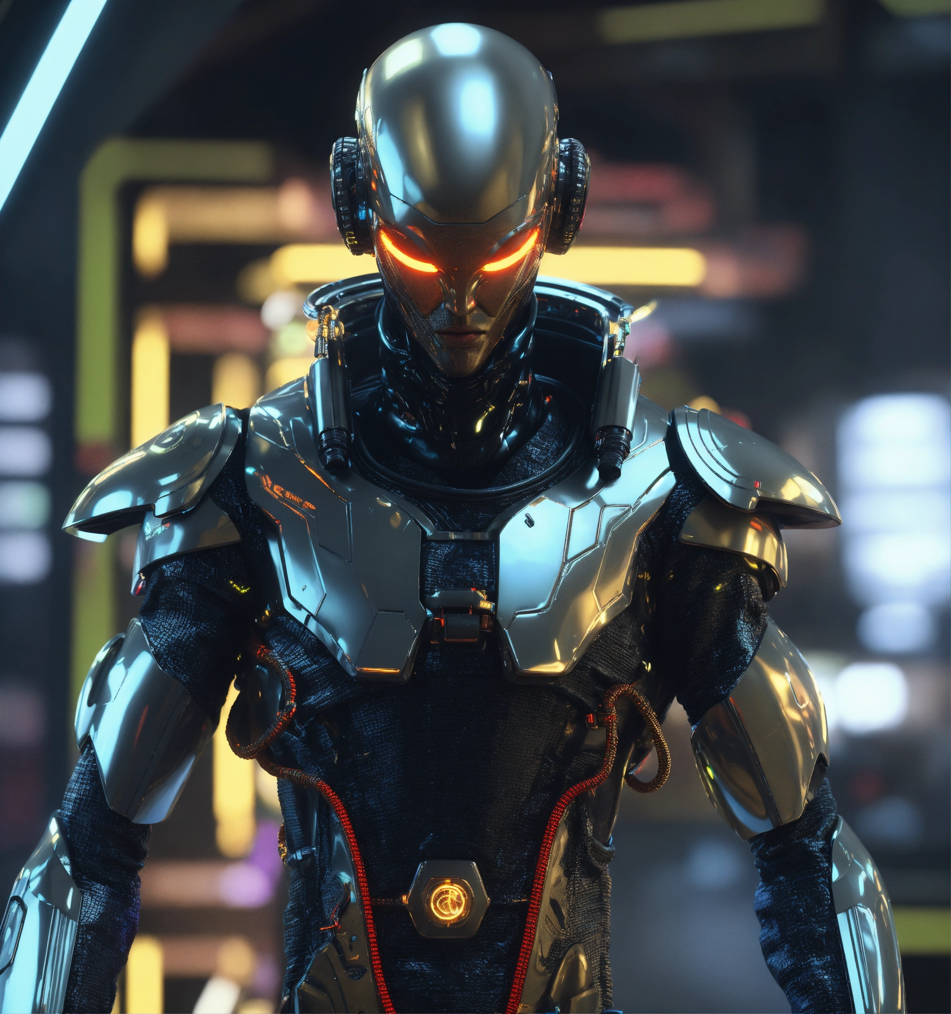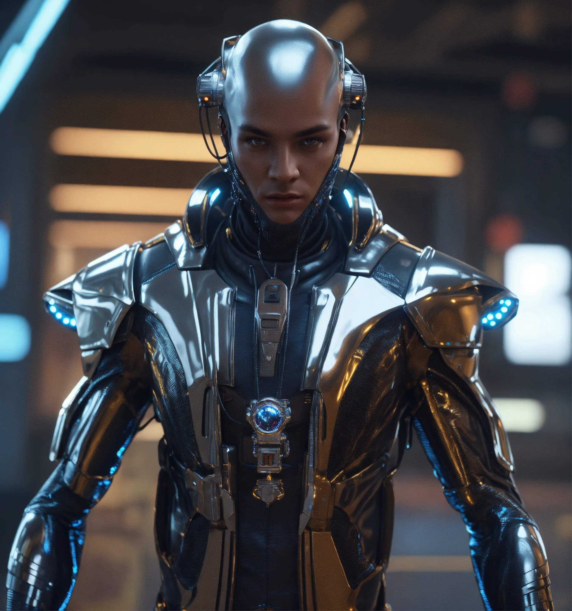 Zoom out from an tough male alien android cool gangster character pimpin futuristic dress clothes and jewelry, realistic, futuristic, sci-fi, 8k, unreal engine