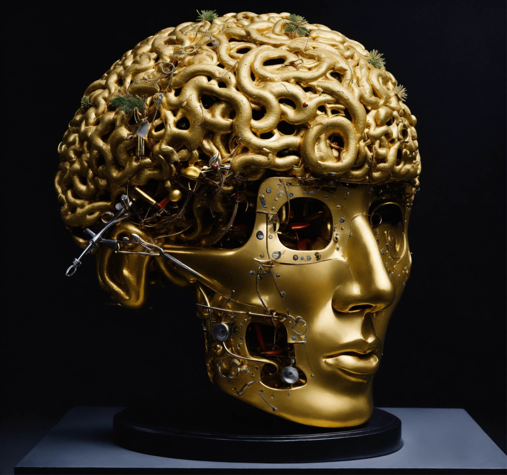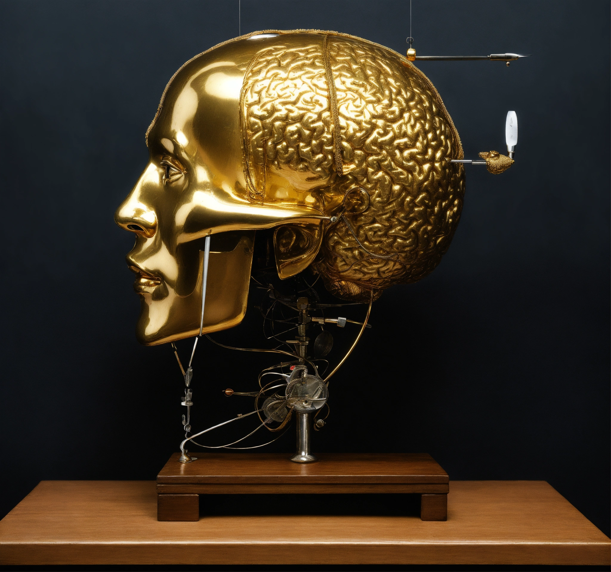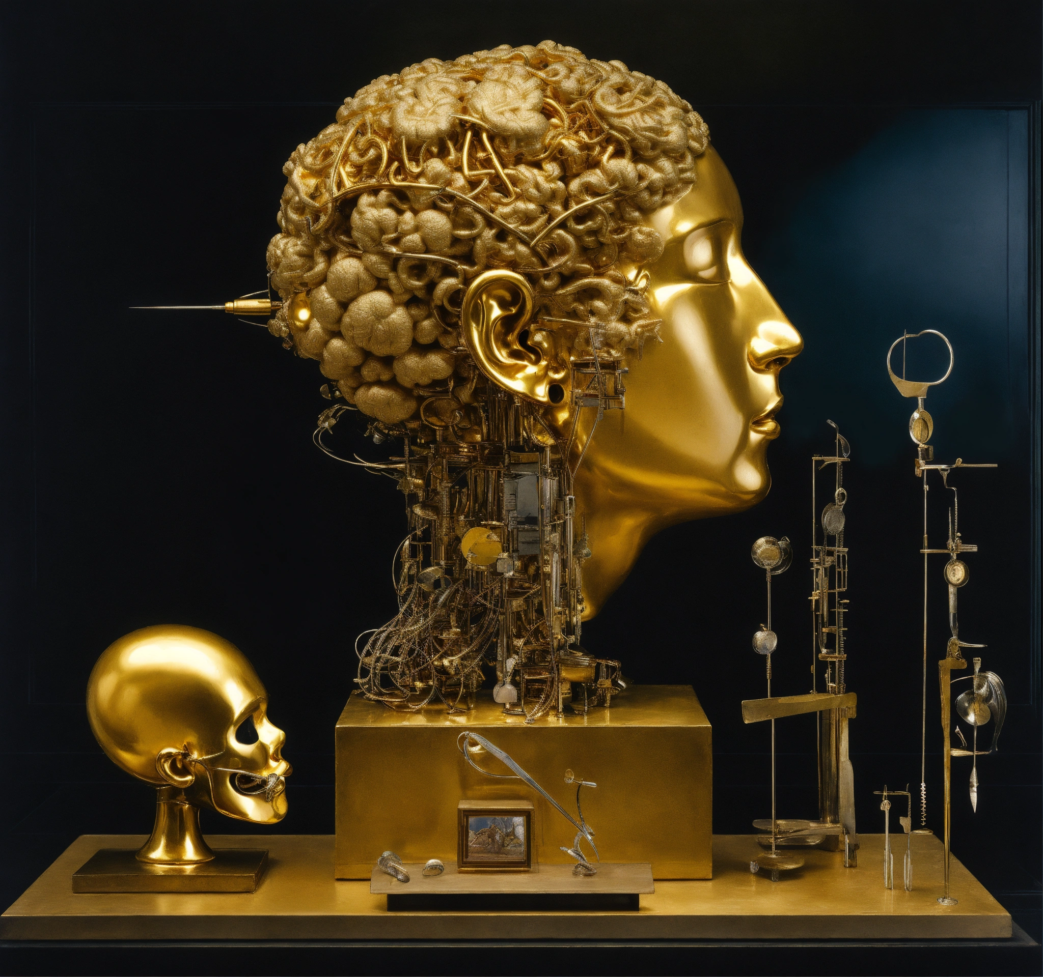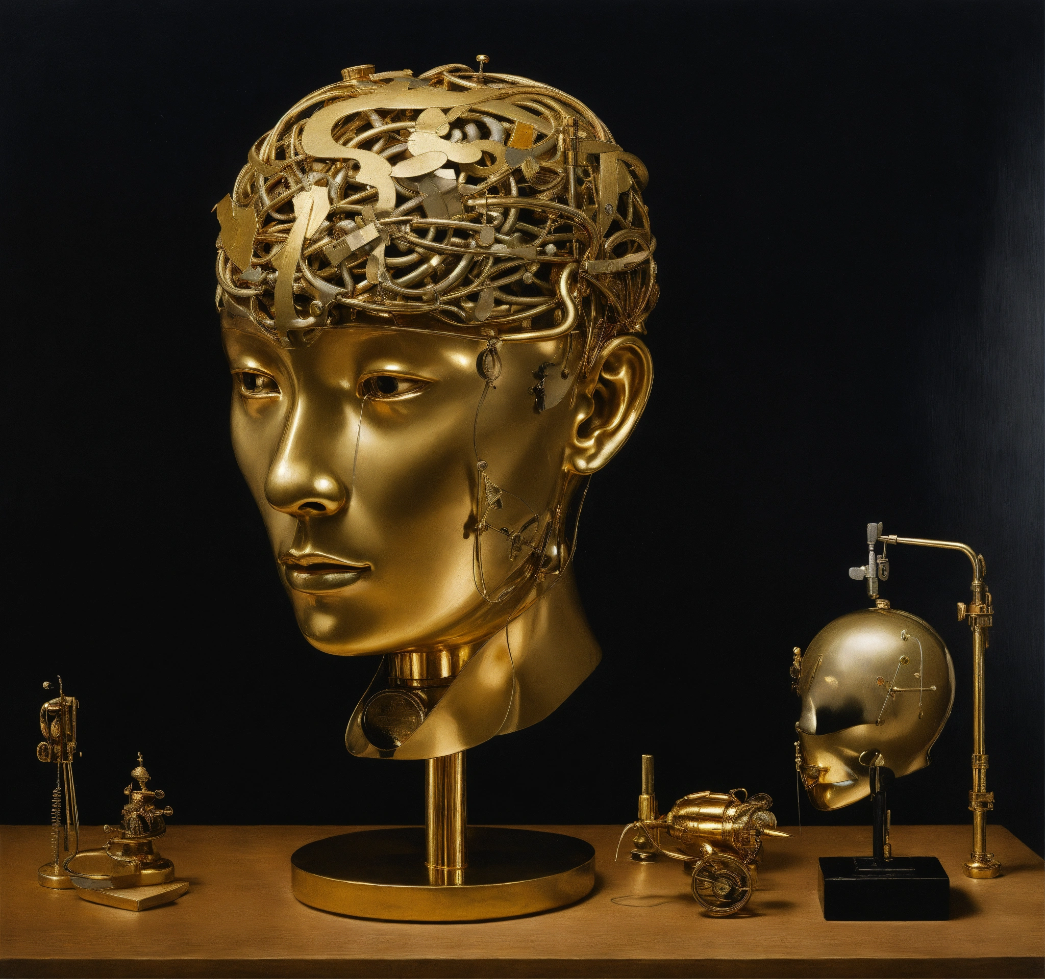A huge golden brain with complex surgical instruments, very small beautiful asian femalehuman body, a chinese newborn boy, surrealism, symbolism, minimalism, black background, sculpture by lucian freud, rene magritte, salvador dali