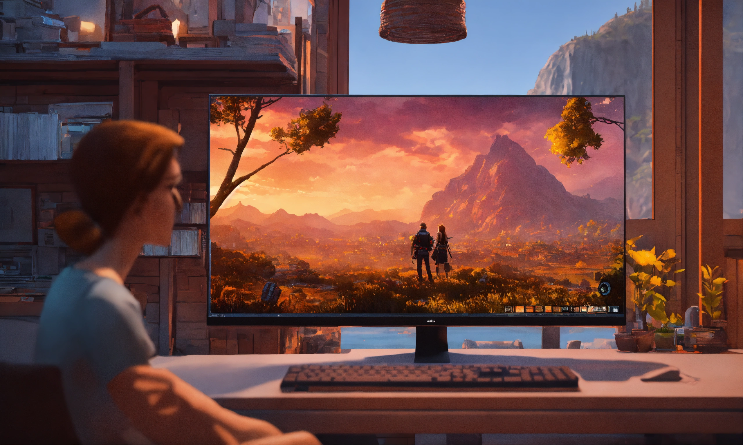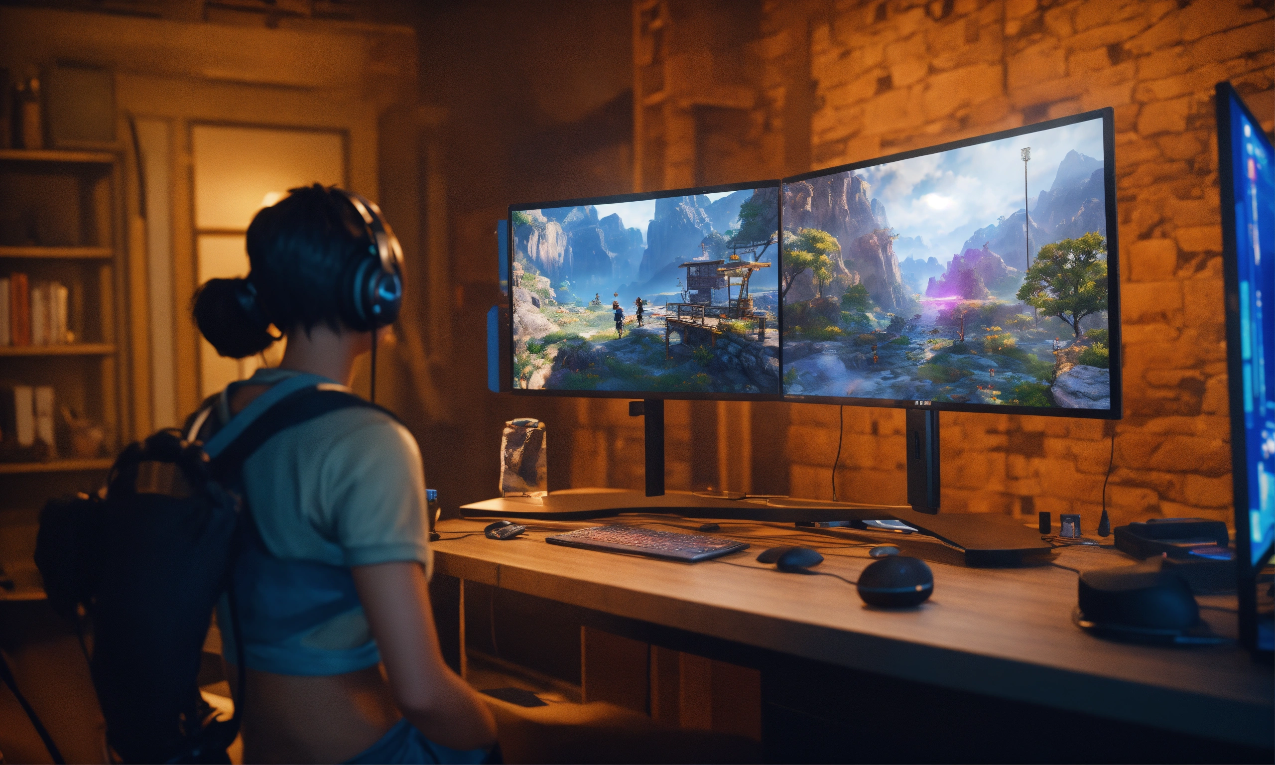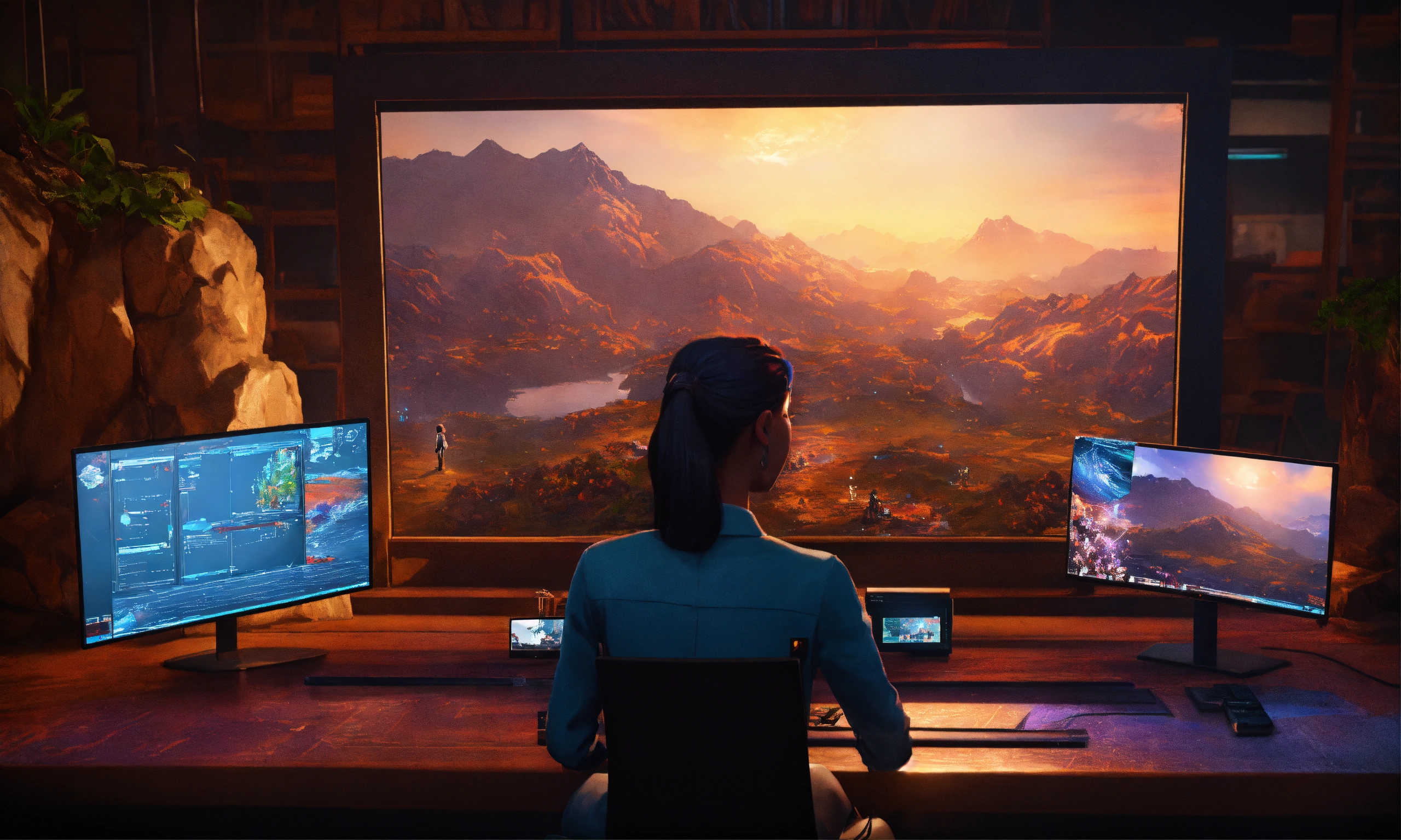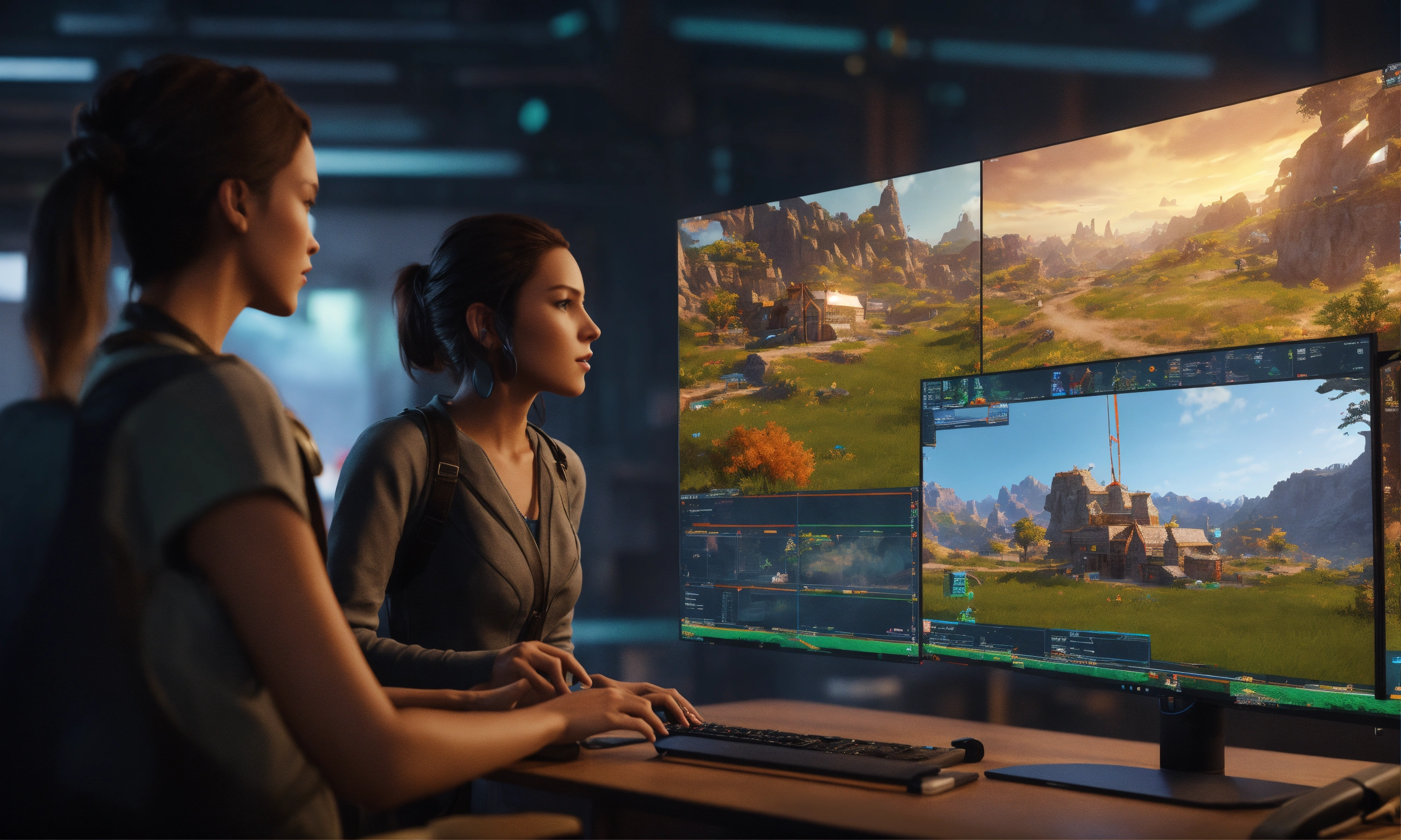 A woman and man look at a computer screen. a 2d game is displayed on the computer screen. in the style of unreal engine, topographic photography, craftcore, unreal engine 5, colorist, exacting precision, busy landscapes