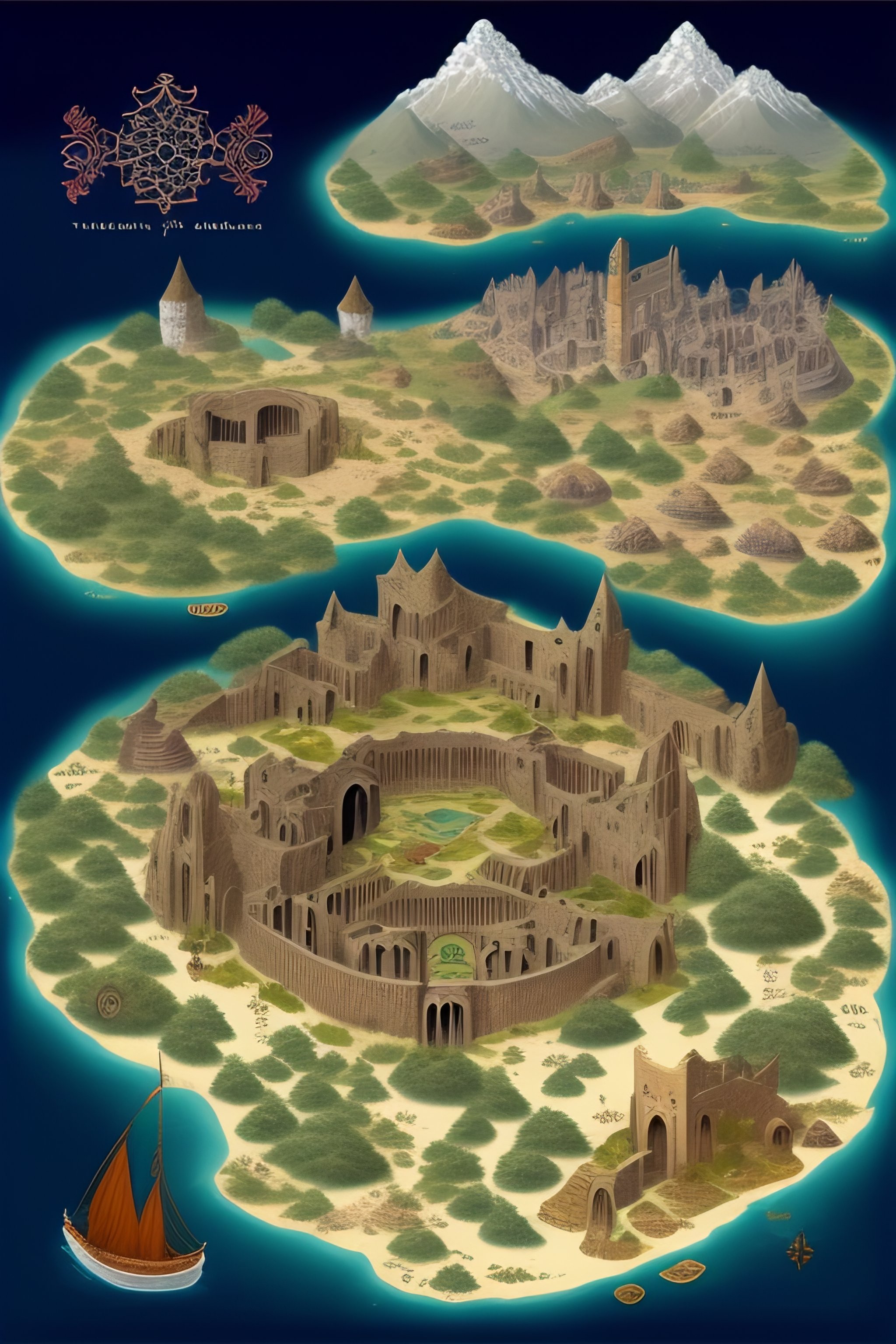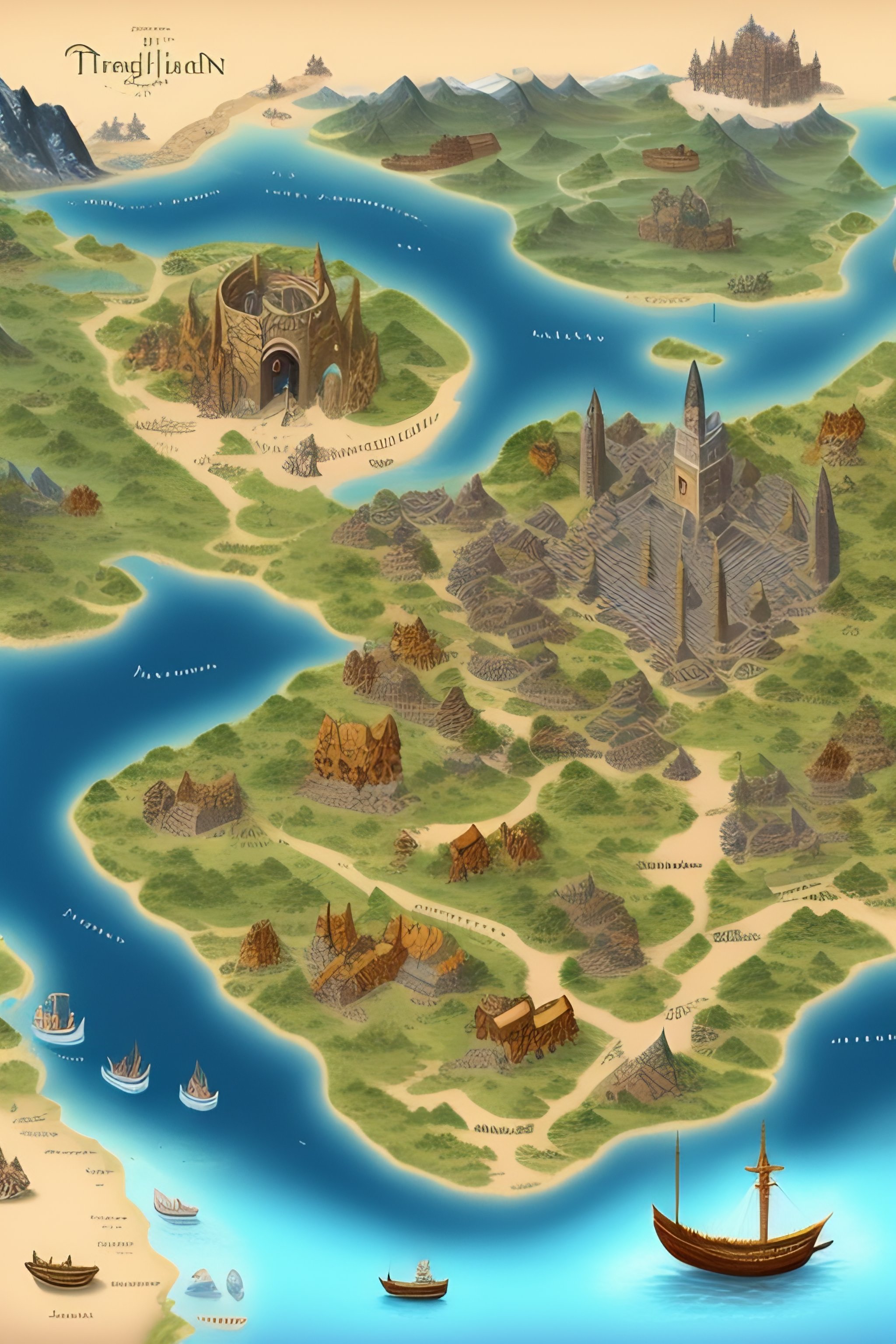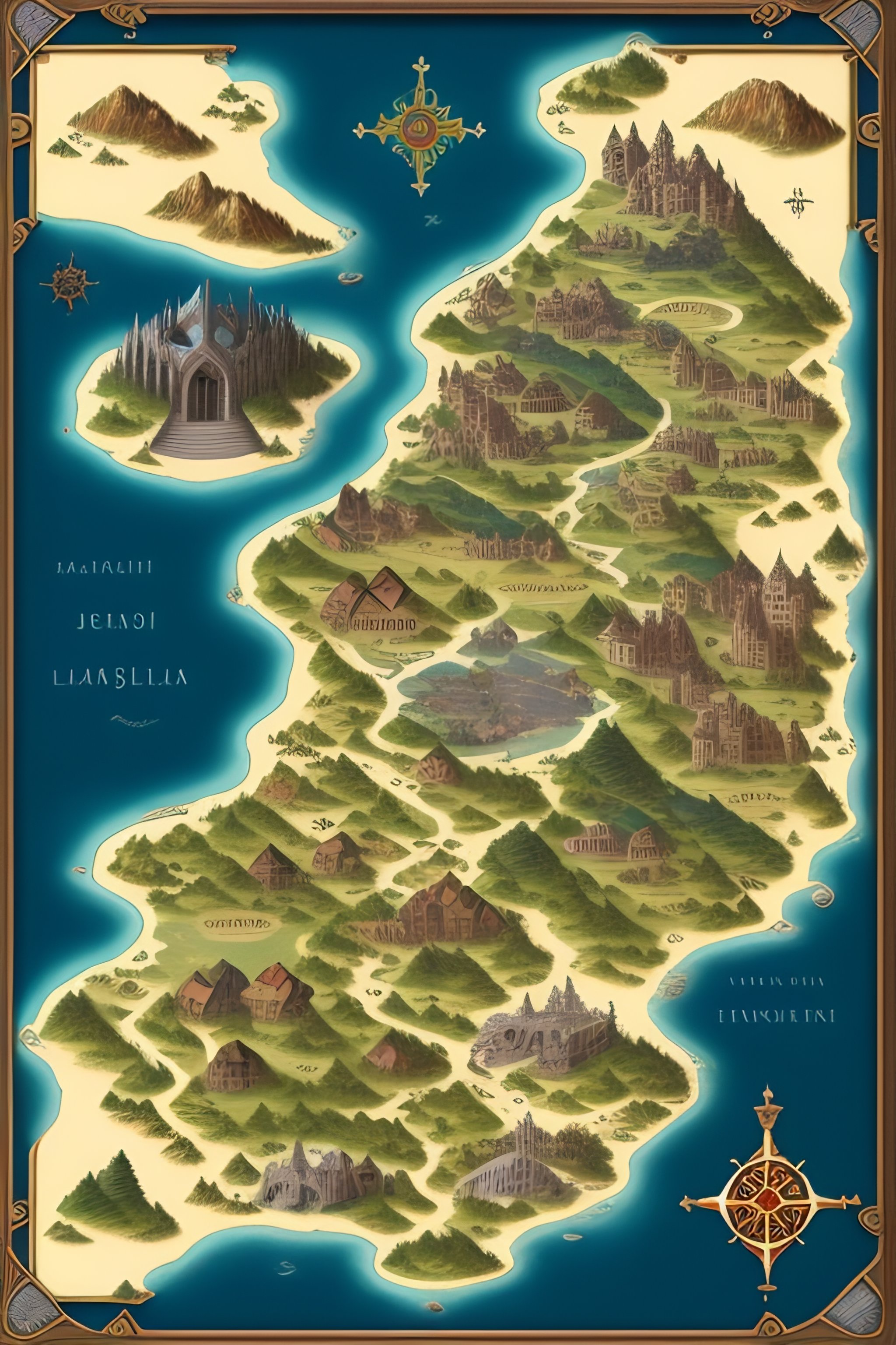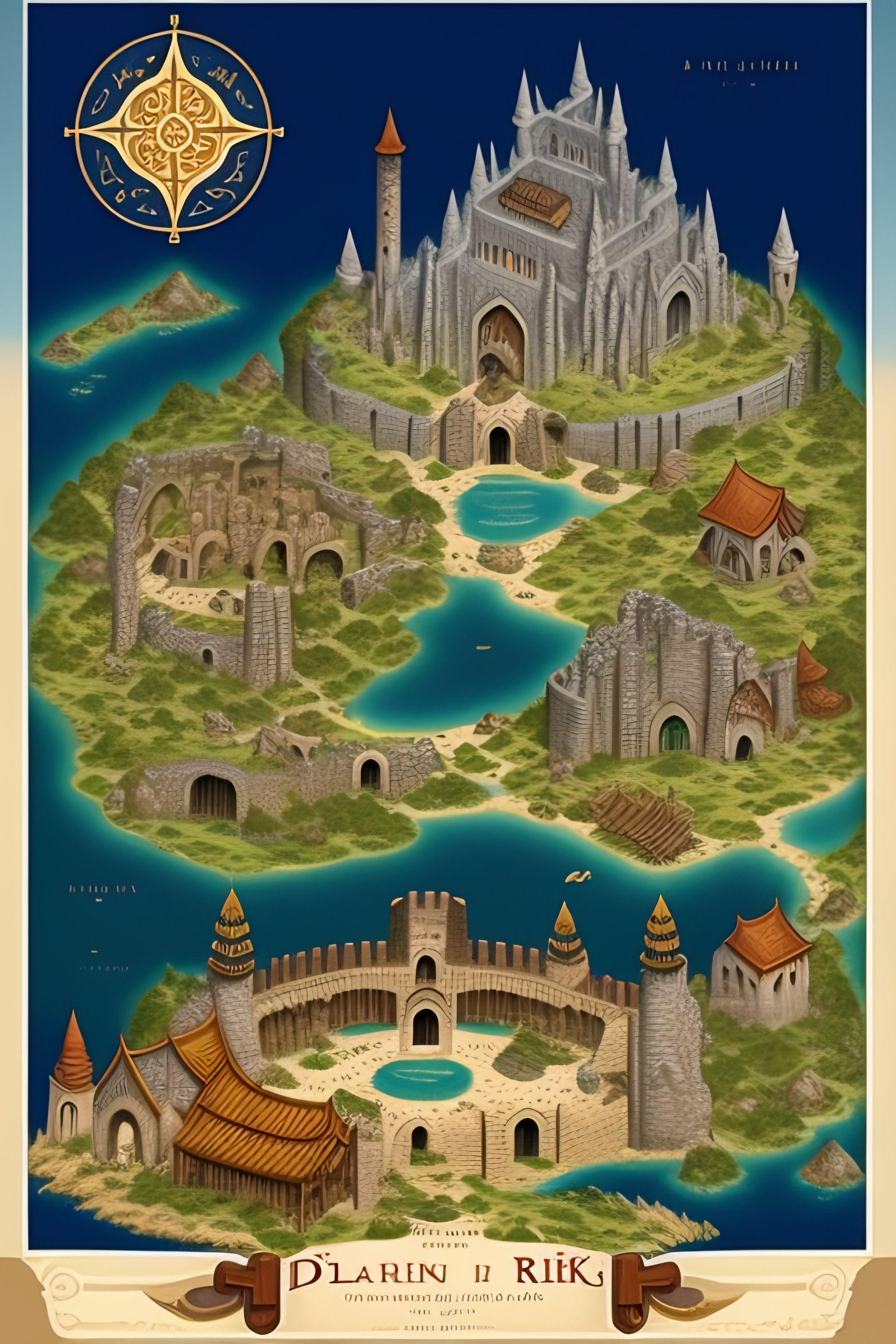 An illustrated map of a medieval country, fantasy, temple, dungeons and dragons, ancient, ruins, lakes