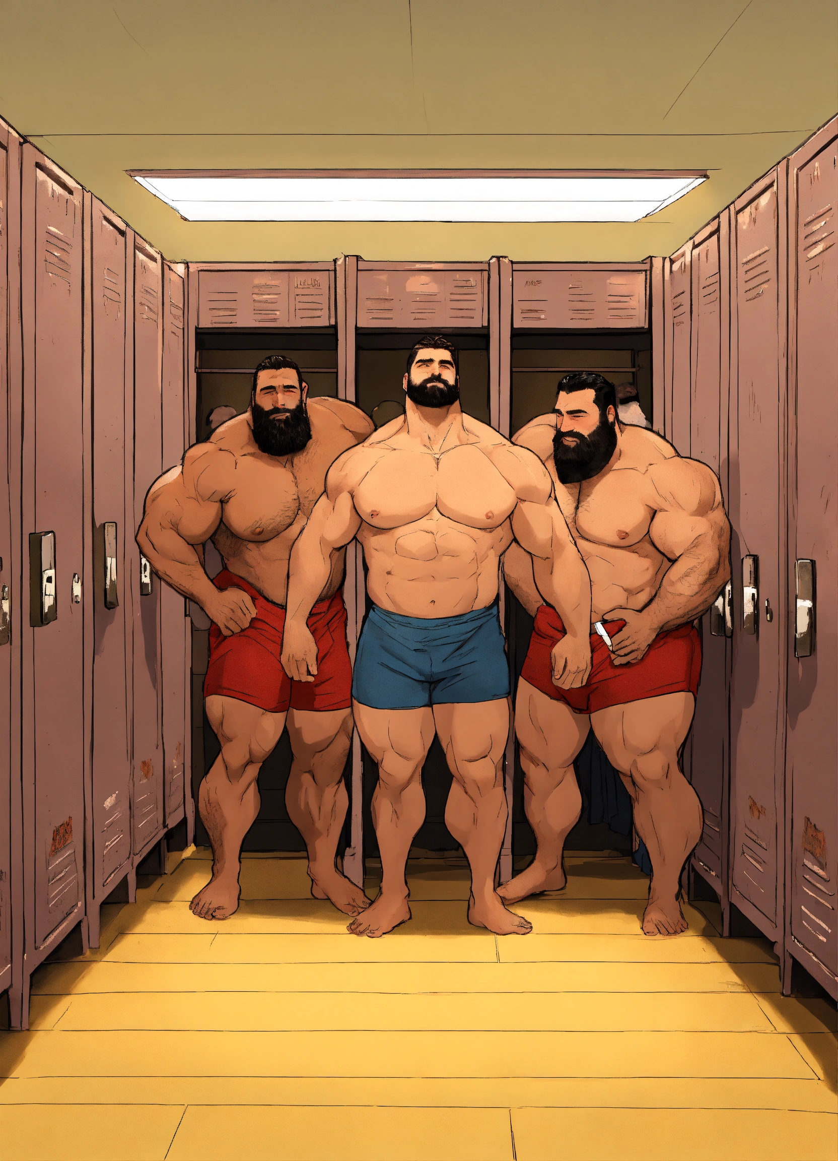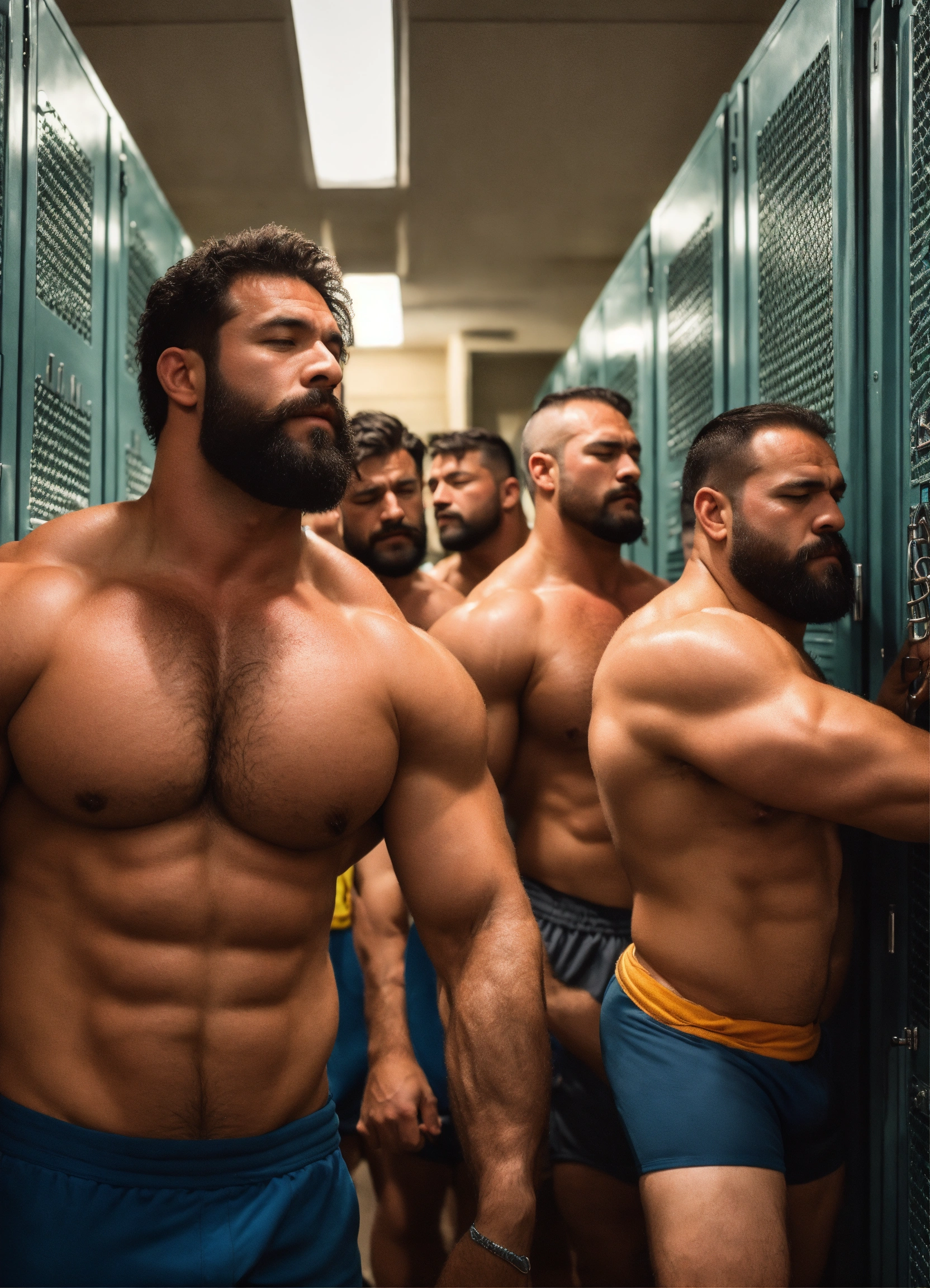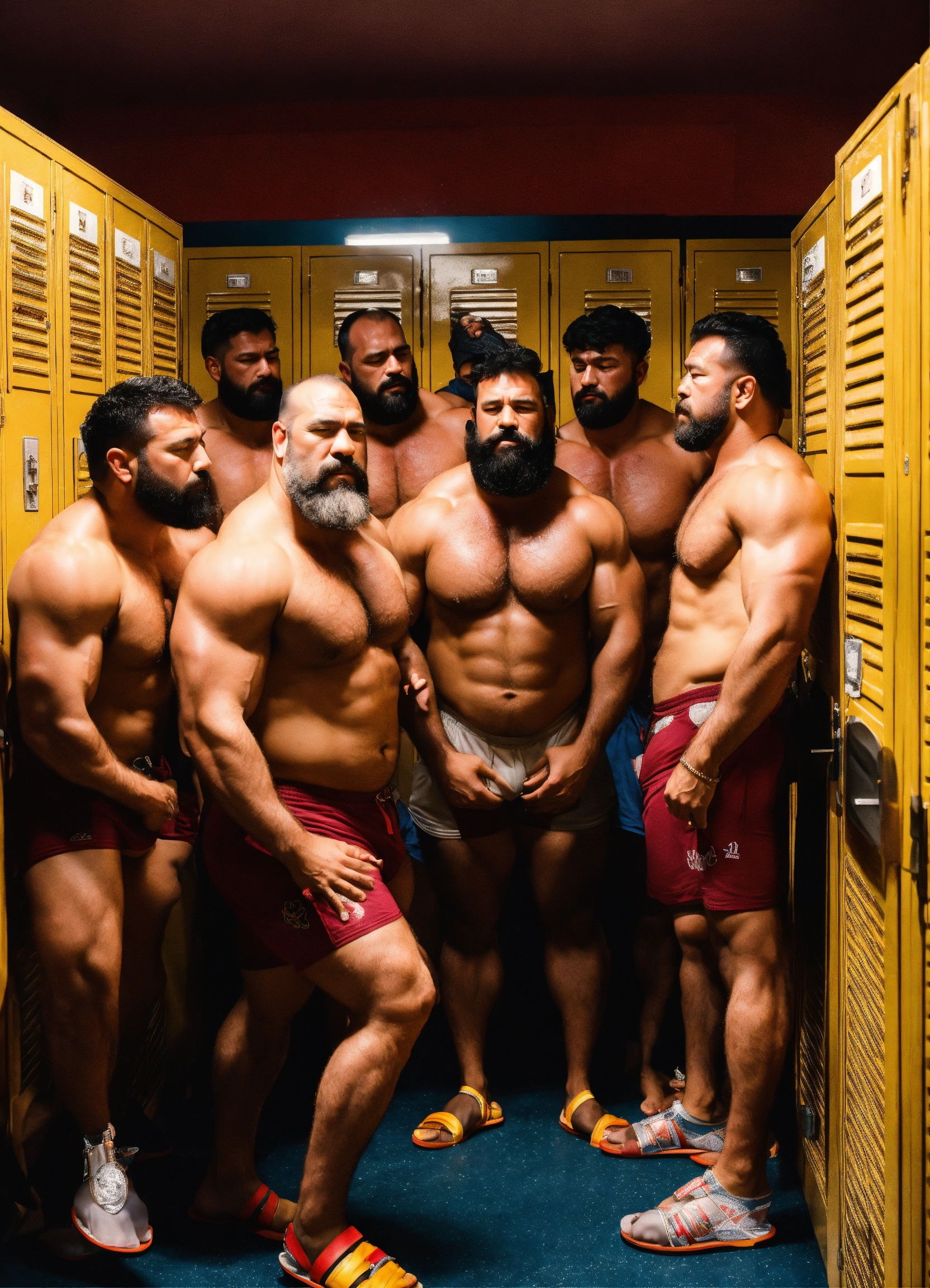 Group of friendly burly hairy manly ethnic strongmen worshipping each other's bodies in a locker room in trunks and flip flops, dad energy, epic, sniffing armpits, size difference, photography, high resolution, very detailed, smooth, clear, clean 4k