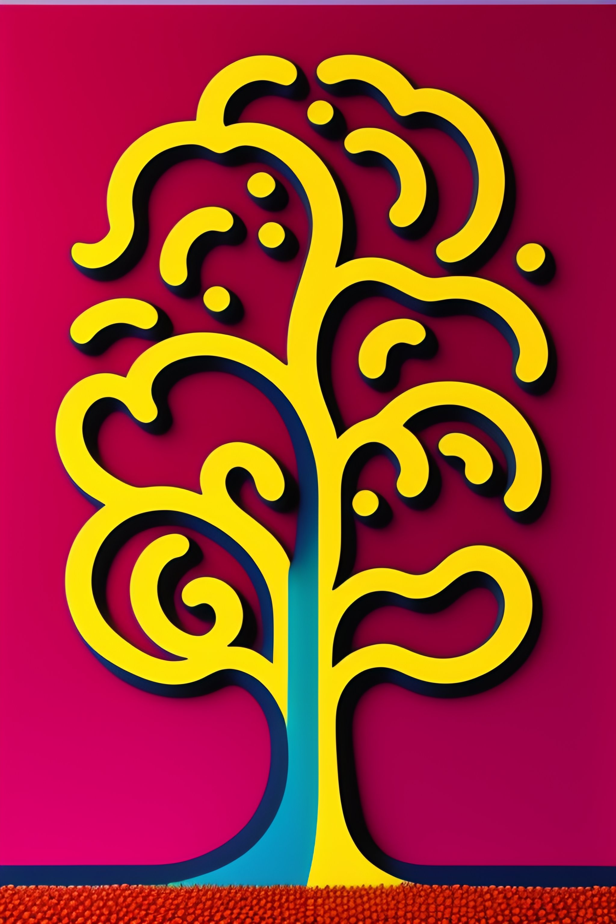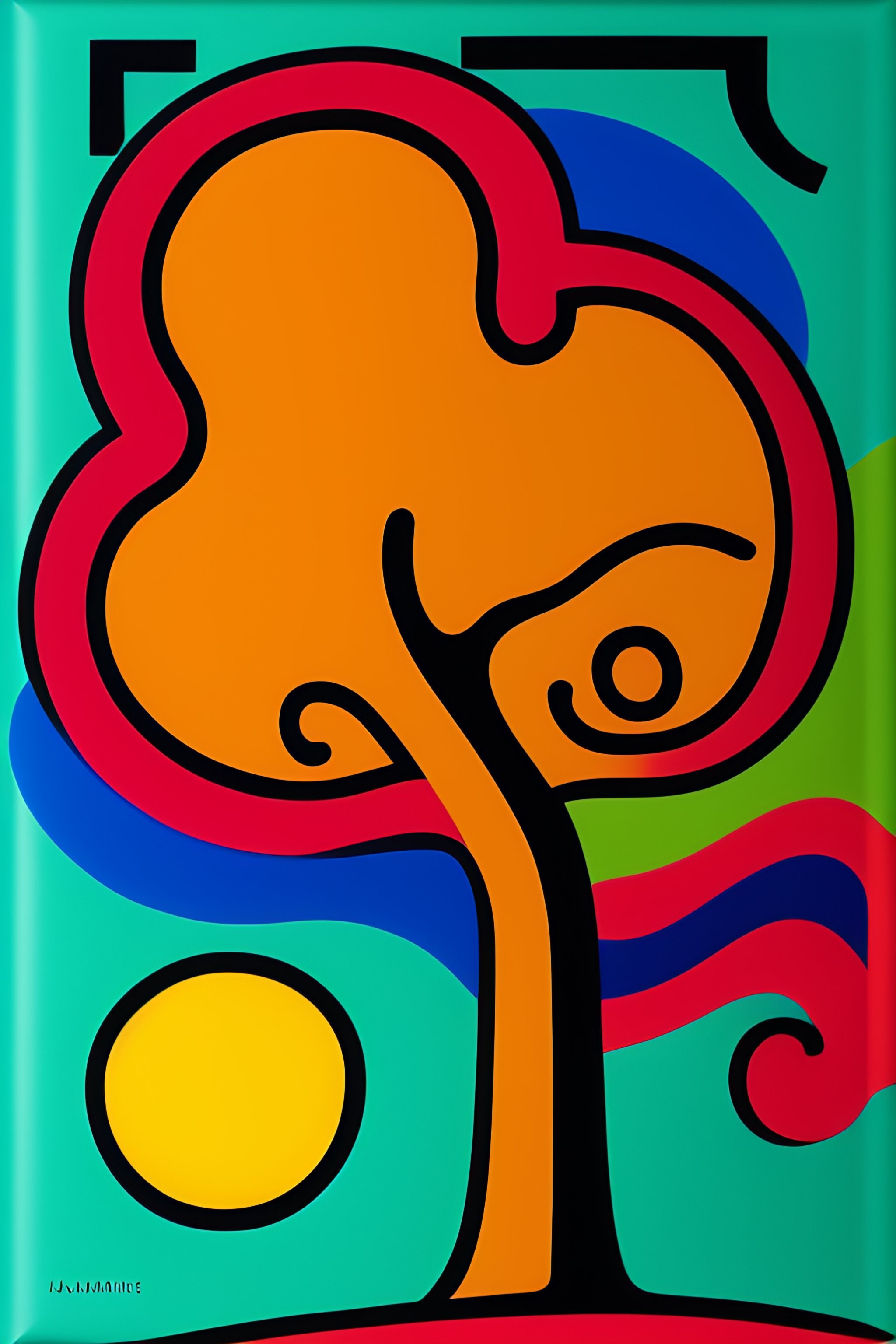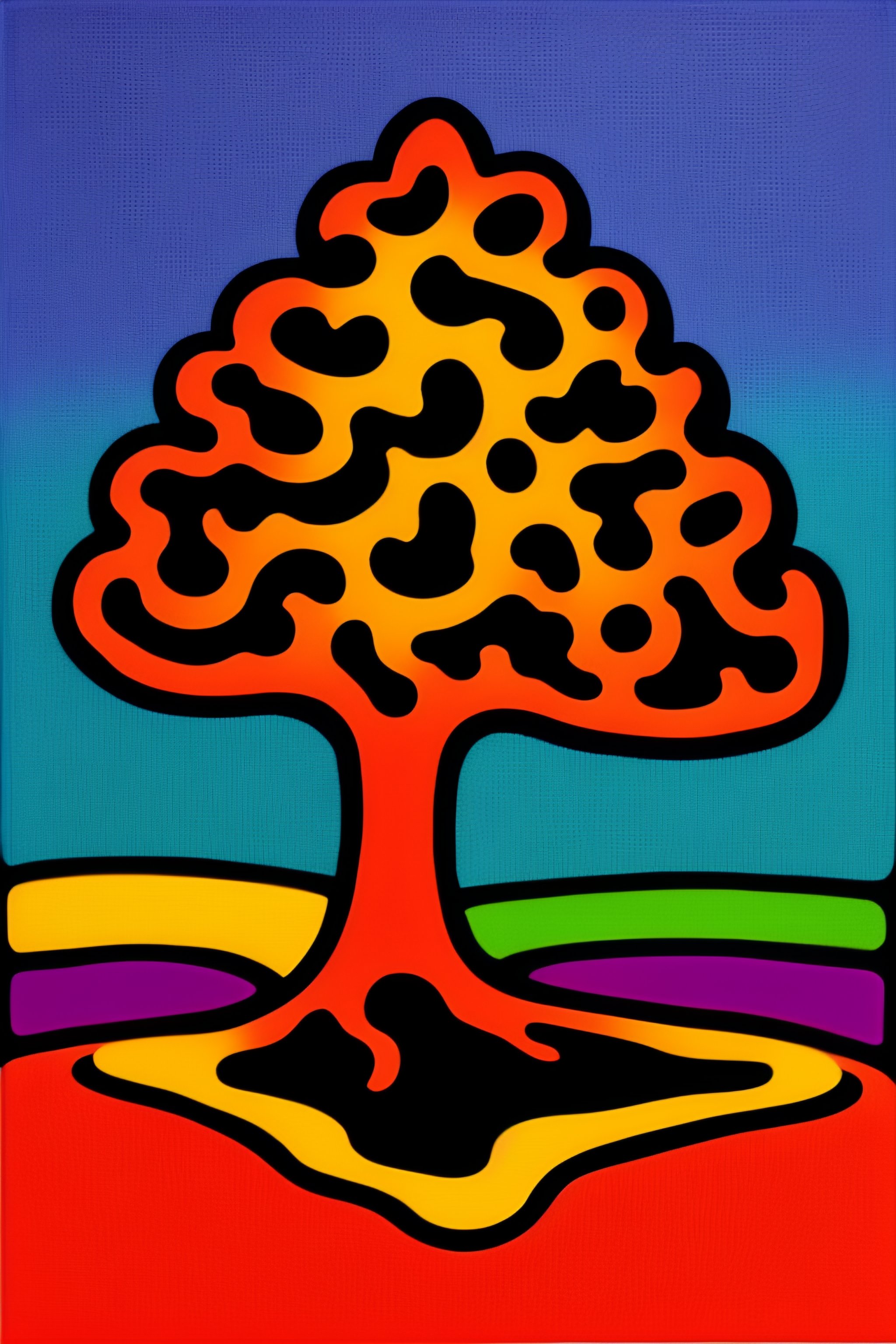 Minimal keith haring art of acorn that turns into a tree in the shape of a treble clef, a big rip down the middle, splashes of color, inspirational and powerful