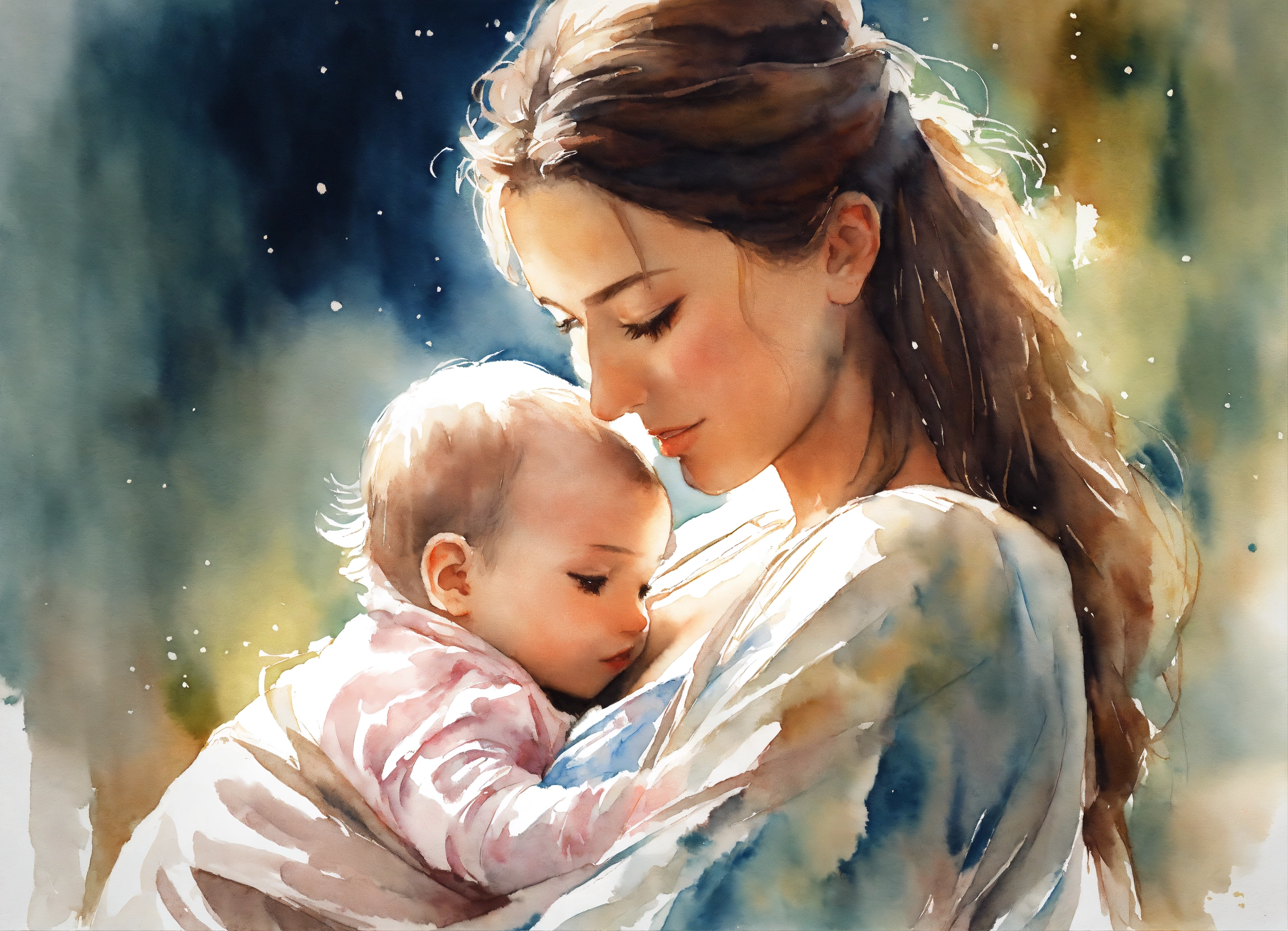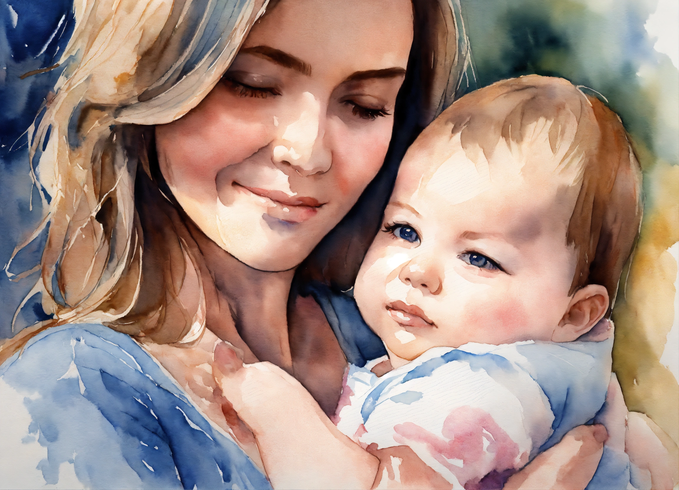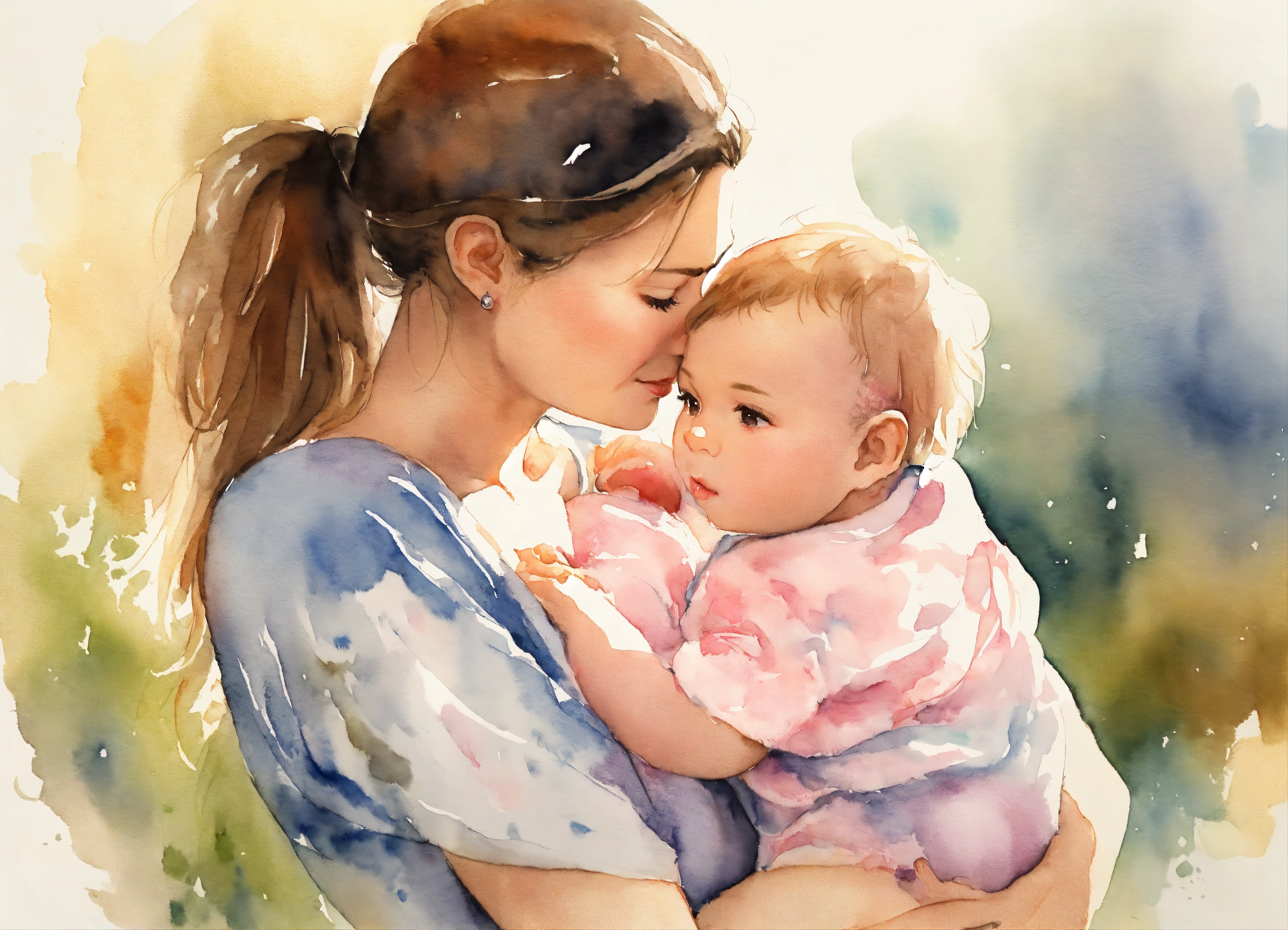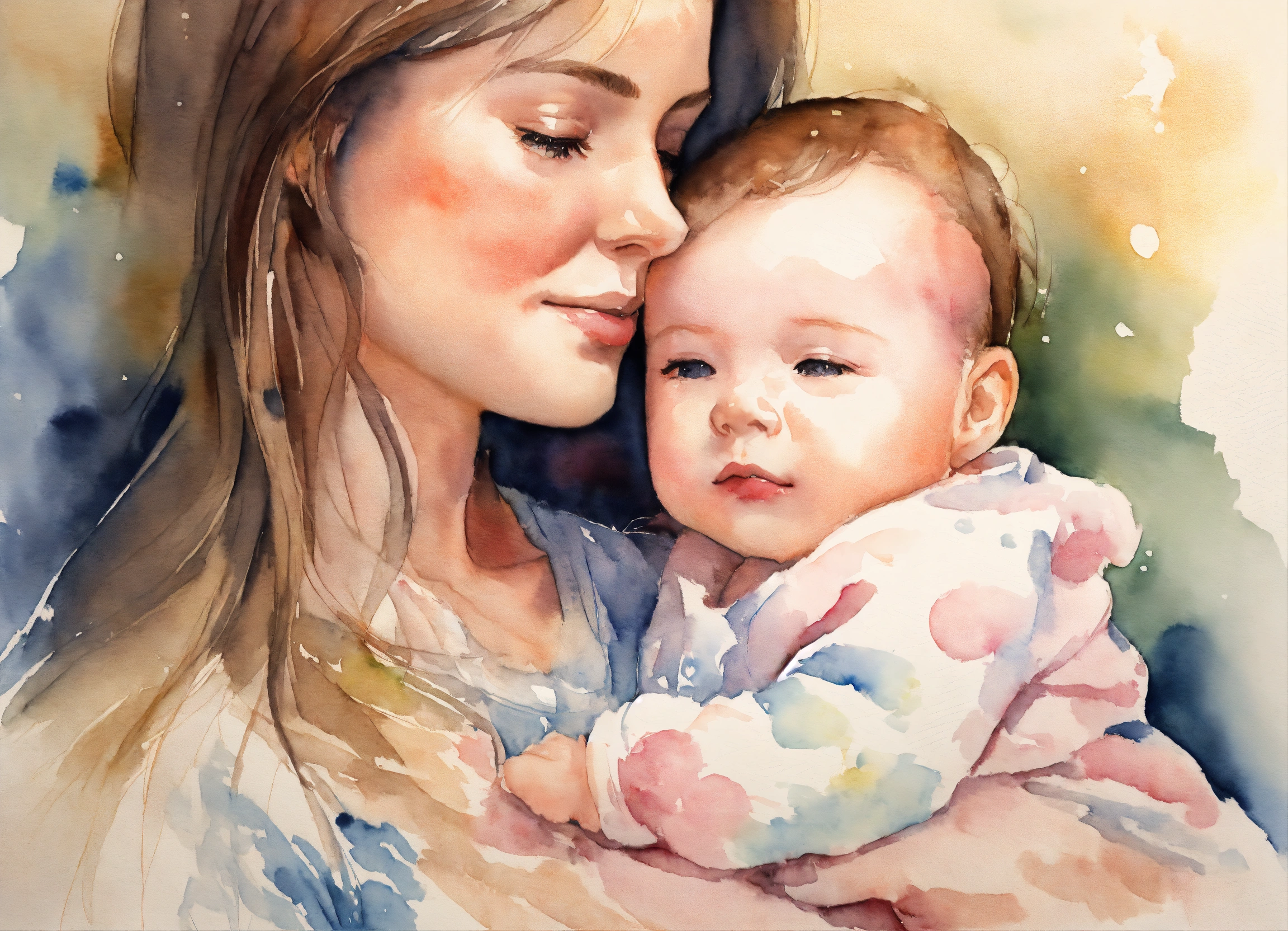 Beautiful mom holding baby in her arms, baby and mom are fully visible, very realistic, watercolor, delicate colors