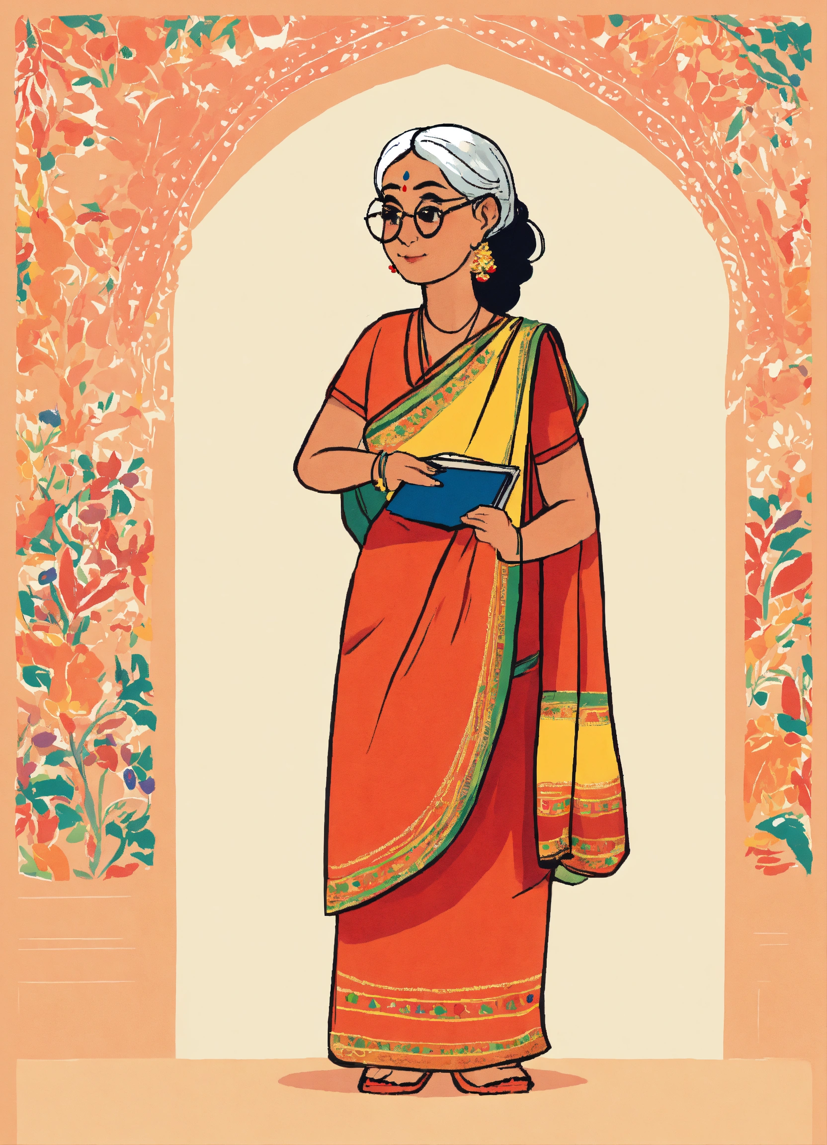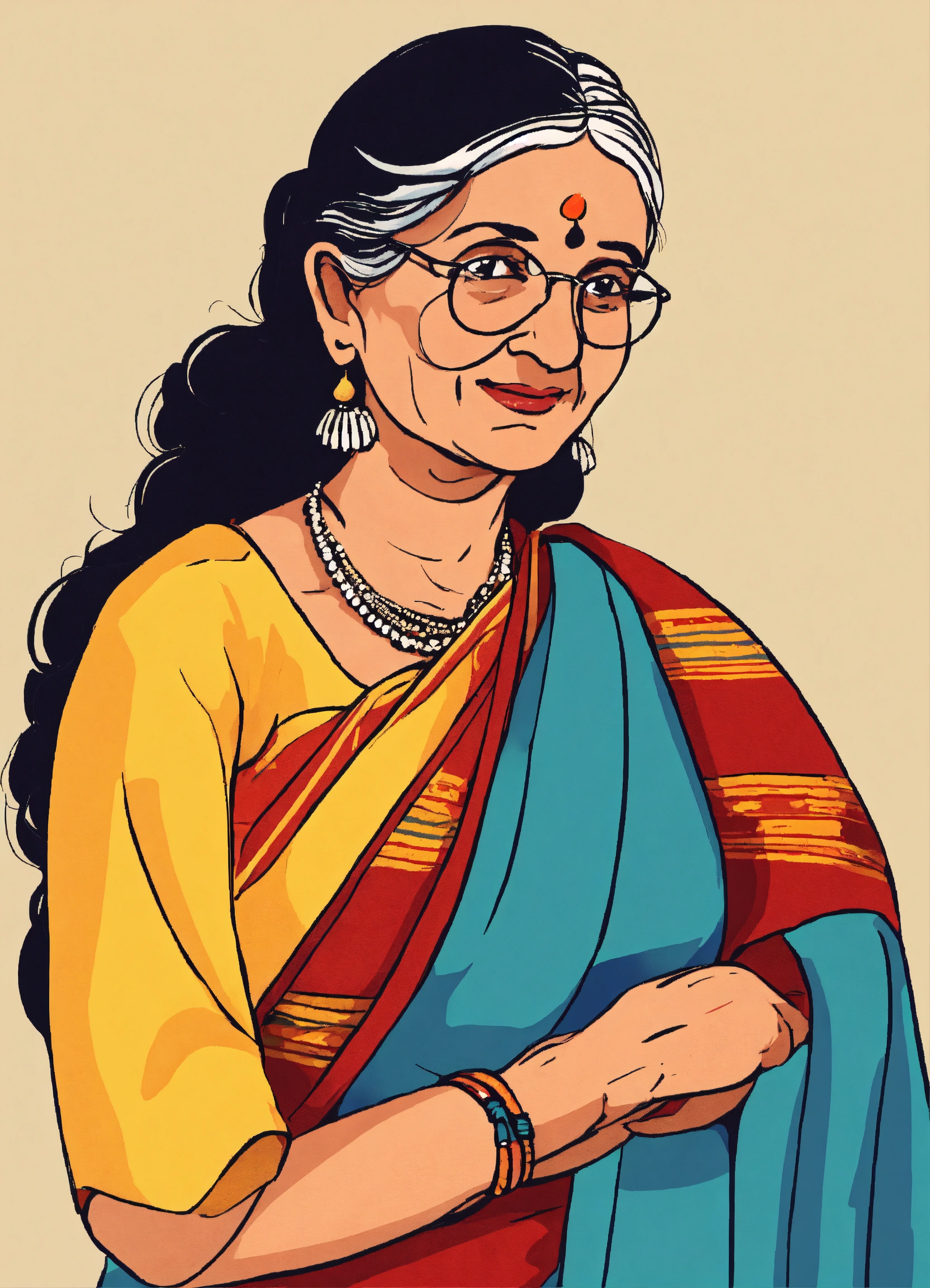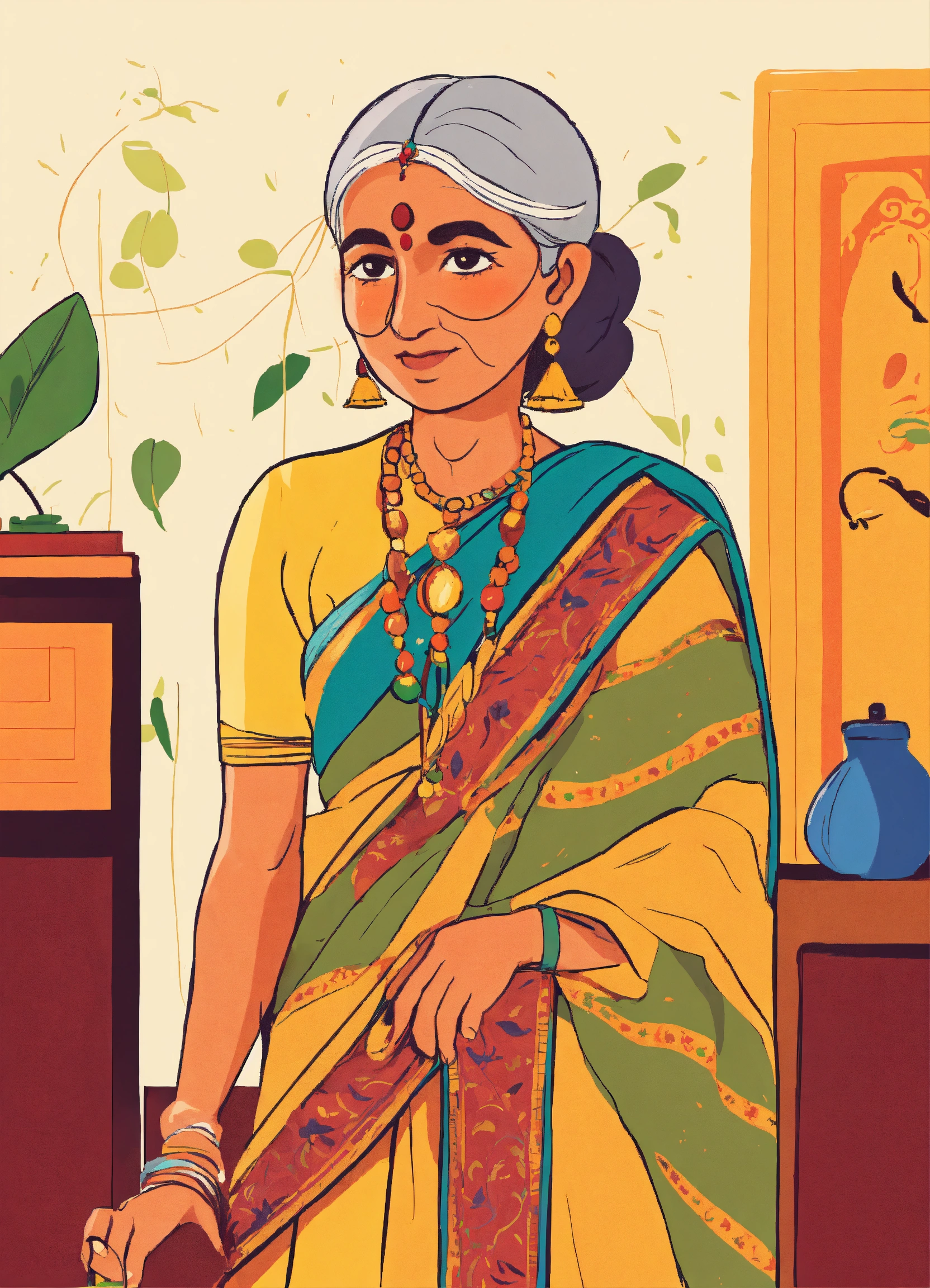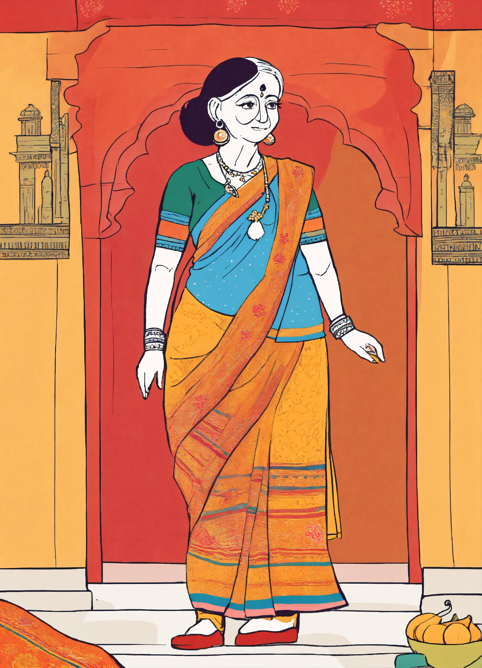 Cute doodle of indian grandma in a sari looking to the right, flat primary colors, childrens book, very simple illustration isolated on white background, copy space