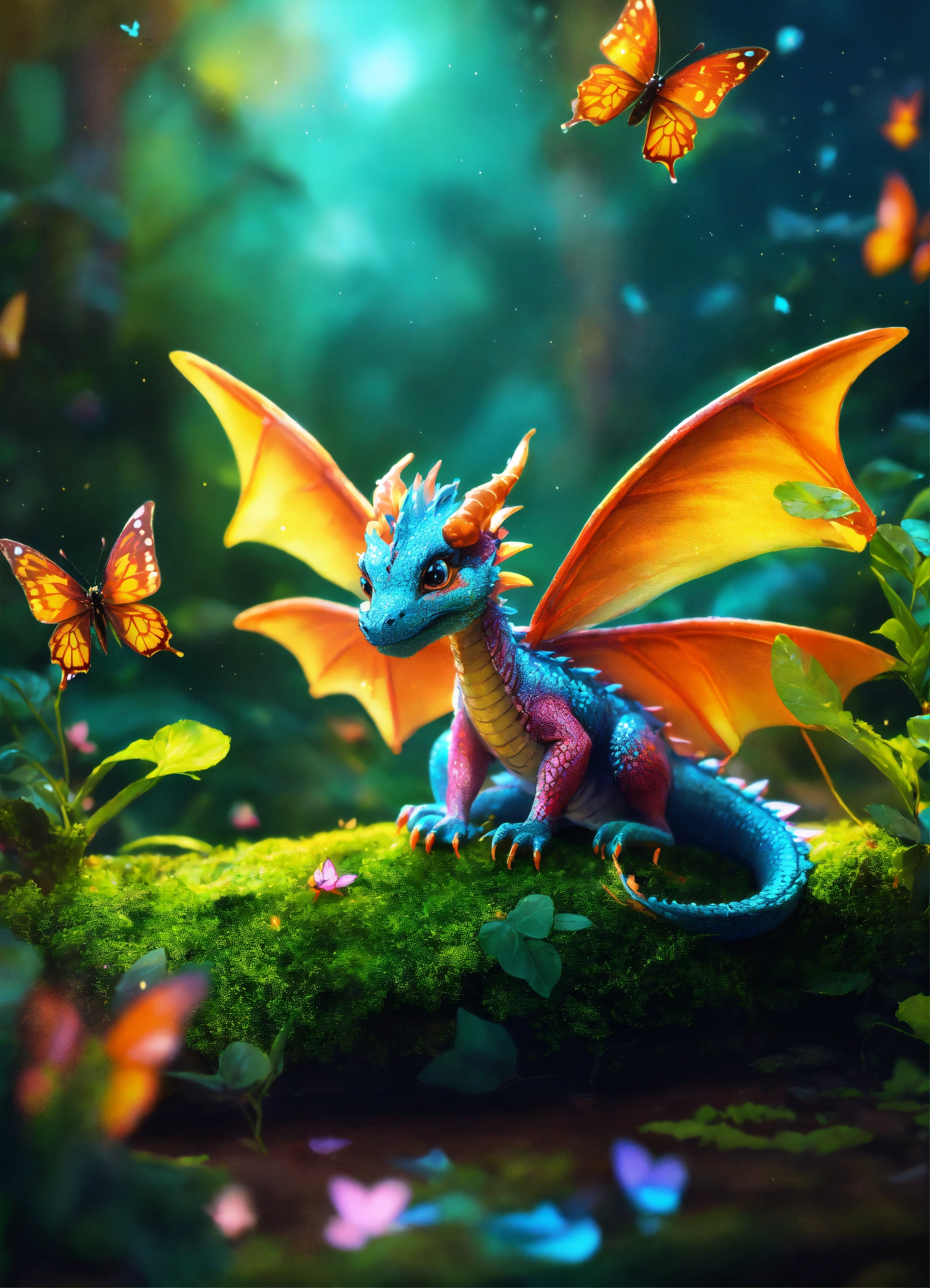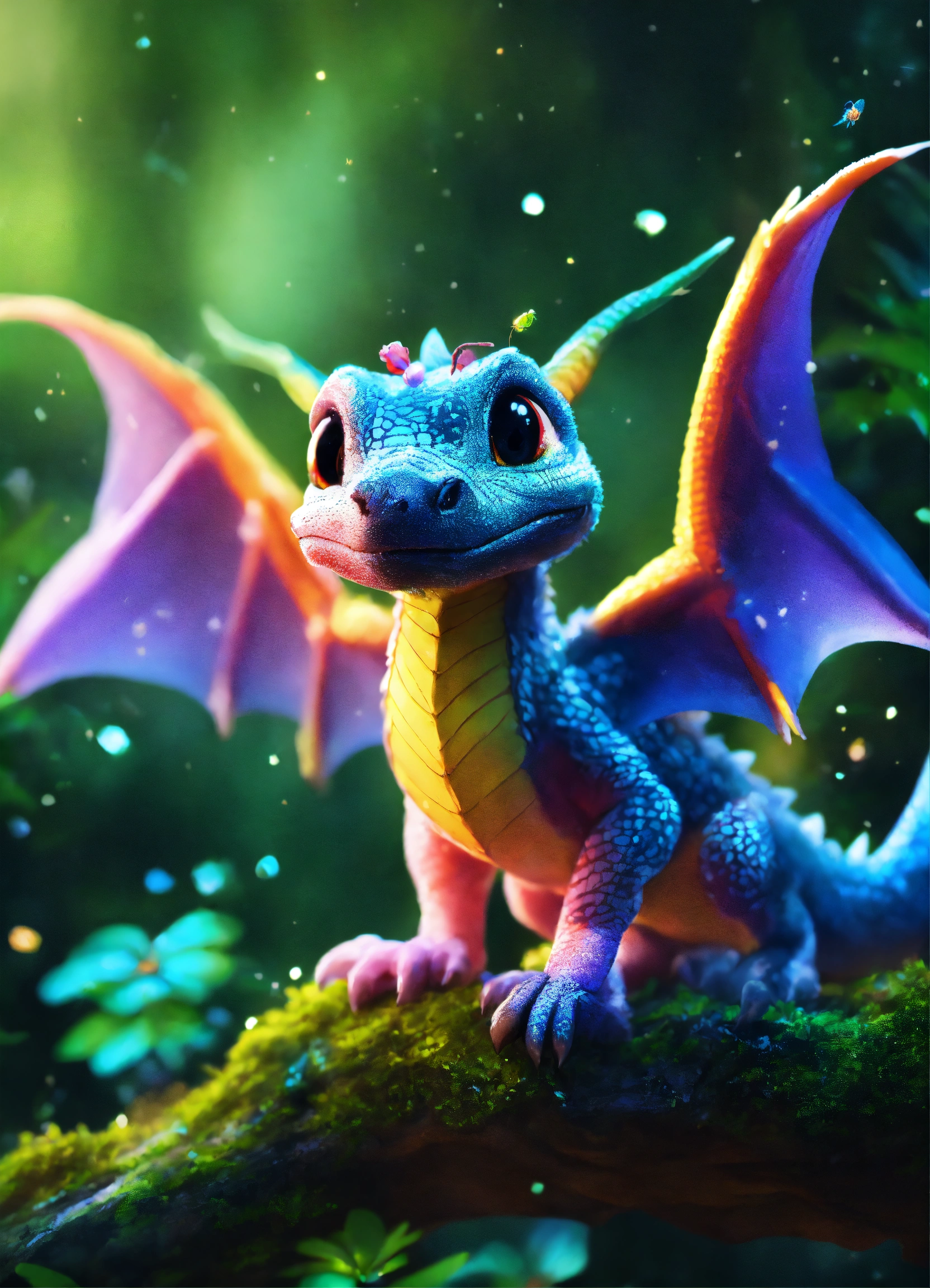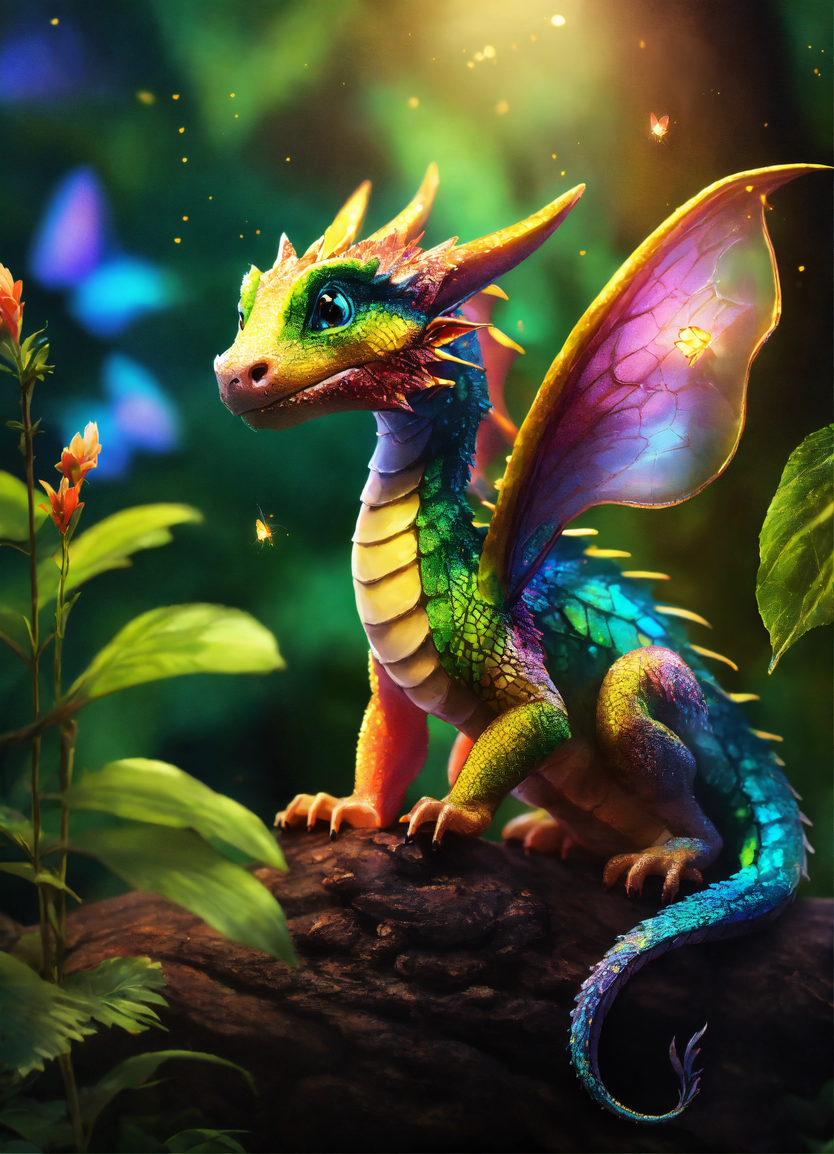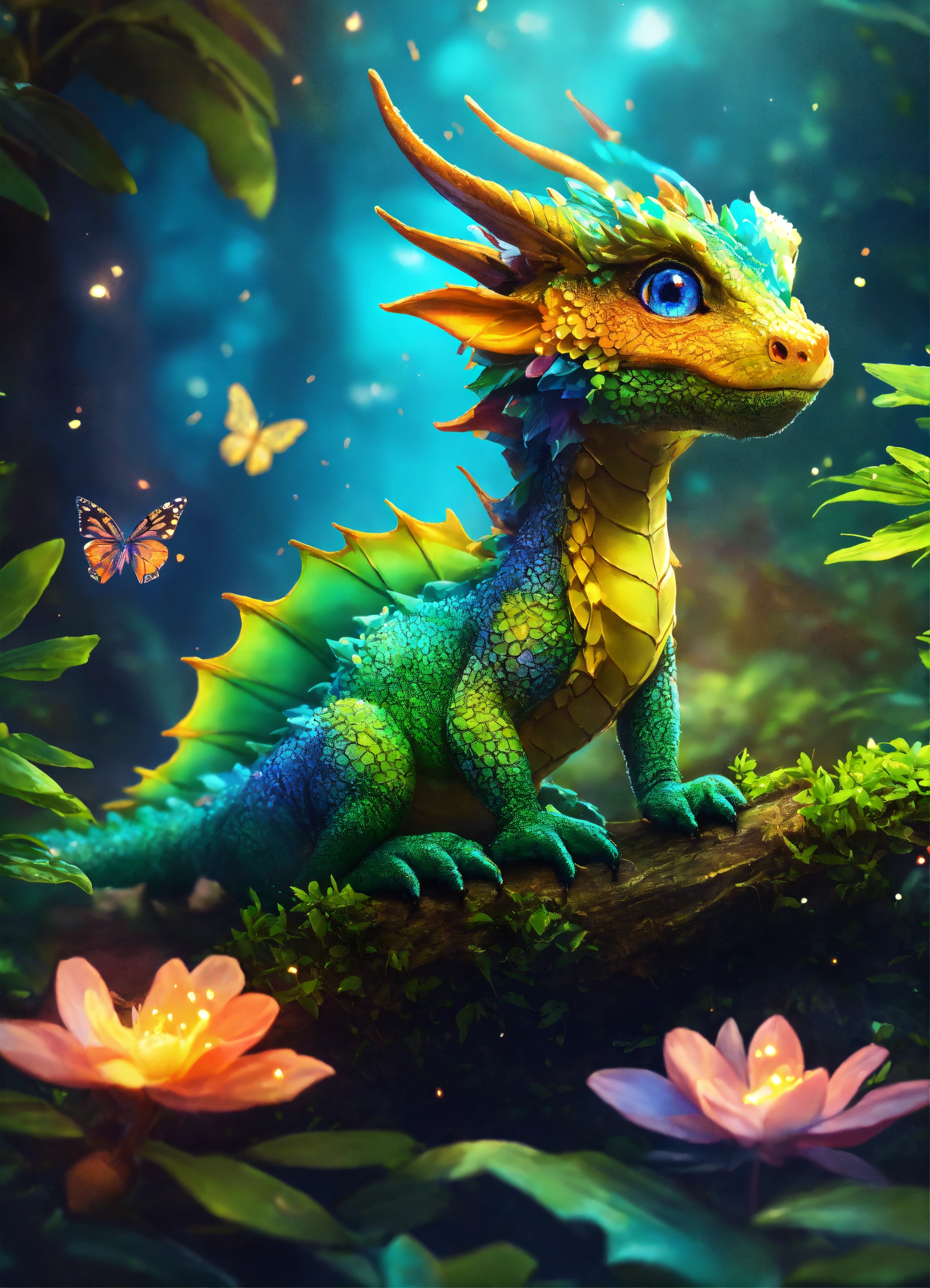 A beautiful baby multicolored dragon in a mystical jungle fireflies everywhere small butterflies perfect clarity photorealistic beautiful quality 8k