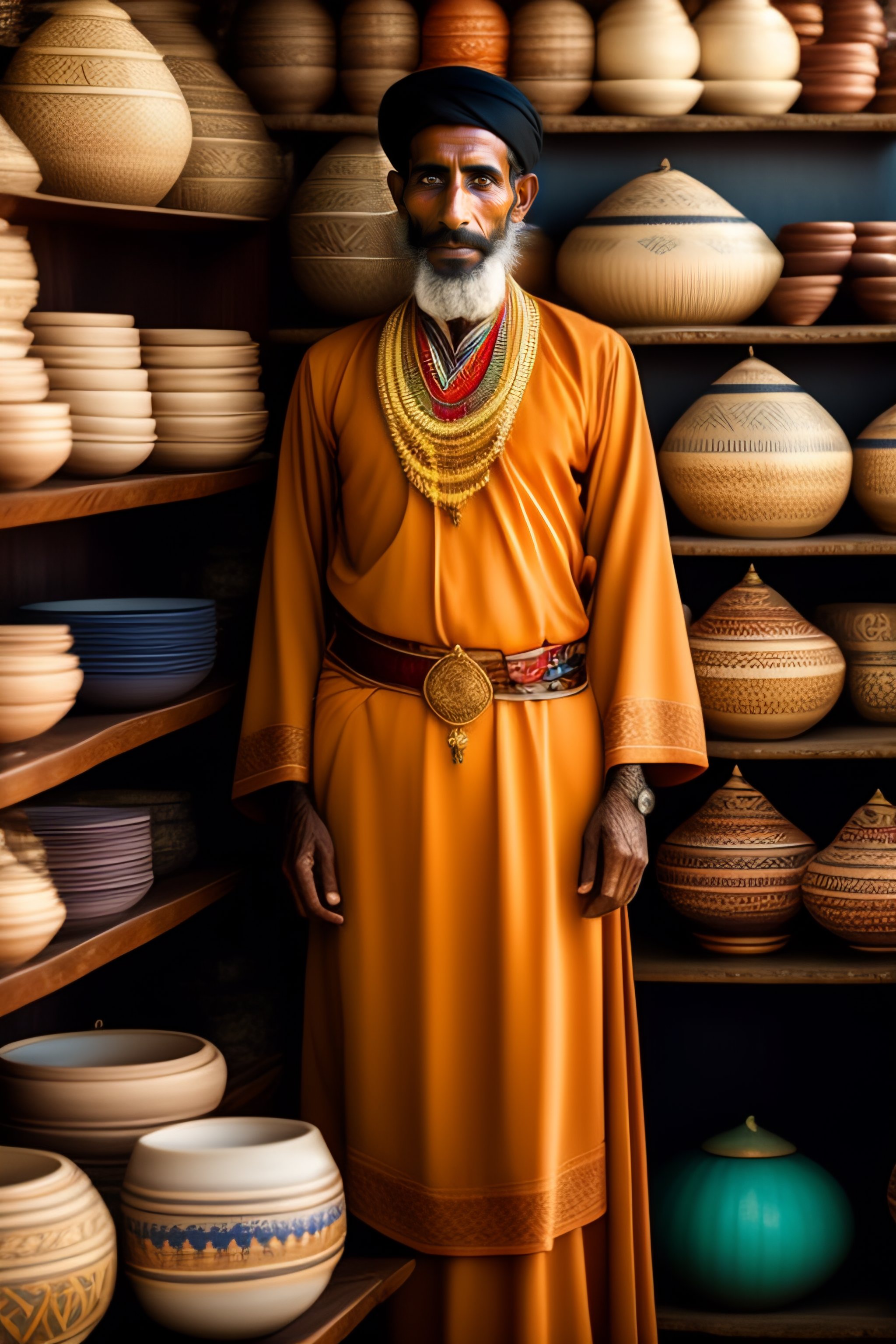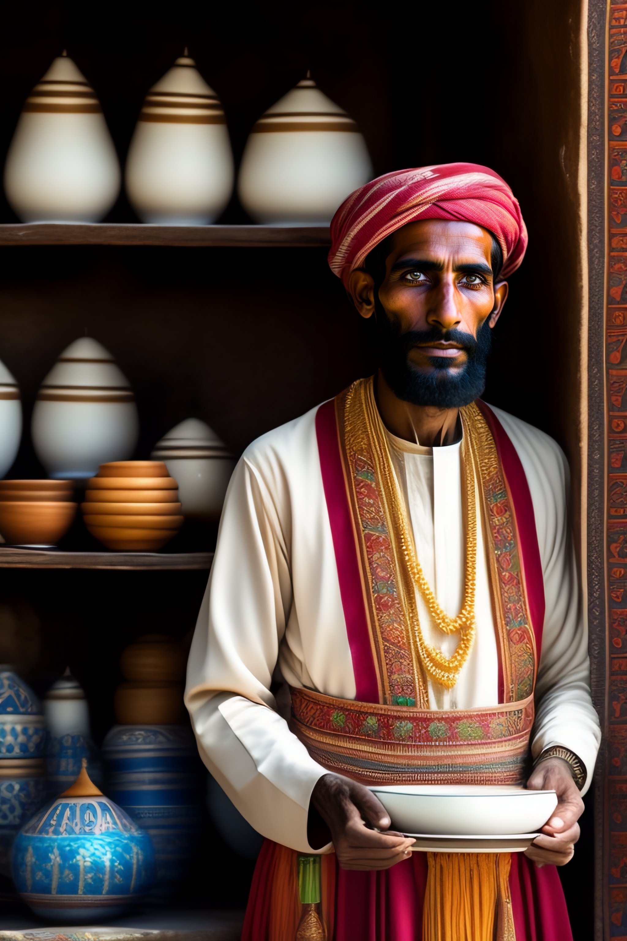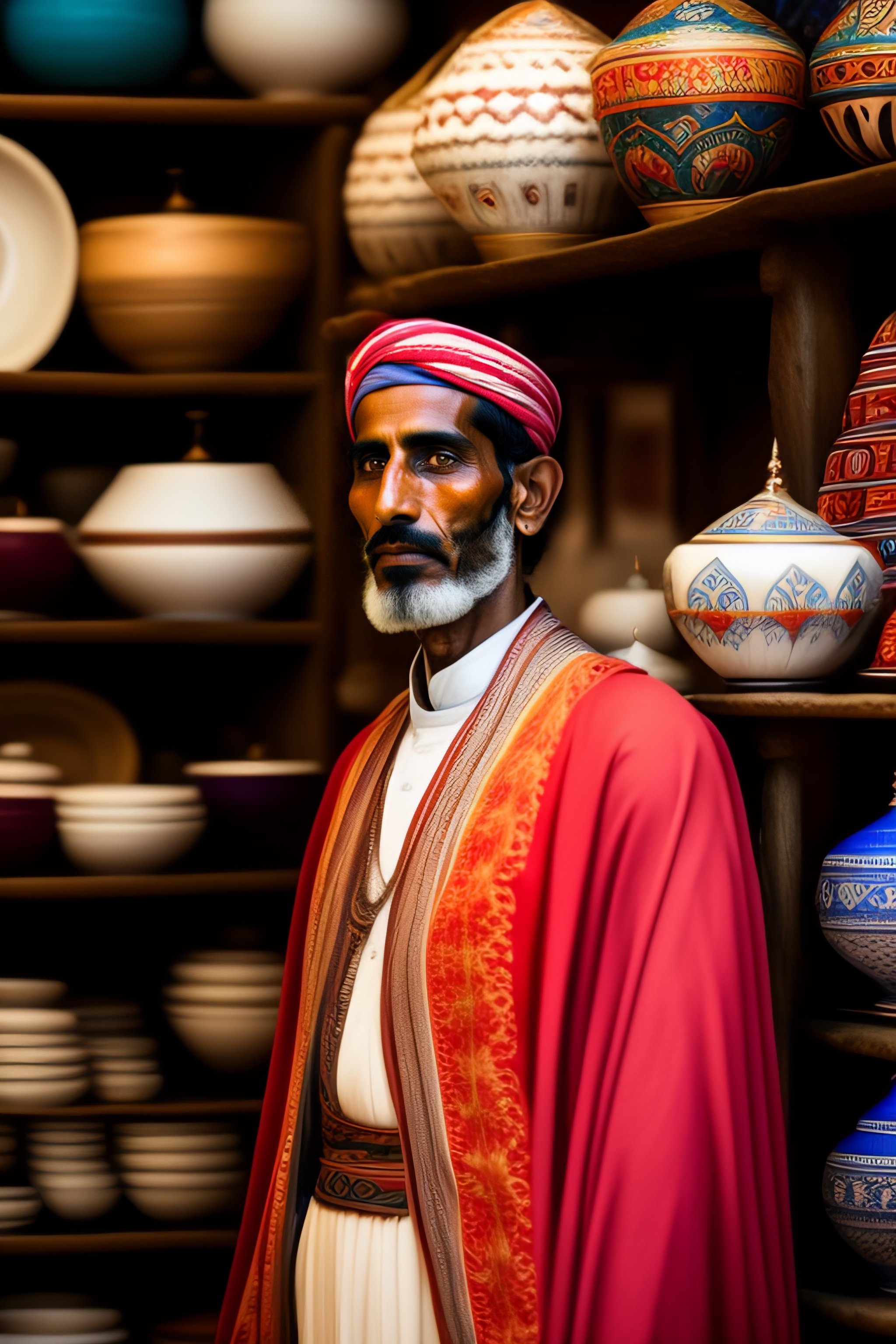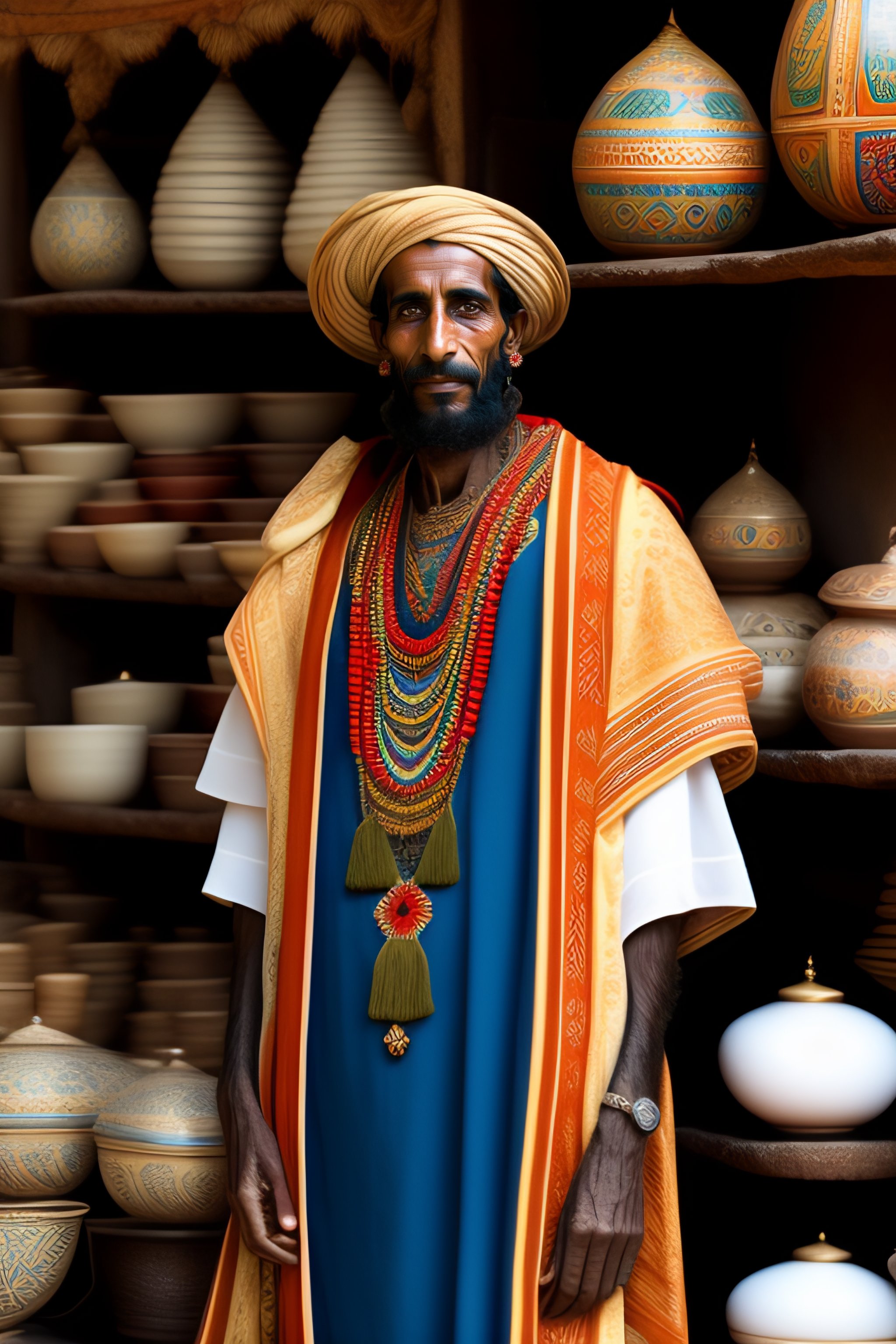 Beautiful yemenite man, wearing traditional clothes, standing in a shop with traditional yemenite ceramic plates