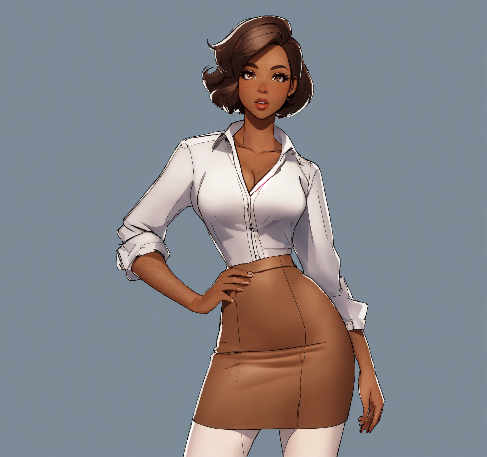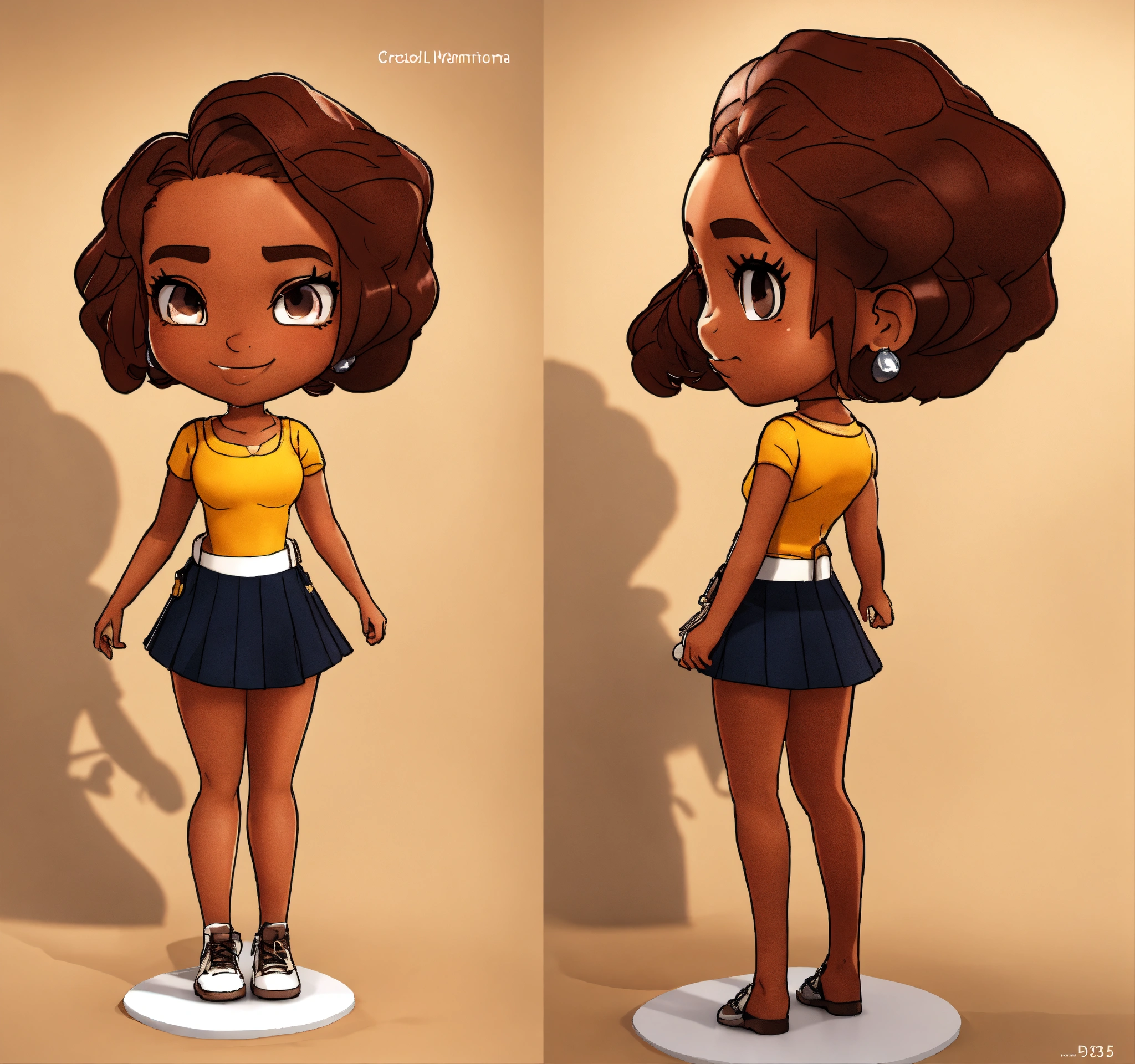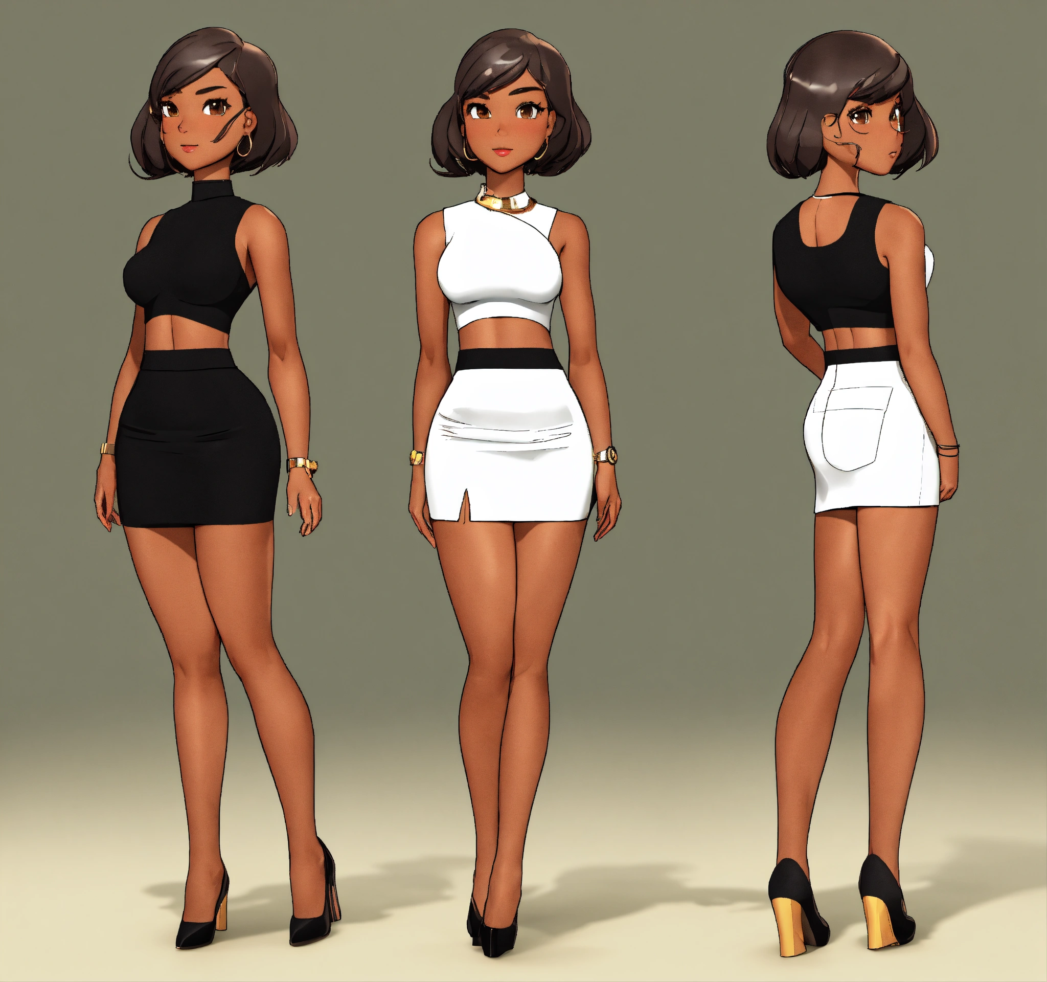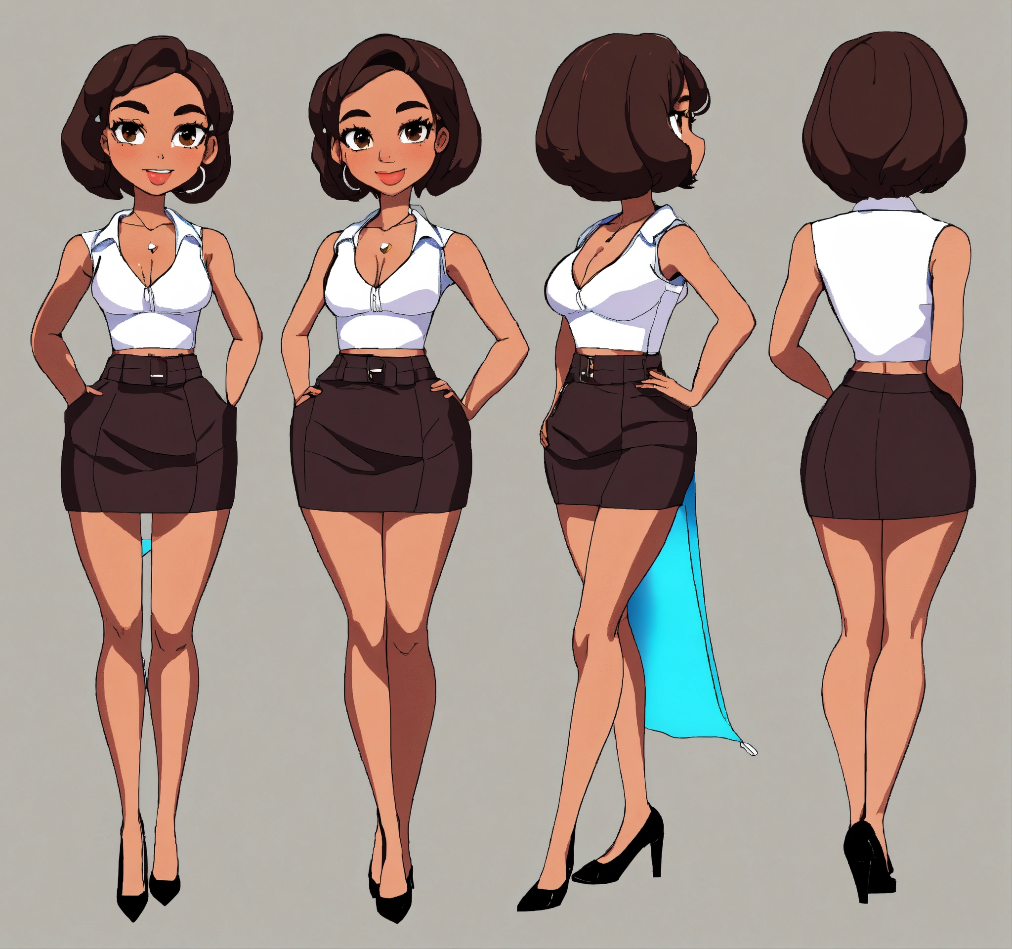 Cartoon brown skin, asymmetrical, no shadows, tan skin, gorgeous woman, white background, short hair, standing, facing front. hd, 3((((((((((((show whole body)))))), no shadows, cartoon, wearing a black mini skirt, full frame of the body 35mm wide angle shot, pin-up styles, make image into 3d, coloring book, vector, normal chest, [[[[[[[make a turnaround sheet of image]]]]]]!, ((((((((((((show whole body)))))), no shadows, cartoon cartoon brown skin, asymmetrical, no shadows, brown skin
