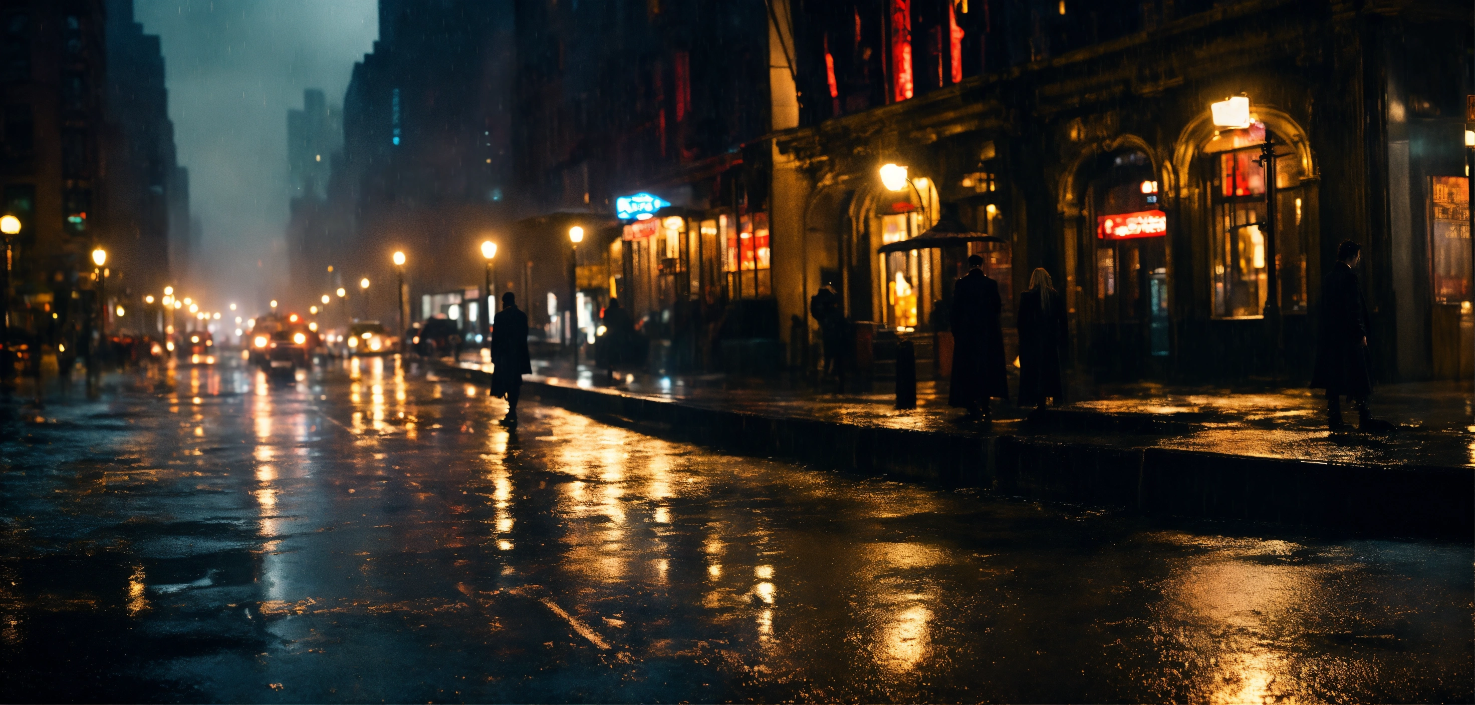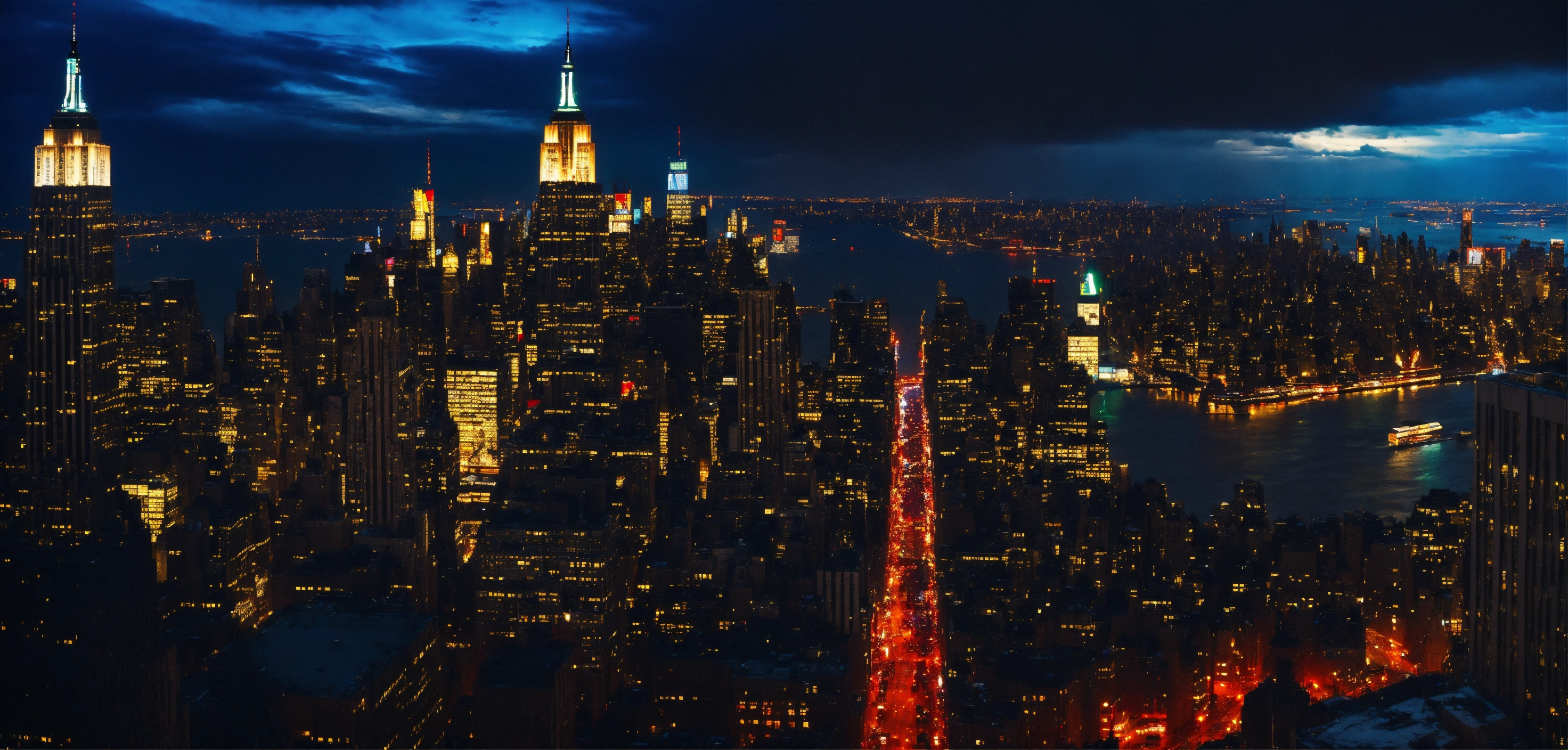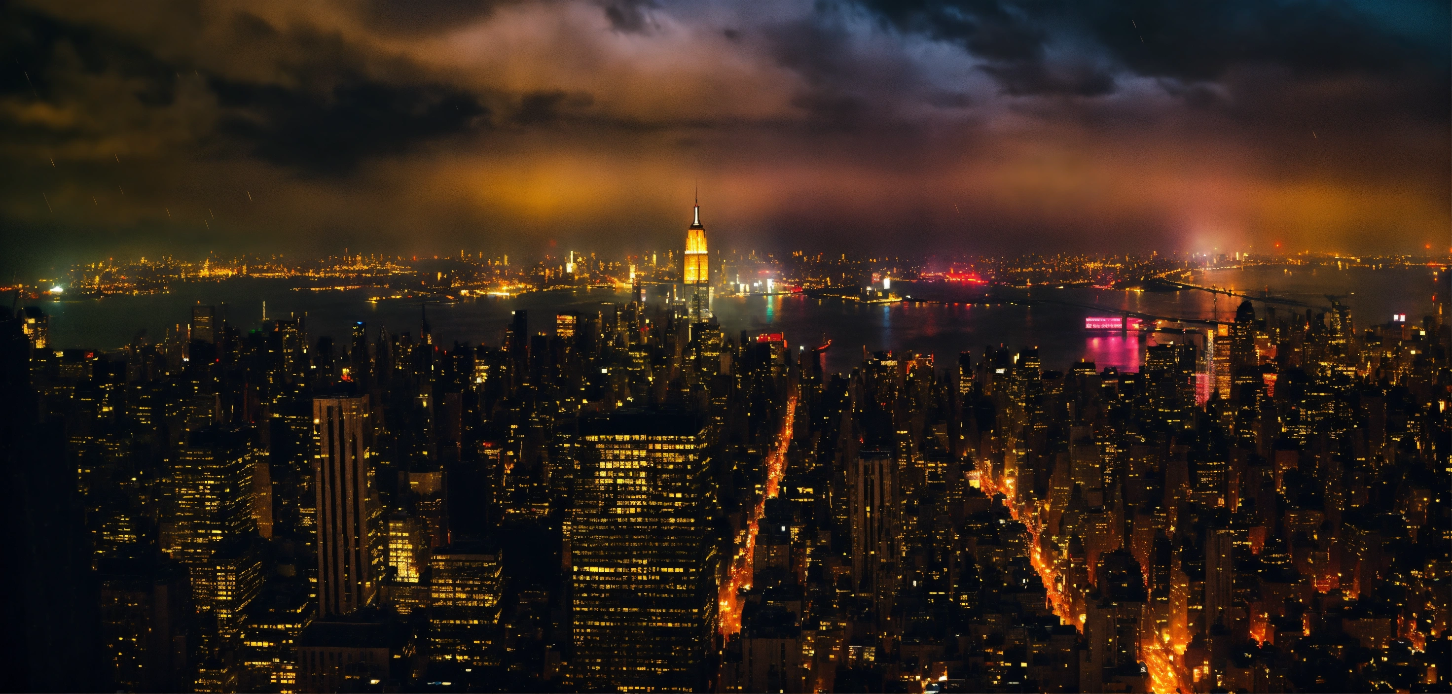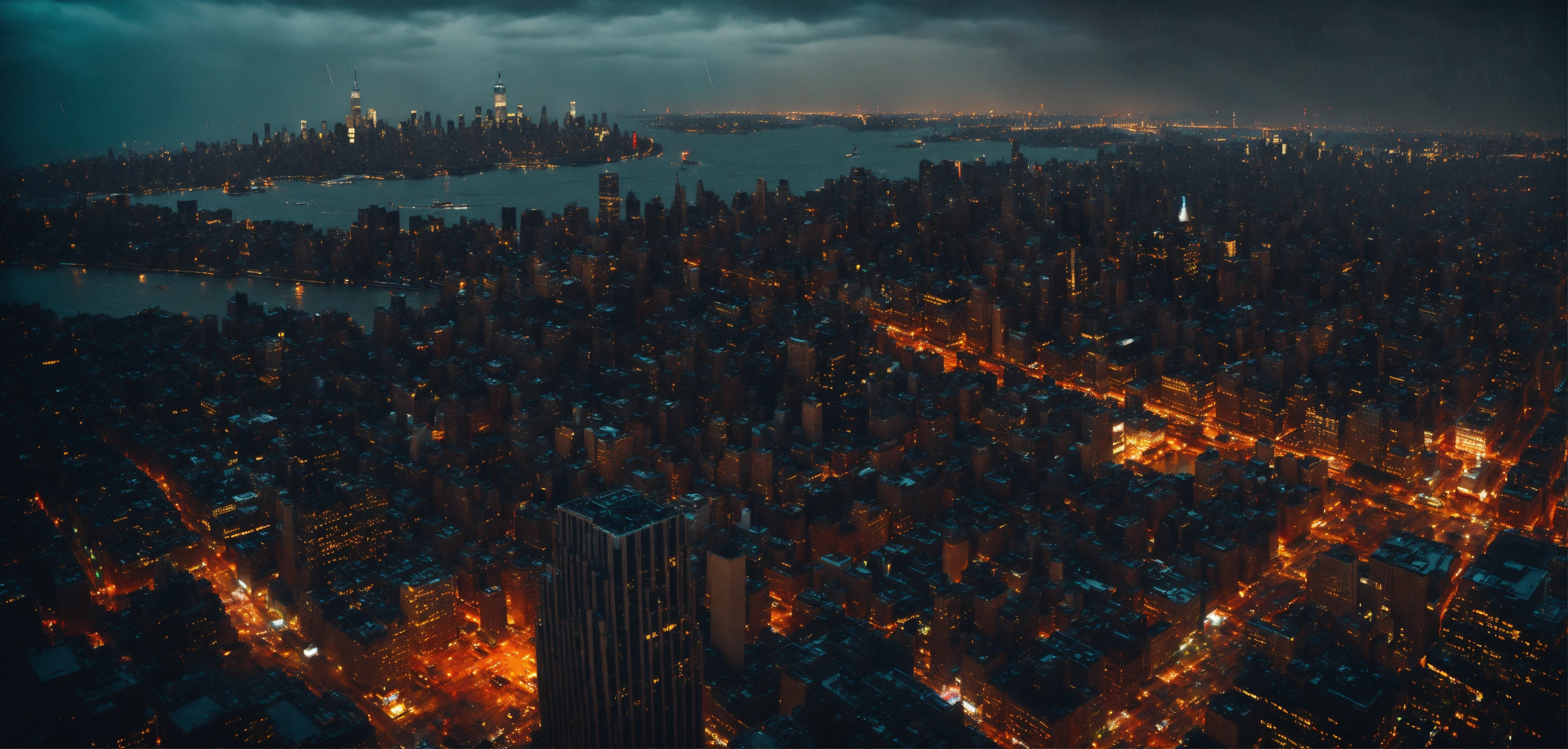 Cinematic look, vampire underworld movie style, dark gothic new york city by night, rainy weather, bird's eye view