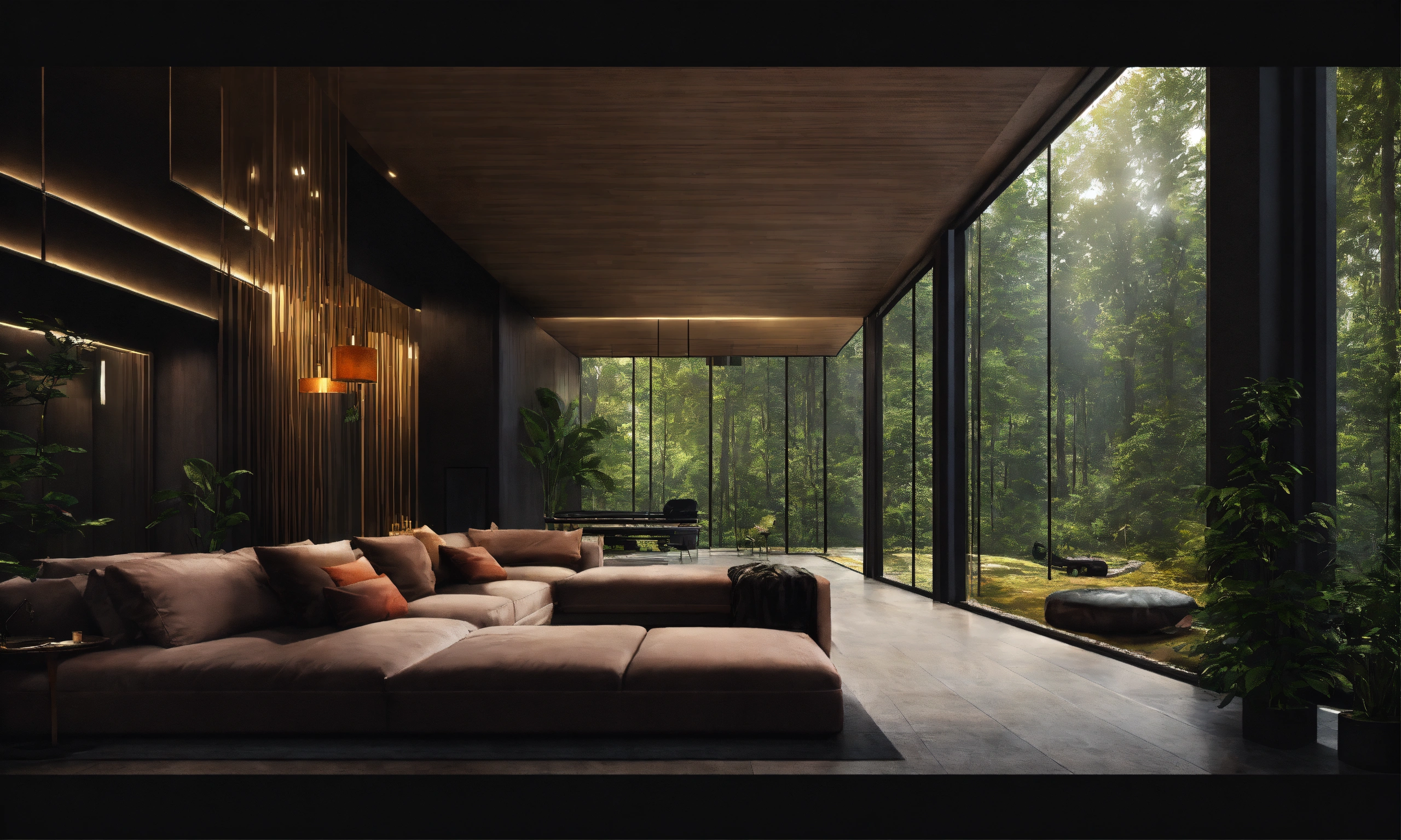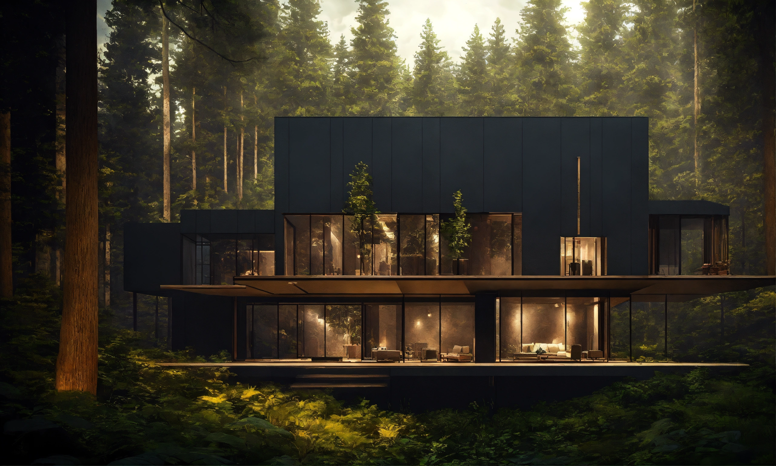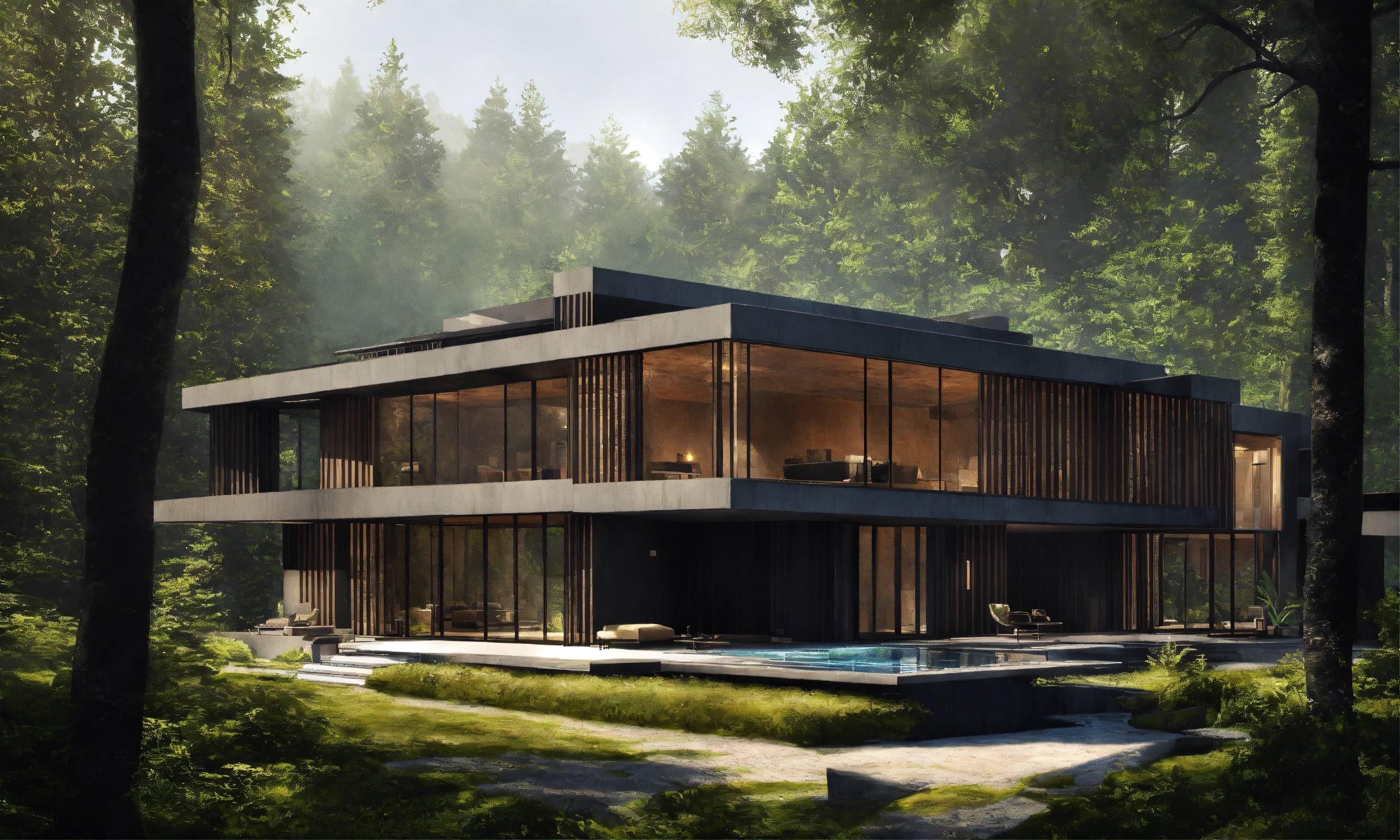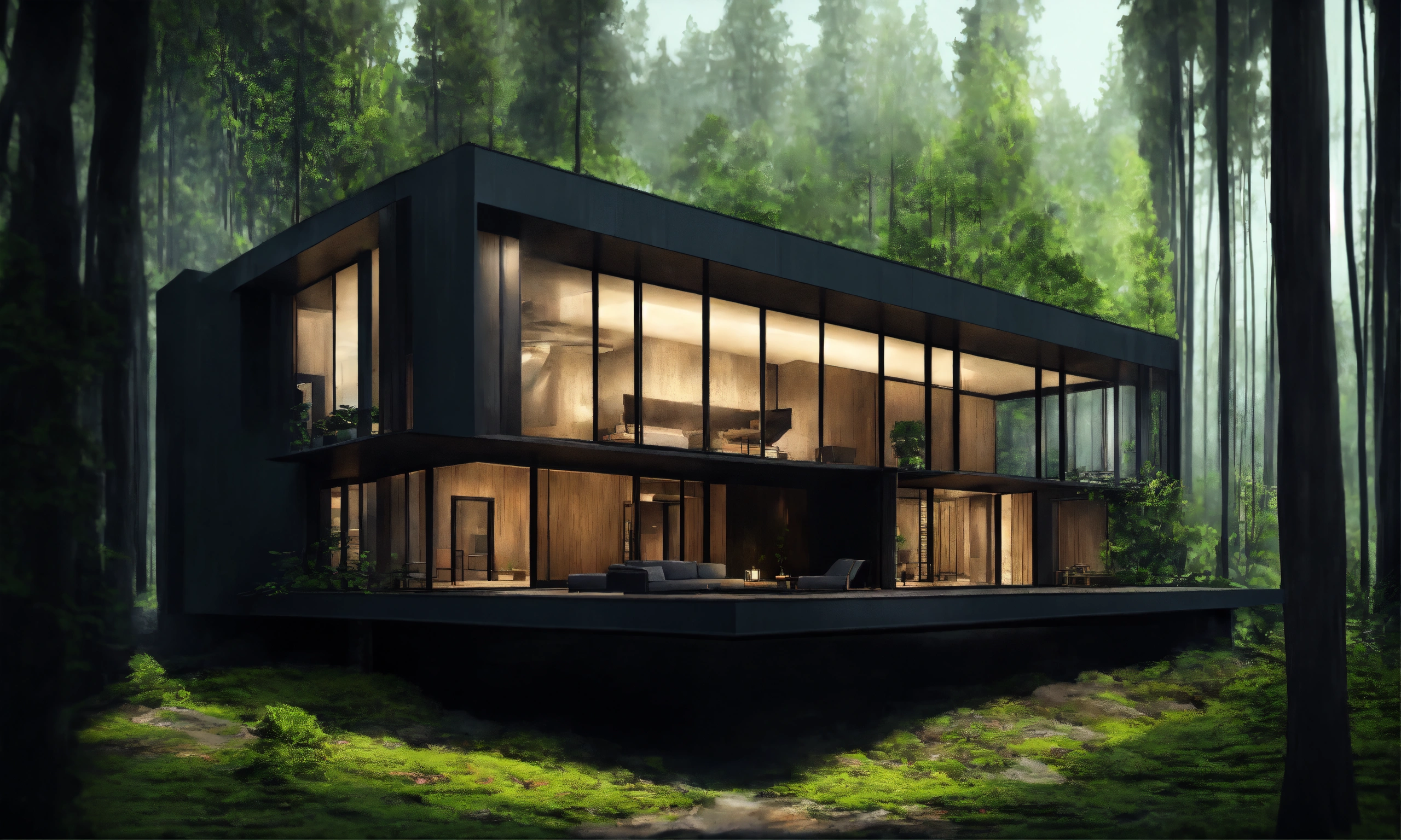 Concept art of interior design of forest luxurious home, dark modern architecture house, in the middle of the forest mansion