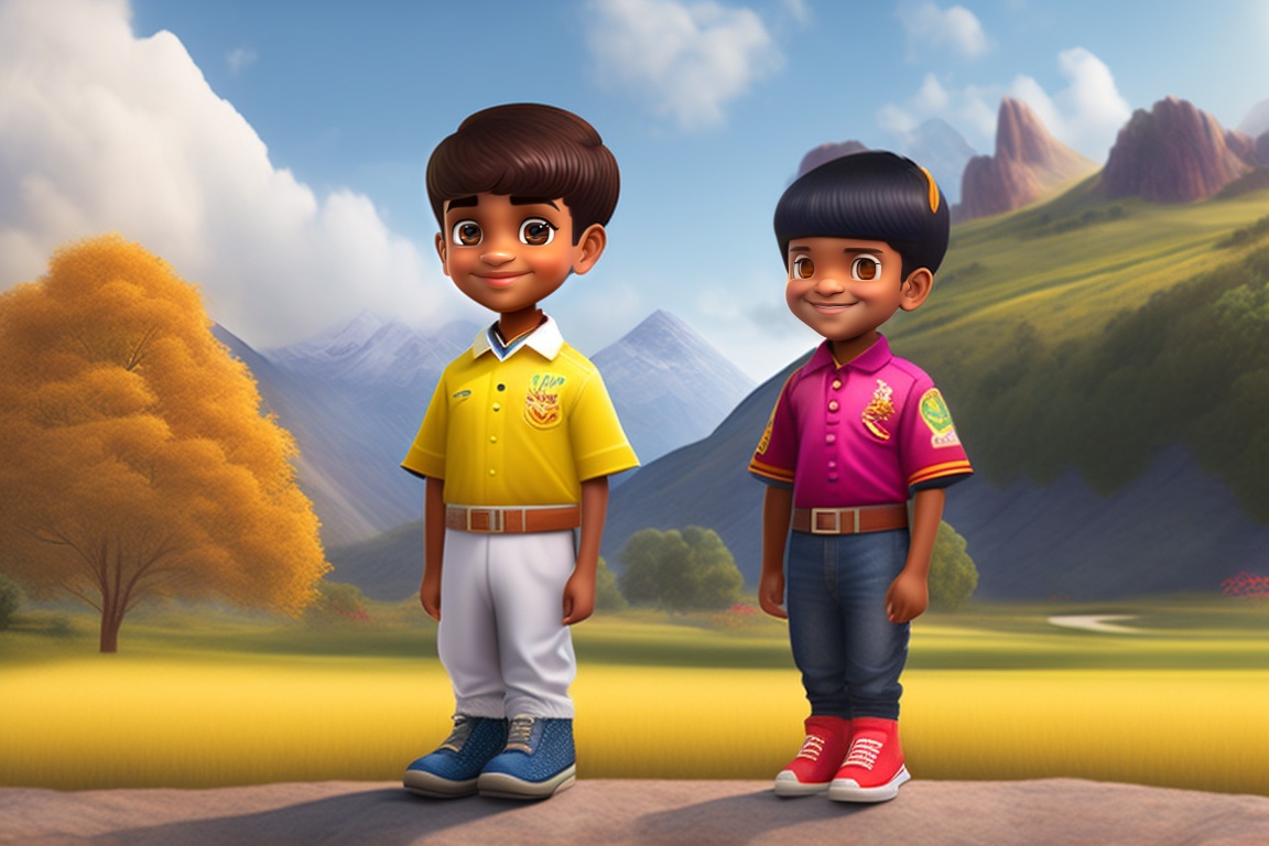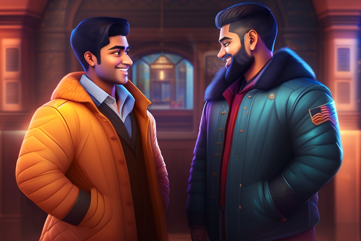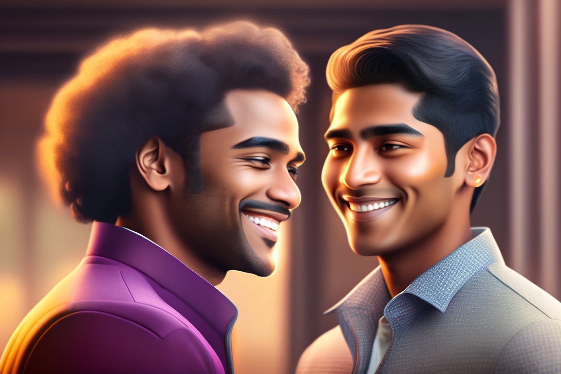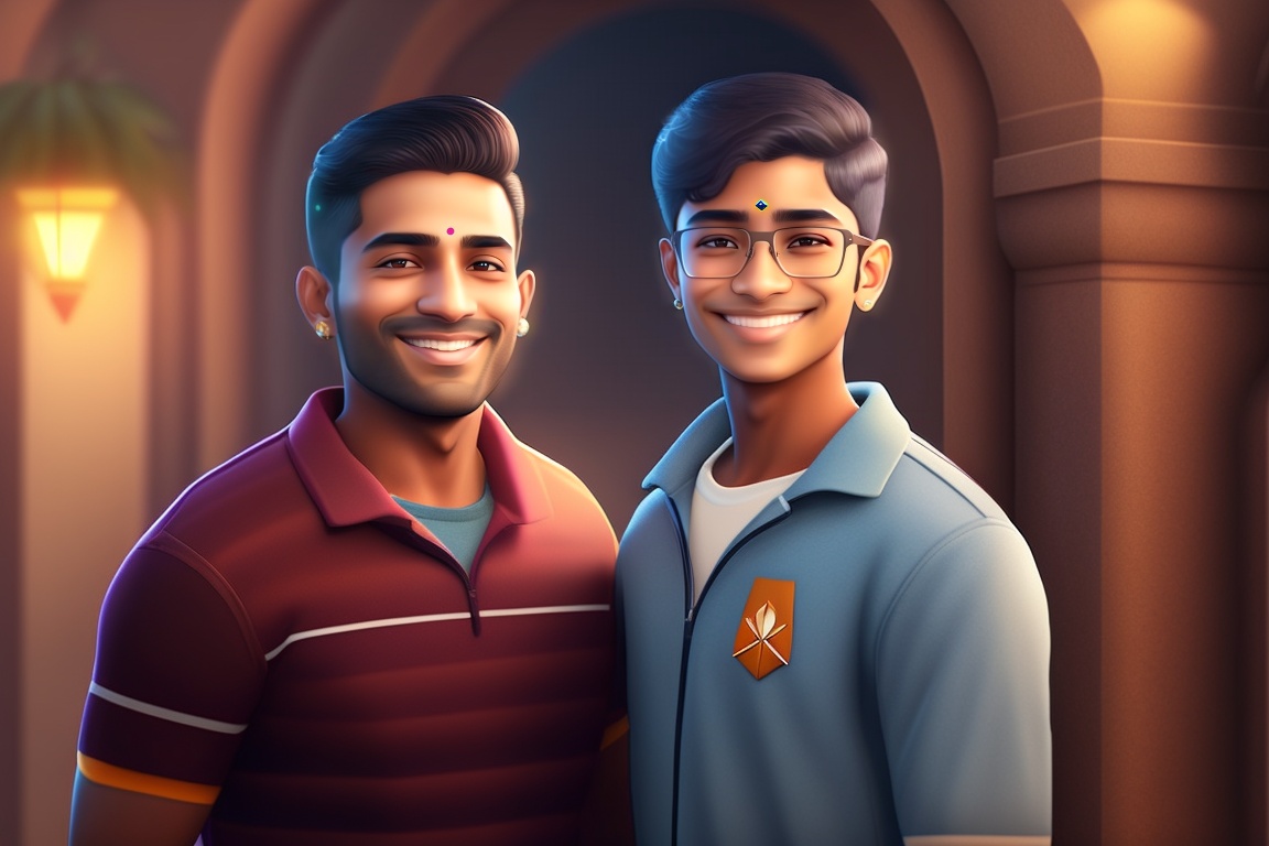 Image prompt 1: two friends, ram and shyam, standing together, smiling, and holding hands, showcasing their strong bond of friendship.