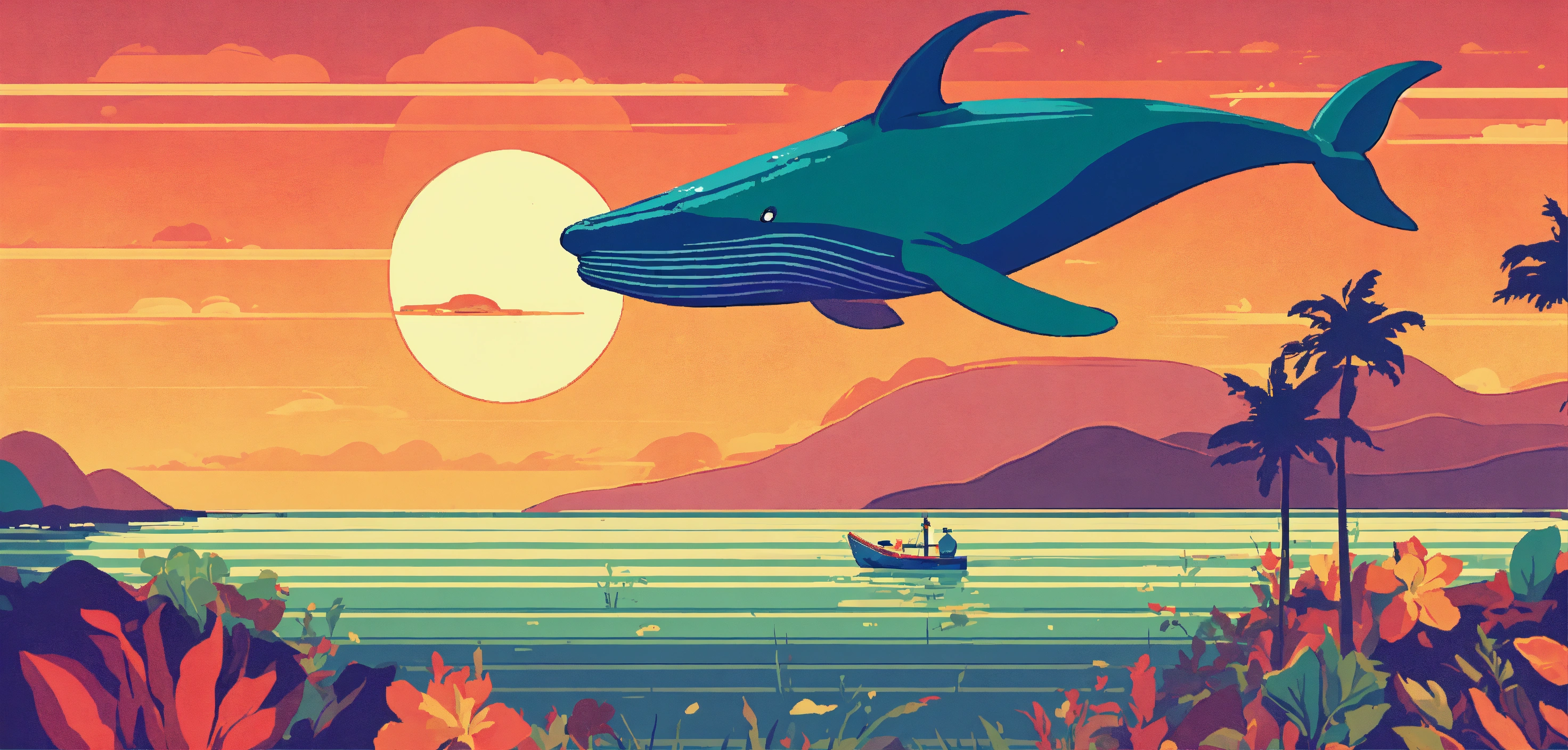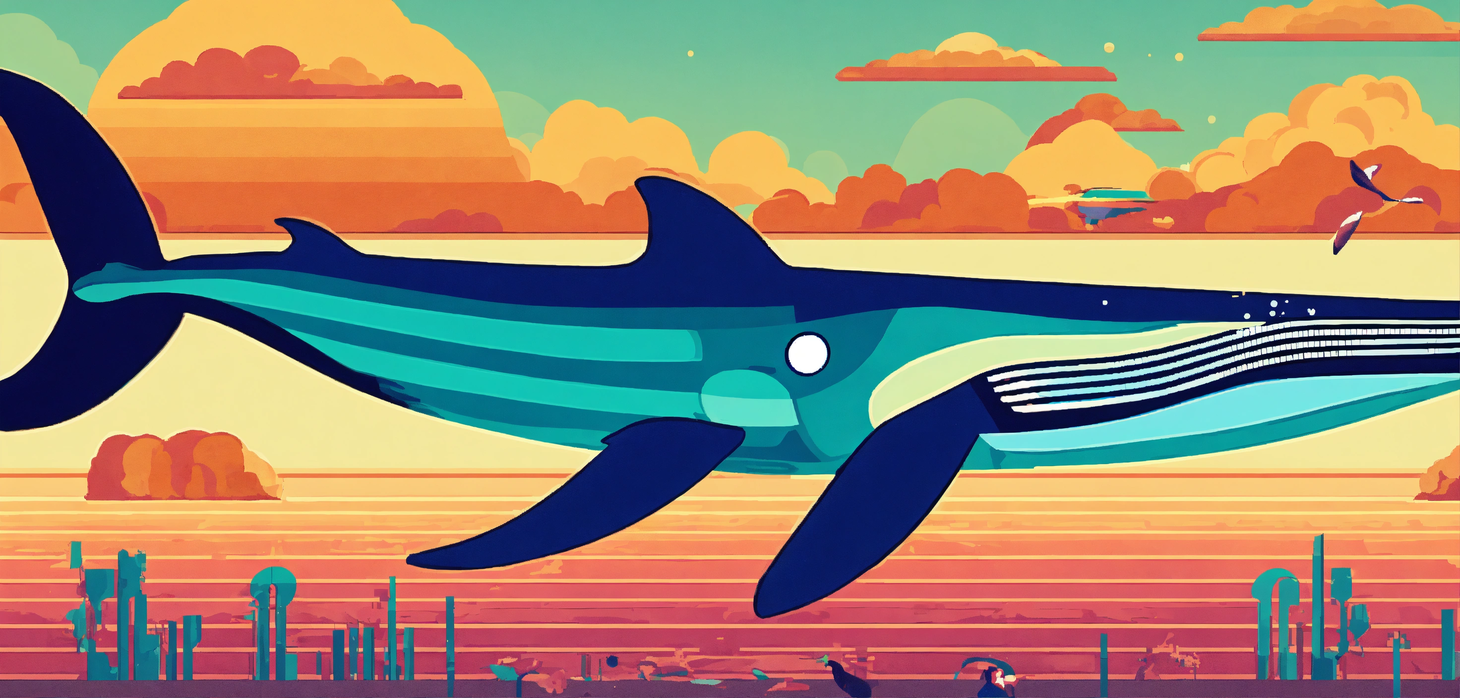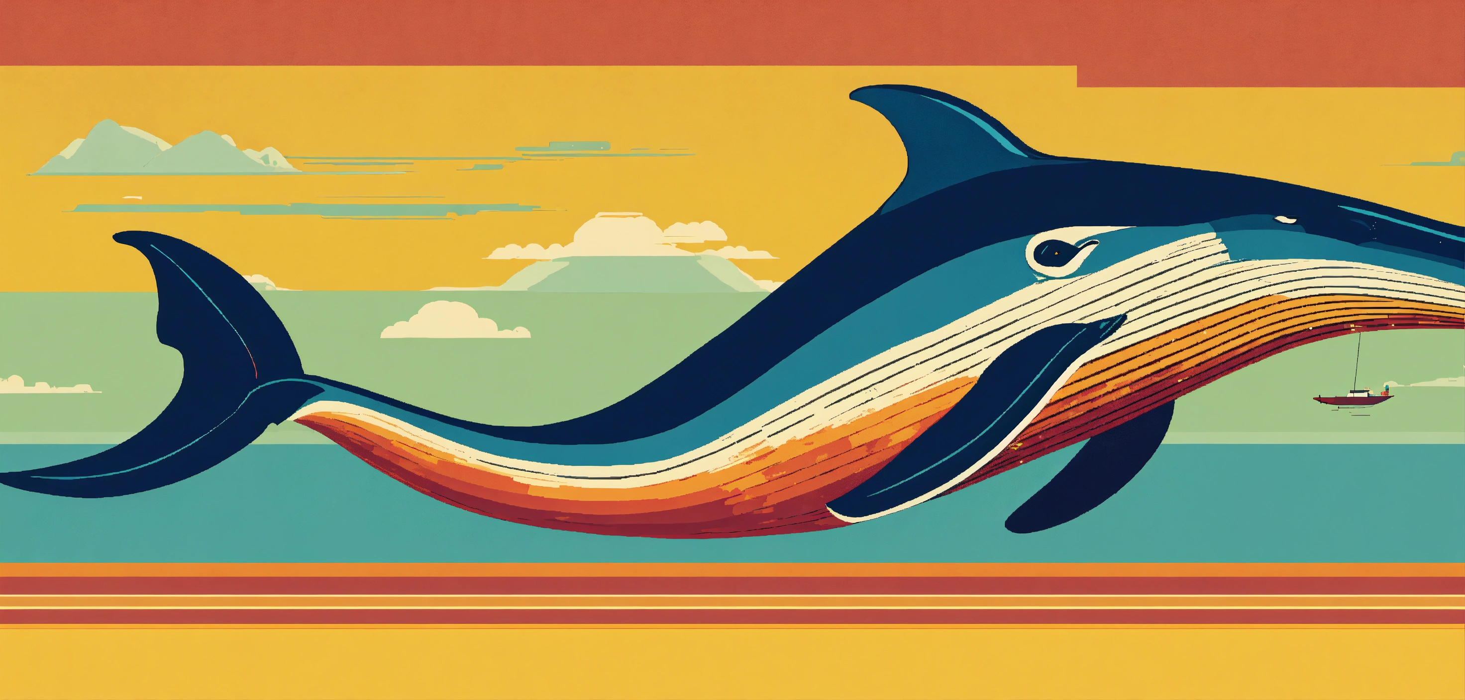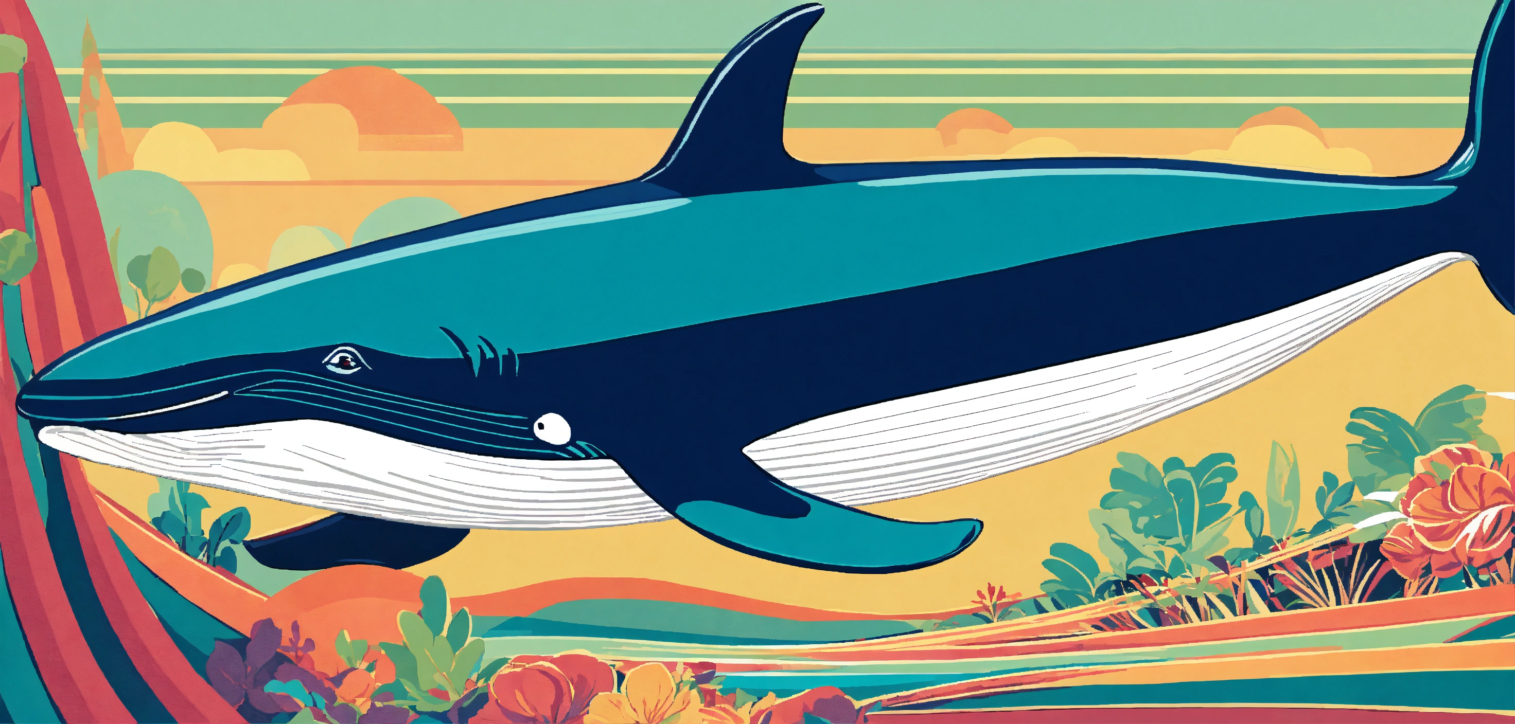 1960's retro poster nostalgic graphic art style, pixel-perfect, generate a vibrant image of a whale playing a flute