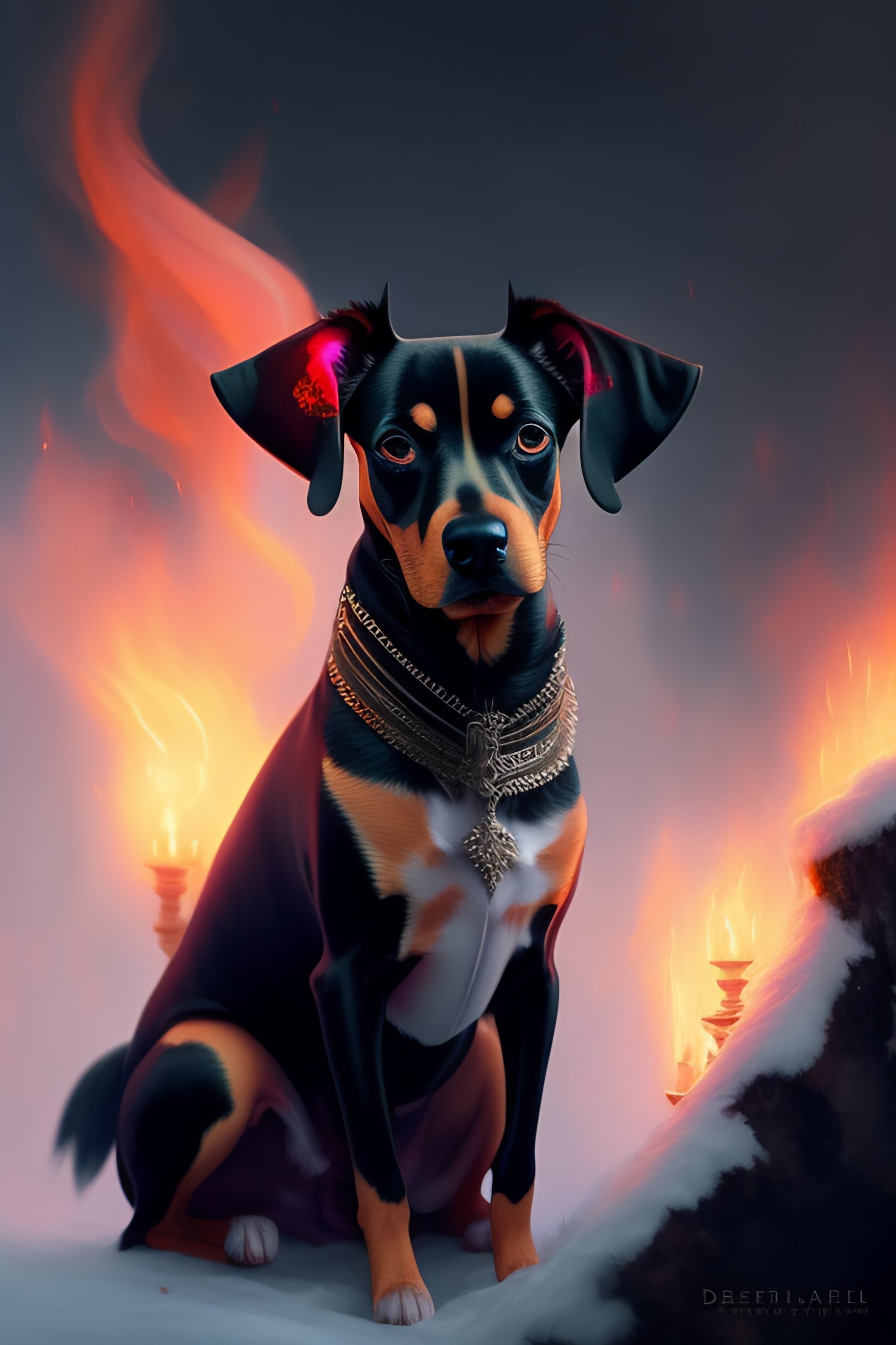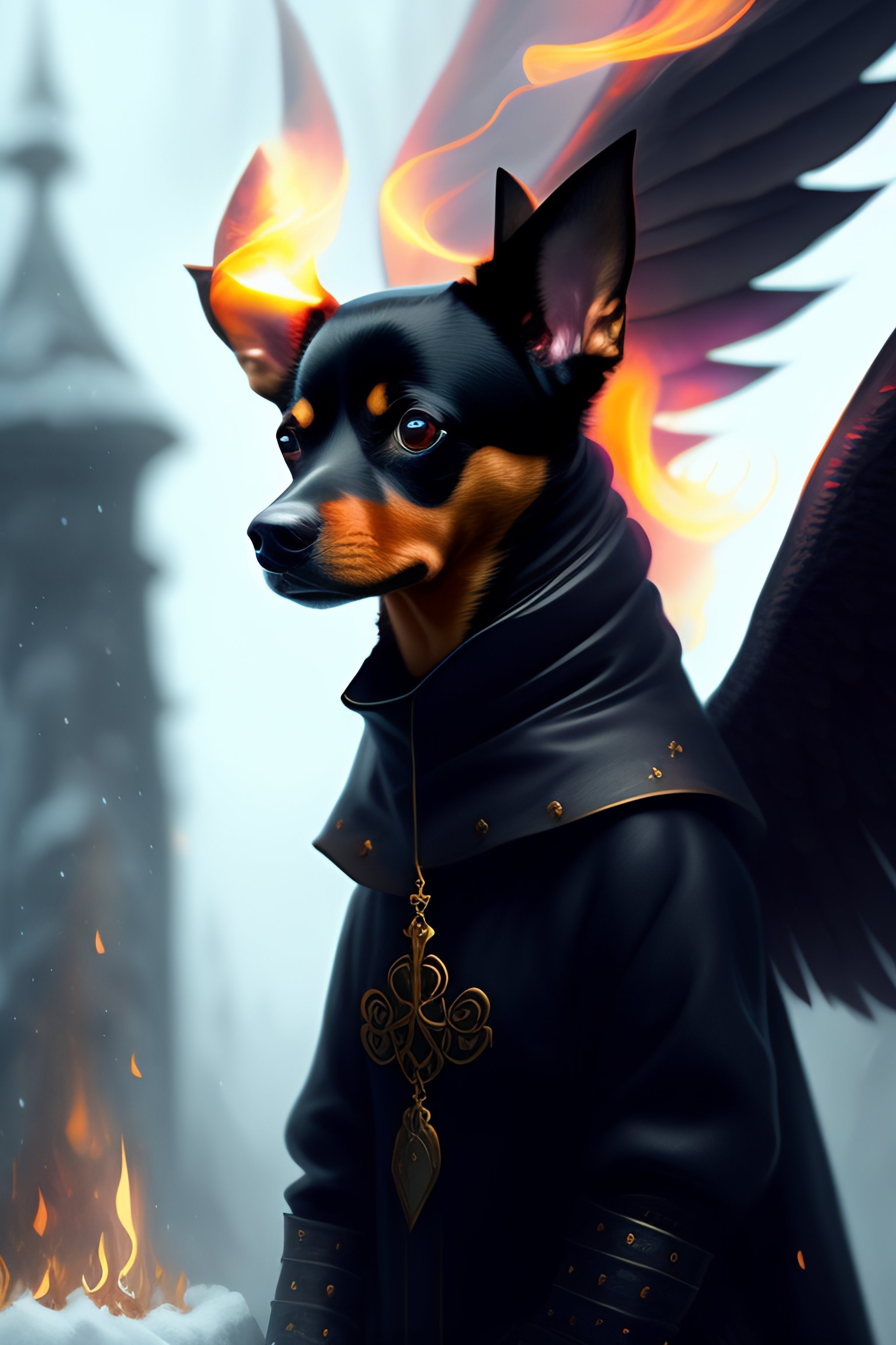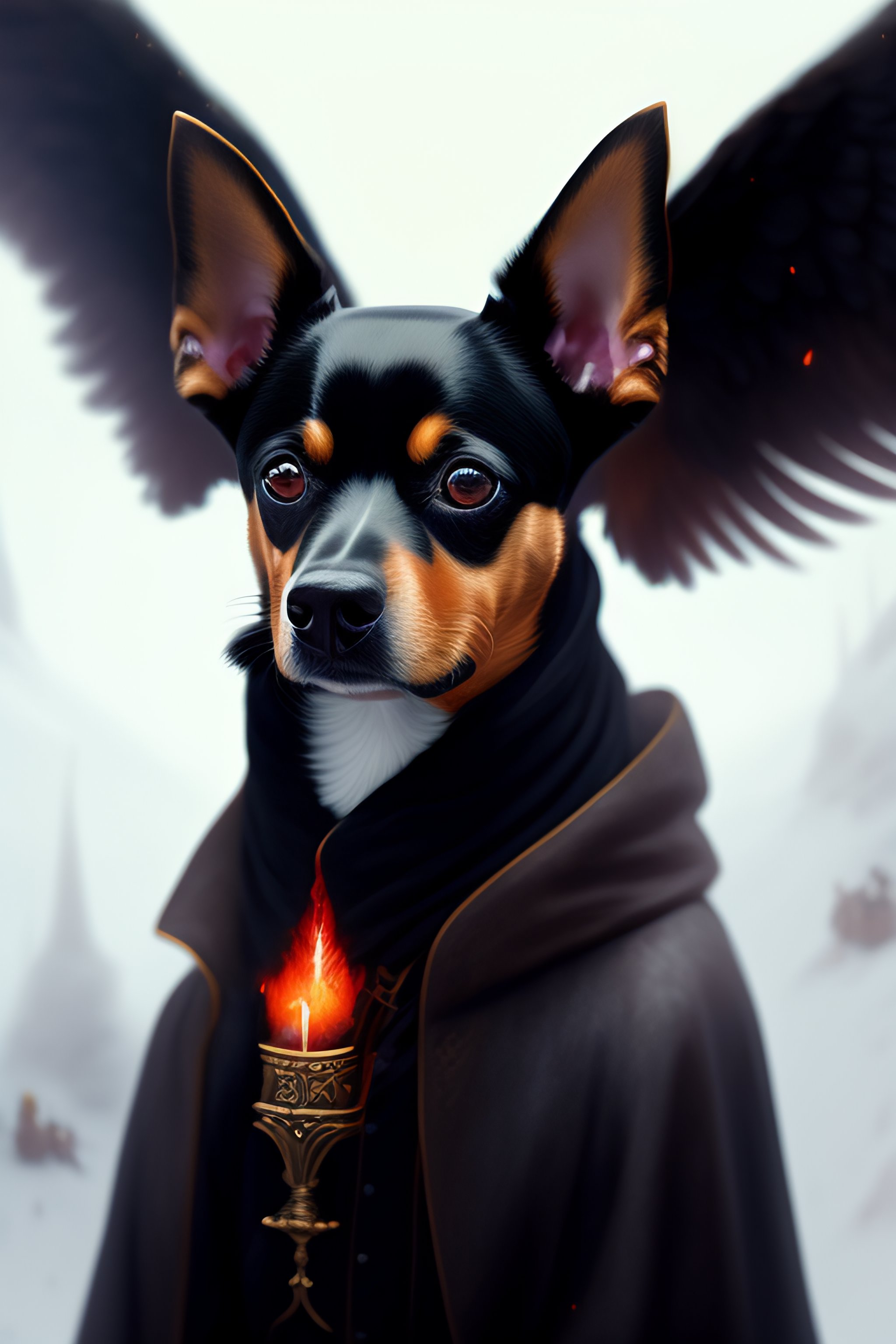 A detailed full body portrait of a witch demon english toy terrier dog in a hellish world as angel of death center of altar, fire sparks, background blades, mayhem, goth, gothic, wicca, diablo inspired, cult, satan, dark magic, by dorian cleavenger, greg rutkowski, wlop, astri lohne, zdzisław beksinski, bastien lecouffe - deharme trending on artstation