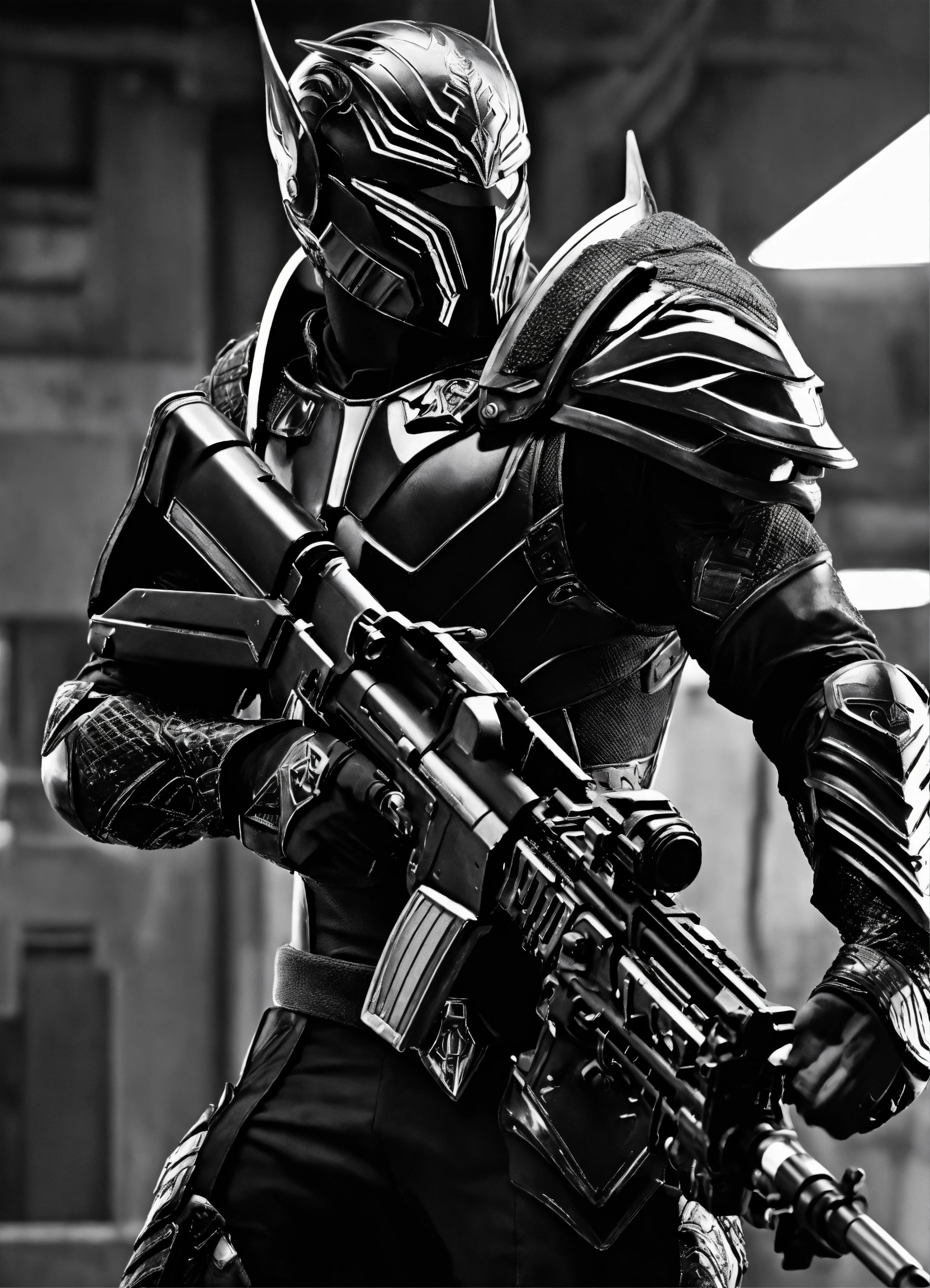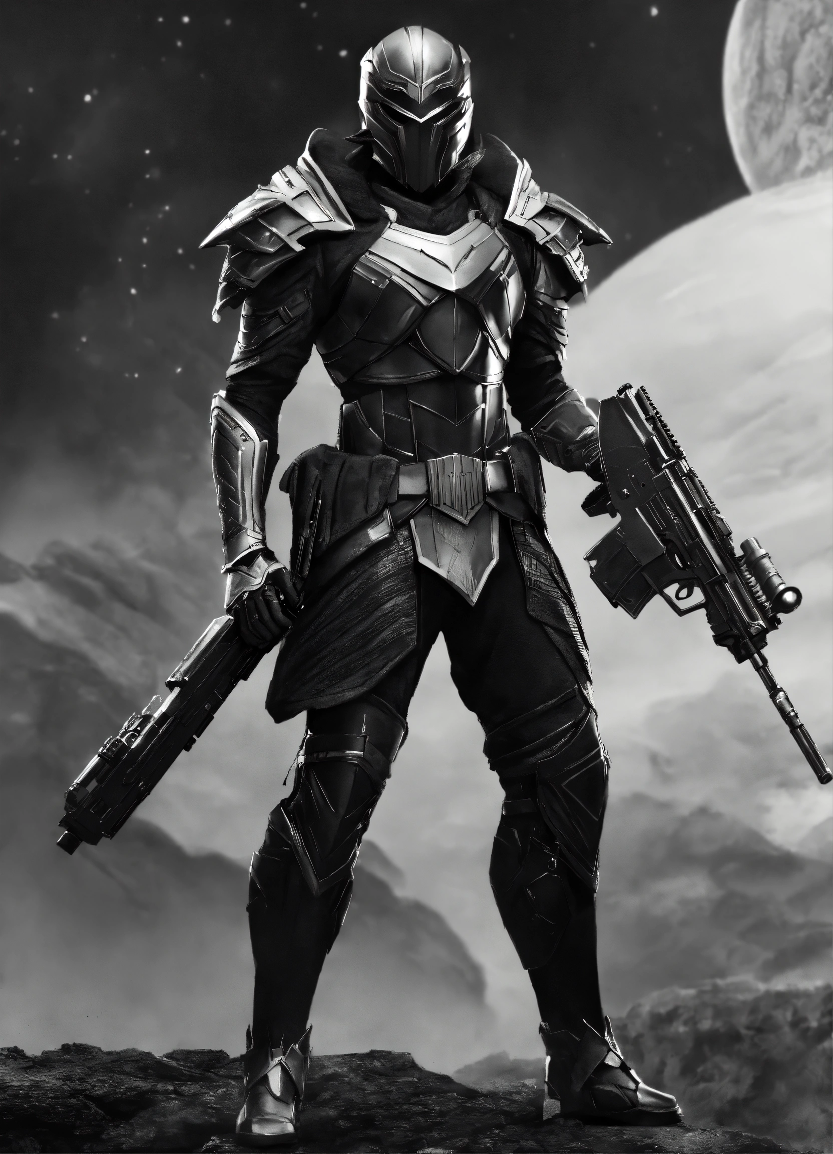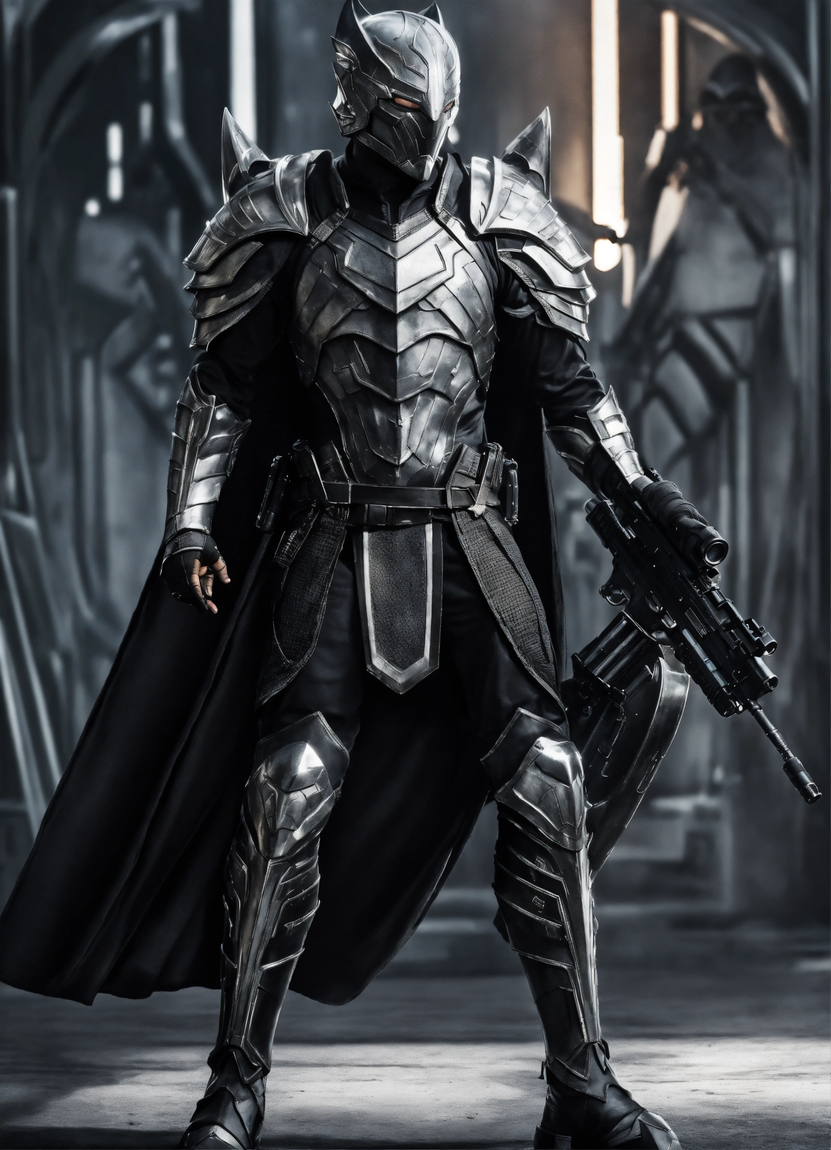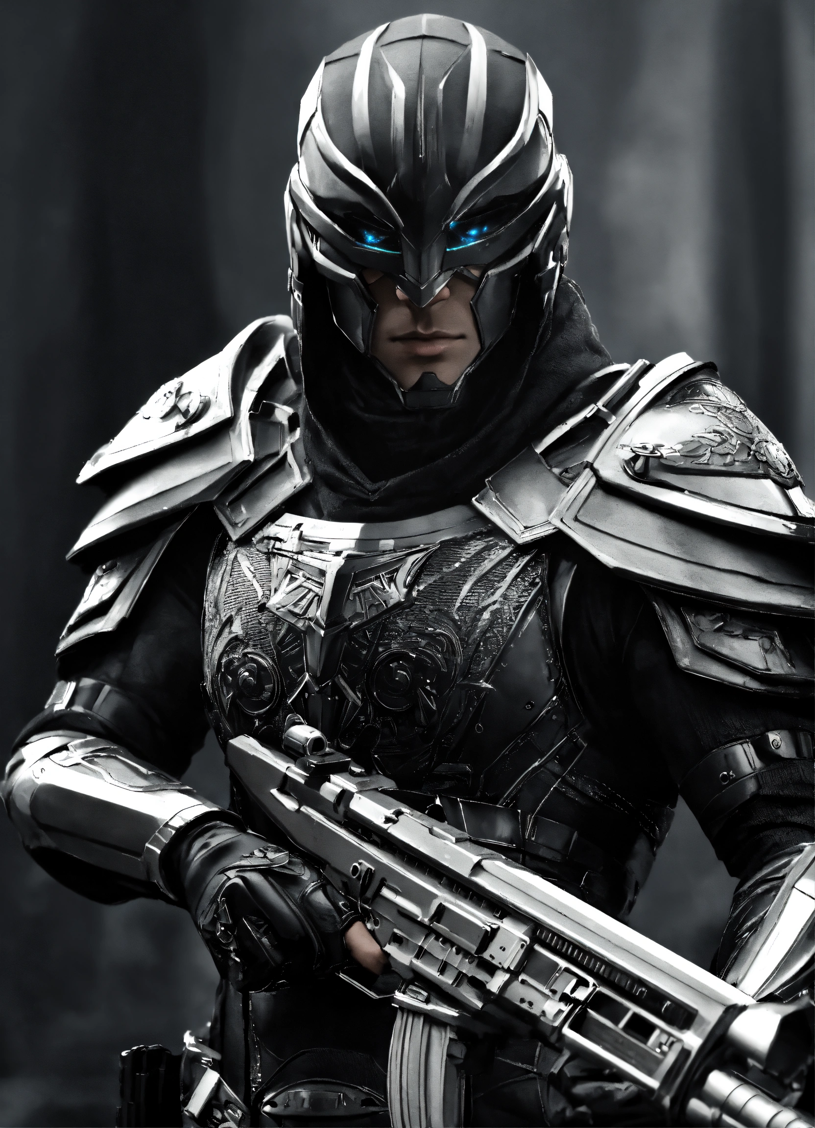 High elf sci fi black panter man sci fi elven armor, black and white armor and helmet, visor, male, holding a light machine gun, full body, hd