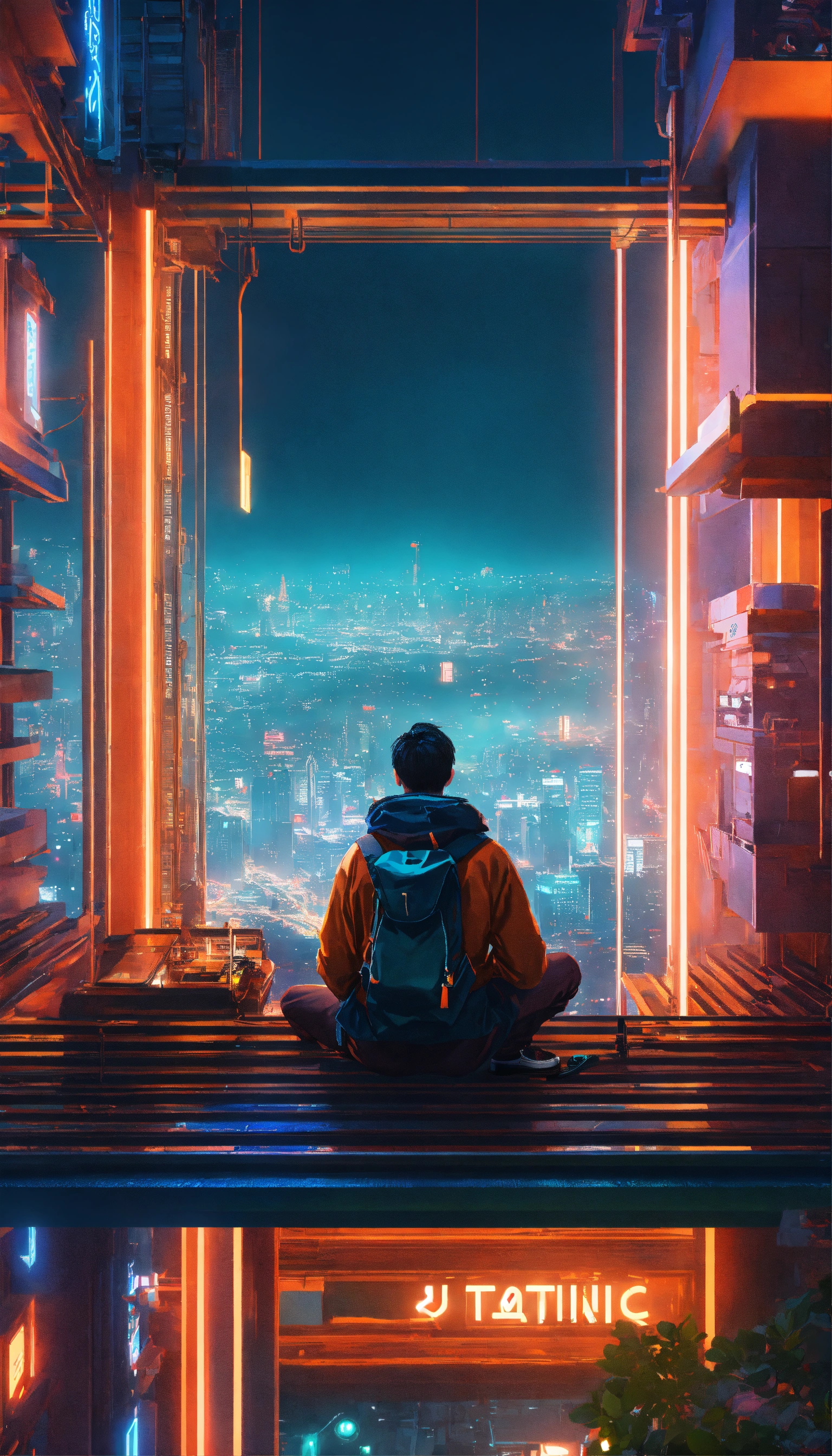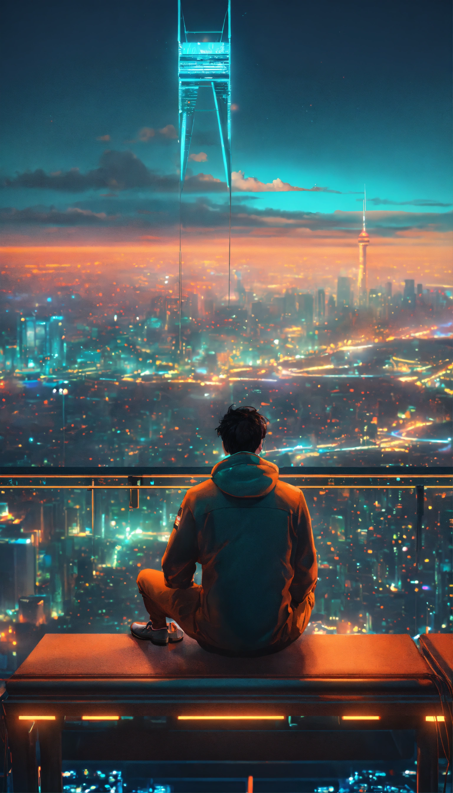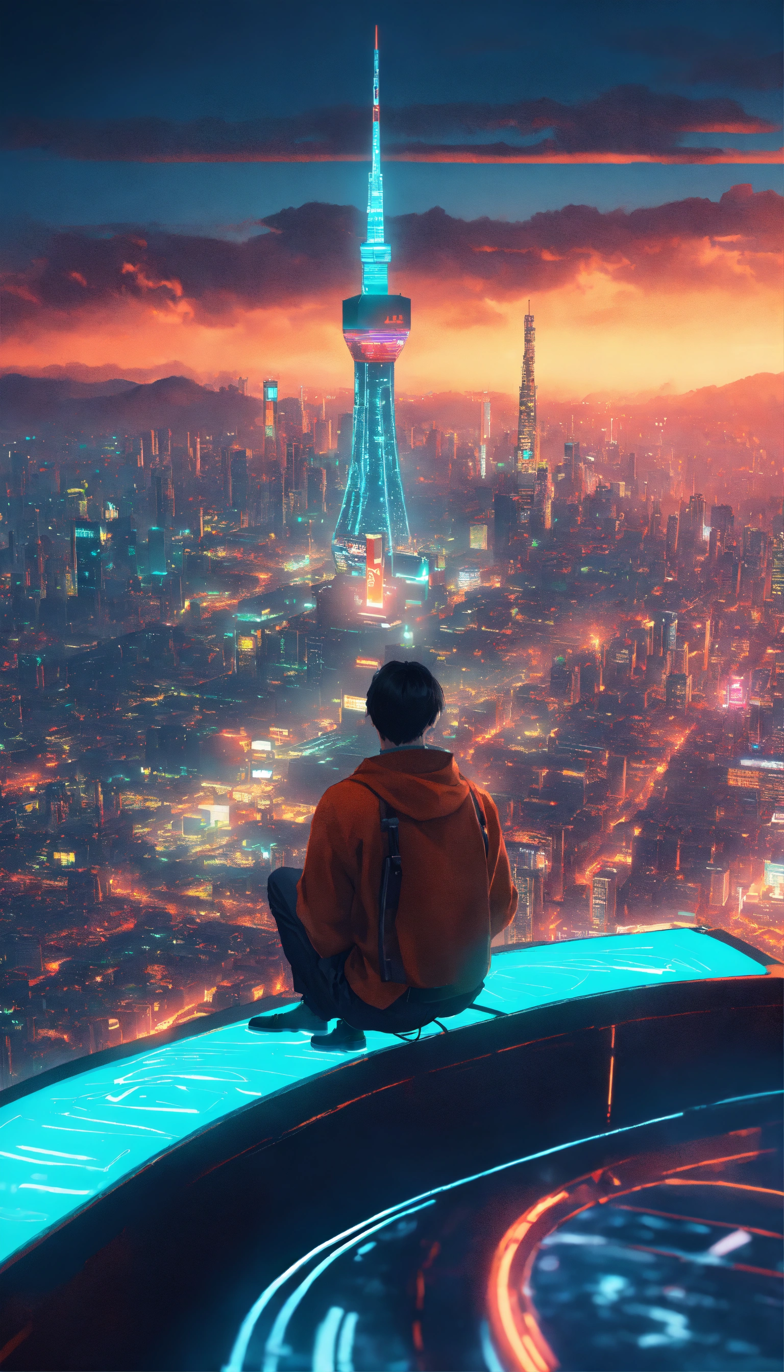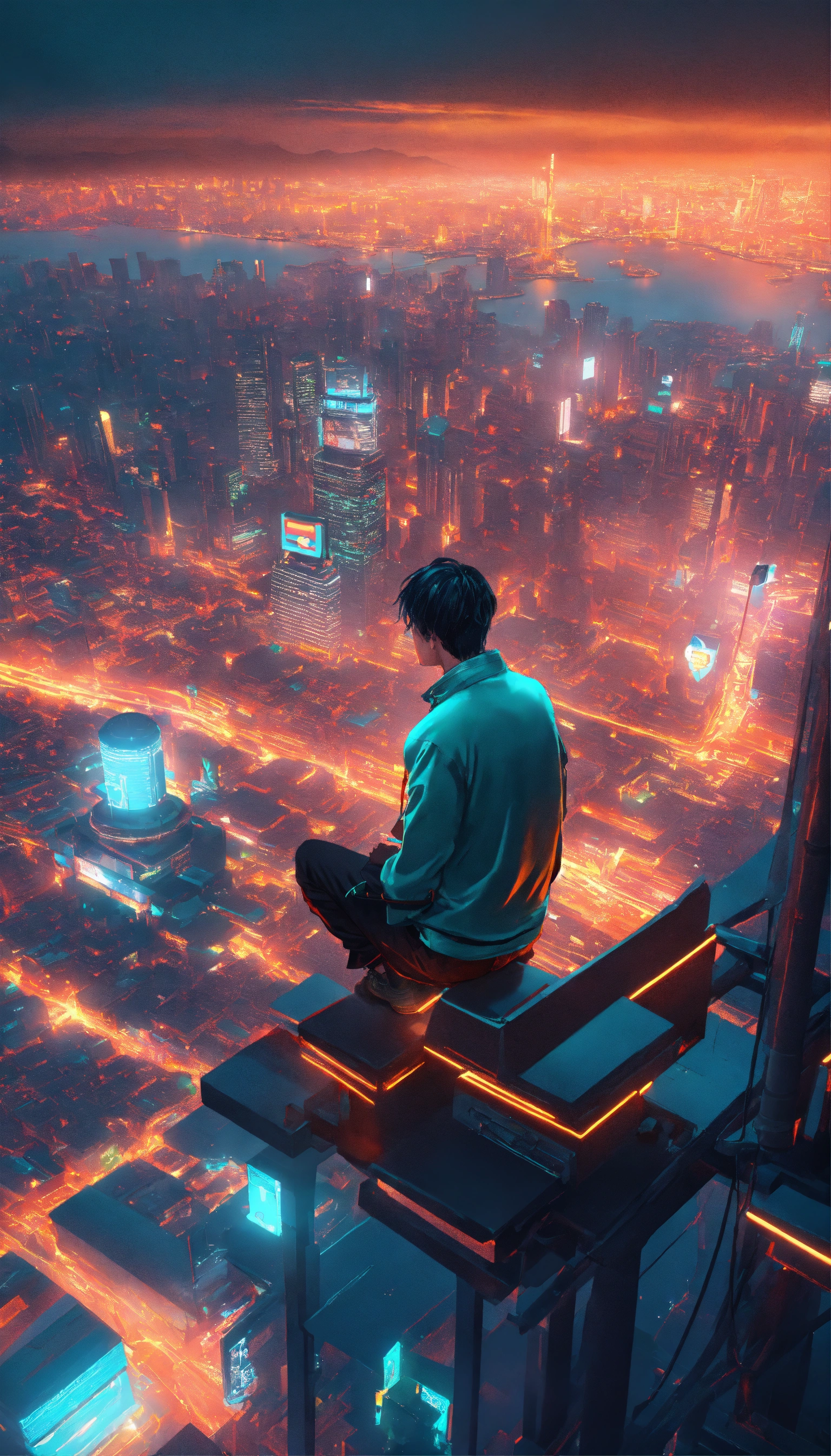 A man seating on top of the highest building looking down to futuristic city with neon light at night, japanese vibes, highly detaild, depth, octane render, realistic, 16k, teal and orange