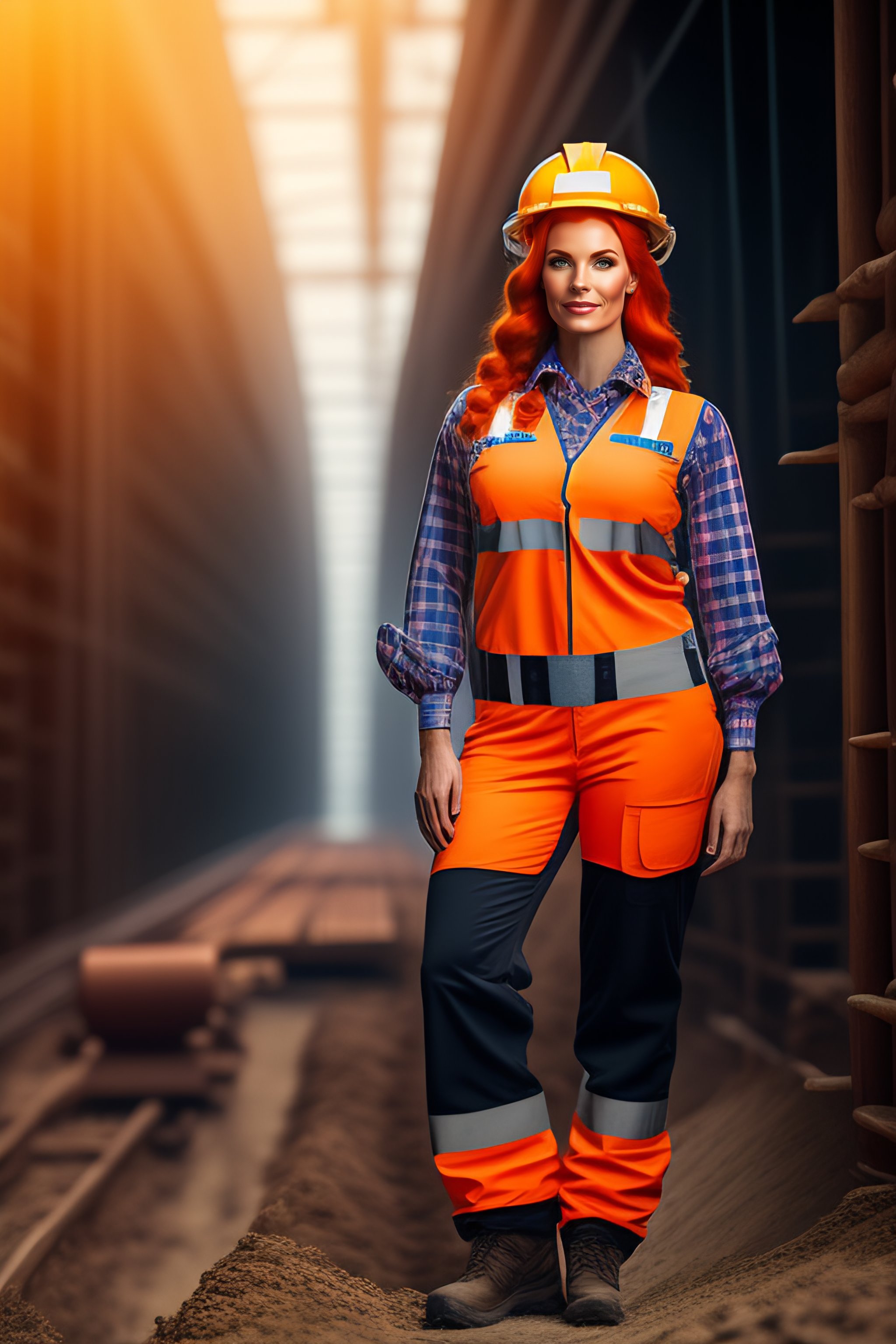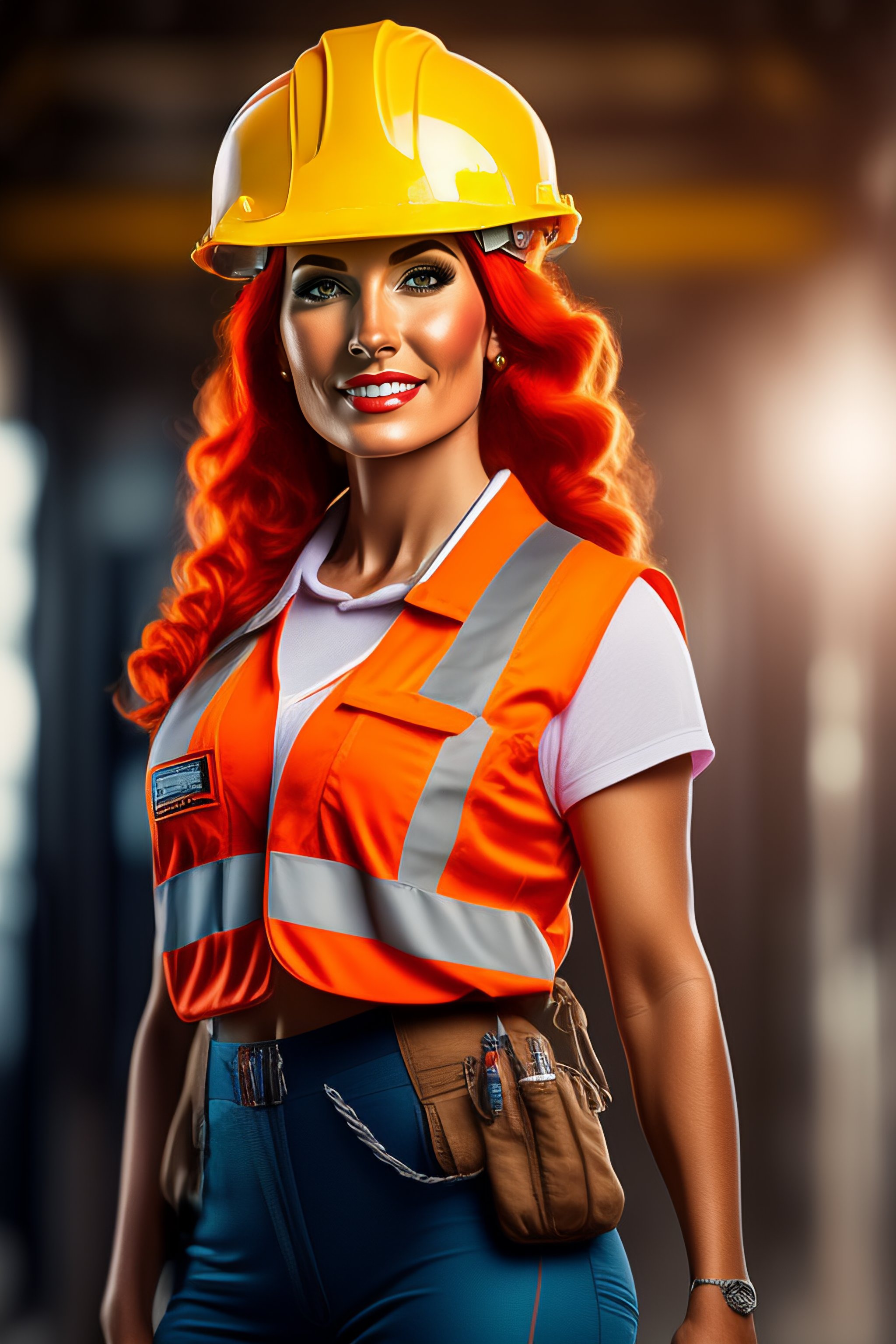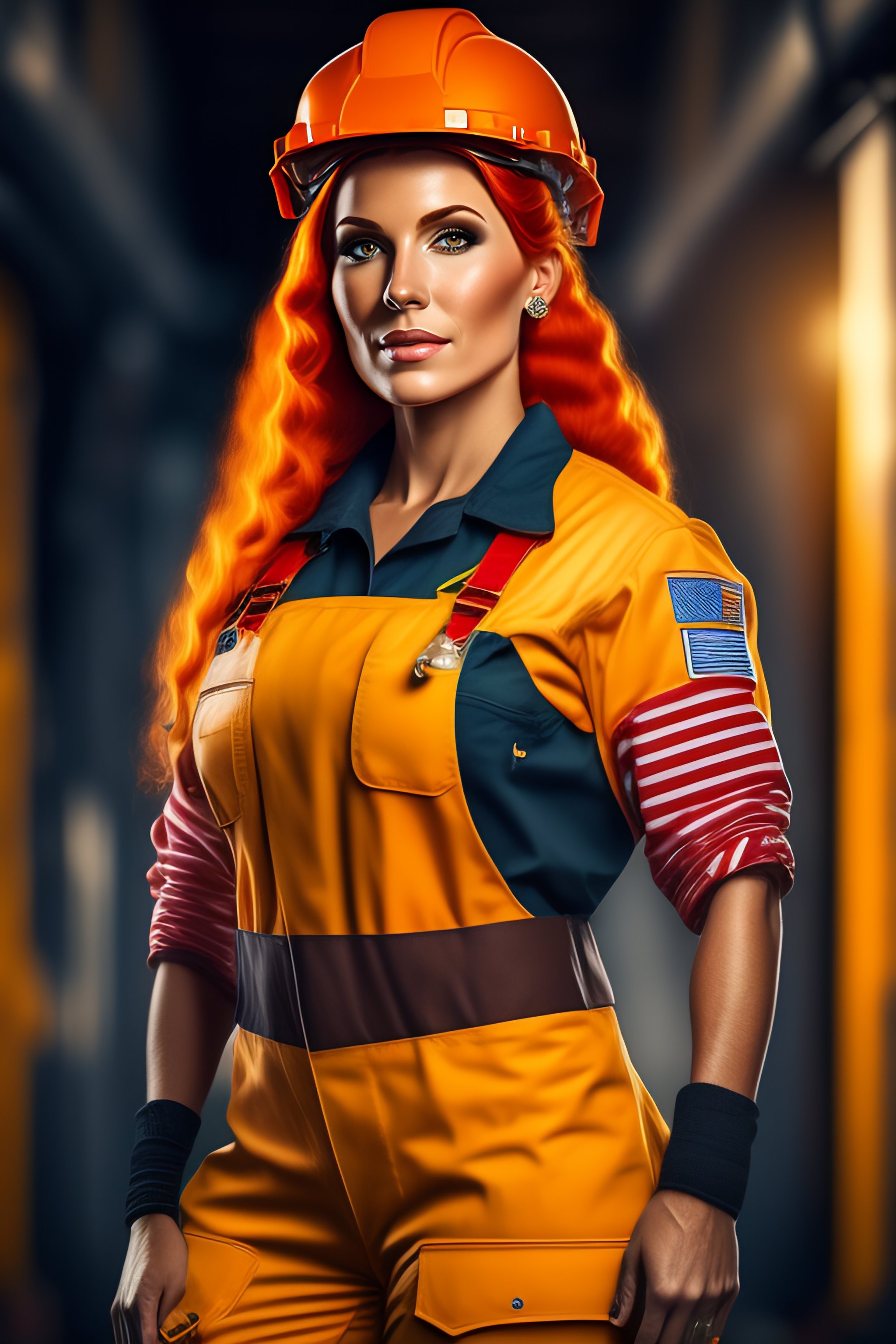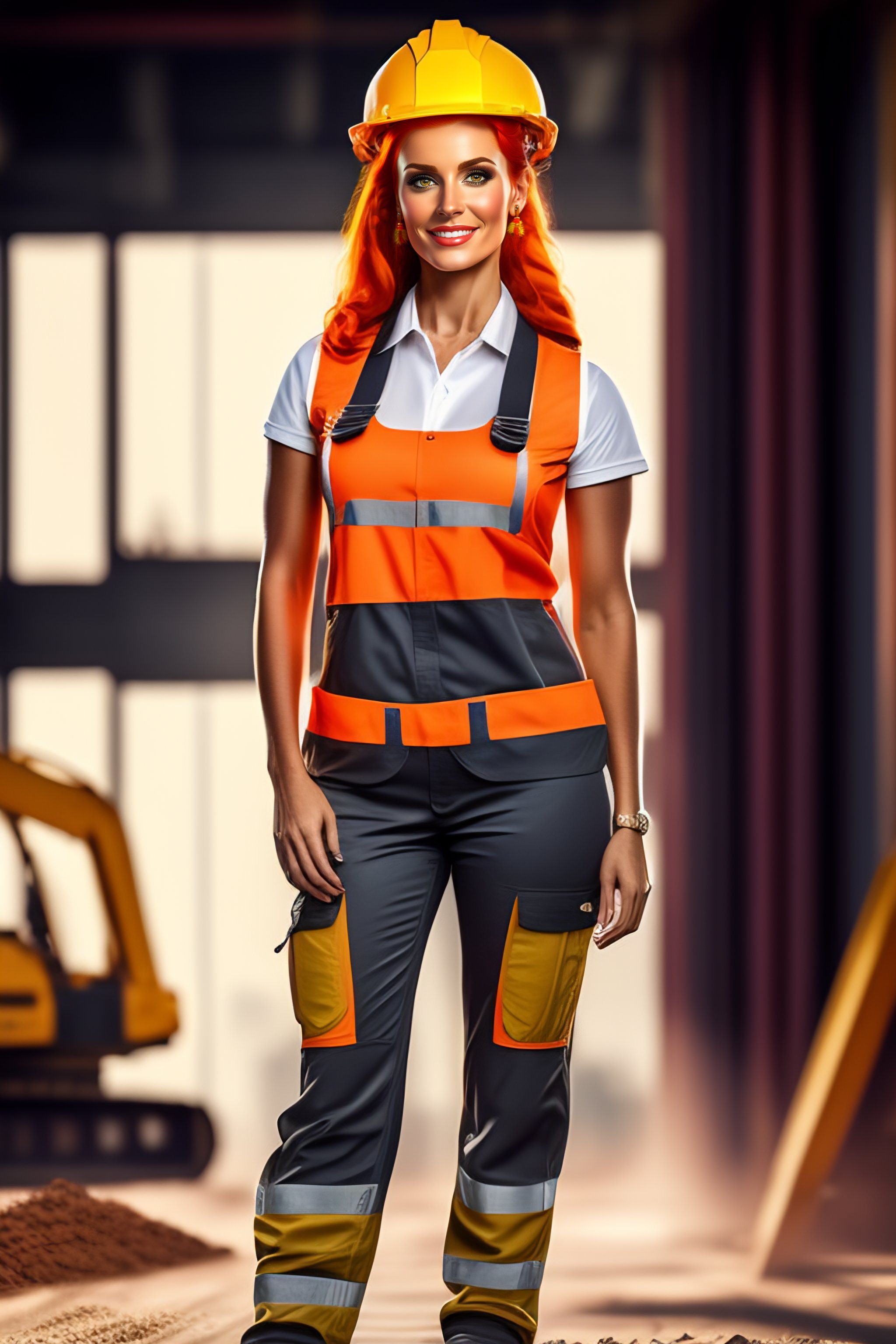 Highly detailed full body character portrait of a female red head in a construction worker costume