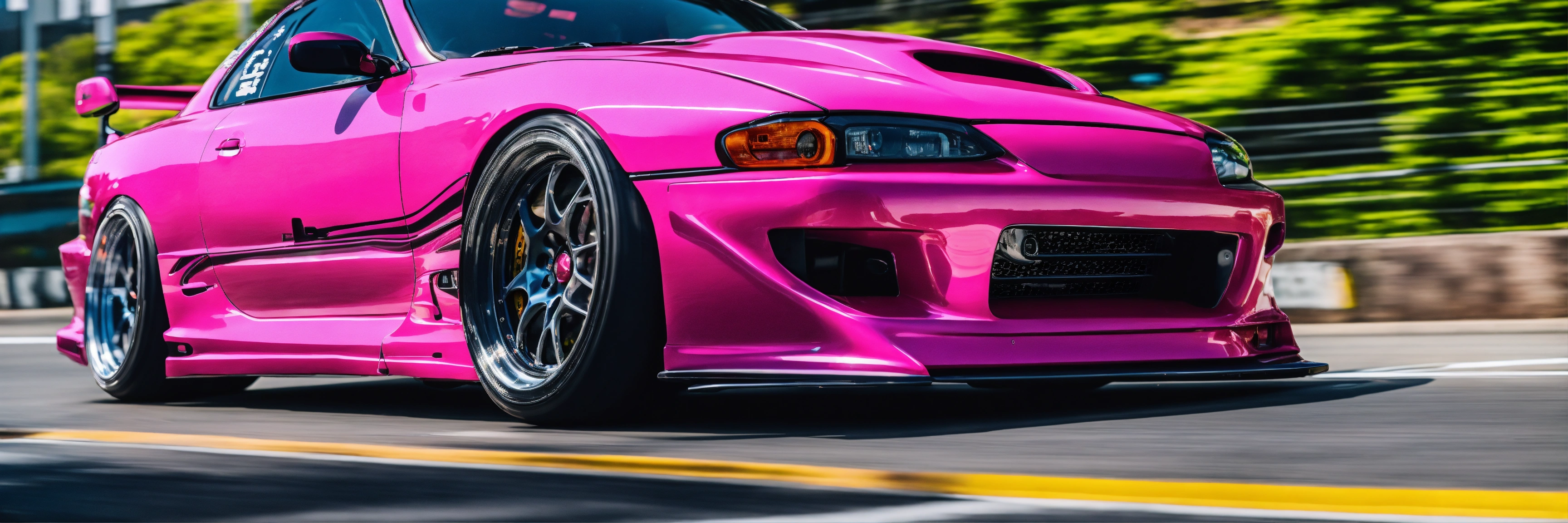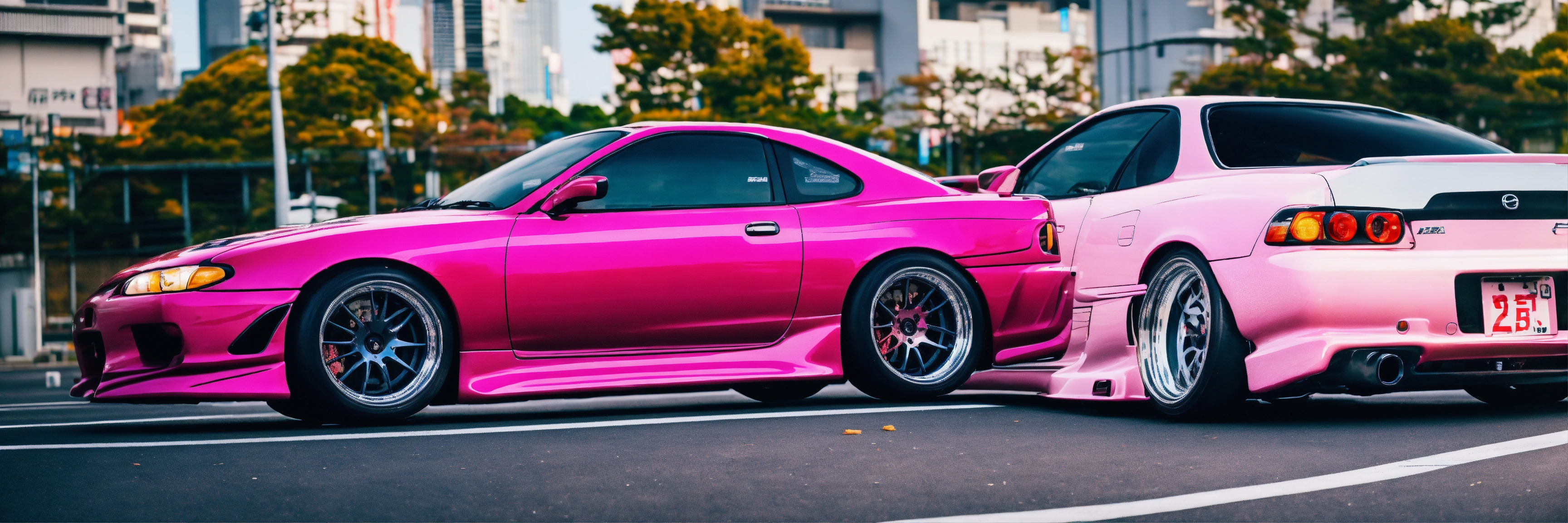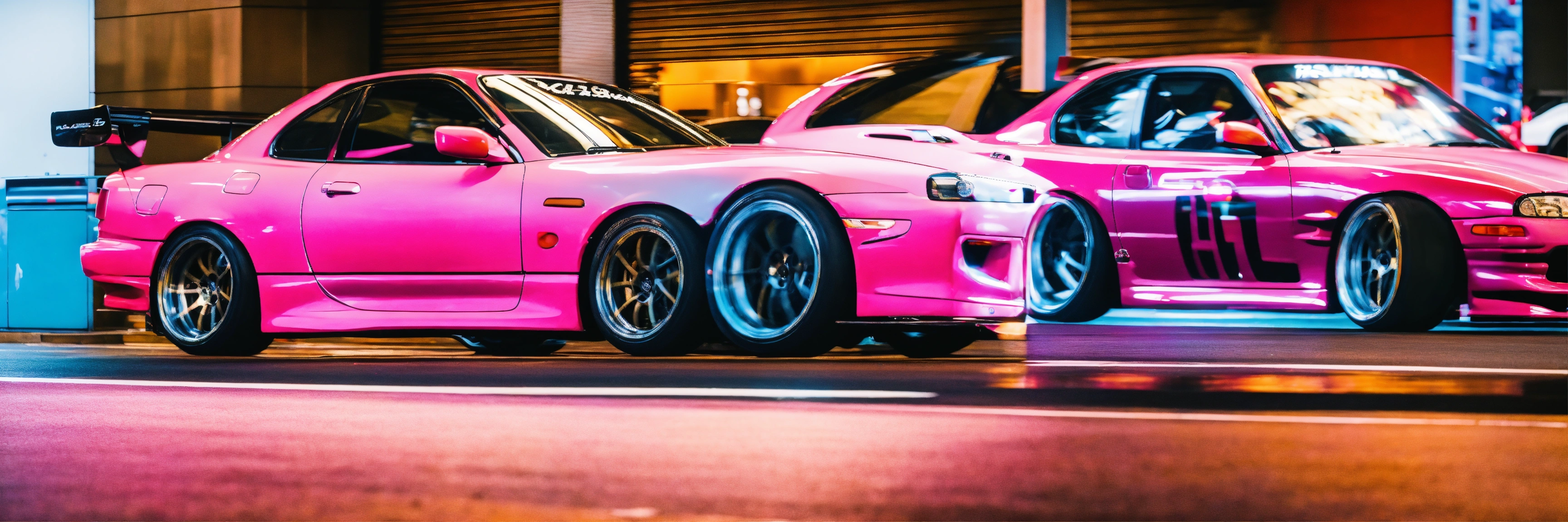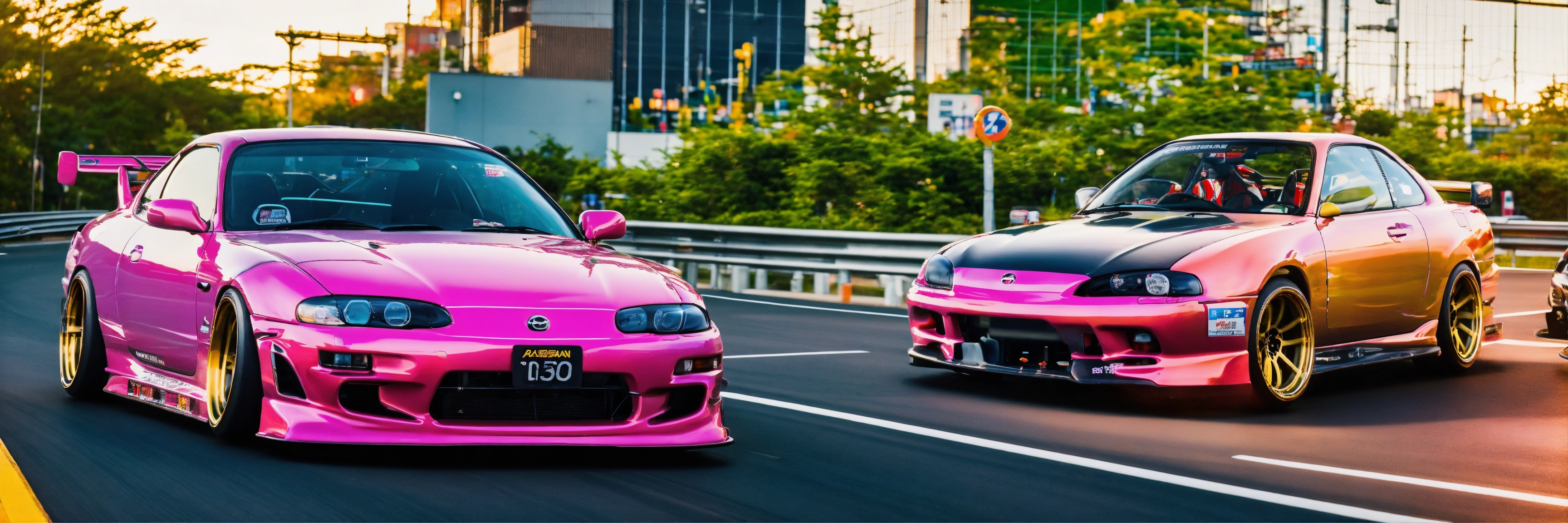 A colorful pink nissan silvia s15 with a wide-body kit racing a white mazda rx7 in tokyo highway