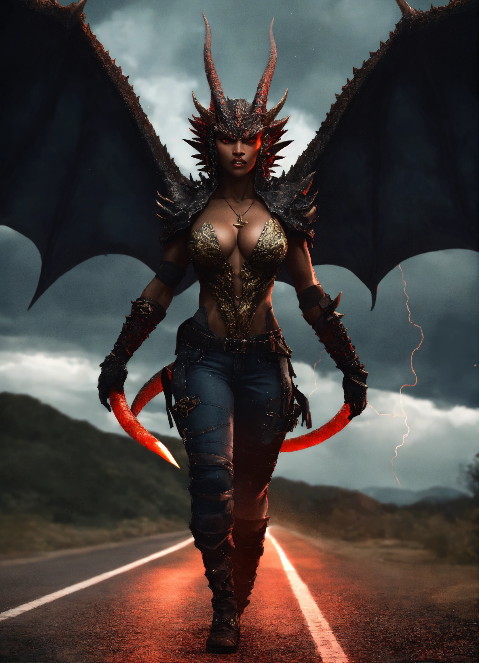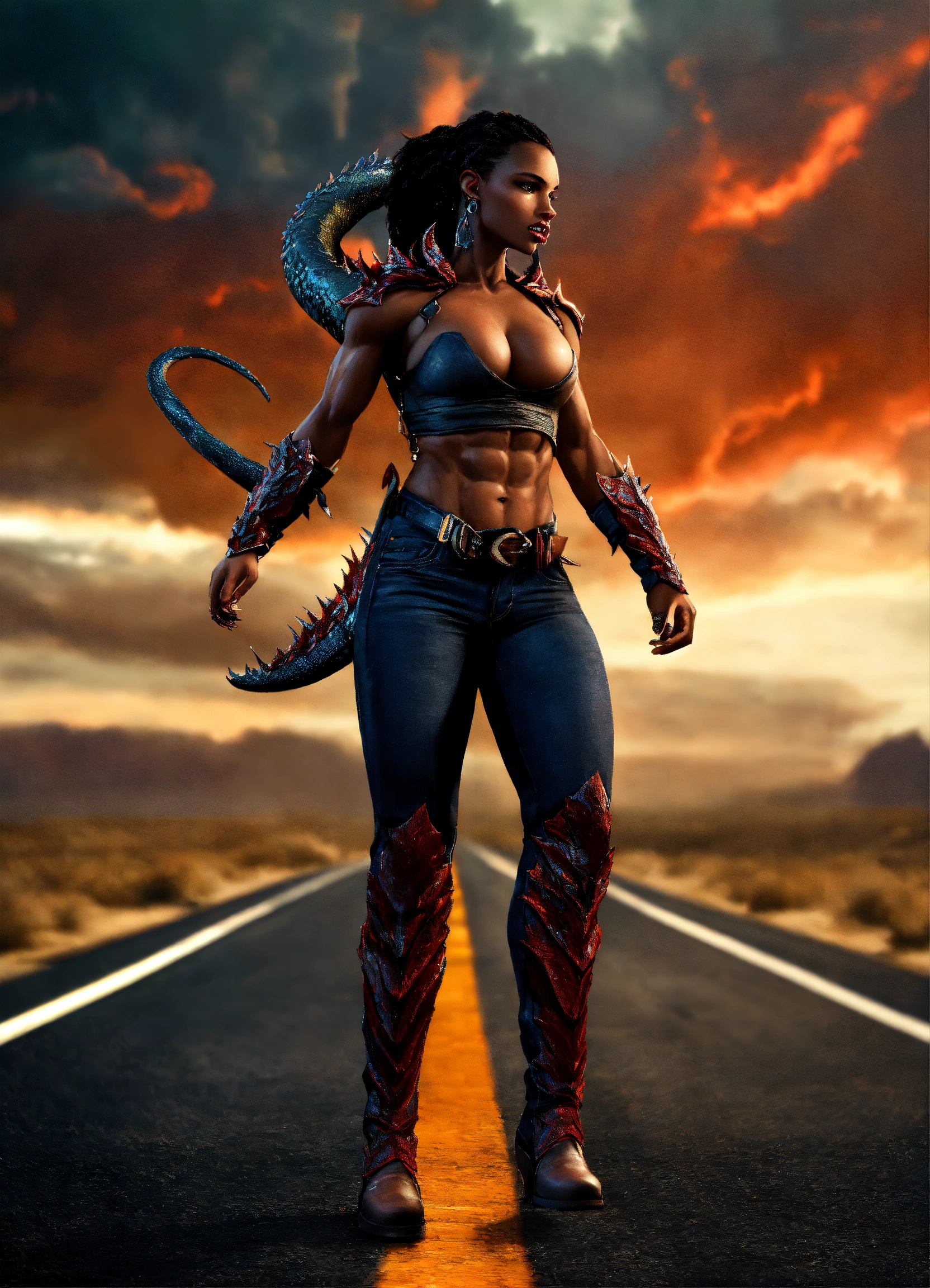 Full body seven foot evil black female scaly skinned dragon goddess monster, scaly shapely strong muscular scaly skin jagged teeth dangerous, clothed in a jeans walking down a lonely road with red lightning and dark clouds behind her, high detail, realistic photo, high detail, digital painting, cinematic, stunning, hyper-realistic, sharp focus, high resolution 8k, insanely detailed