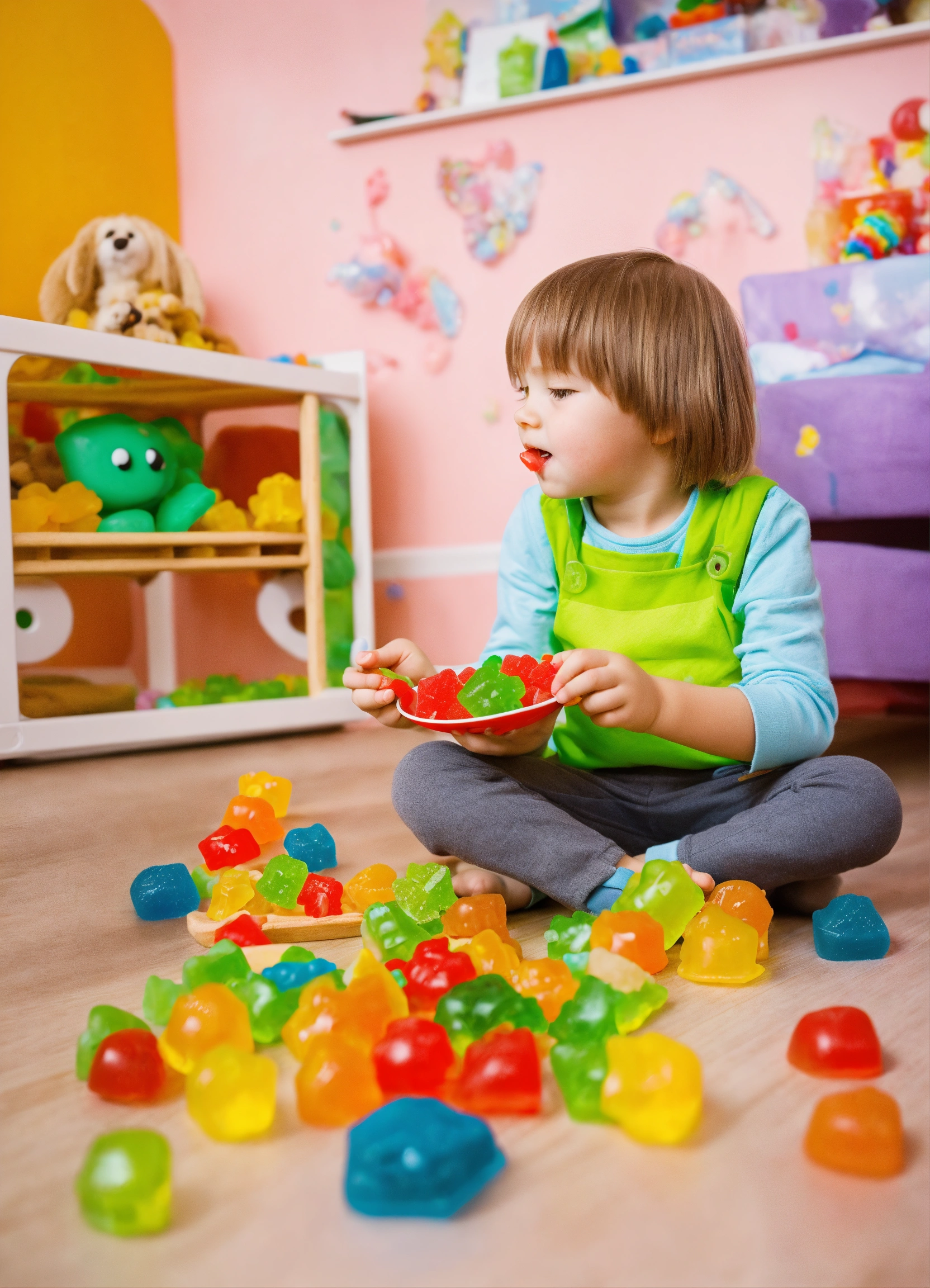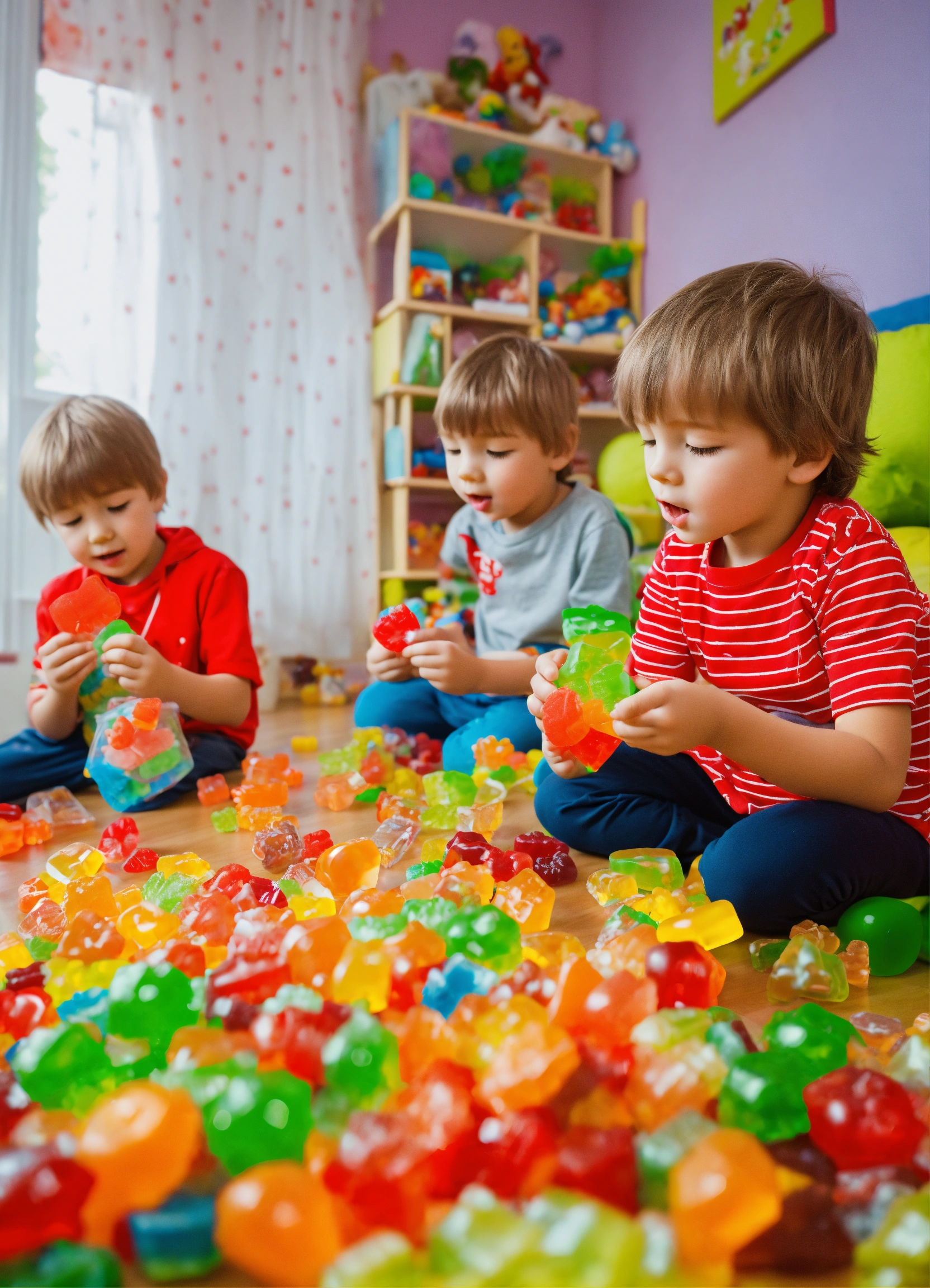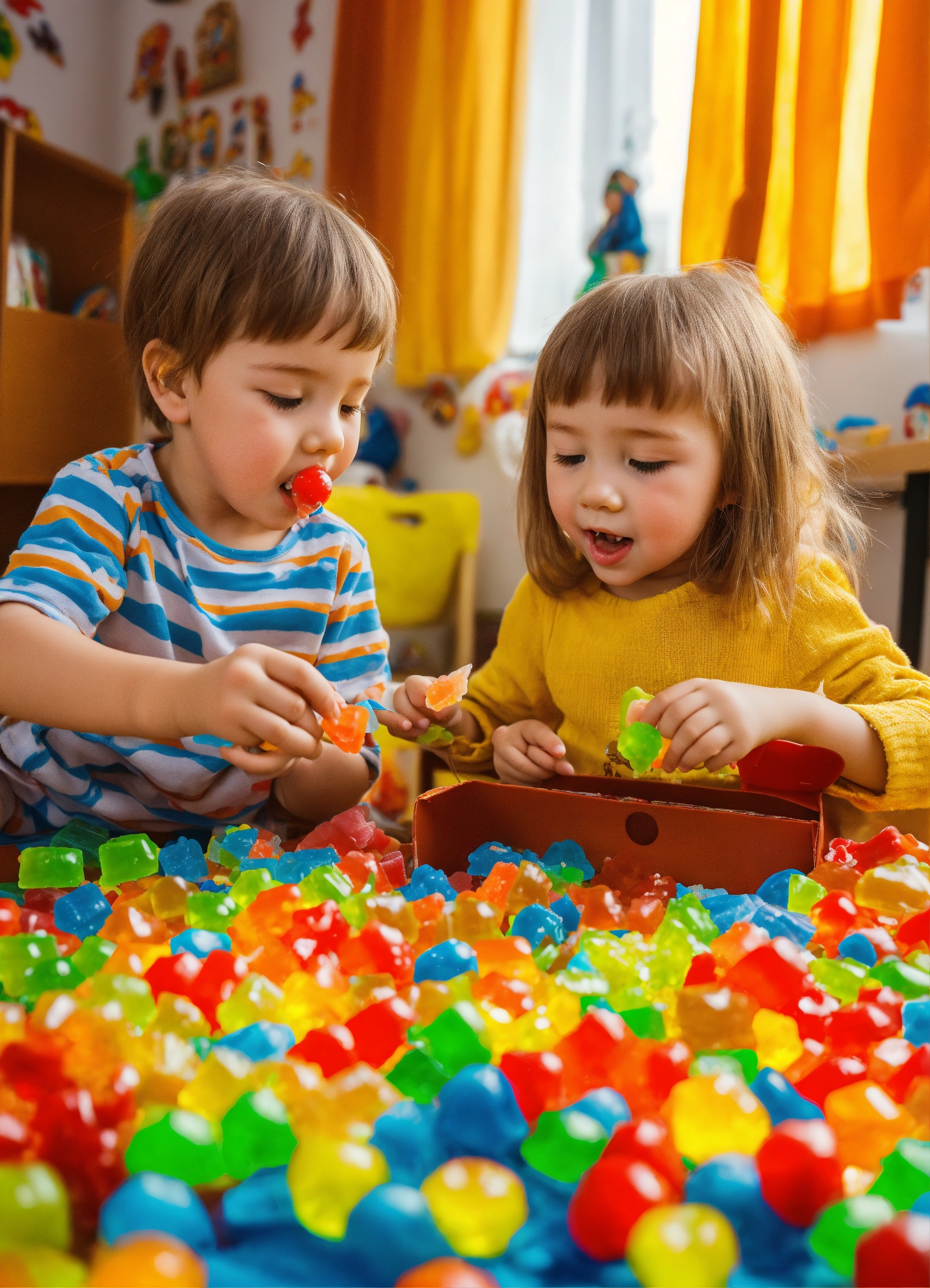 Russian kids boys and girls 5-7 years old play om-nom toys and eating gummies candies in kids room
