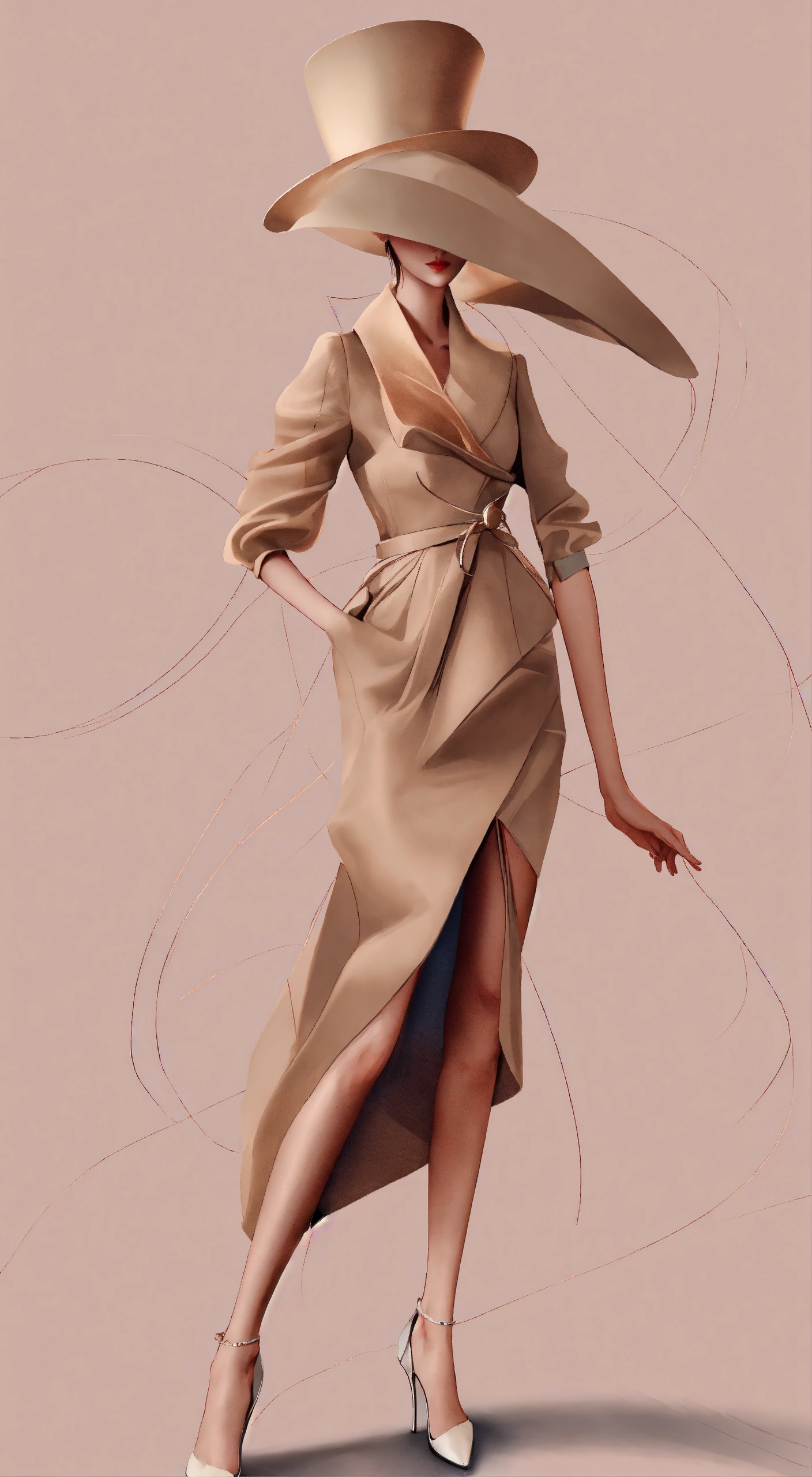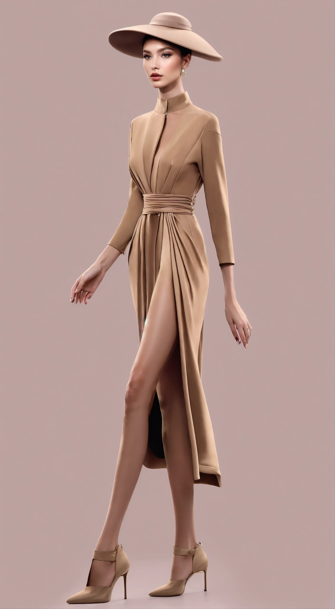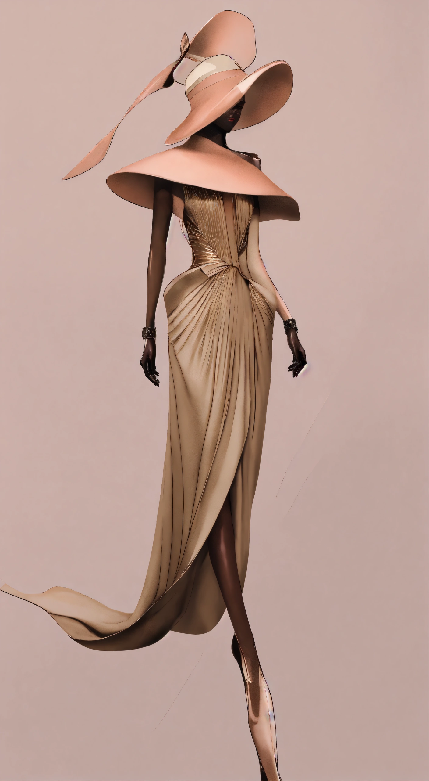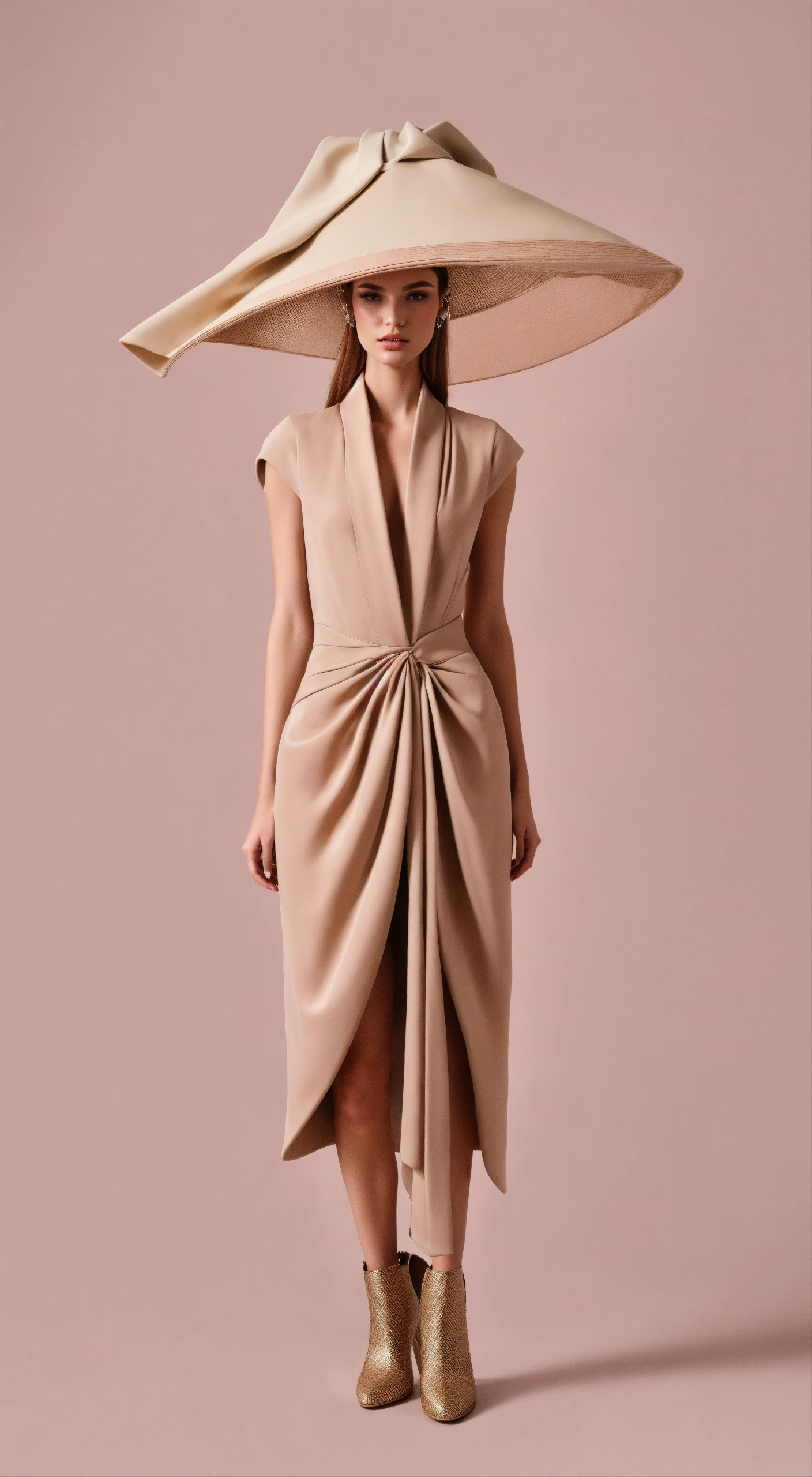 Innovative haute couture fashion design wide sculptural draping neutrals colors sophisticated the model wear a hat